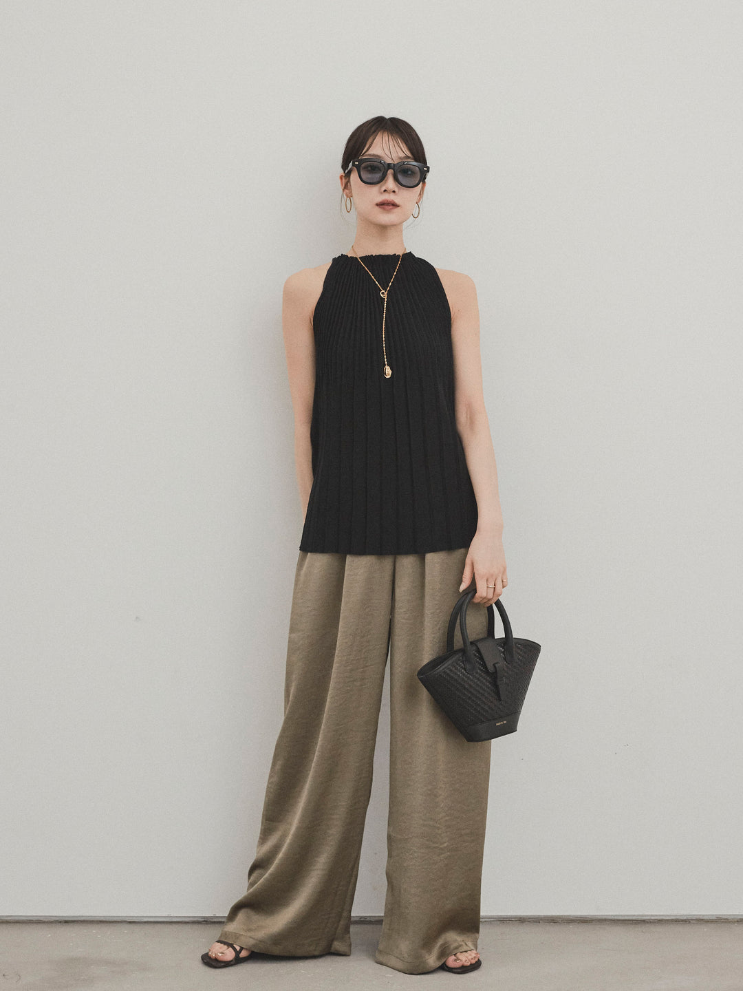 [SET]テープヤーンラッフルノースリトップス+リネンタッチタックワイドパンツ (2set)