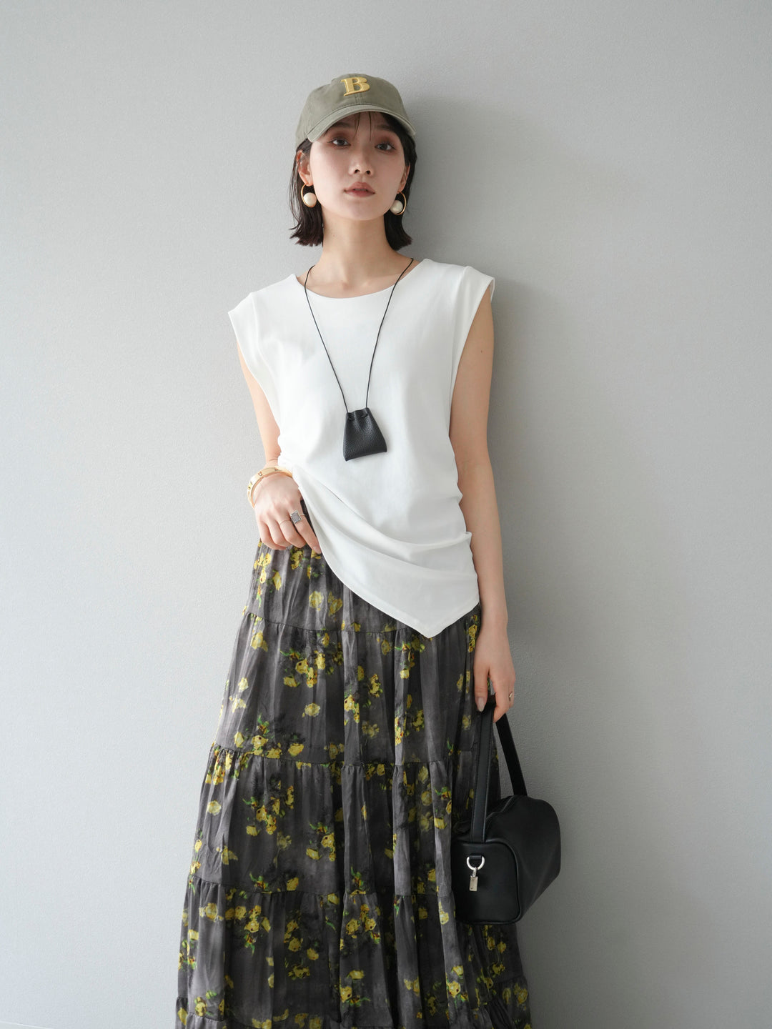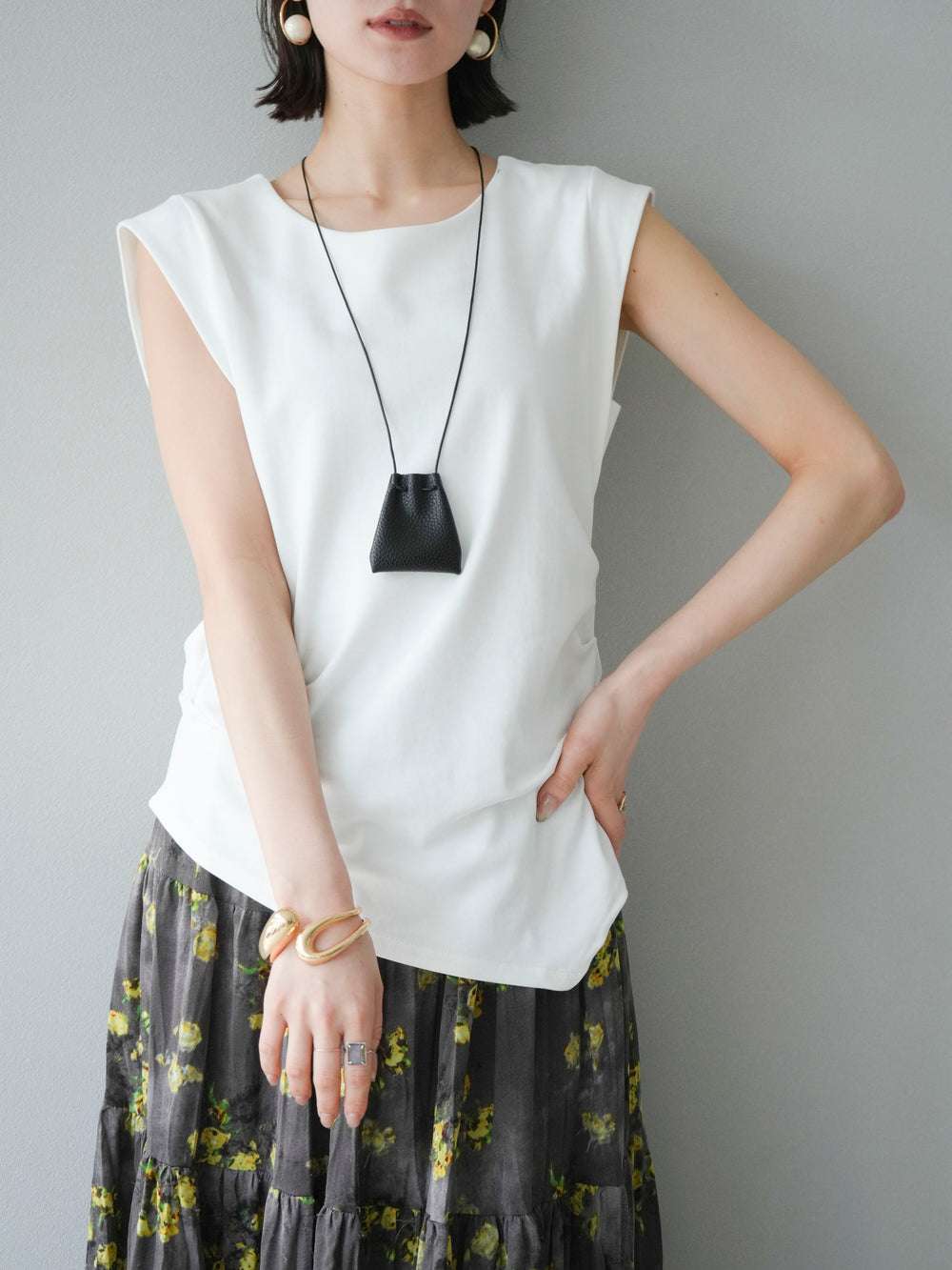 [予約]サイドギャザーTシャツ&巾着レザーネックレスSET /ホワイト