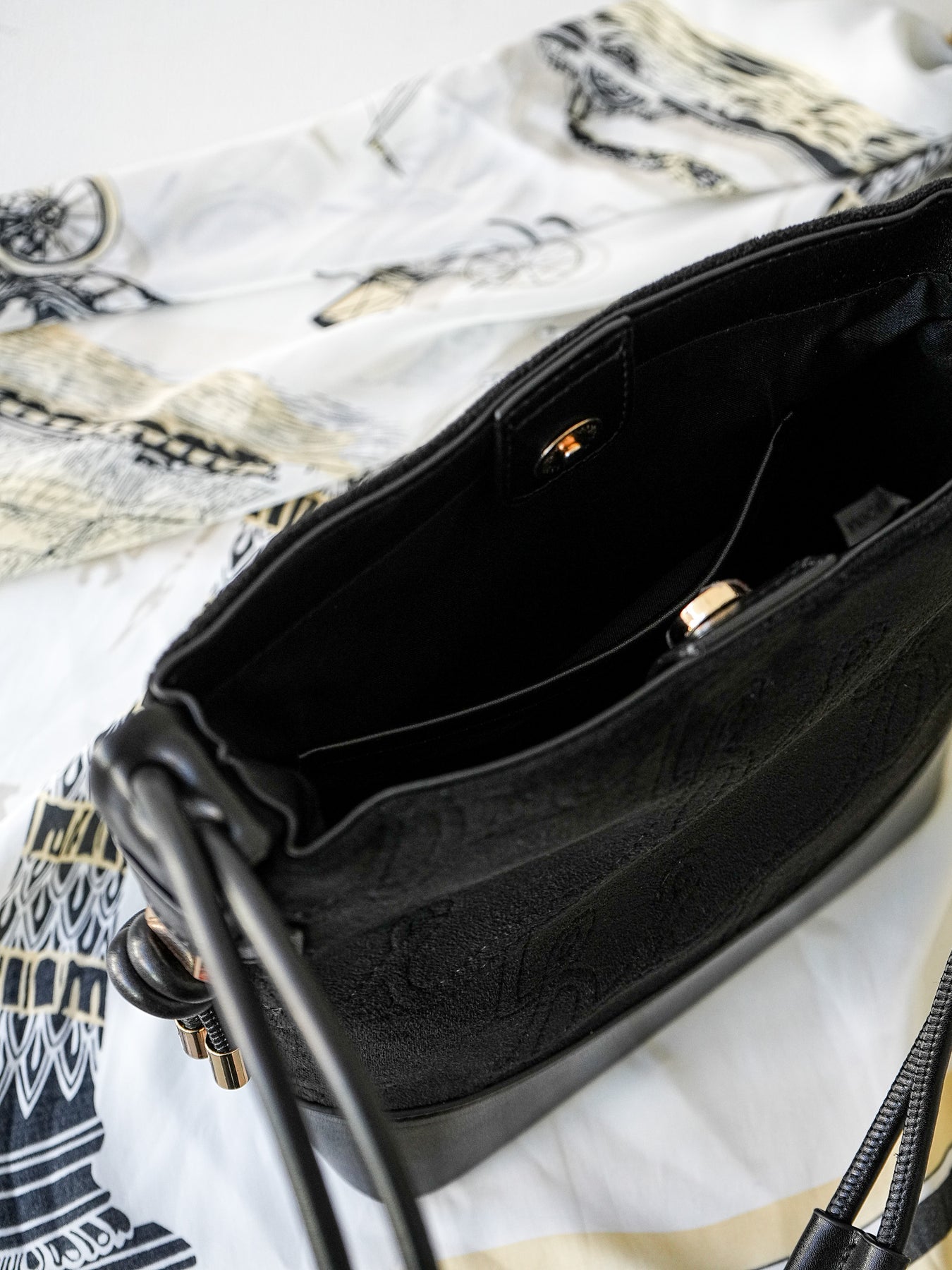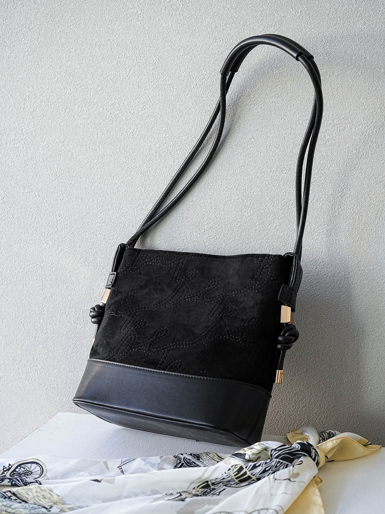 スウェード調素材にブランドロゴをステッチで施したデザインバッグ。上品な質感と立体的なロゴのアクセントが、コーディネートにさりげない存在感をプラスします。底部分やハンドルにはレザー調素材を切り替え、耐久性とデザイン性を両立。使いやすいサイズ感で収納力もあり、デイリー使いからお出かけまで幅広く活躍するアイテムです。ショルダーとしてもハンドバッグとしても持てる2WAY仕様で、スタイルに合わせたアレンジが楽しめます。