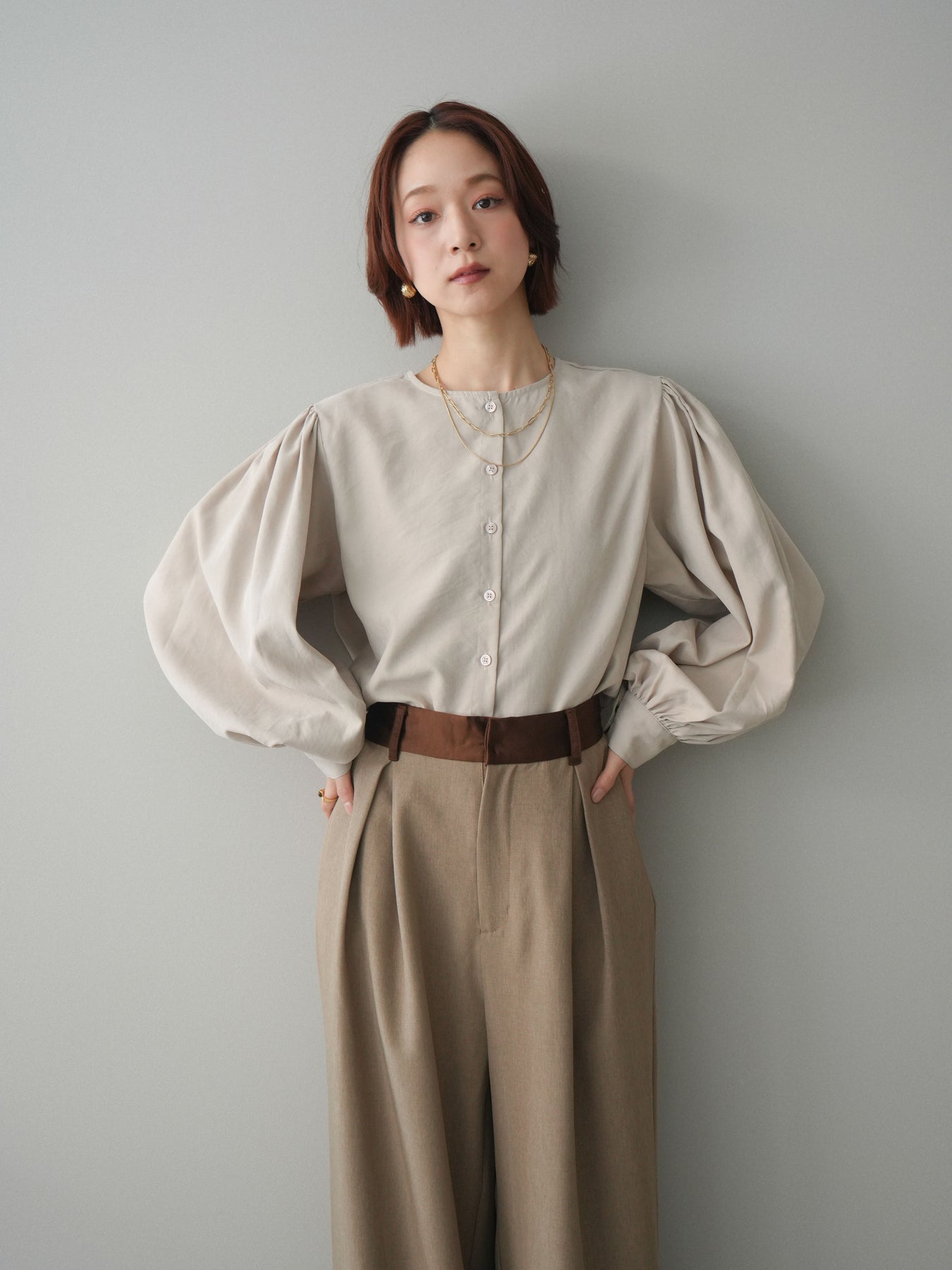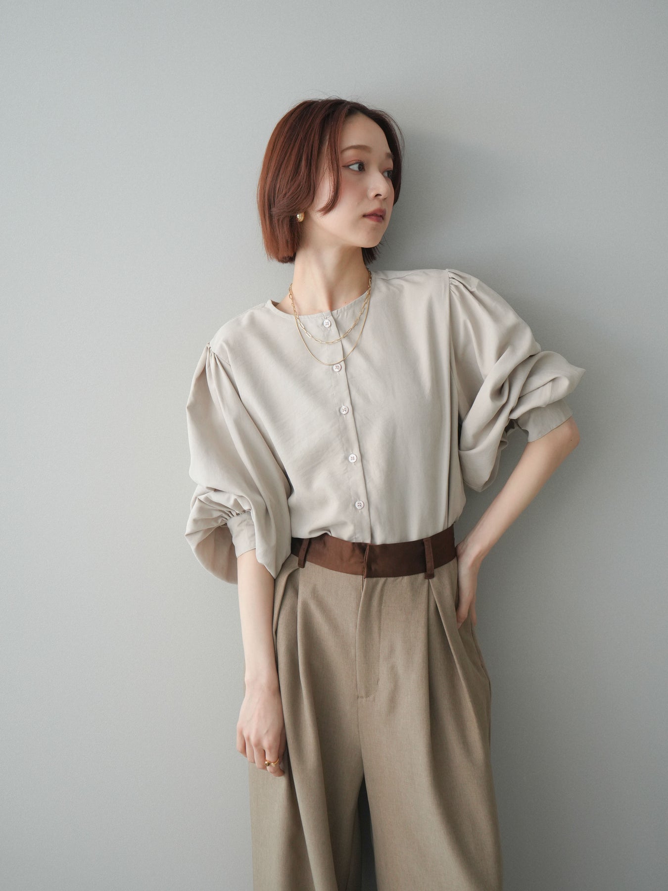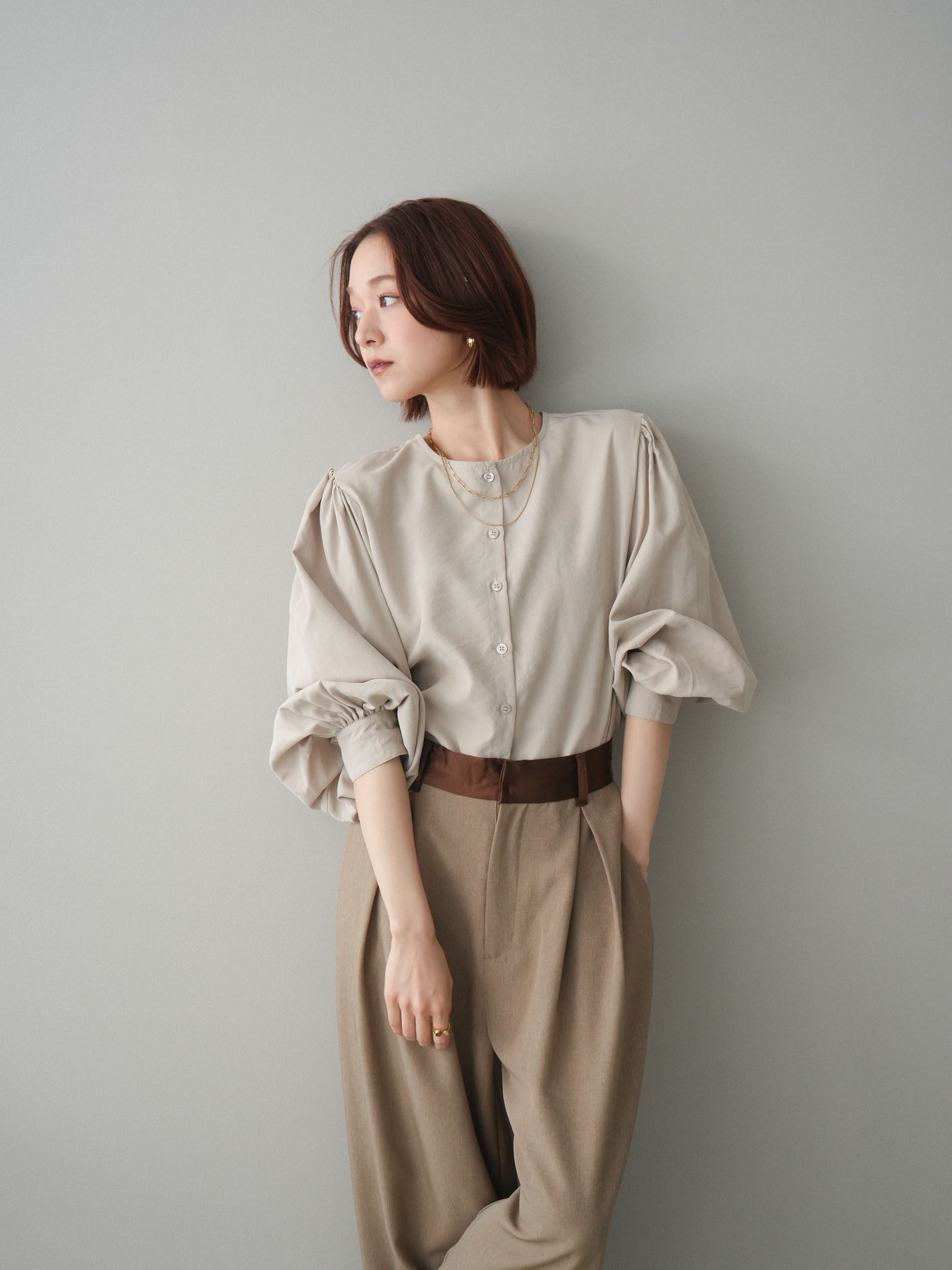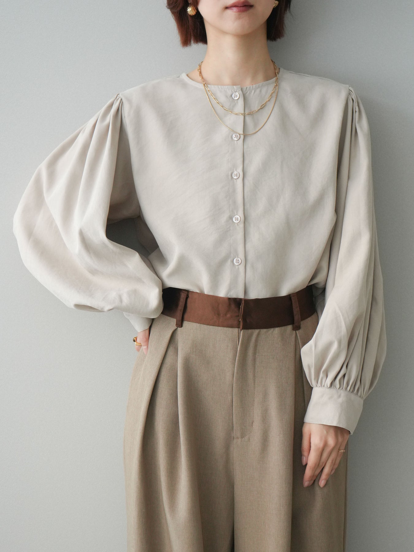 [予約]2WAYピーチスキンボリュームスリーブブラウス/greige