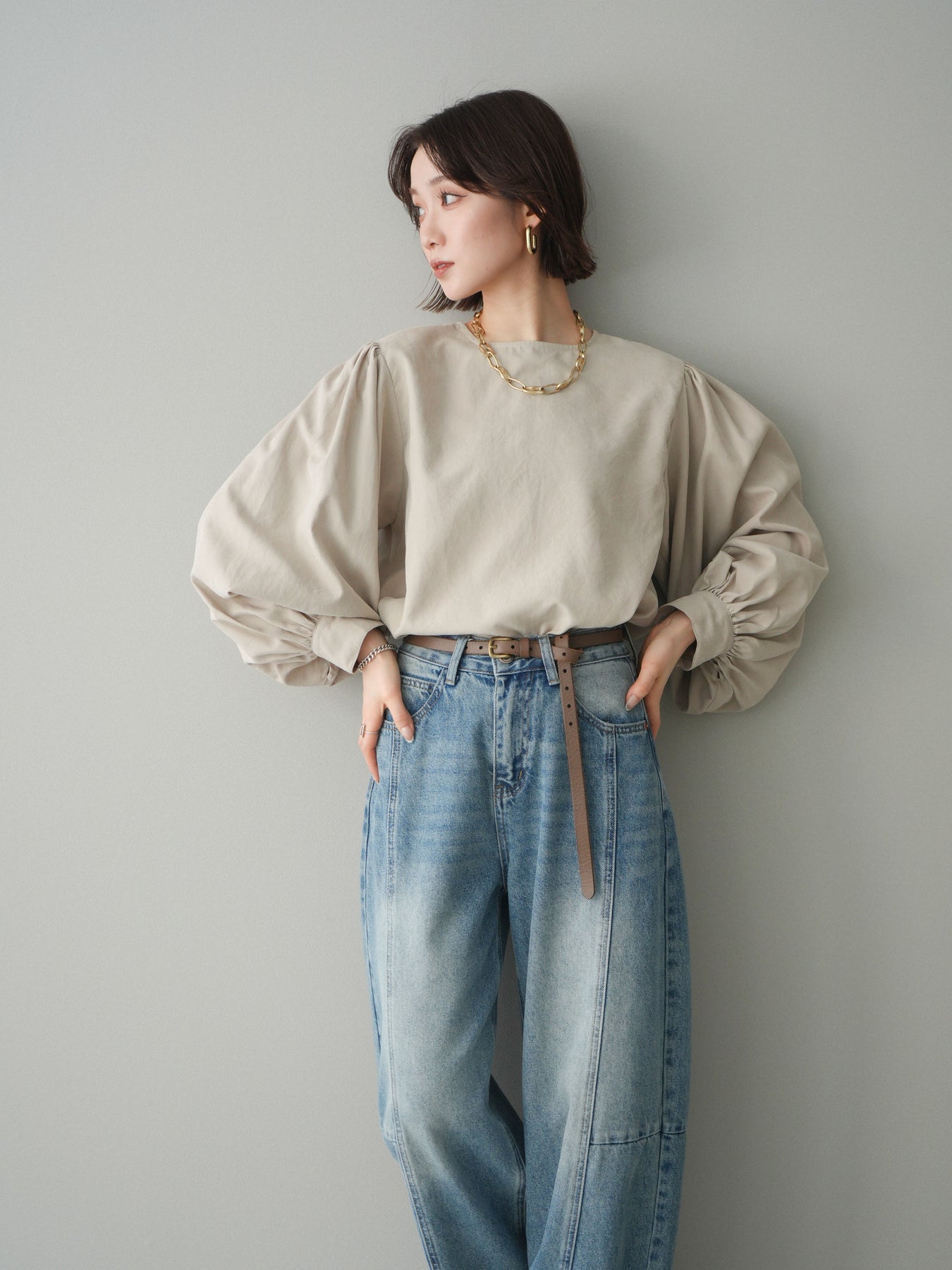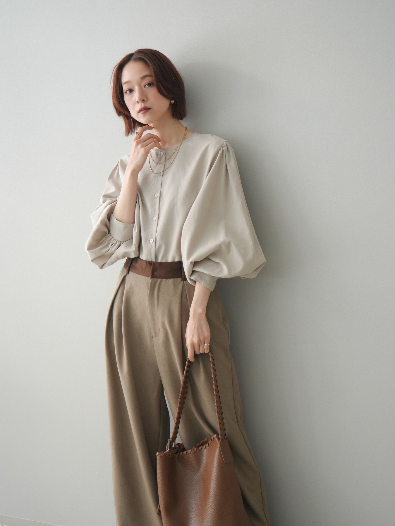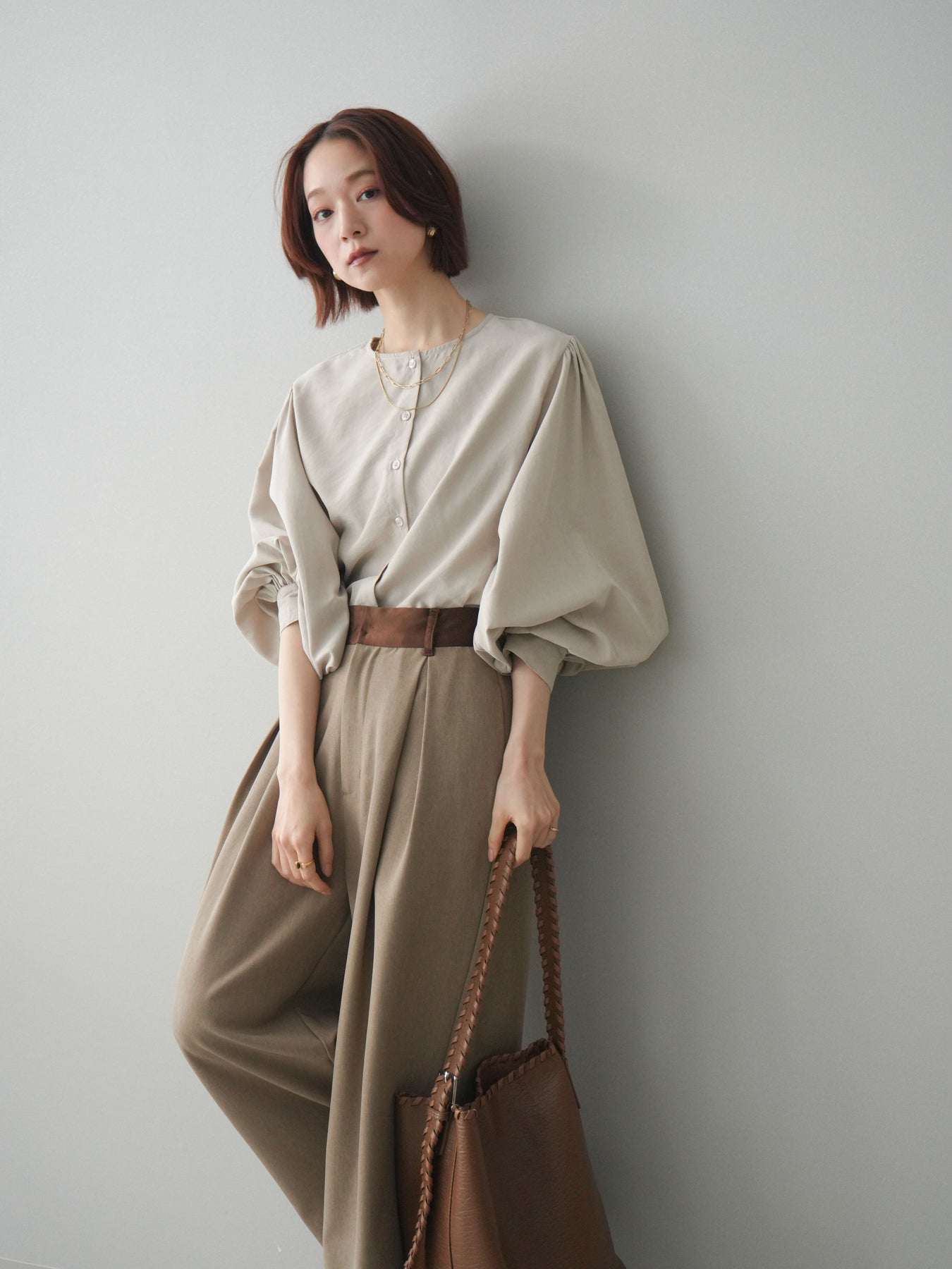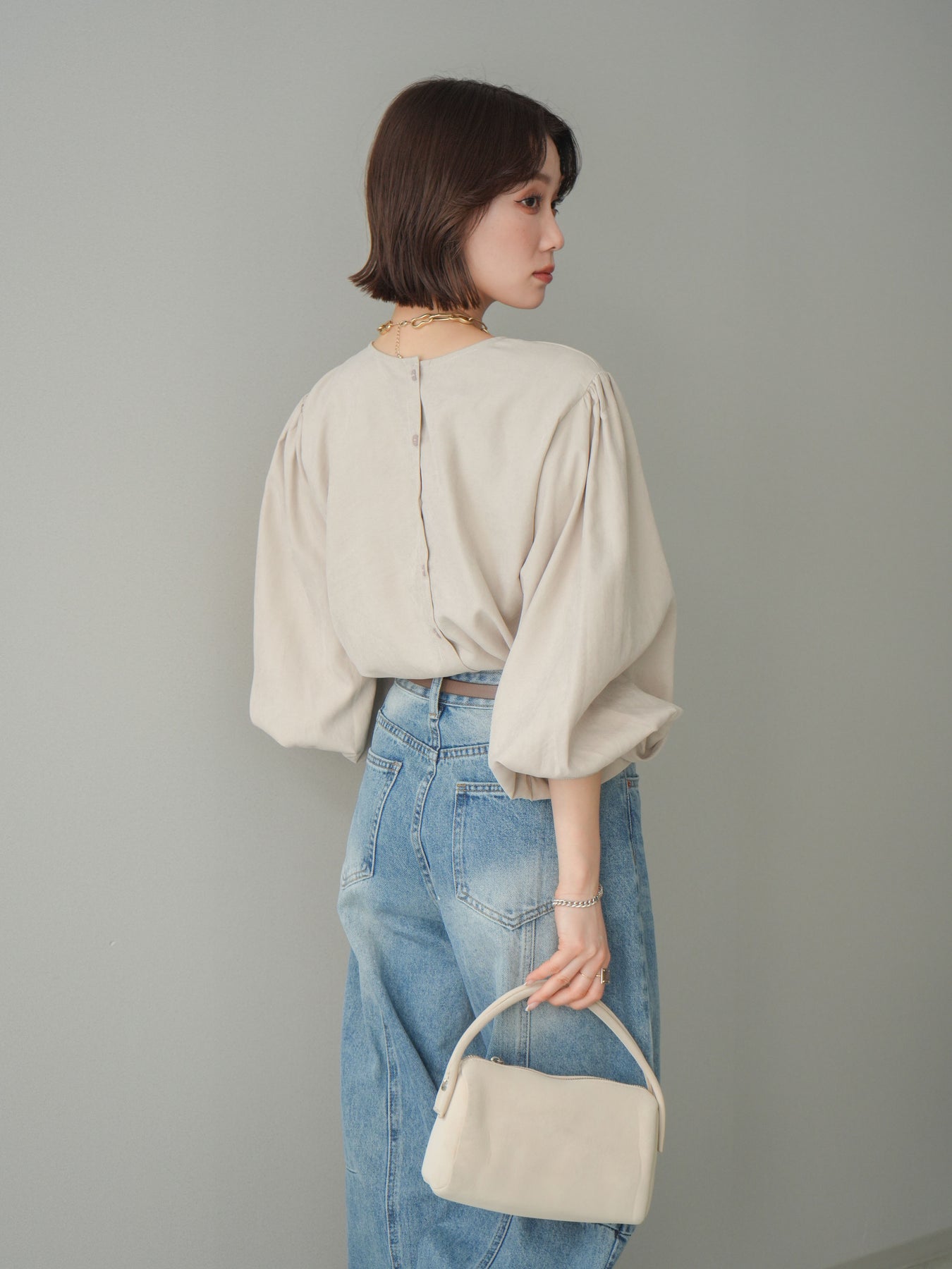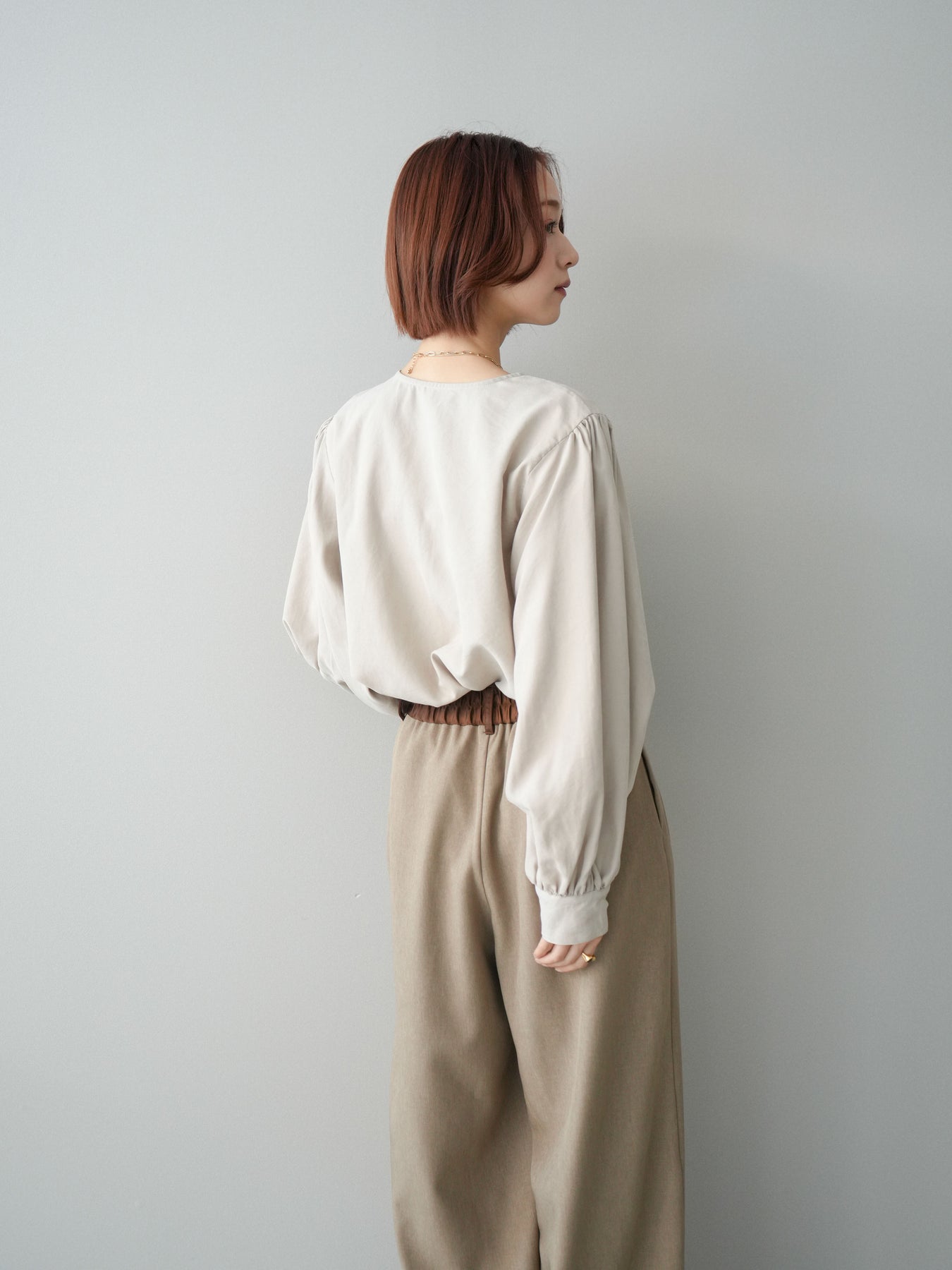 [予約]2WAYピーチスキンボリュームスリーブブラウス/greige