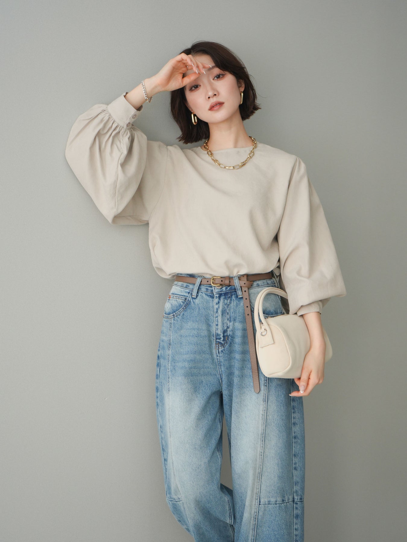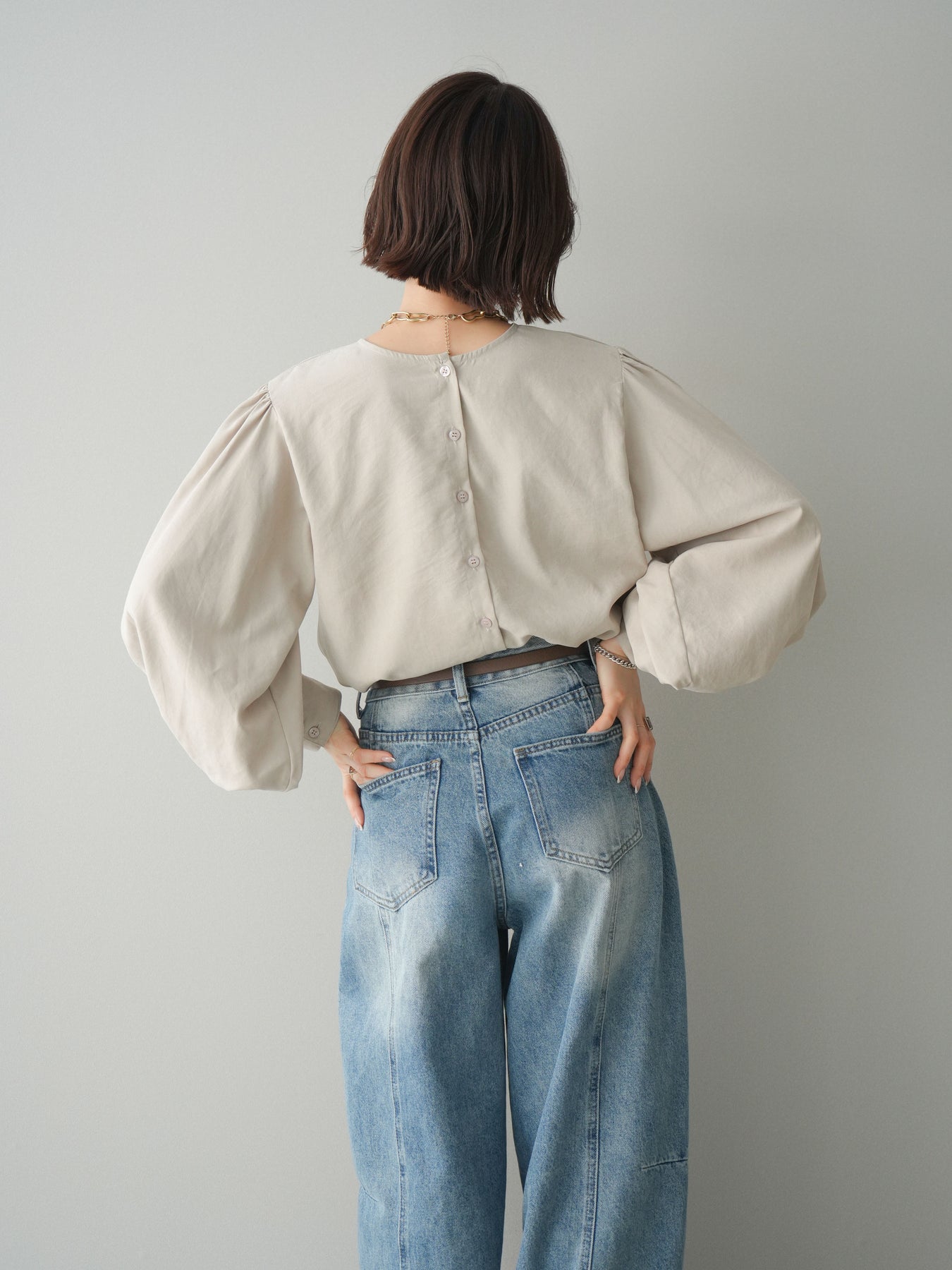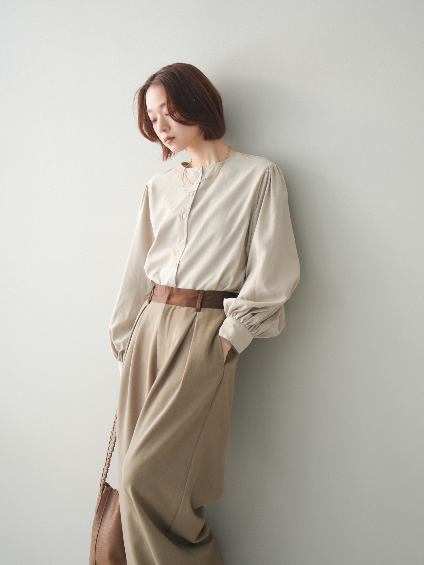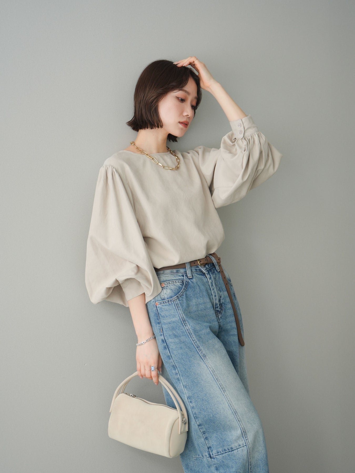 [予約]2WAYピーチスキンボリュームスリーブブラウス/greige