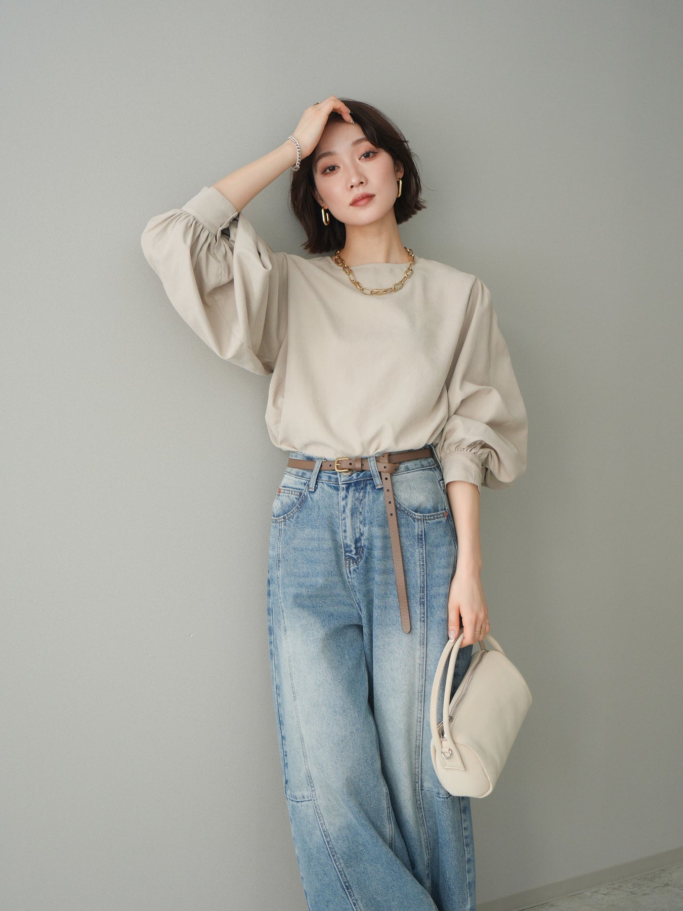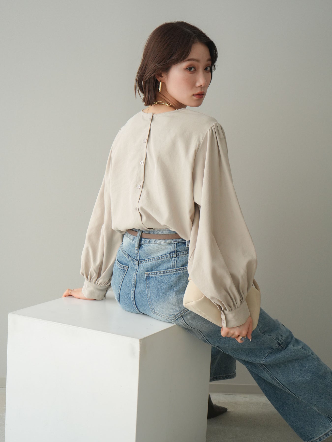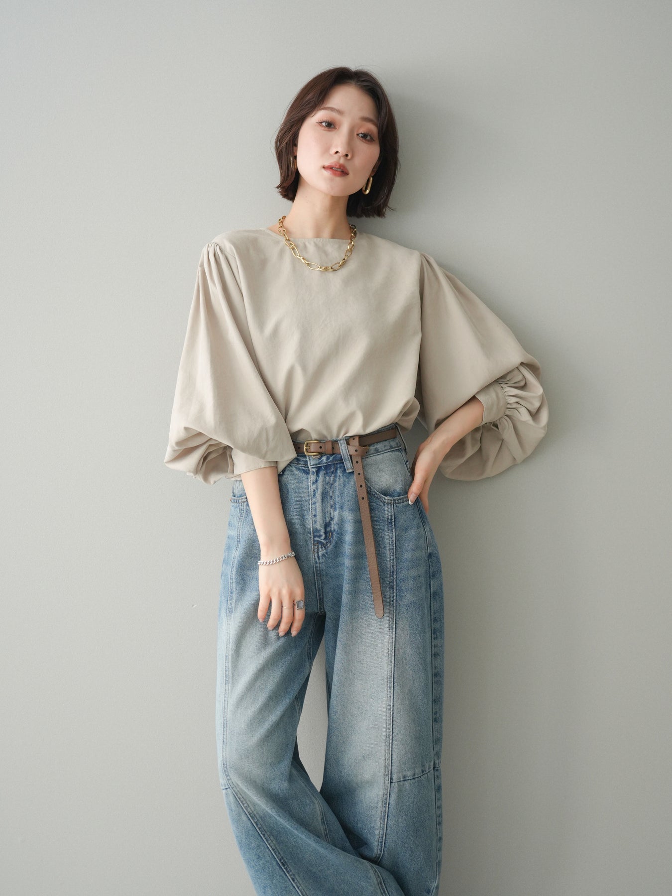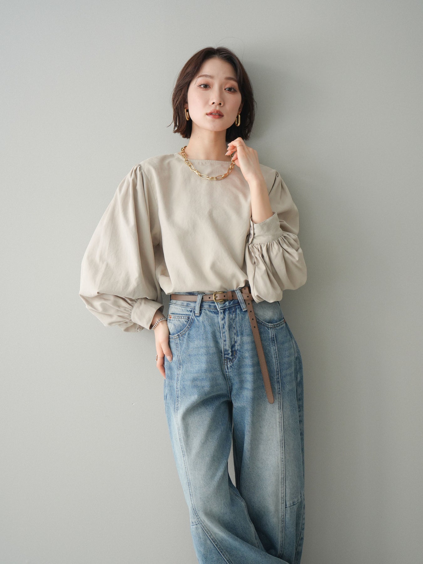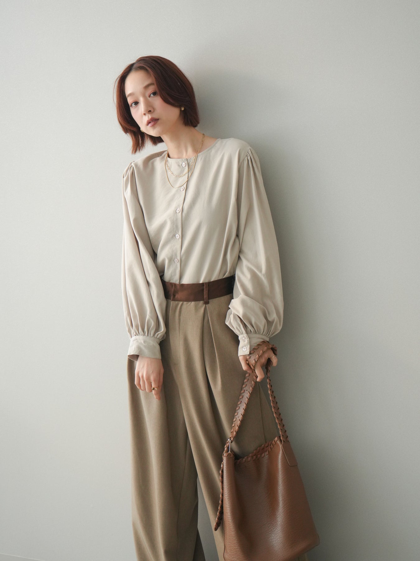 [予約]2WAYピーチスキンボリュームスリーブブラウス/greige