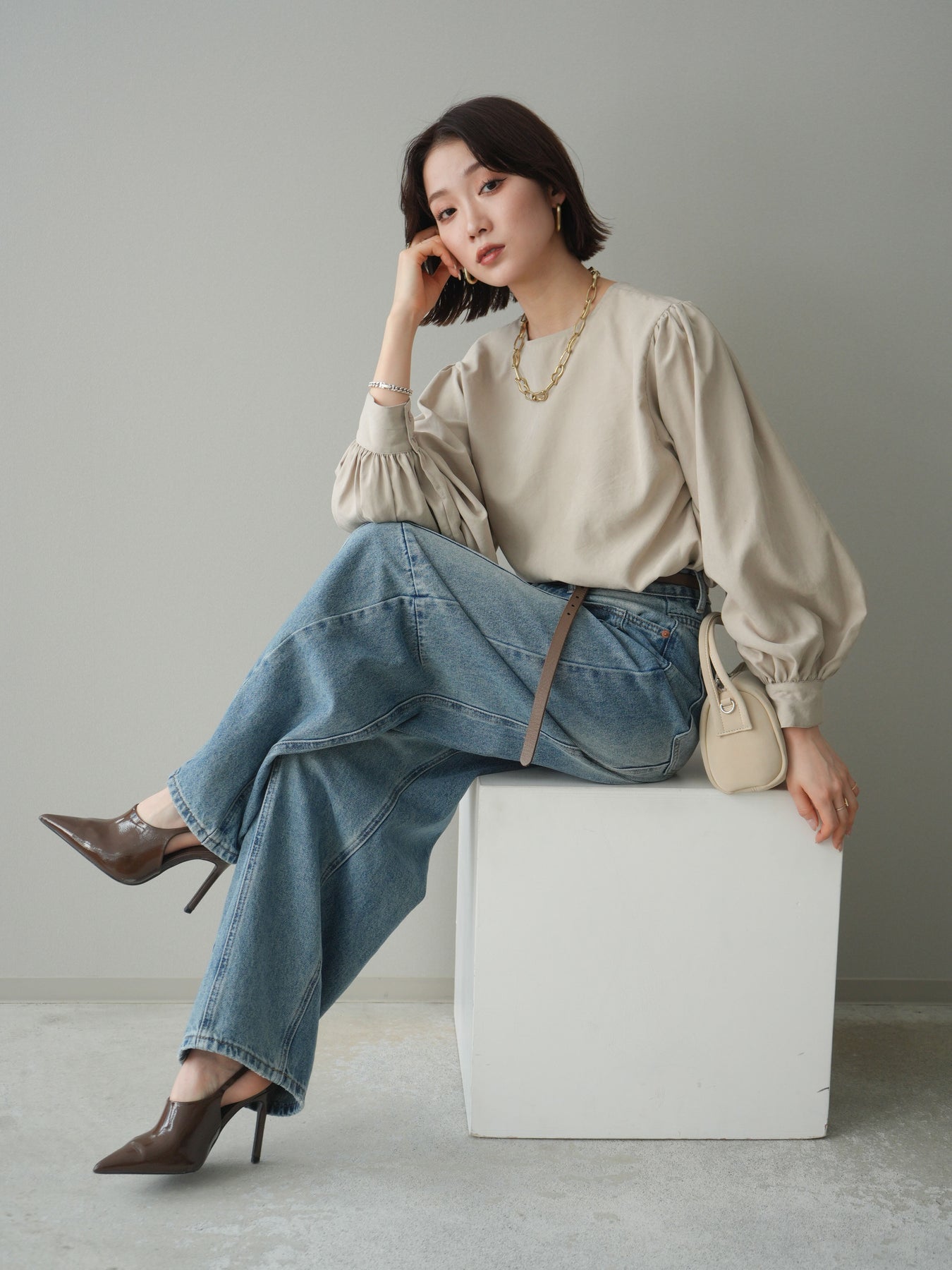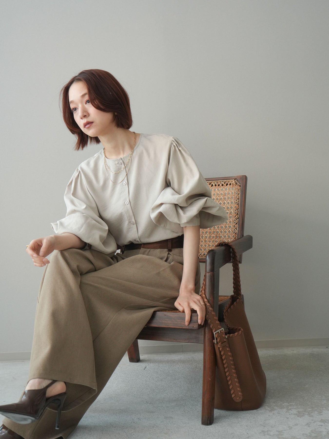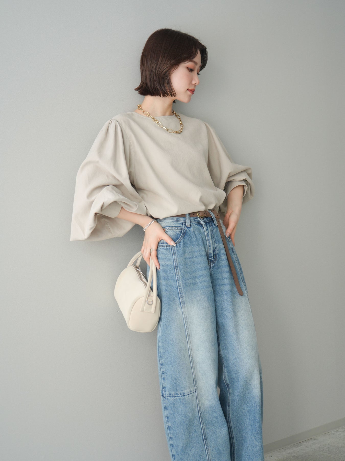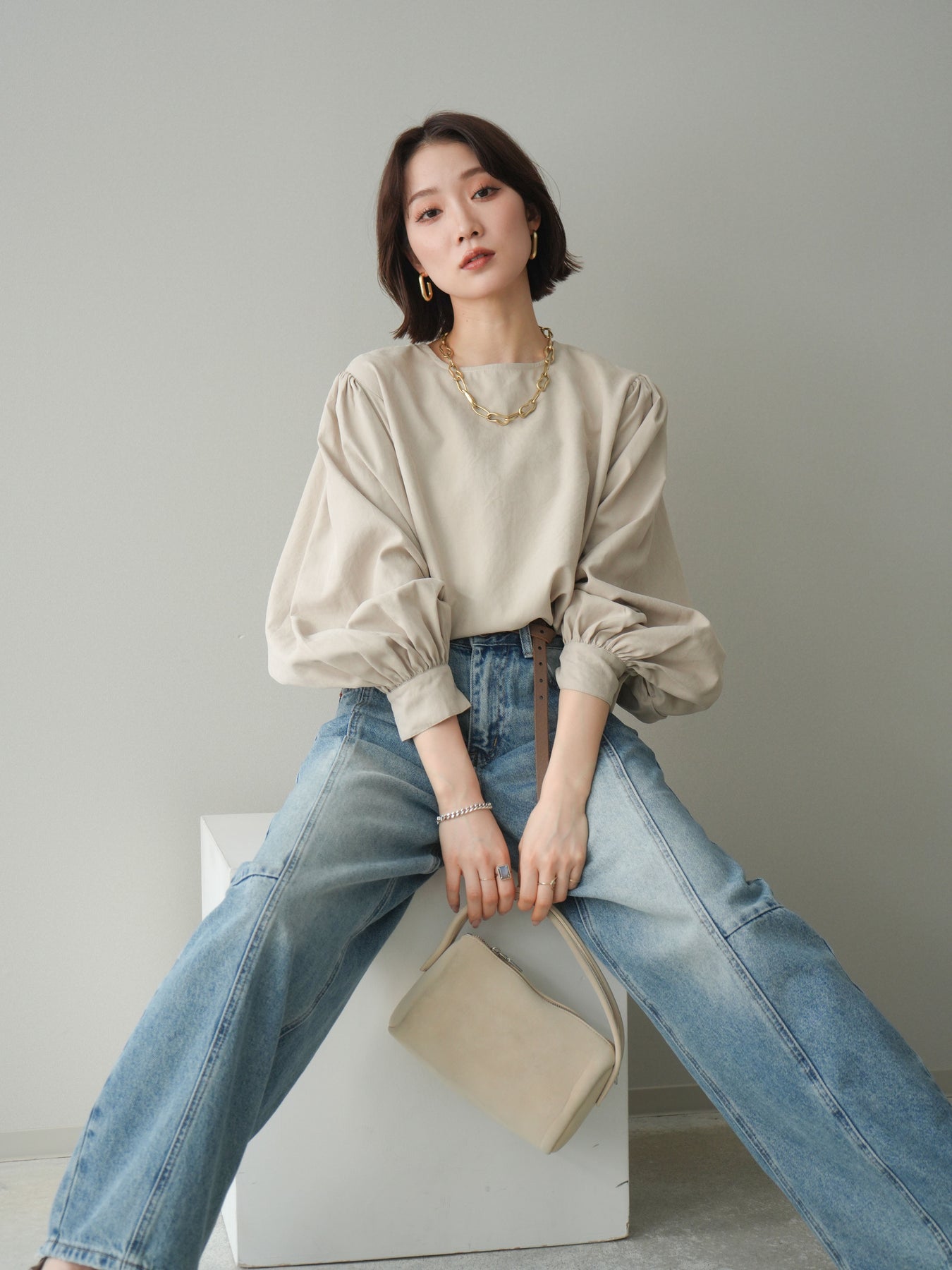 [予約]2WAYピーチスキンボリュームスリーブブラウス/greige