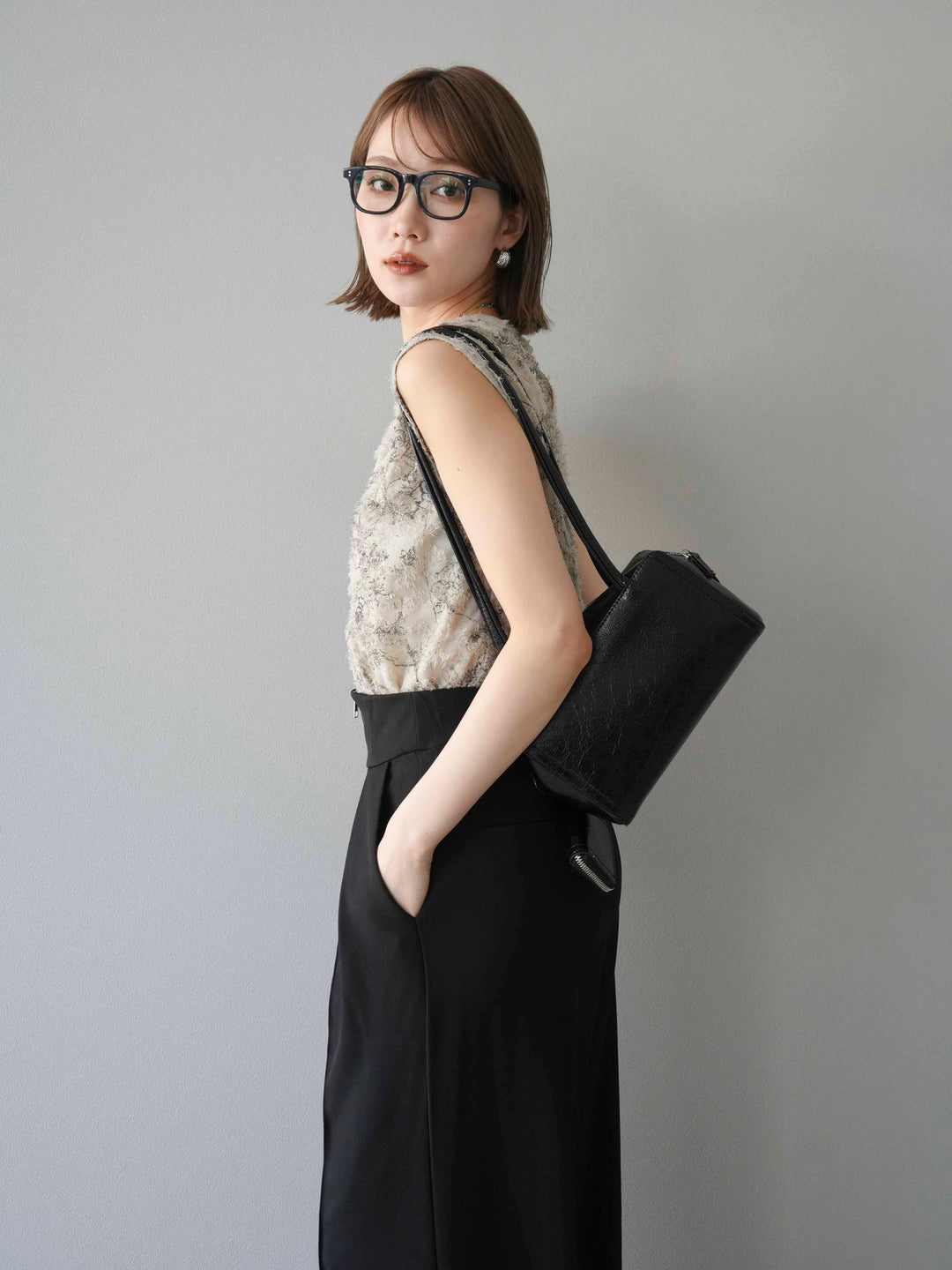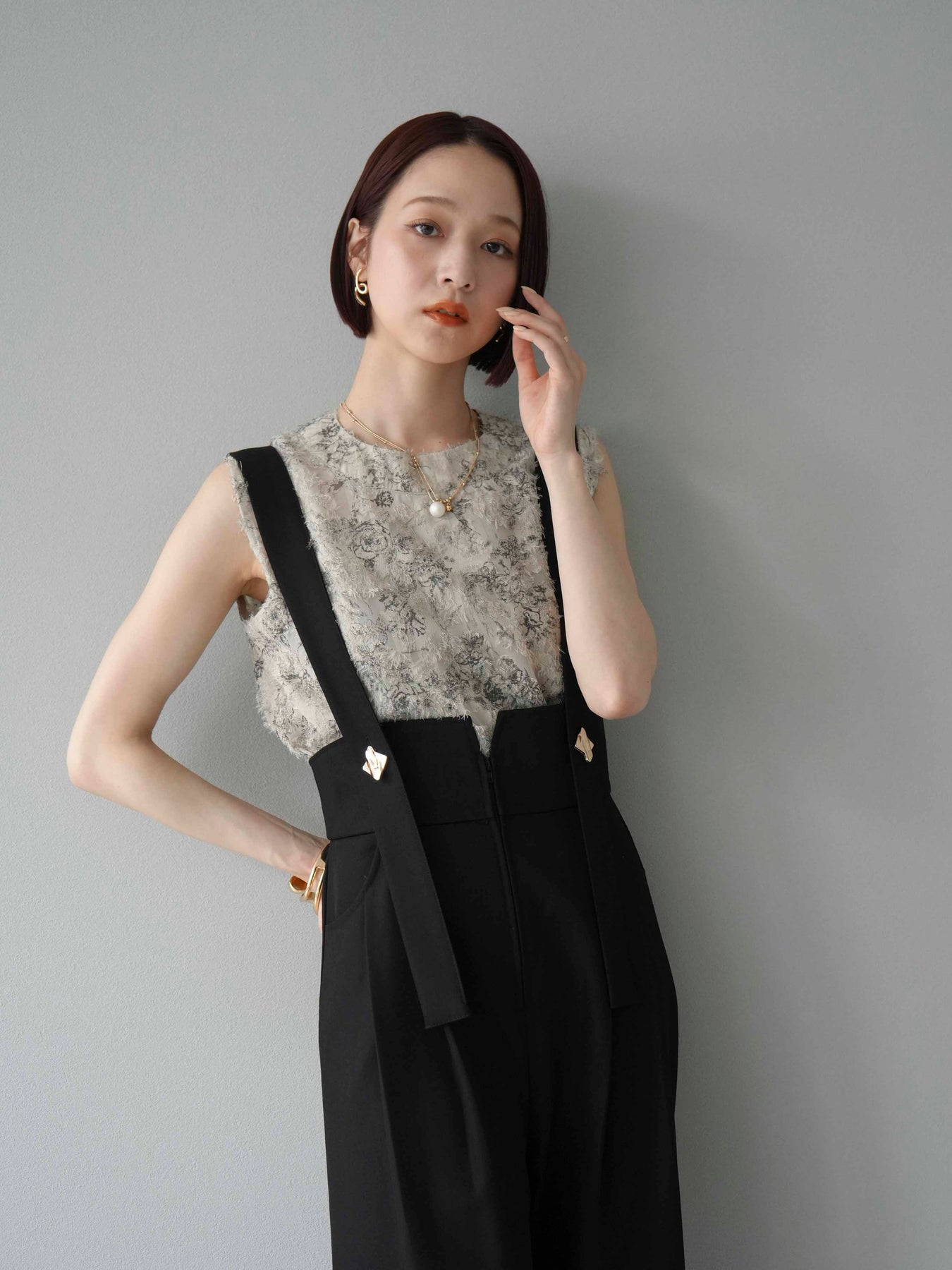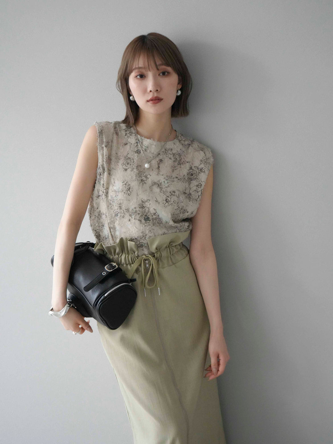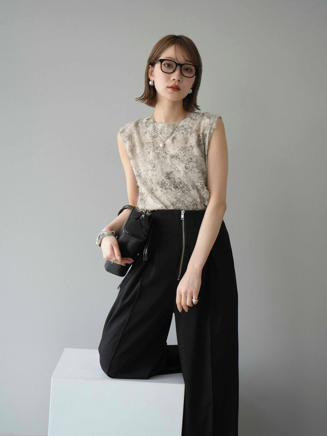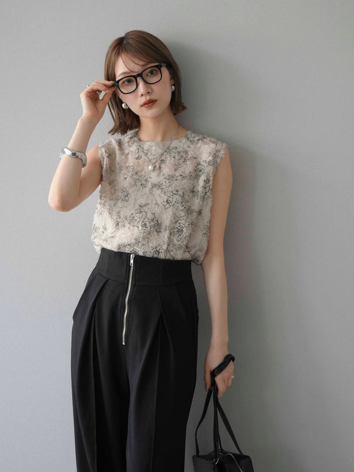 表情豊かなフリンジジャガード素材が印象的なノースリーブブラウス。繊細な柄感と程よい立体感がトレンドムードを演出し、着るだけで着映えする一枚。ボックスシルエットでゆるやかに体を包み、インでもアウトでもバランス良く決まります。きれいめからカジュアルまで幅広いスタイリングにマッチ。 ※ボトムス、キャミソール(インナー)以外の商品は一律でインナーは付属していません