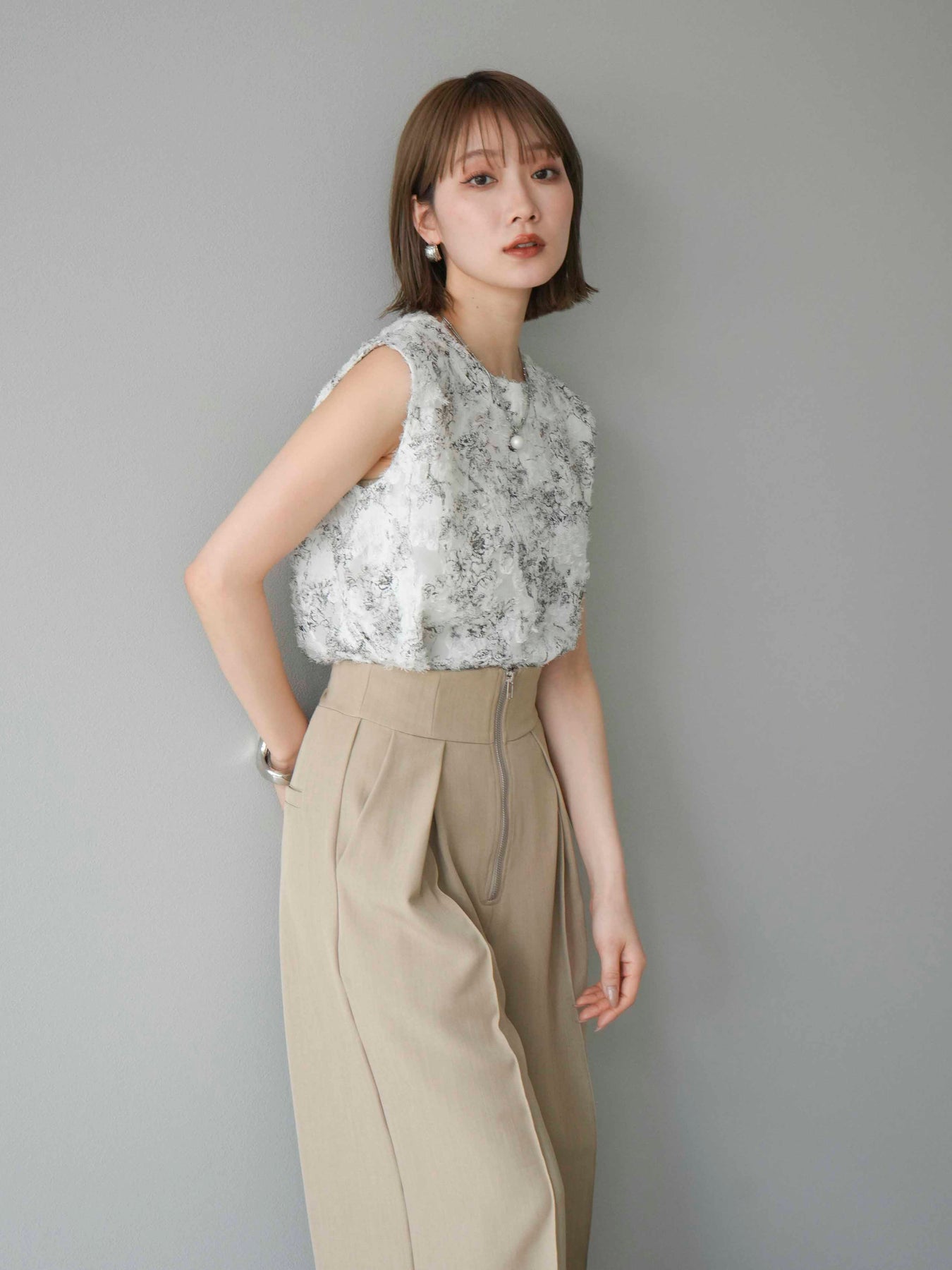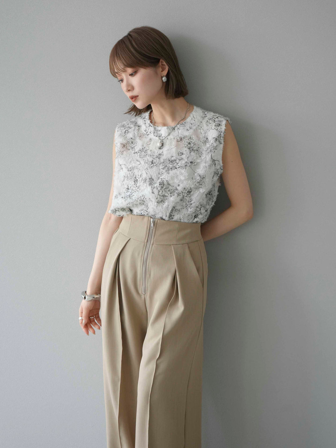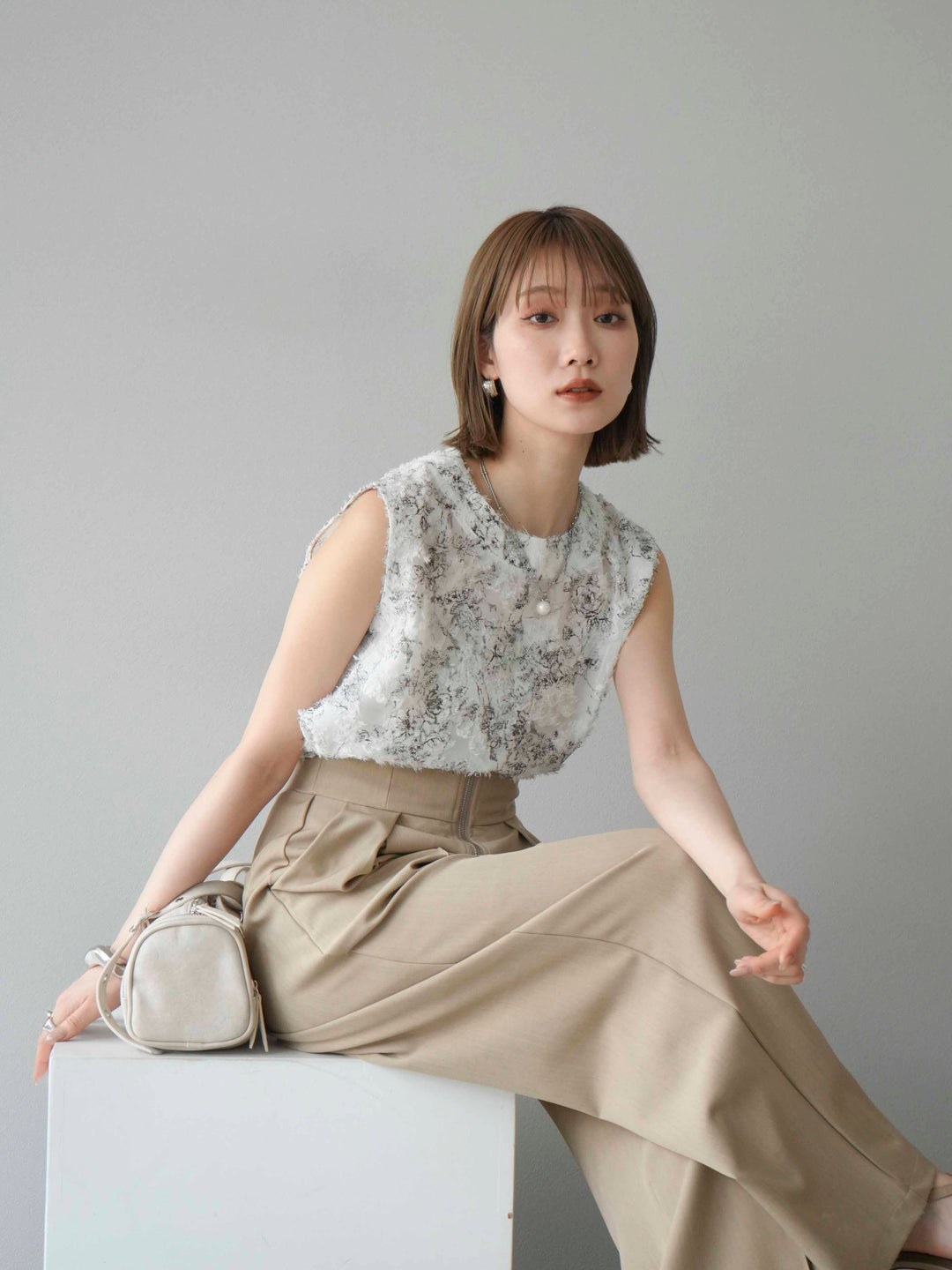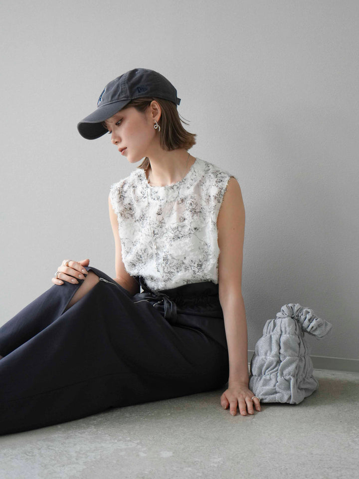 表情豊かなフリンジジャガード素材が印象的なノースリーブブラウス。繊細な柄感と程よい立体感がトレンドムードを演出し、着るだけで着映えする一枚。ボックスシルエットでゆるやかに体を包み、インでもアウトでもバランス良く決まります。きれいめからカジュアルまで幅広いスタイリングにマッチ。 ※ボトムス、キャミソール(インナー)以外の商品は一律でインナーは付属していません