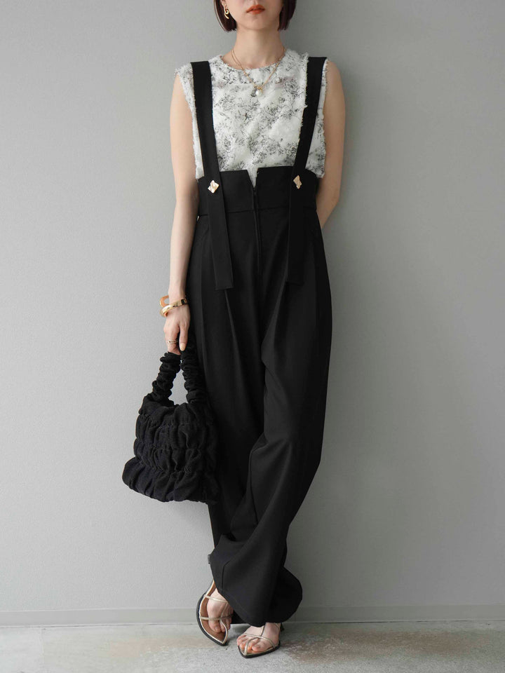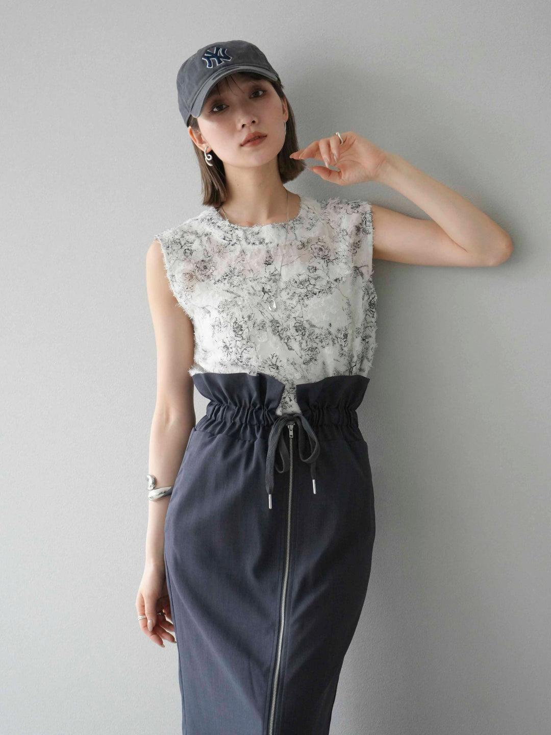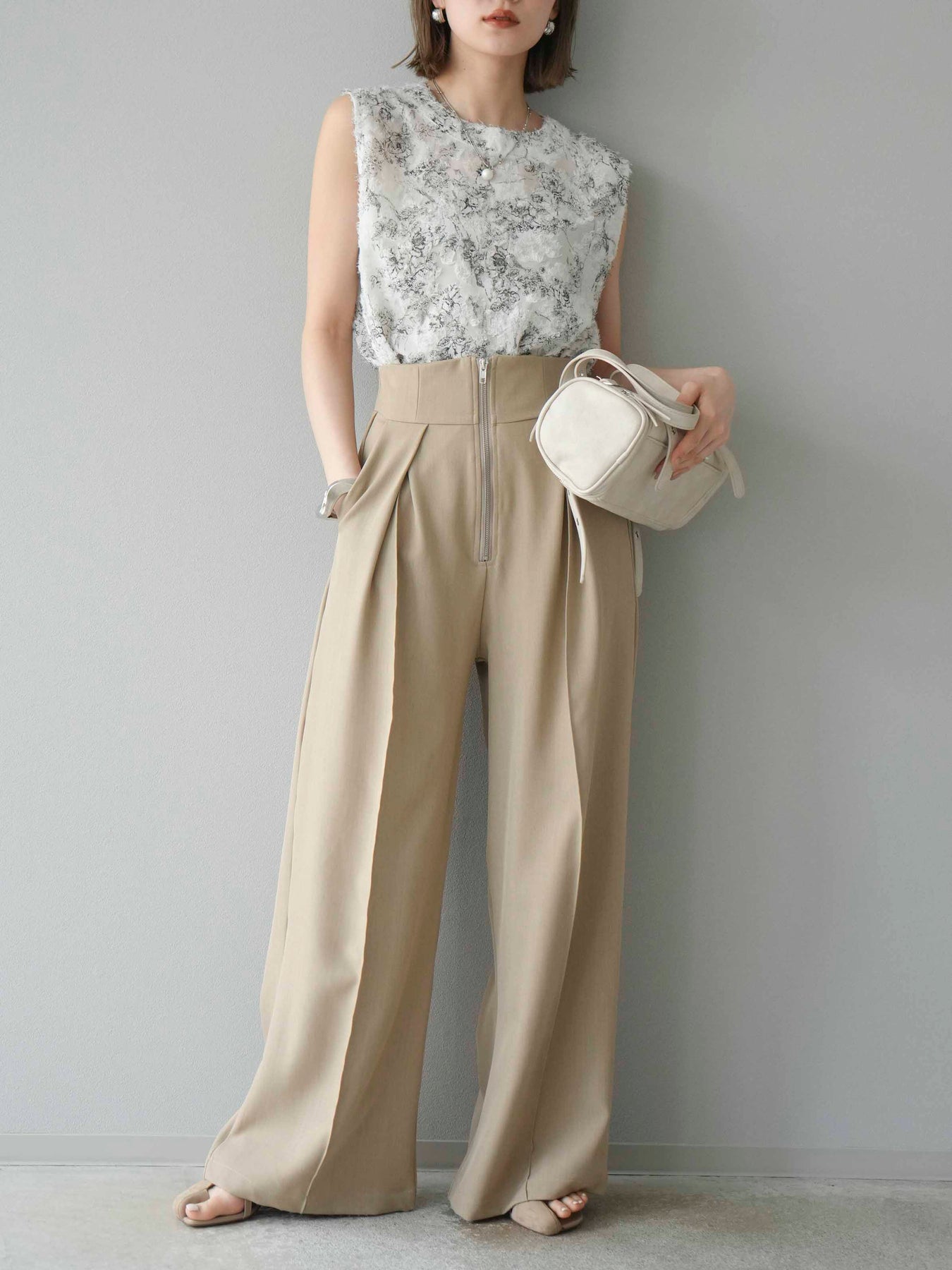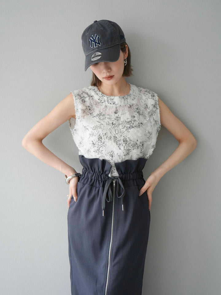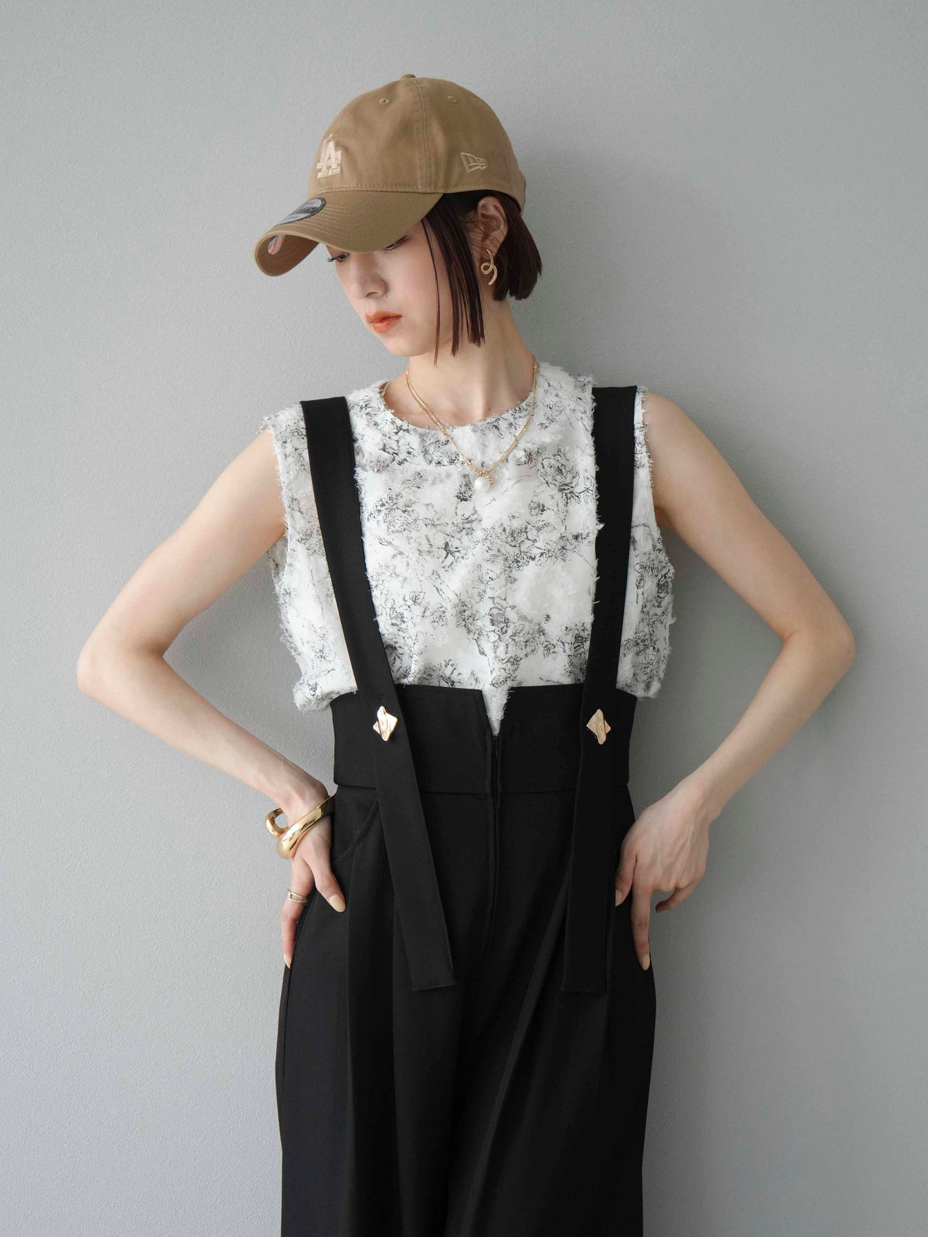 表情豊かなフリンジジャガード素材が印象的なノースリーブブラウス。繊細な柄感と程よい立体感がトレンドムードを演出し、着るだけで着映えする一枚。ボックスシルエットでゆるやかに体を包み、インでもアウトでもバランス良く決まります。きれいめからカジュアルまで幅広いスタイリングにマッチ。 ※ボトムス、キャミソール(インナー)以外の商品は一律でインナーは付属していません
