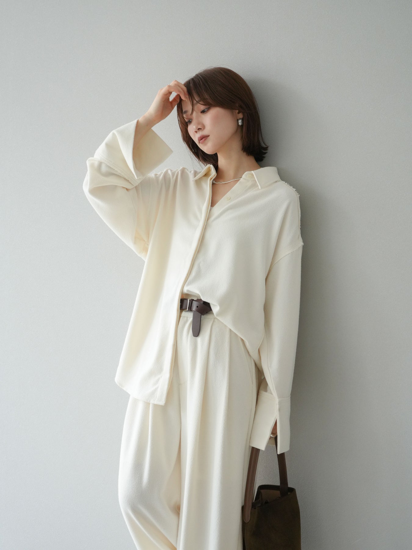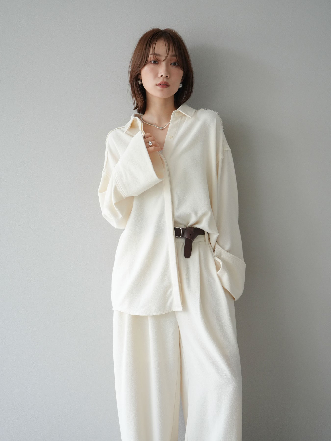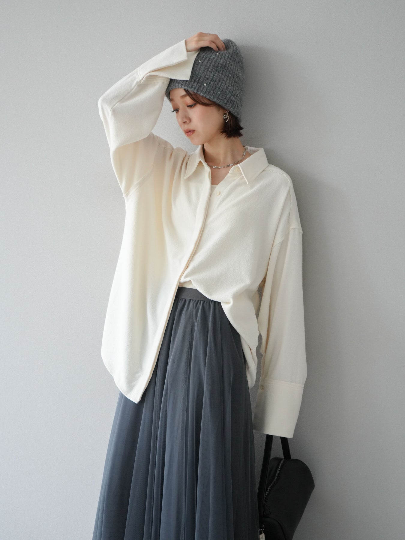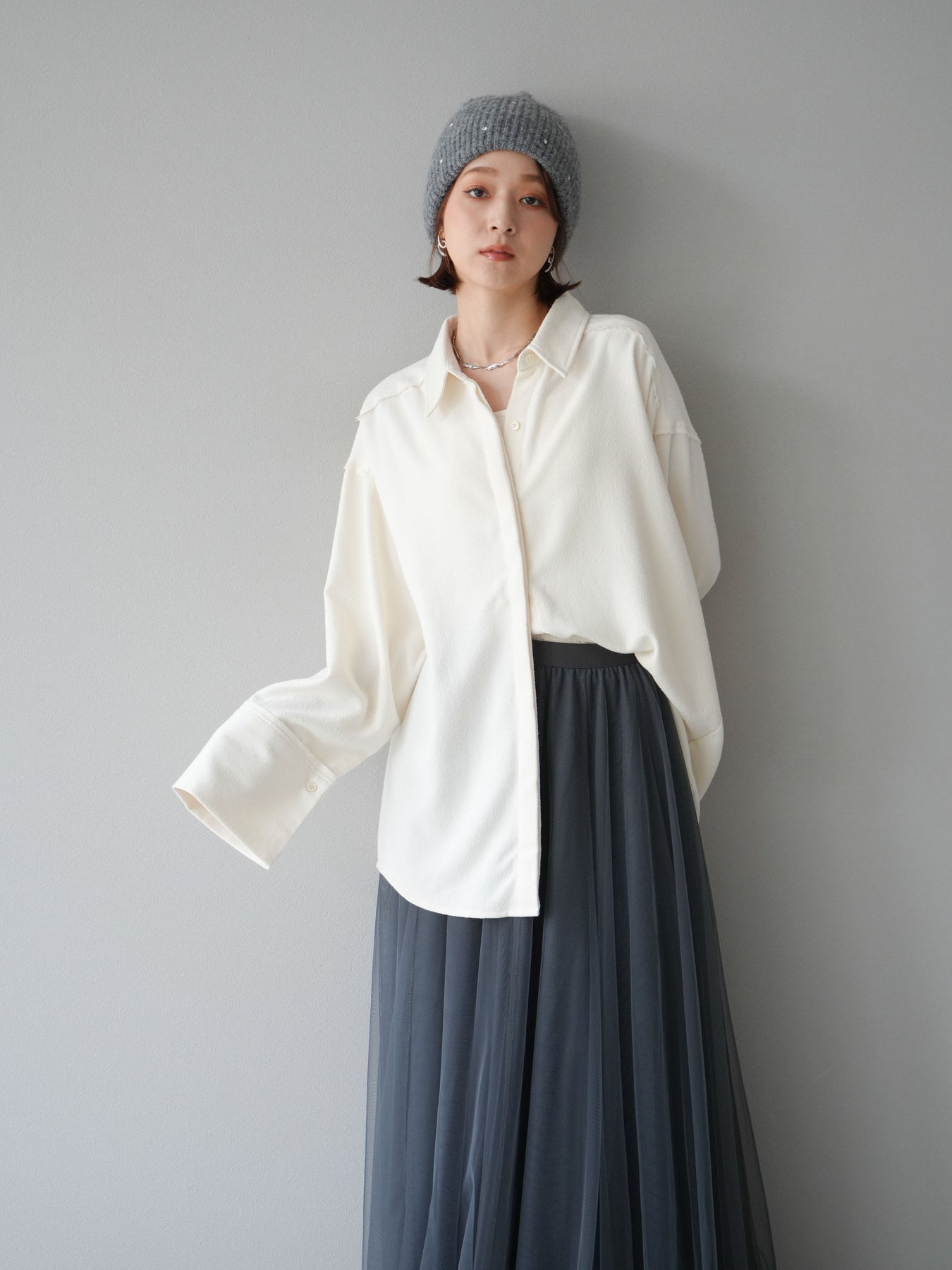 ナチュラルな風合いが魅力のネップ素材を使用したオーバーシャツ。独特の凹凸感が表情を生み、シンプルながらもこなれた印象に仕上がります。ゆったりとしたシルエットとドロップショルダーが抜け感を演出し、リラックスした着心地を叶える一枚。前後差のある着丈でボトムスとのバランスが取りやすく、羽織りとしてもトップスとしても活躍します。パンツスタイルでシャープにまとめても、スカートと合わせて柔らかさをプラスしても様になる万能なアイテムです。 ※ボトムス、キャミソール(インナー)以外の商品は一律でインナーは付属していません。