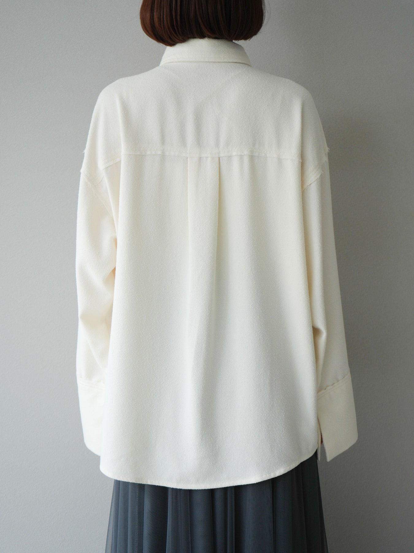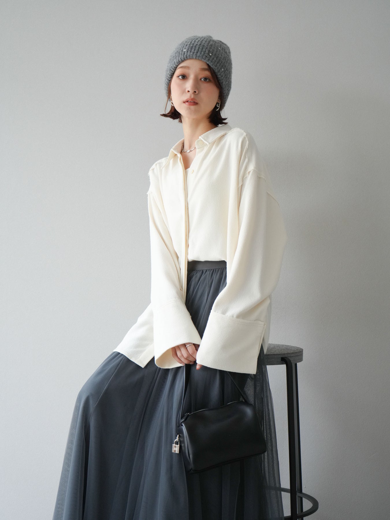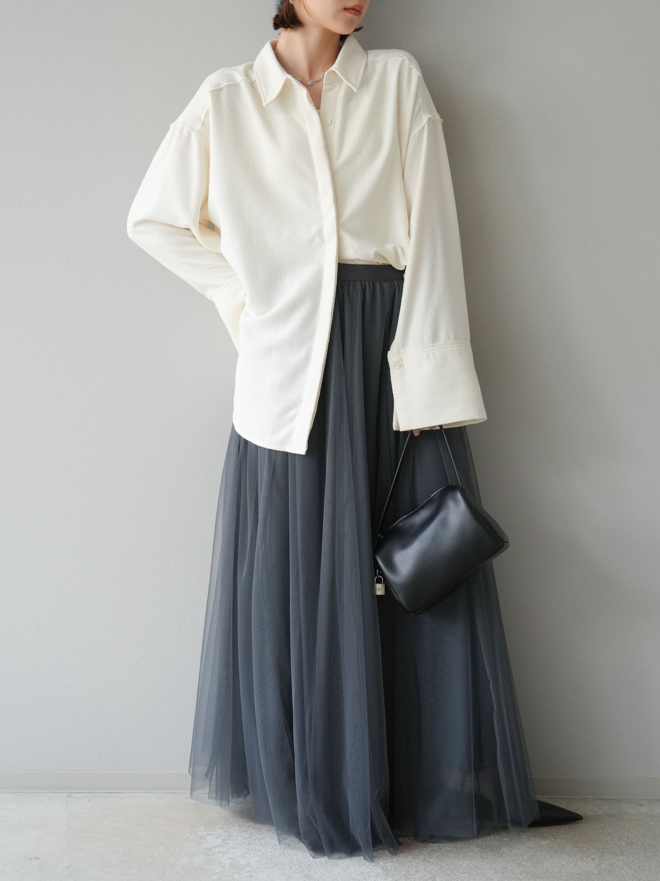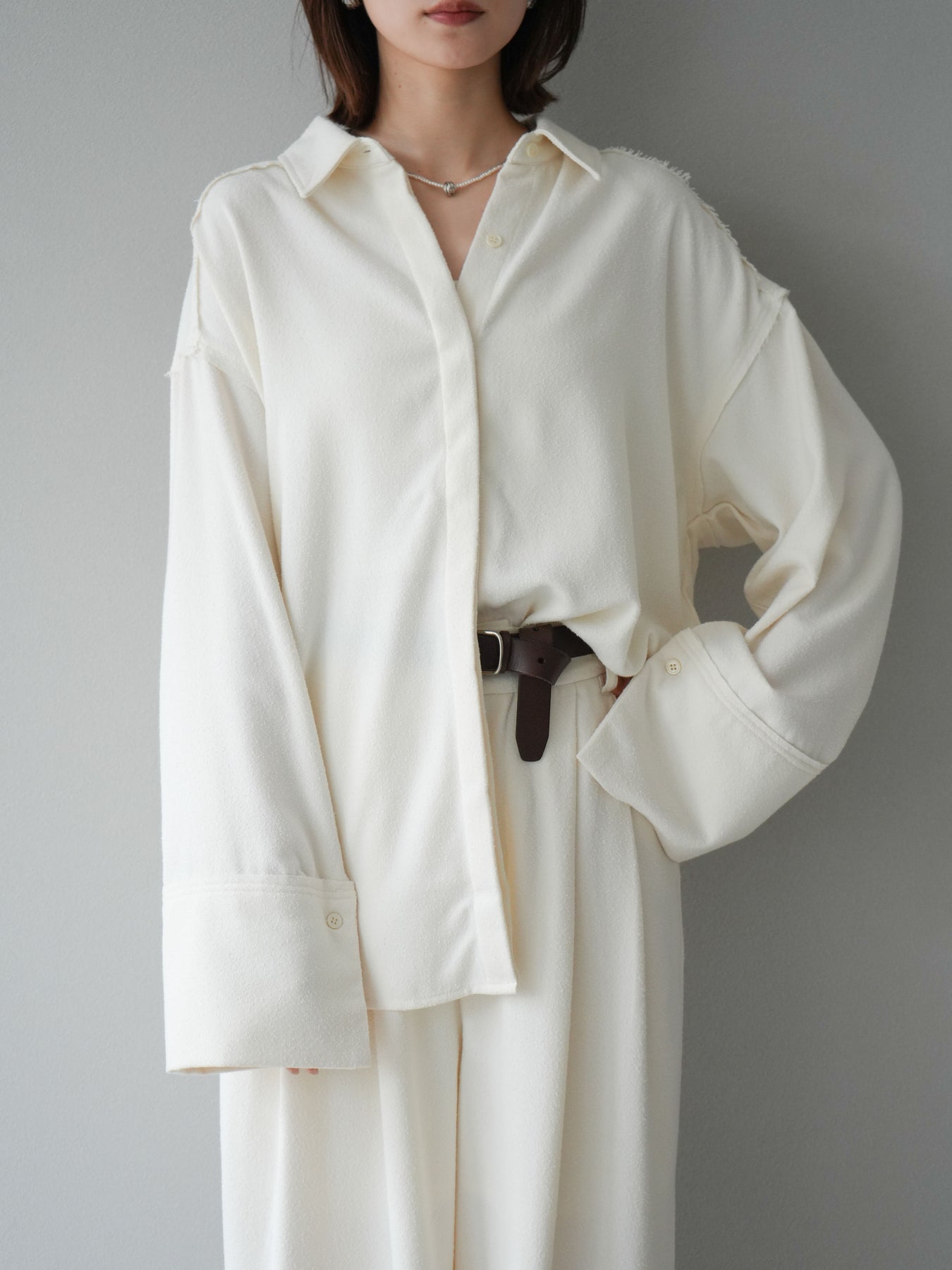 ナチュラルな風合いが魅力のネップ素材を使用したオーバーシャツ。独特の凹凸感が表情を生み、シンプルながらもこなれた印象に仕上がります。ゆったりとしたシルエットとドロップショルダーが抜け感を演出し、リラックスした着心地を叶える一枚。前後差のある着丈でボトムスとのバランスが取りやすく、羽織りとしてもトップスとしても活躍します。パンツスタイルでシャープにまとめても、スカートと合わせて柔らかさをプラスしても様になる万能なアイテムです。 ※ボトムス、キャミソール(インナー)以外の商品は一律でインナーは付属していません。