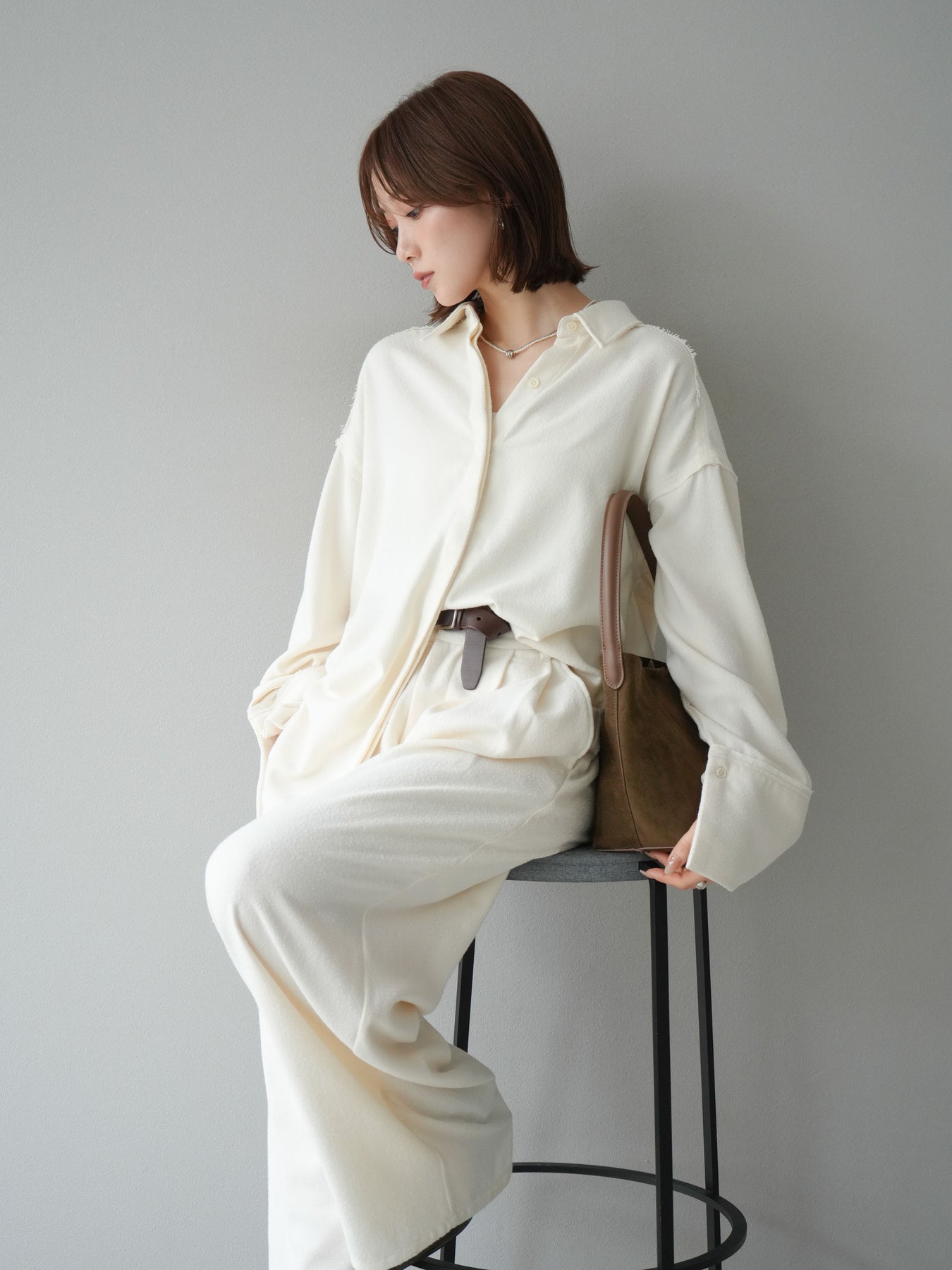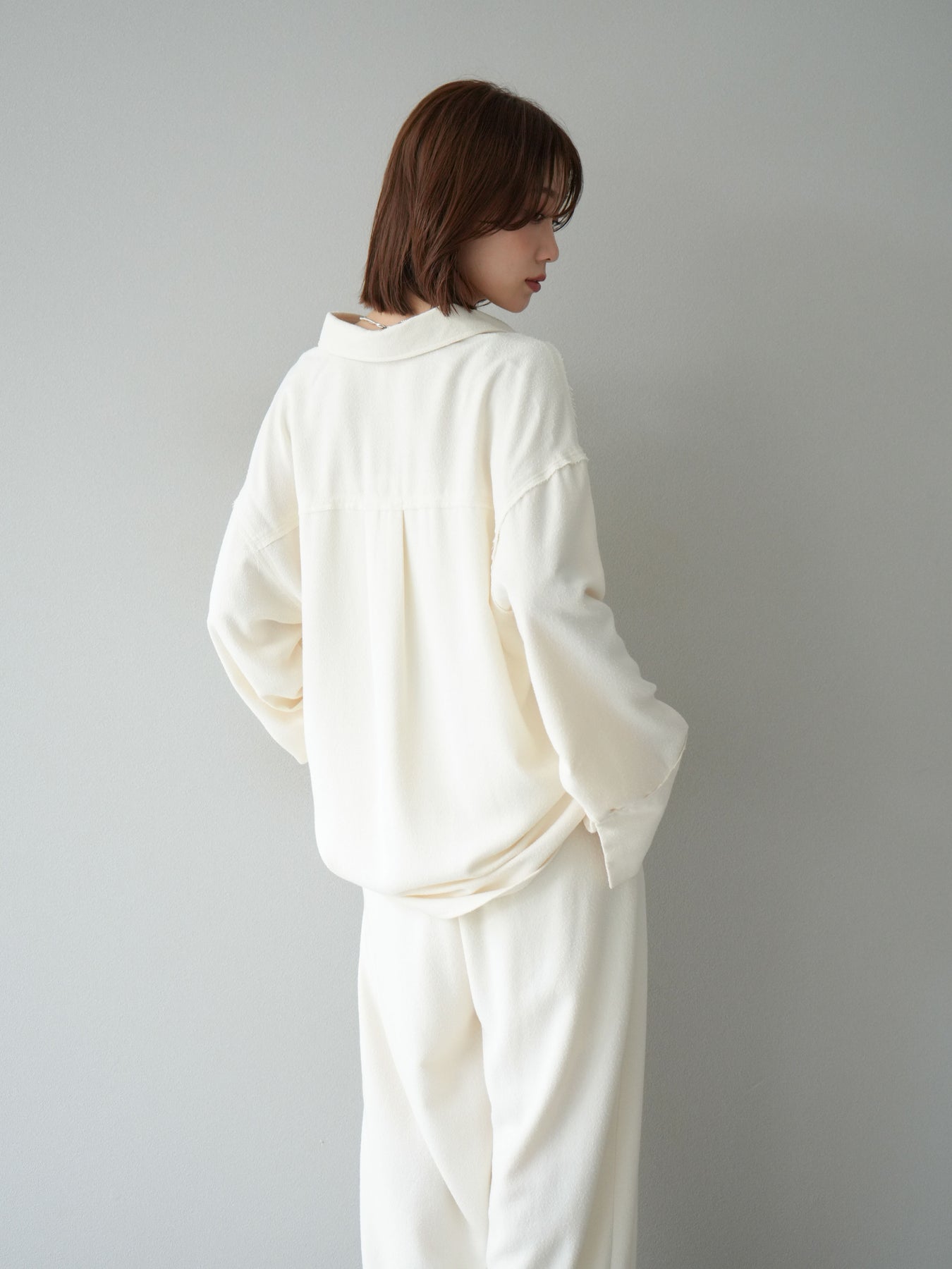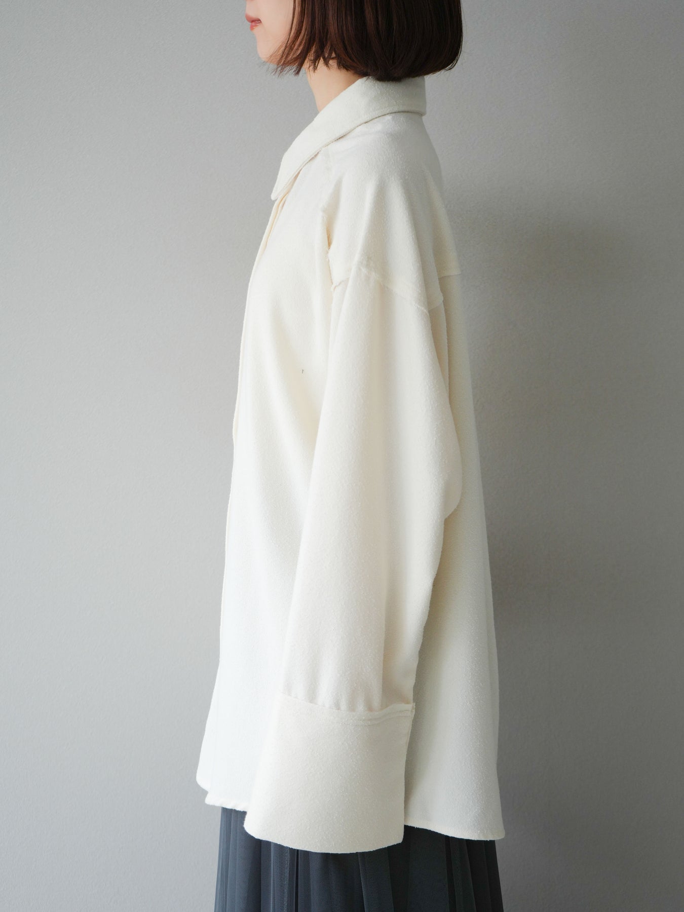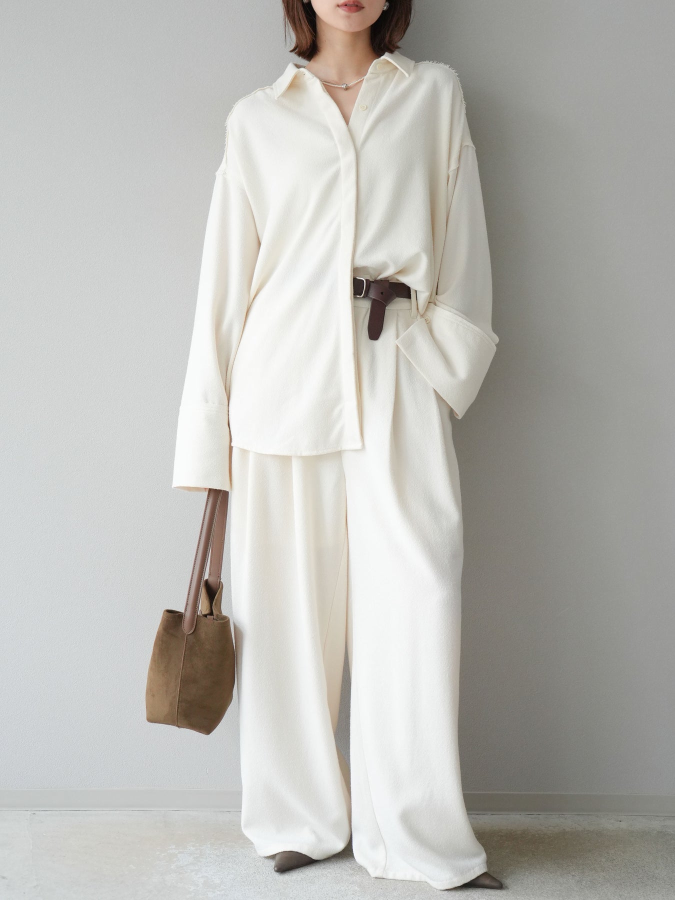 ナチュラルな風合いが魅力のネップ素材を使用したオーバーシャツ。独特の凹凸感が表情を生み、シンプルながらもこなれた印象に仕上がります。ゆったりとしたシルエットとドロップショルダーが抜け感を演出し、リラックスした着心地を叶える一枚。前後差のある着丈でボトムスとのバランスが取りやすく、羽織りとしてもトップスとしても活躍します。パンツスタイルでシャープにまとめても、スカートと合わせて柔らかさをプラスしても様になる万能なアイテムです。 ※ボトムス、キャミソール(インナー)以外の商品は一律でインナーは付属していません。