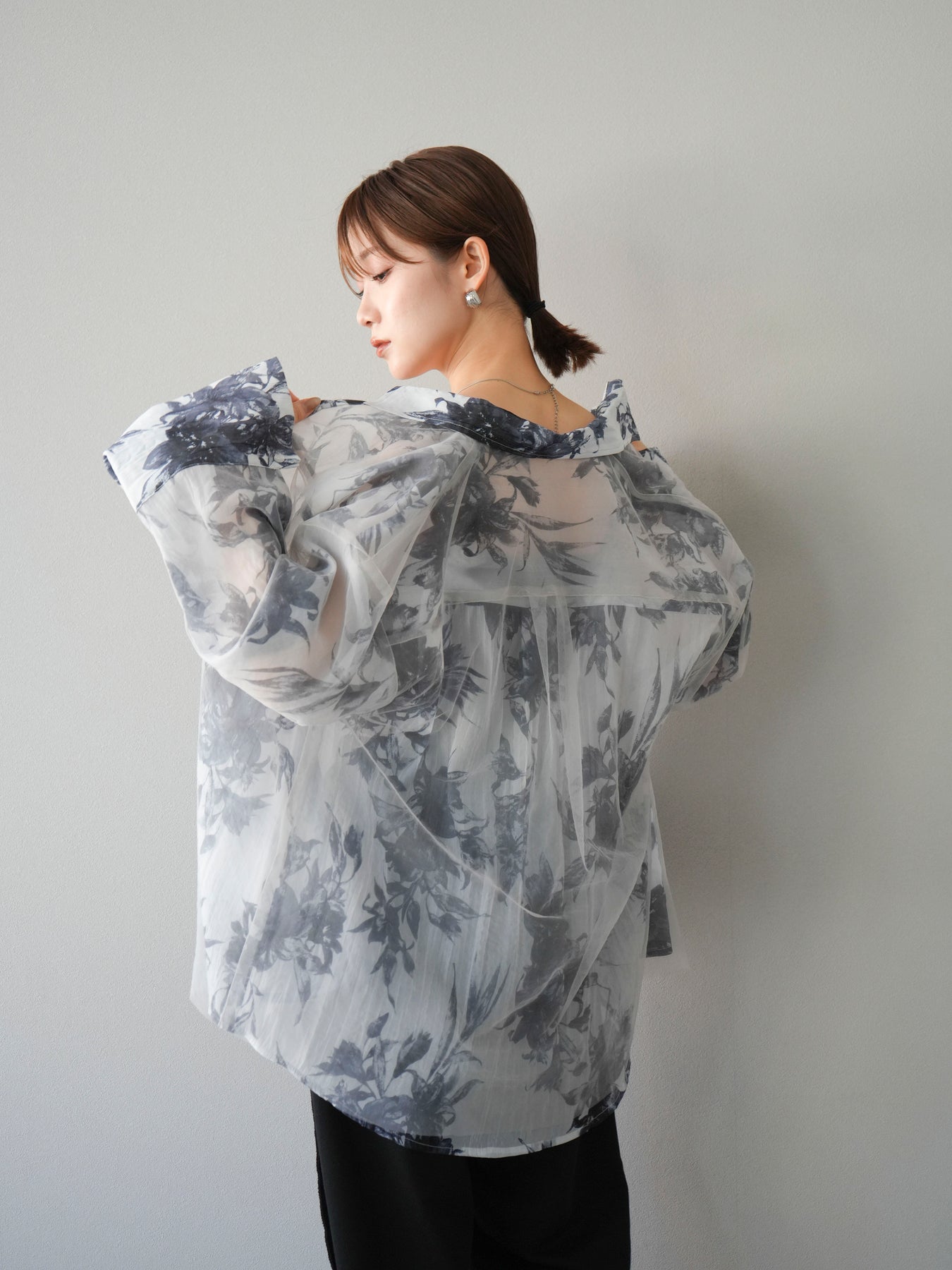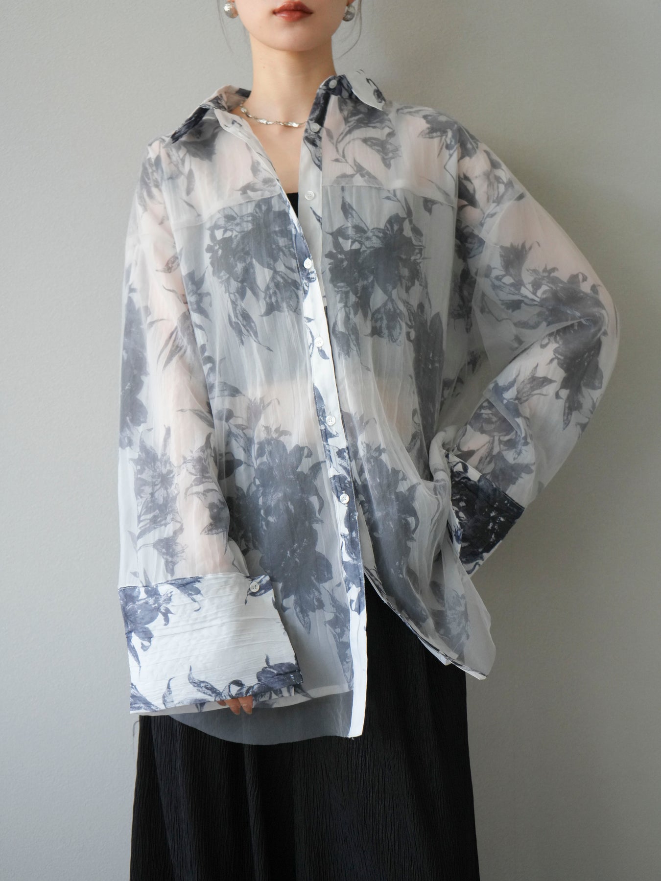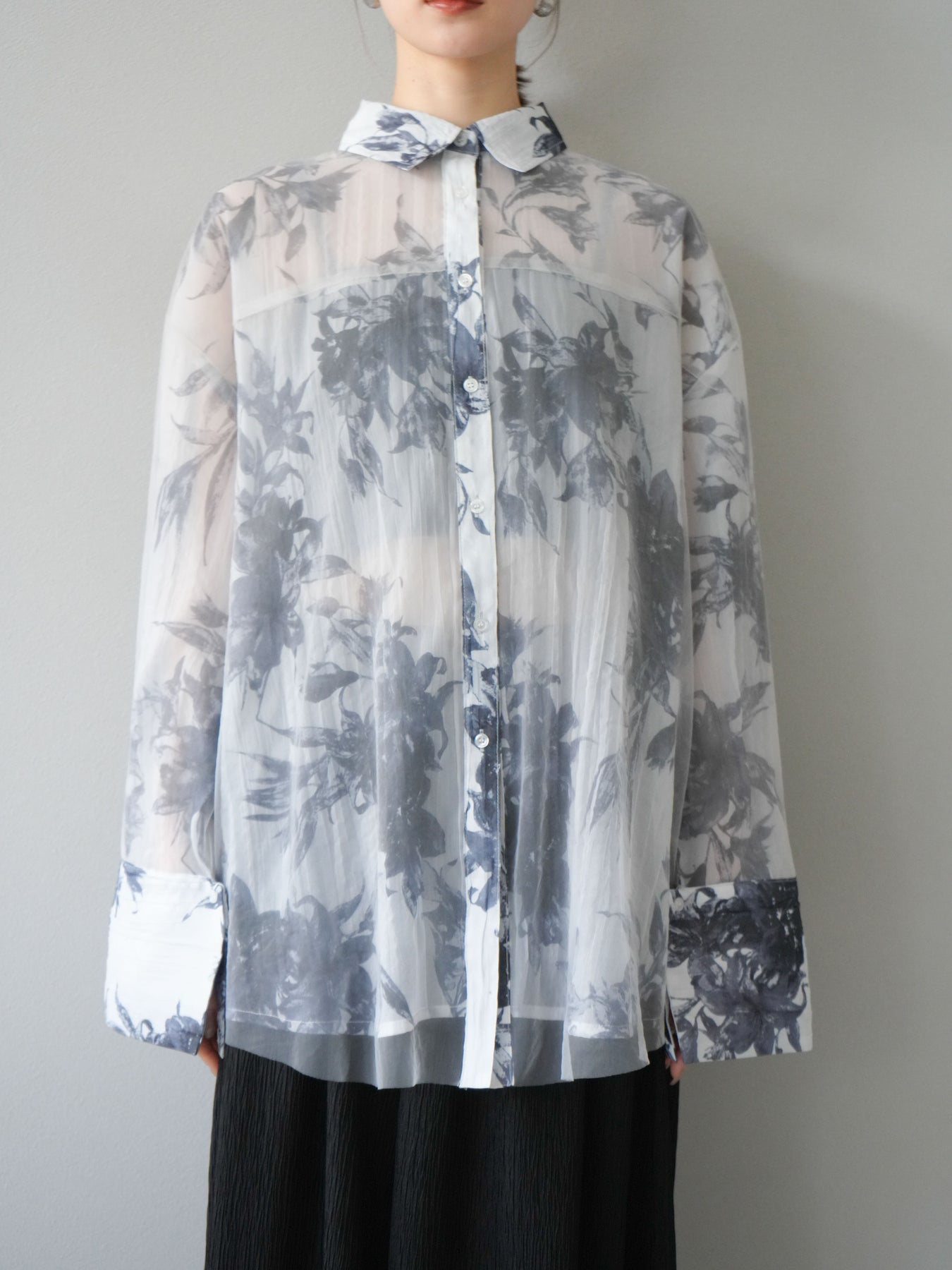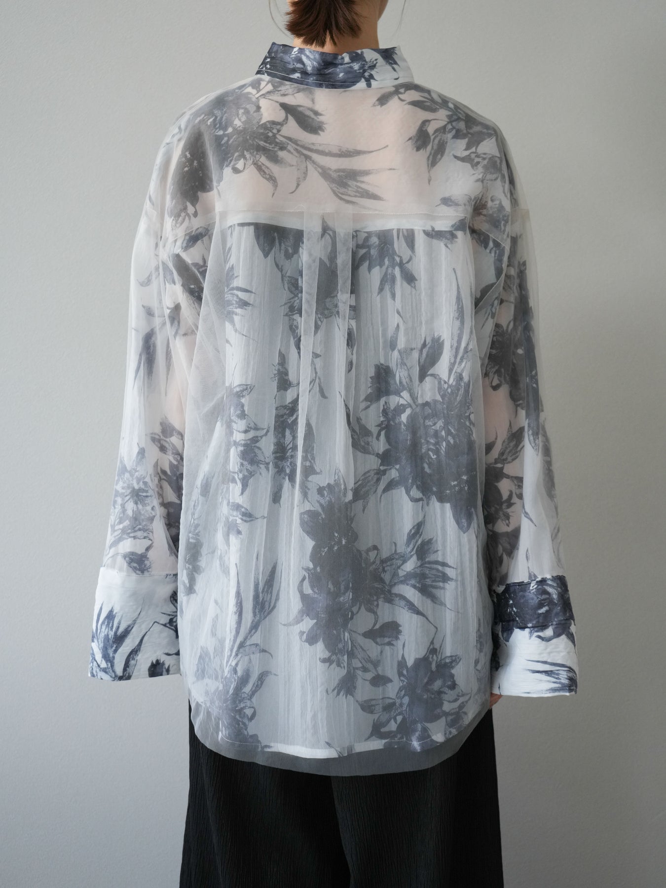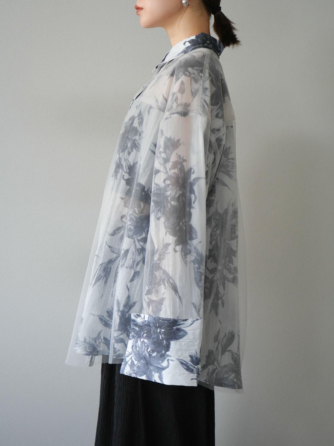 [予約]チュールドッキングフラワー柄オーバーサイズシャツ/グレー
