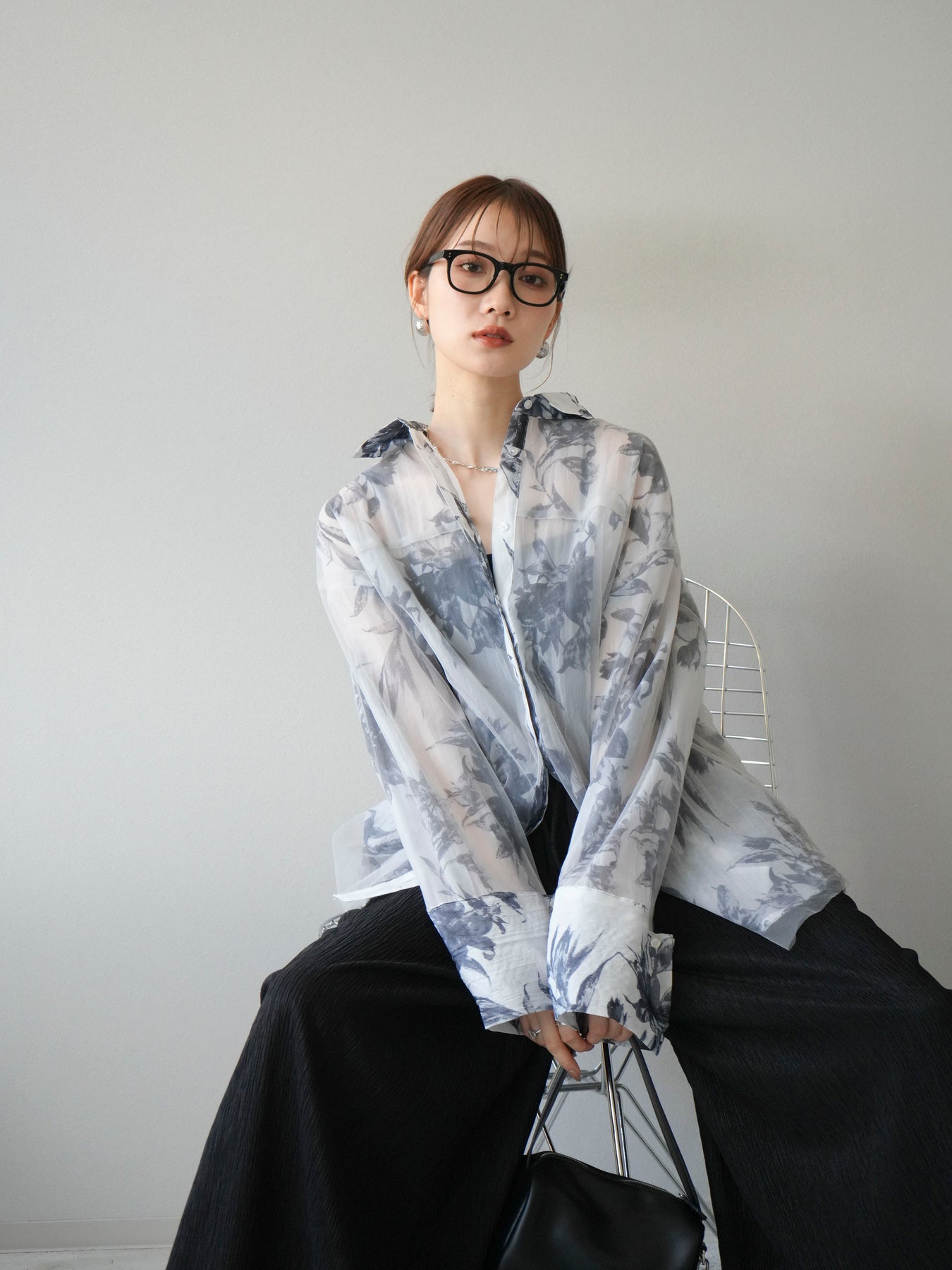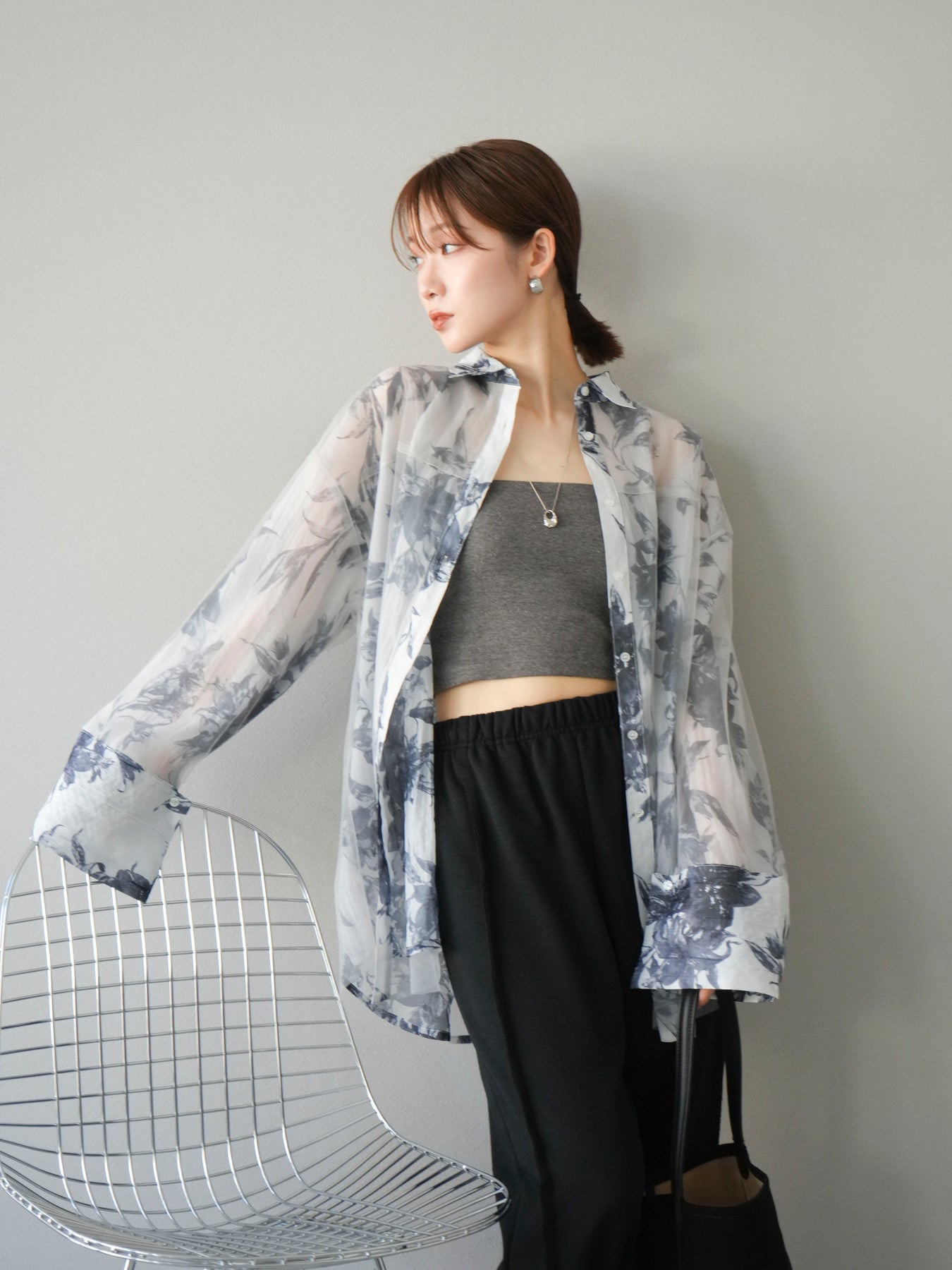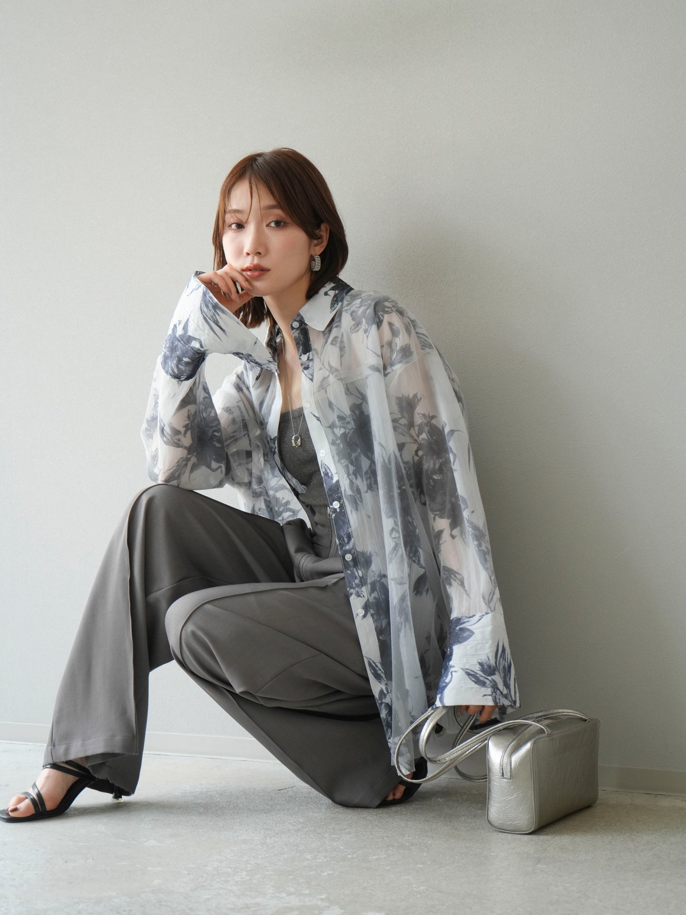 透け感のある軽やかなチュールと繊細なフラワー柄を組み合わせたオーバーサイズシャツ。柔らかな風合いと程よい光沢感が上品さを演出します。ゆったりとしたシルエットとドロップショルダーで抜け感をプラスし、羽織りとしても一枚着としても活躍。袖口のワイドカフスが手元を華奢に見せ、シンプルなボトムと合わせるだけで大人フェミニンな着こなしが完成します。 ※ボトムス、キャミソール(インナー)以外の商品は一律でインナーは付属していません