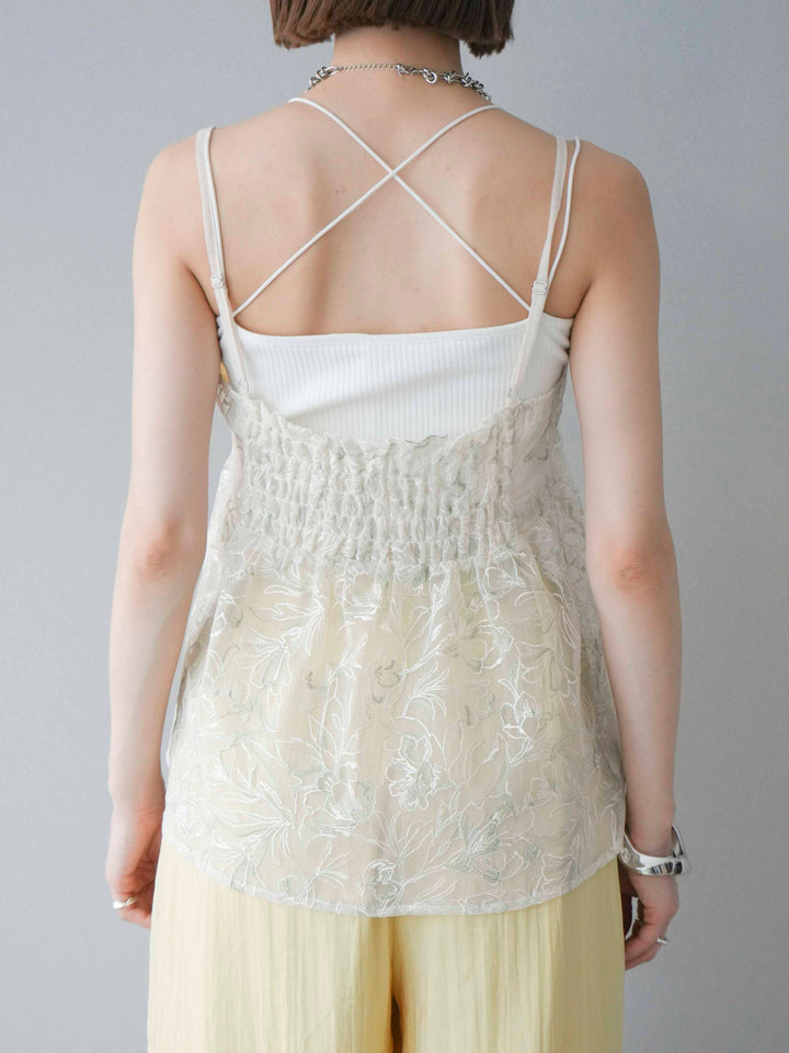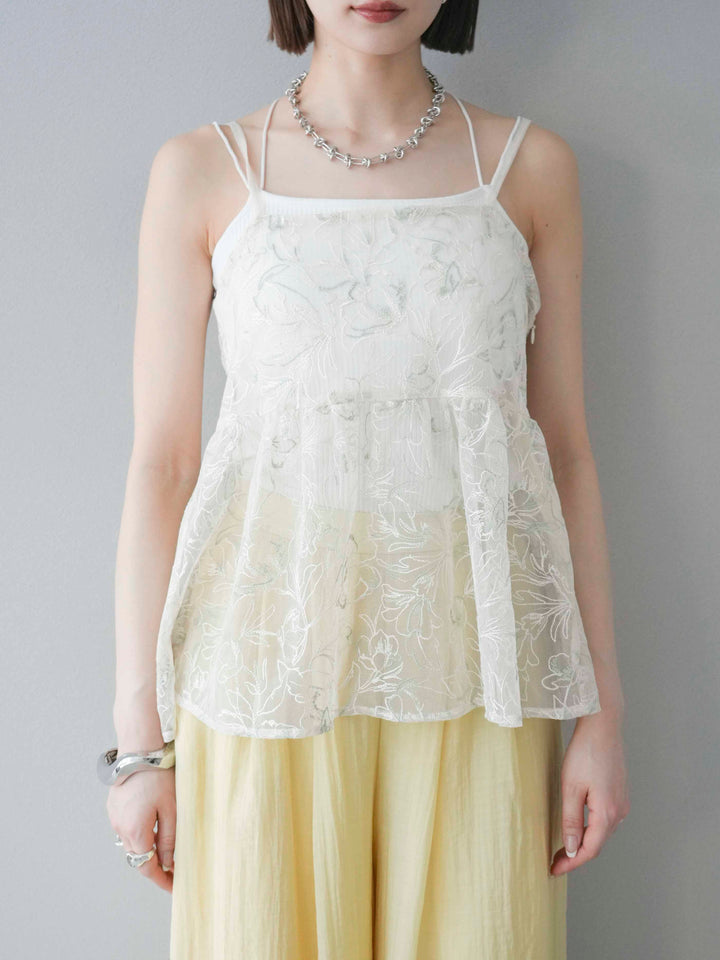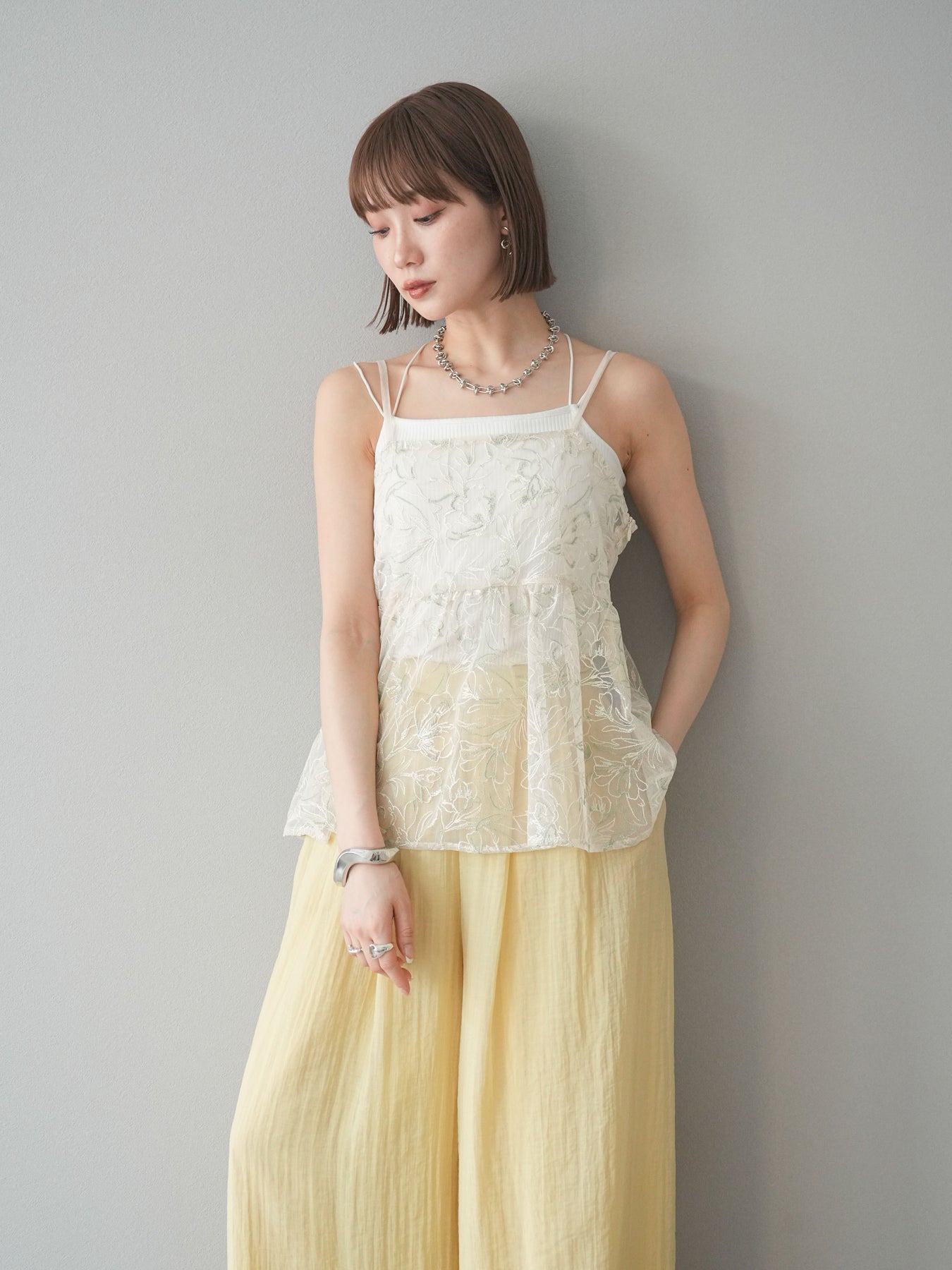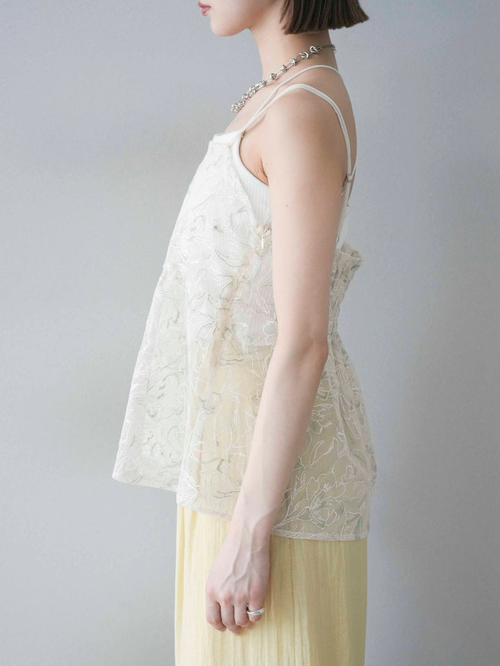 トレンドのフラワーレースを使用したキャミソール。繊細な透け感が女性らしさを引き立て、レイヤードスタイルにもぴったりな一枚です。華奢なストラップデザインが軽やかさを演出し、カジュアルなデニムやモードなボトムスと合わせても◎。インナー次第でロングシーズン活躍するアイテムです。 ※ボトムス、キャミソール(インナー)以外の商品は一律でインナーは付属していません。