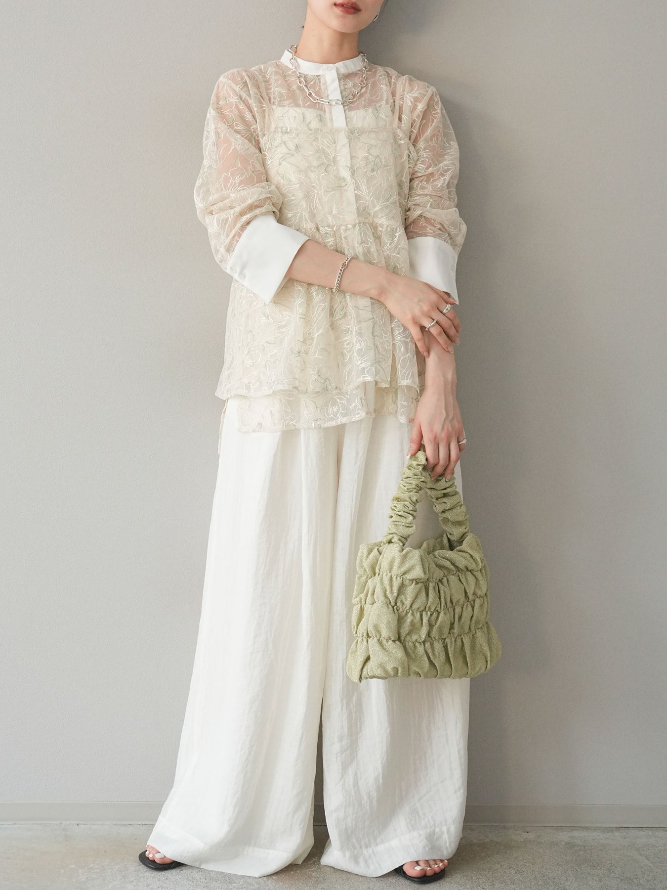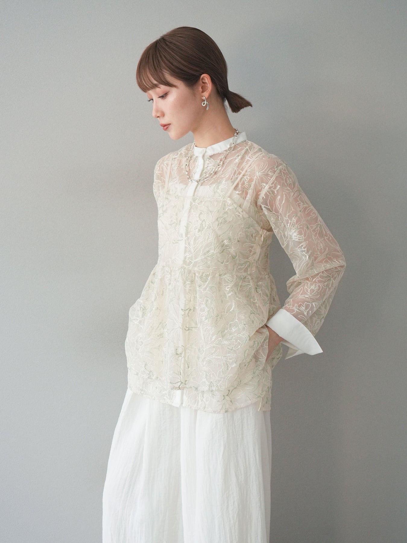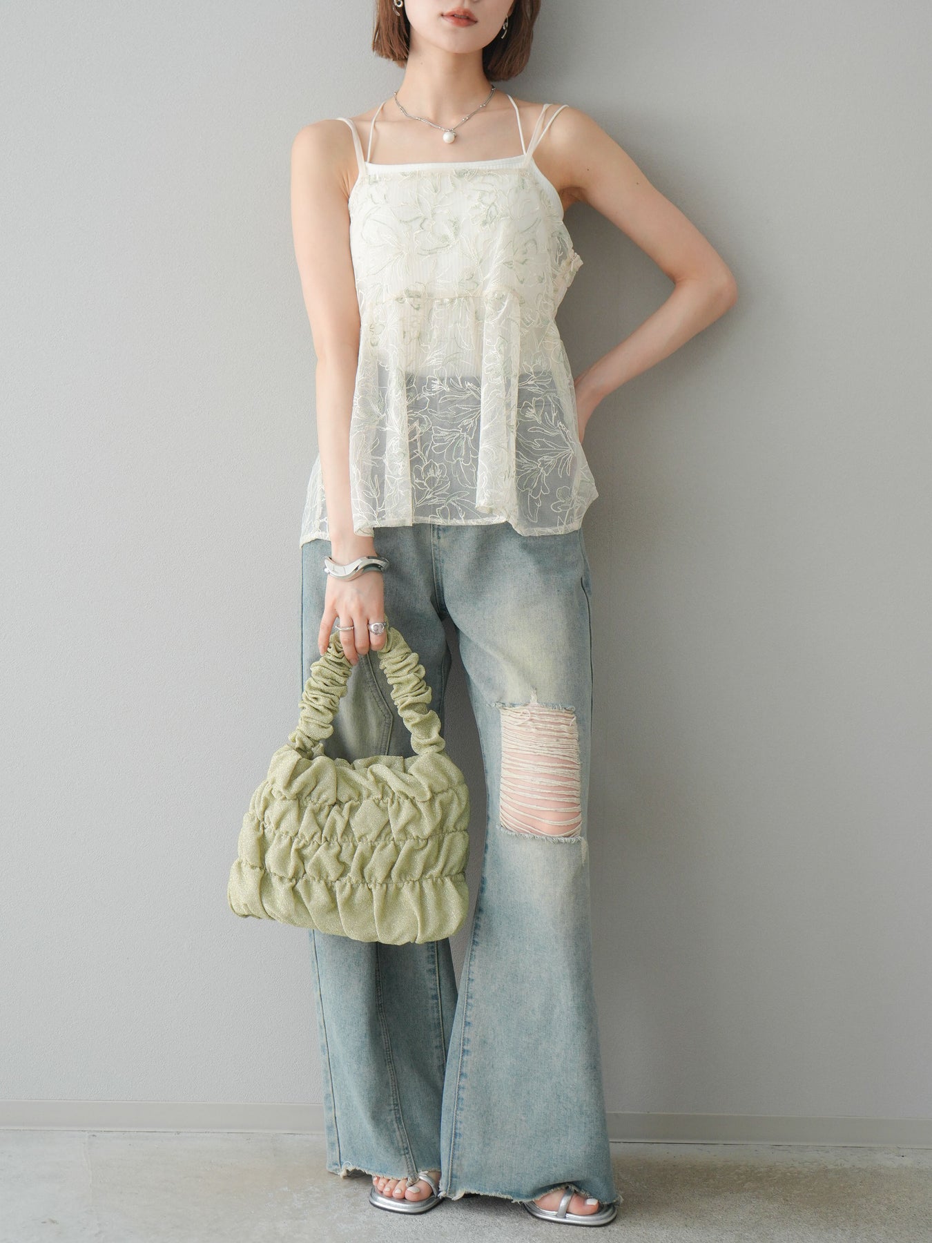 トレンドのフラワーレースを使用したキャミソール。繊細な透け感が女性らしさを引き立て、レイヤードスタイルにもぴったりな一枚です。華奢なストラップデザインが軽やかさを演出し、カジュアルなデニムやモードなボトムスと合わせても◎。インナー次第でロングシーズン活躍するアイテムです。 ※ボトムス、キャミソール(インナー)以外の商品は一律でインナーは付属していません。