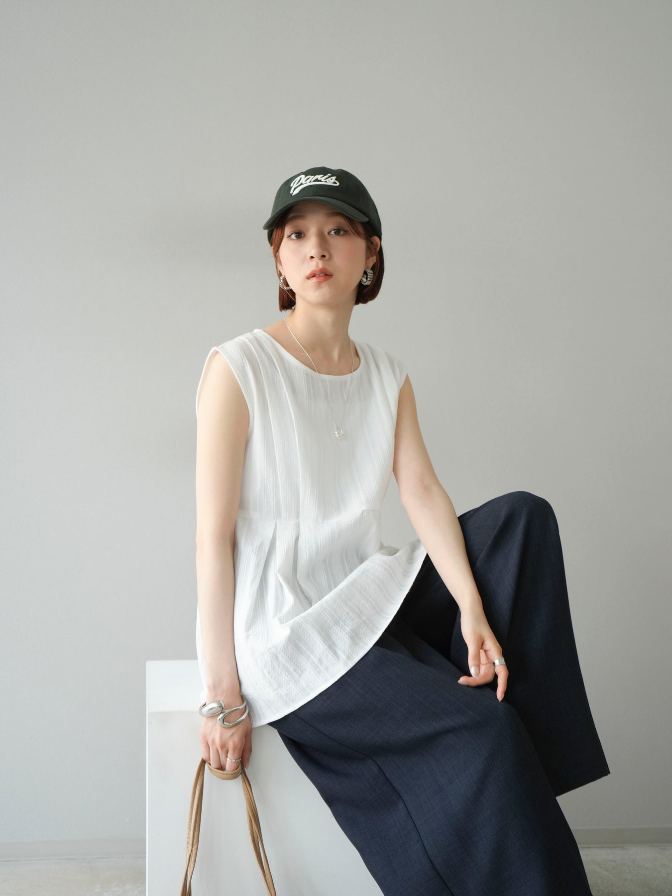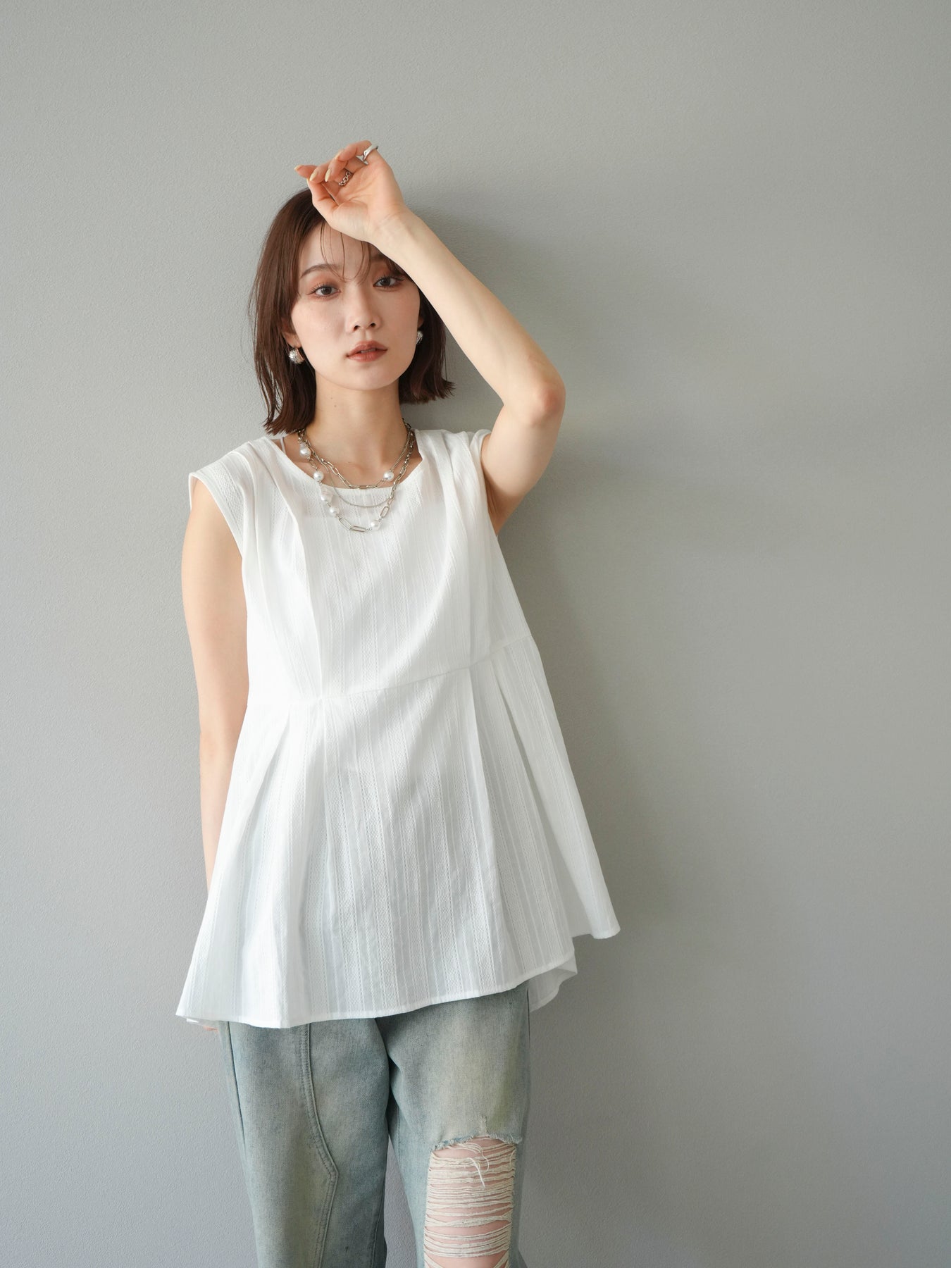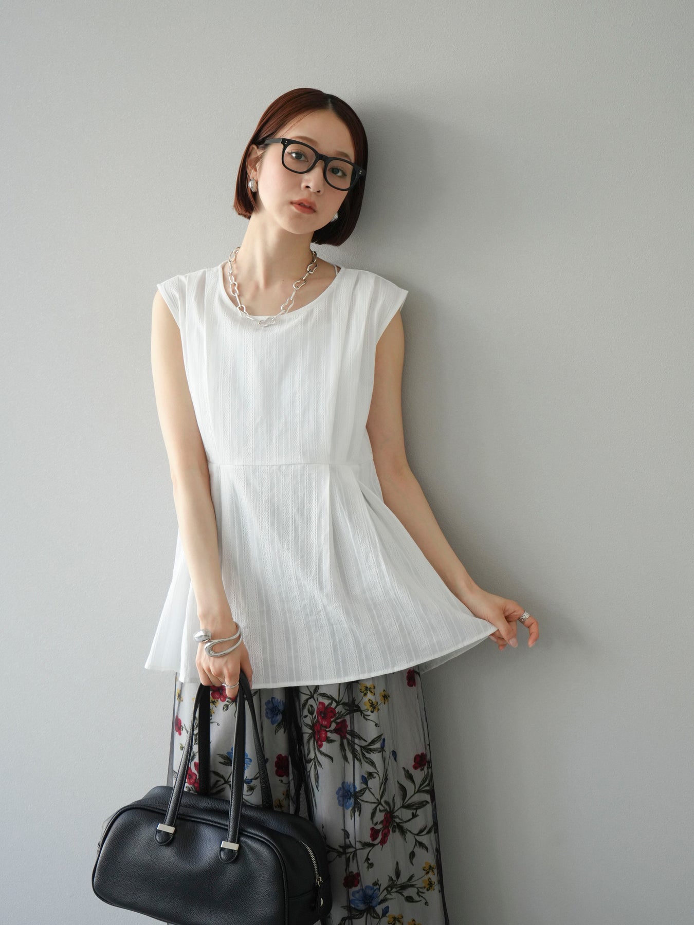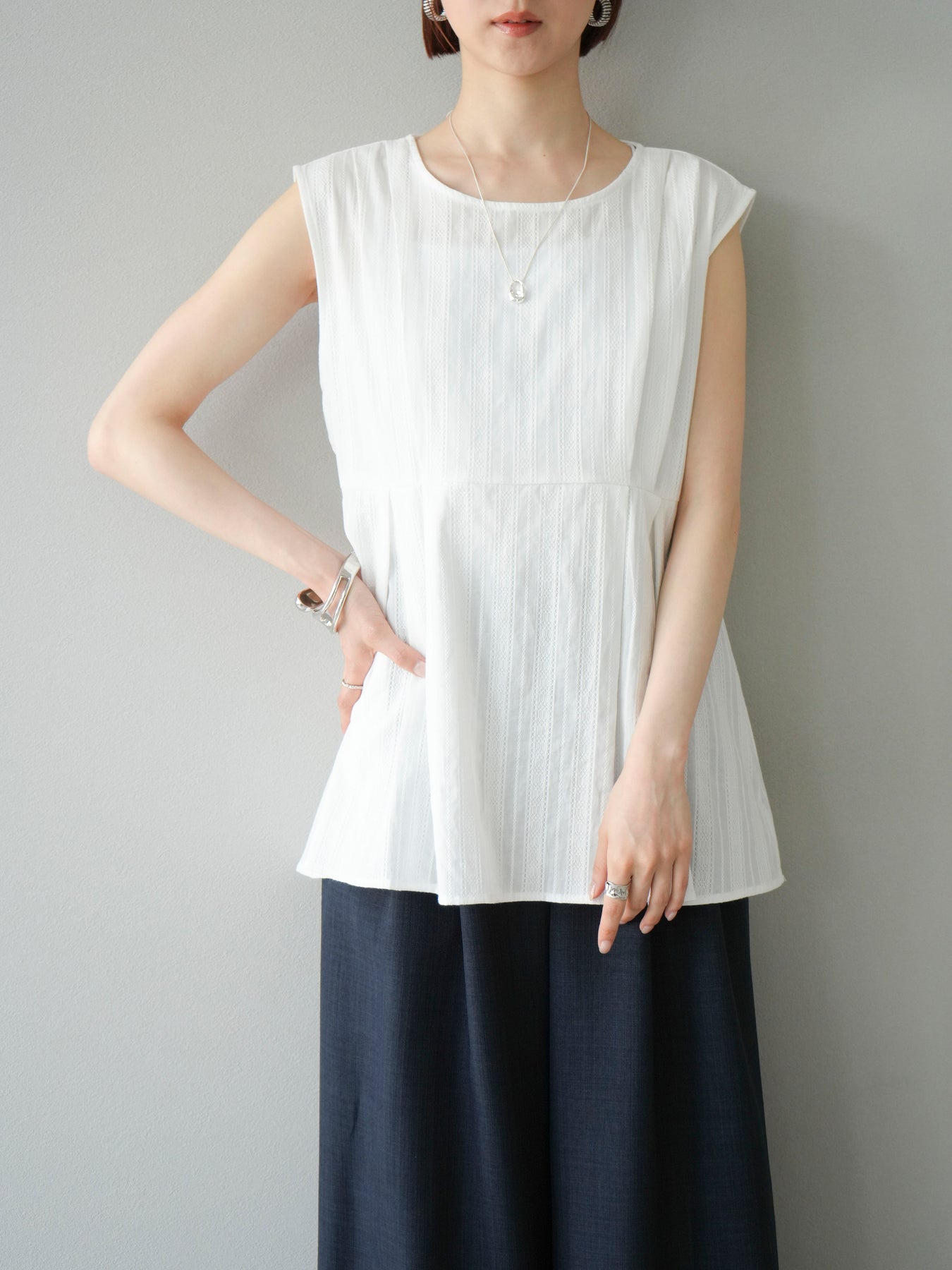 繊細なドビーストライプ生地が上品な印象を与えるタックブラウス。 フロントからサイドにかけての自然なドレープと、バックウエストに施されたギャザーが立体的なシルエットを生み出します。 二の腕を程よくカバーするスリーブデザインで、カジュアルにもきれいめにも対応可能。 デニムやスラックスとの相性も良く、幅広いコーディネートに活躍する1枚です。 ※ボトムス、キャミソール(インナー)以外の商品は一律でインナーは付属していません。