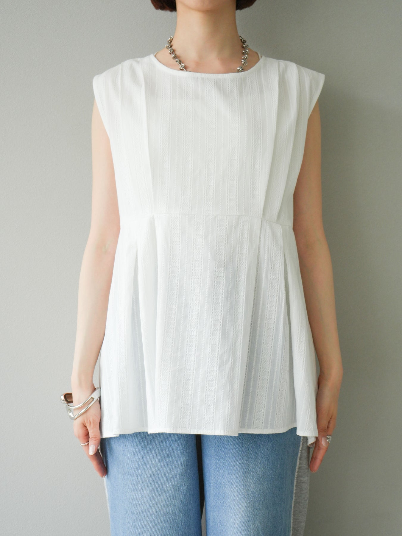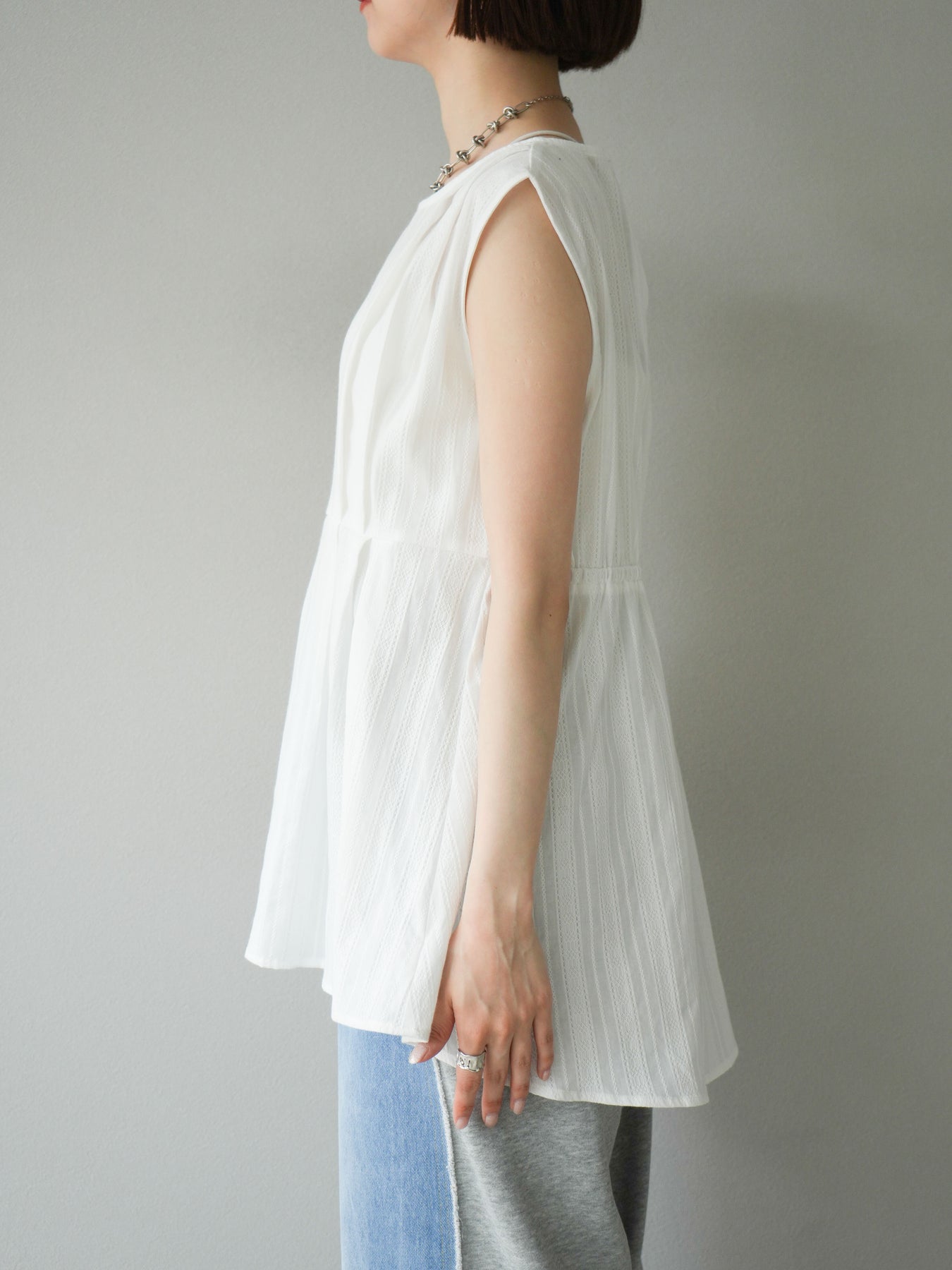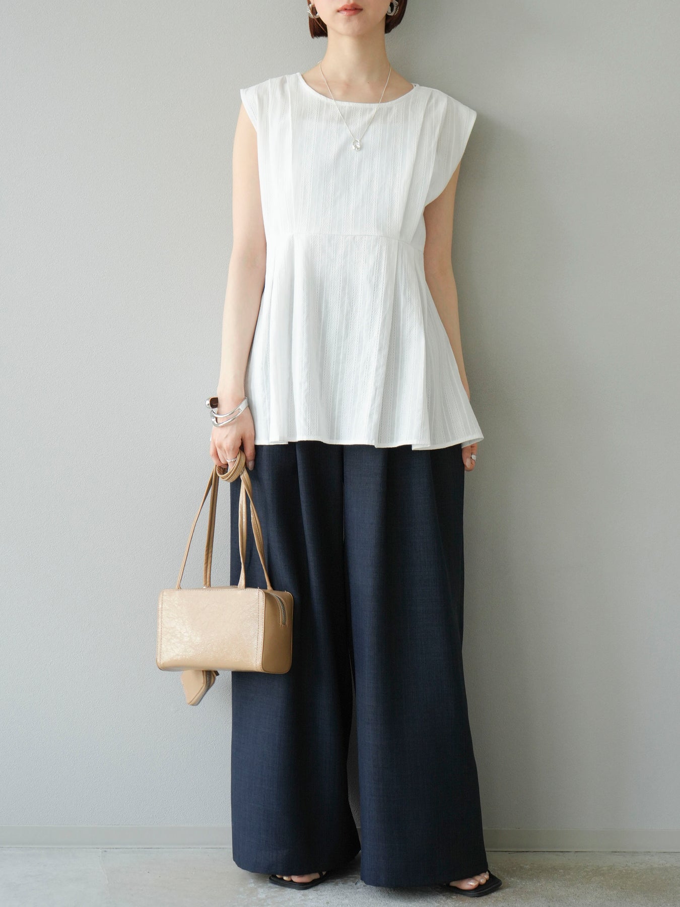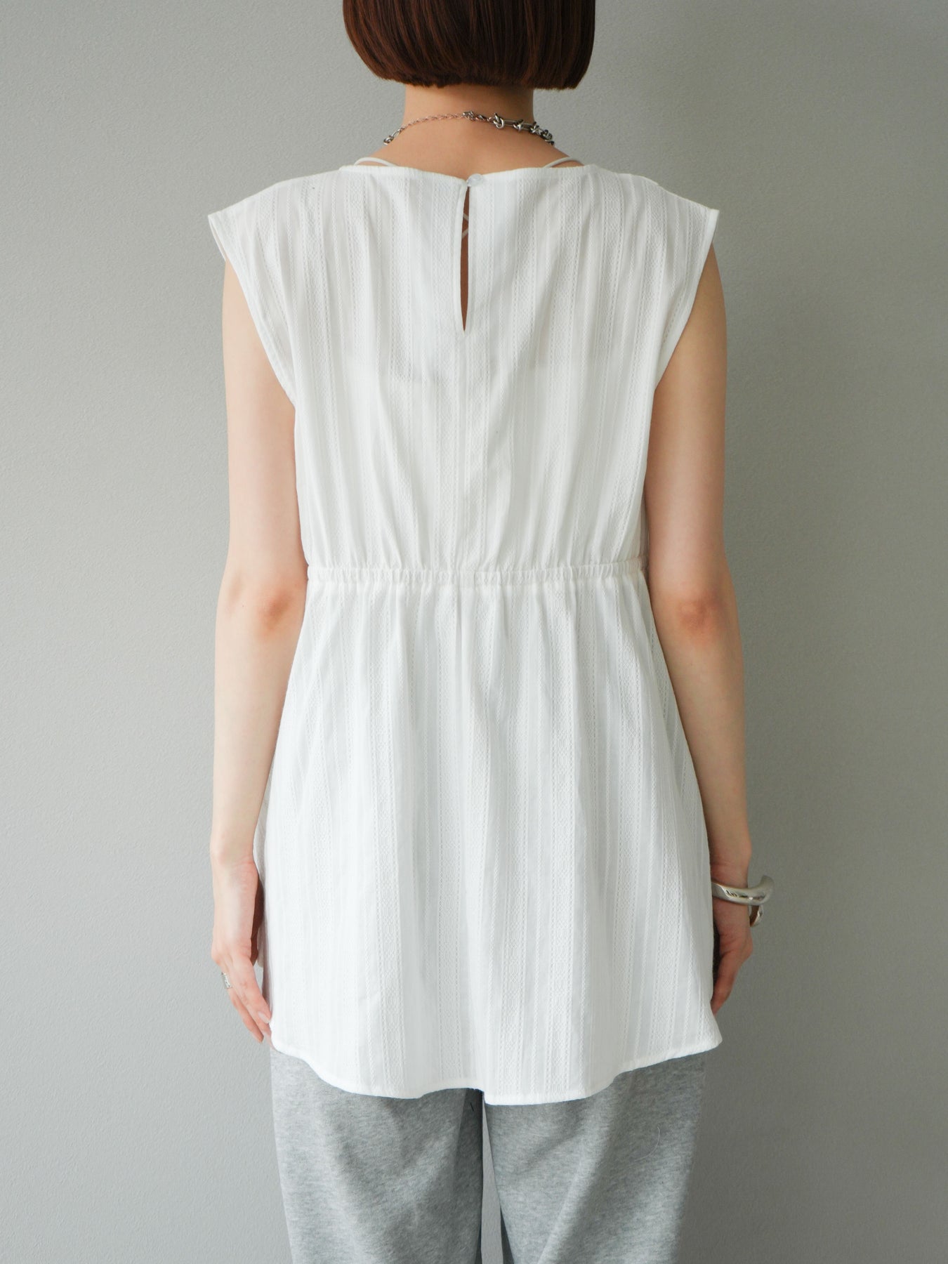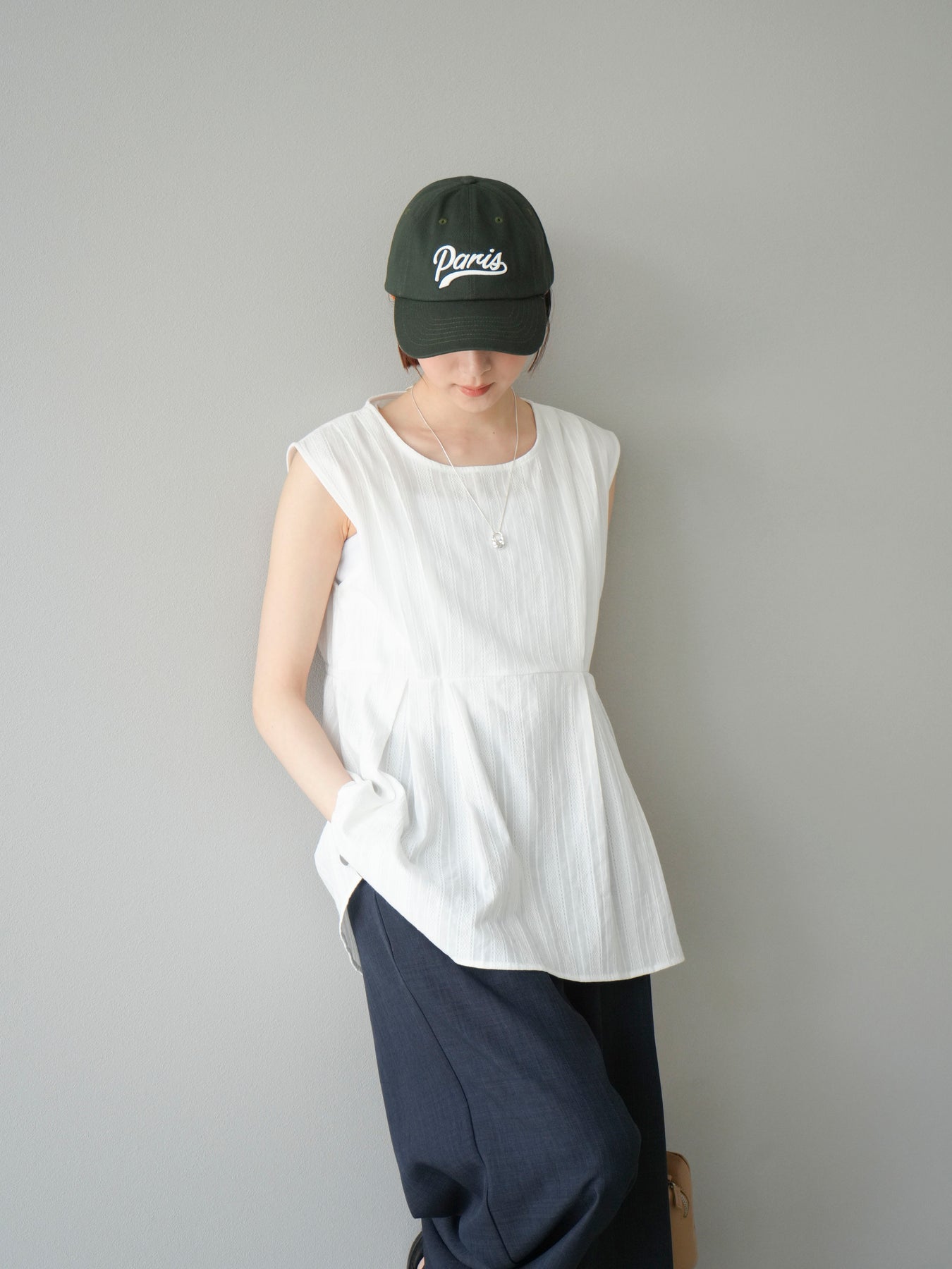 繊細なドビーストライプ生地が上品な印象を与えるタックブラウス。 フロントからサイドにかけての自然なドレープと、バックウエストに施されたギャザーが立体的なシルエットを生み出します。 二の腕を程よくカバーするスリーブデザインで、カジュアルにもきれいめにも対応可能。 デニムやスラックスとの相性も良く、幅広いコーディネートに活躍する1枚です。 ※ボトムス、キャミソール(インナー)以外の商品は一律でインナーは付属していません。