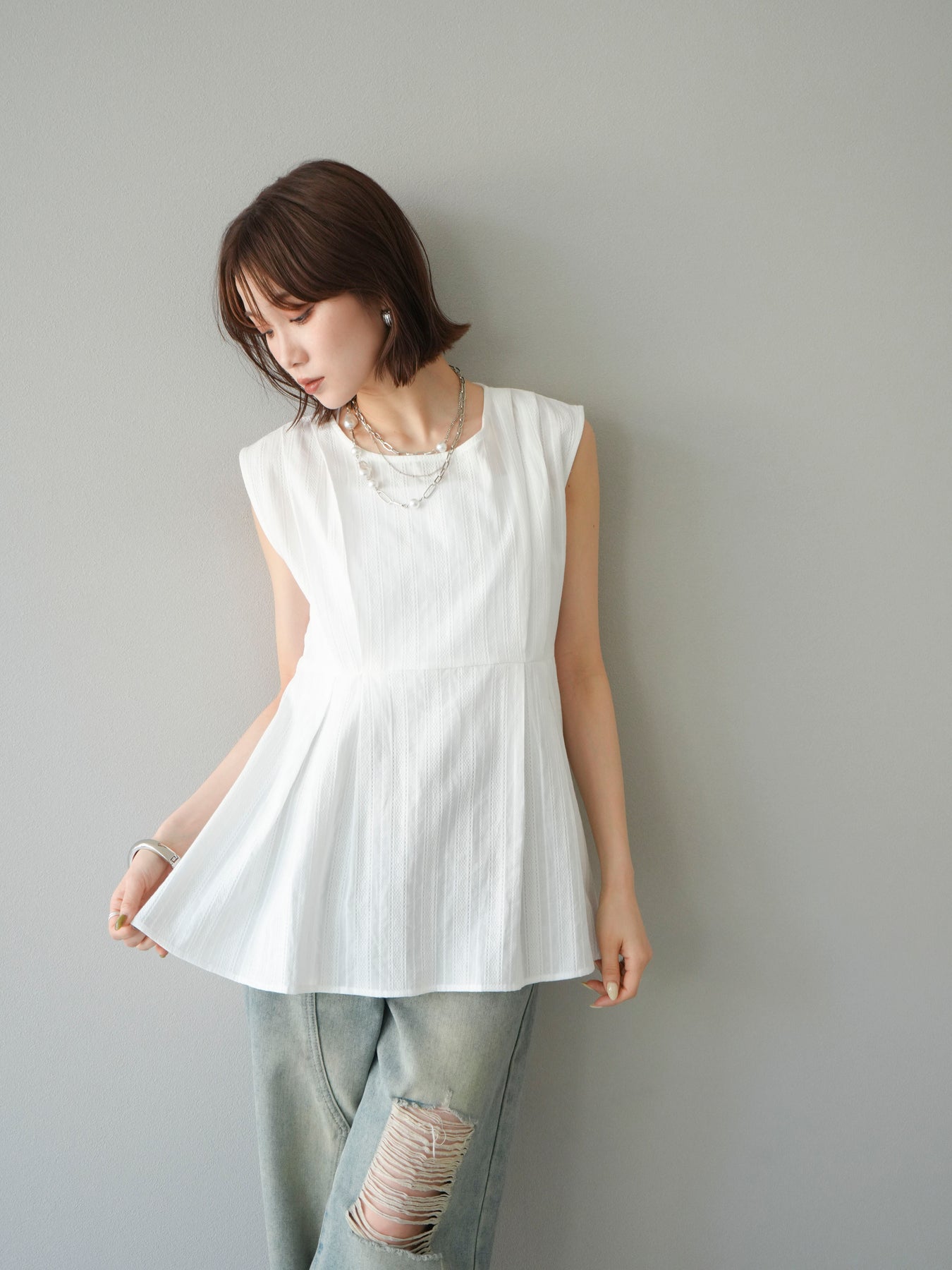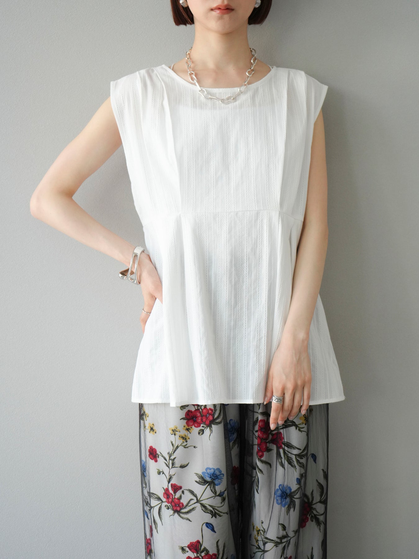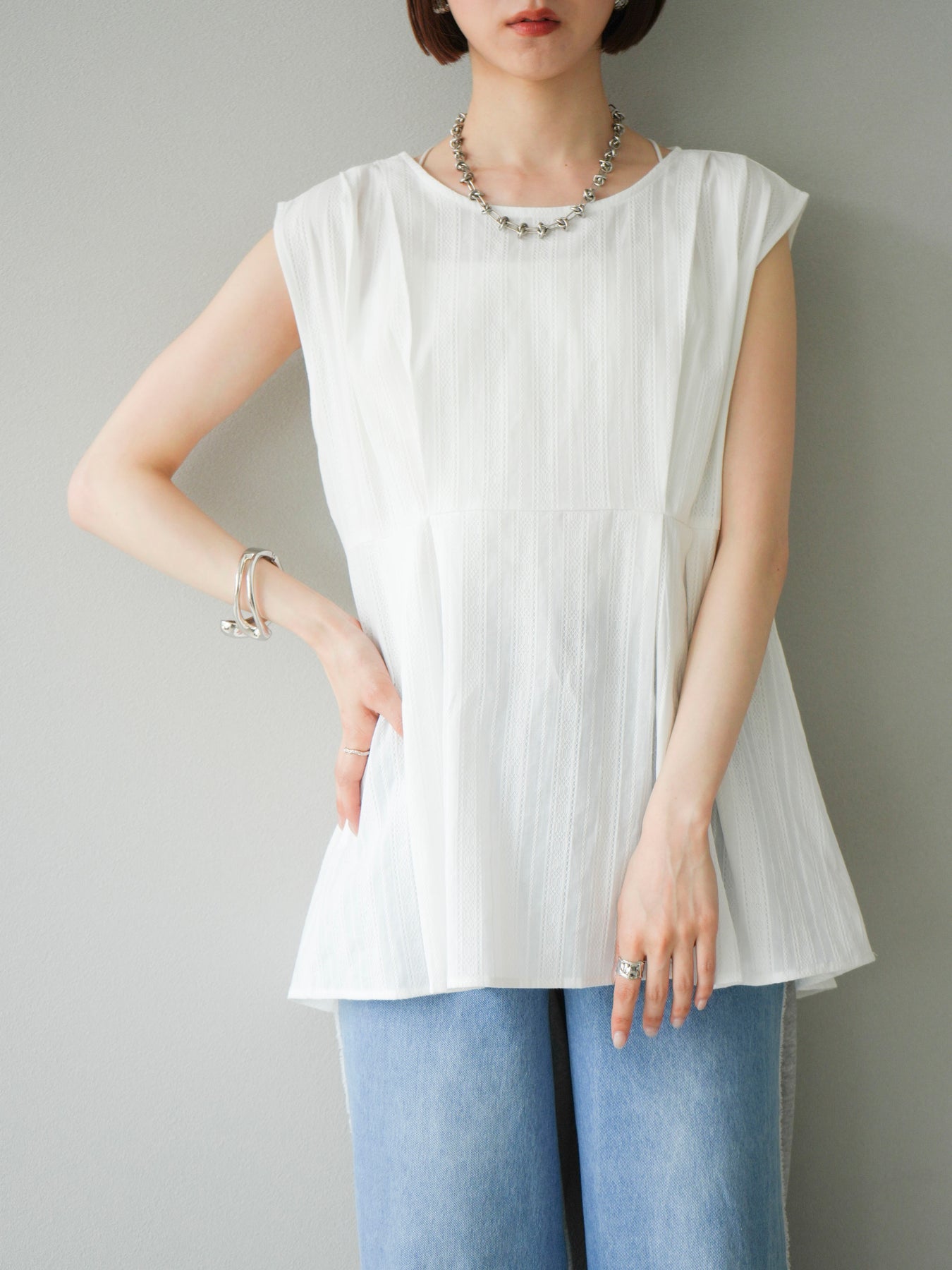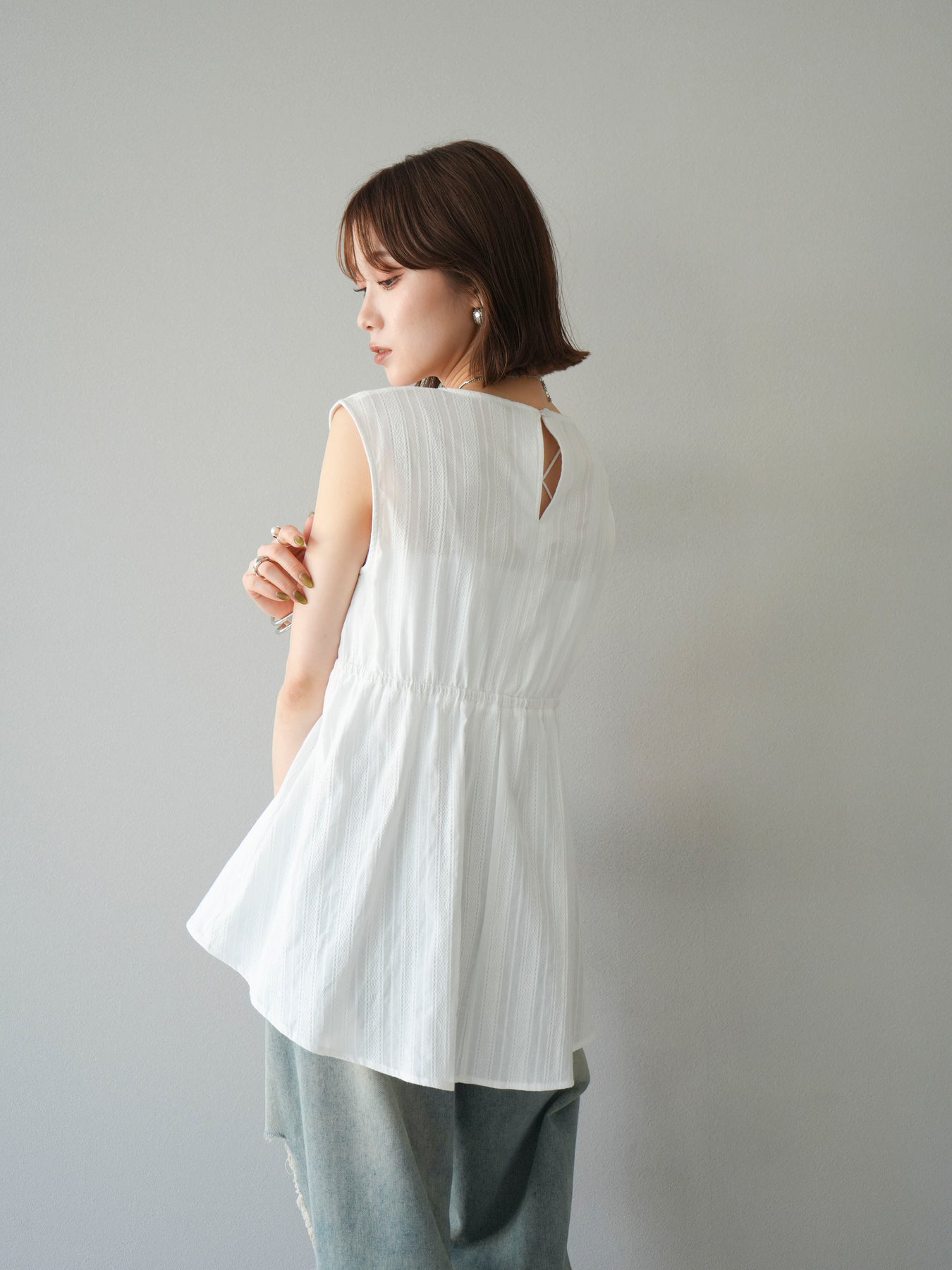 繊細なドビーストライプ生地が上品な印象を与えるタックブラウス。 フロントからサイドにかけての自然なドレープと、バックウエストに施されたギャザーが立体的なシルエットを生み出します。 二の腕を程よくカバーするスリーブデザインで、カジュアルにもきれいめにも対応可能。 デニムやスラックスとの相性も良く、幅広いコーディネートに活躍する1枚です。 ※ボトムス、キャミソール(インナー)以外の商品は一律でインナーは付属していません。