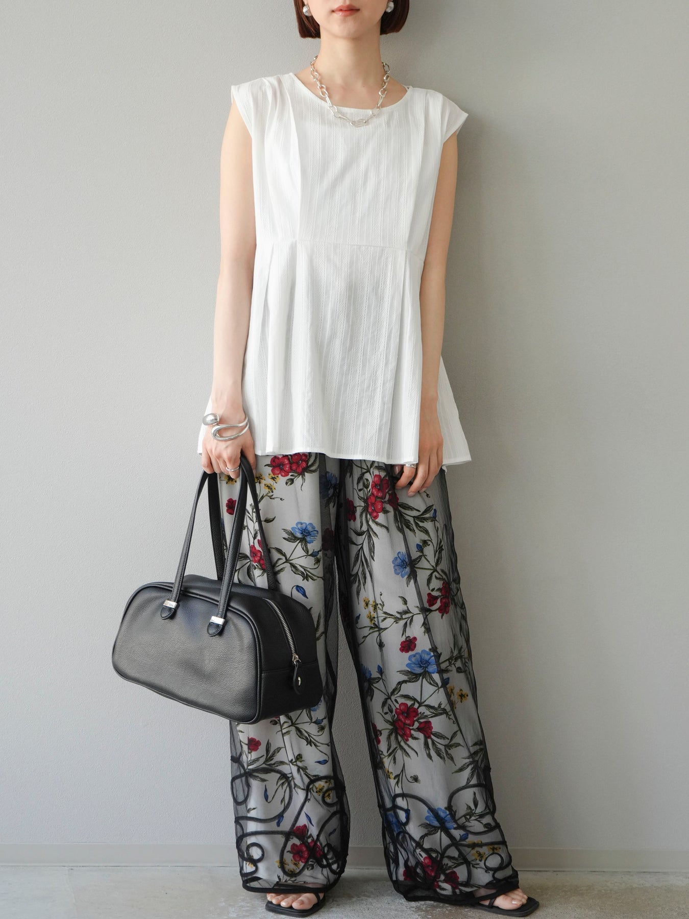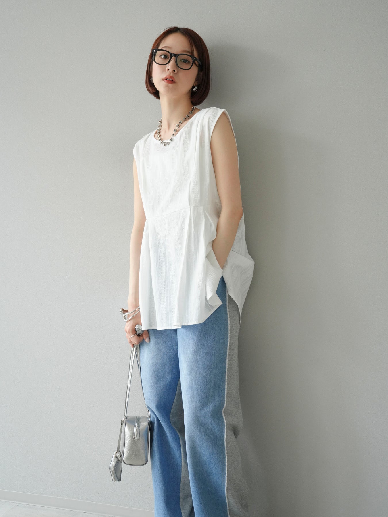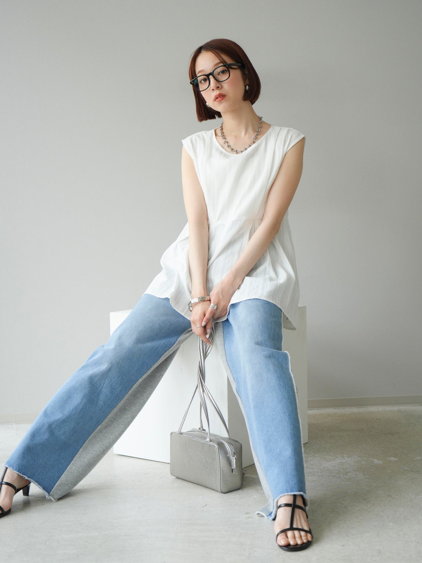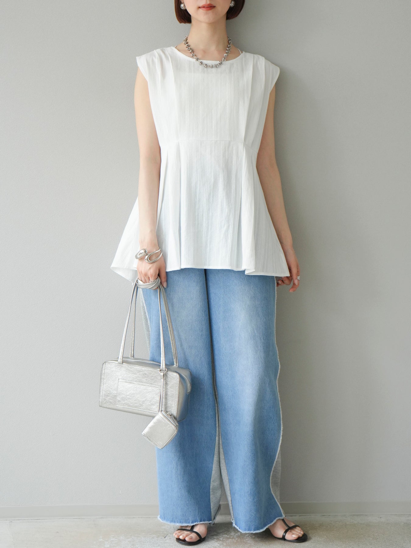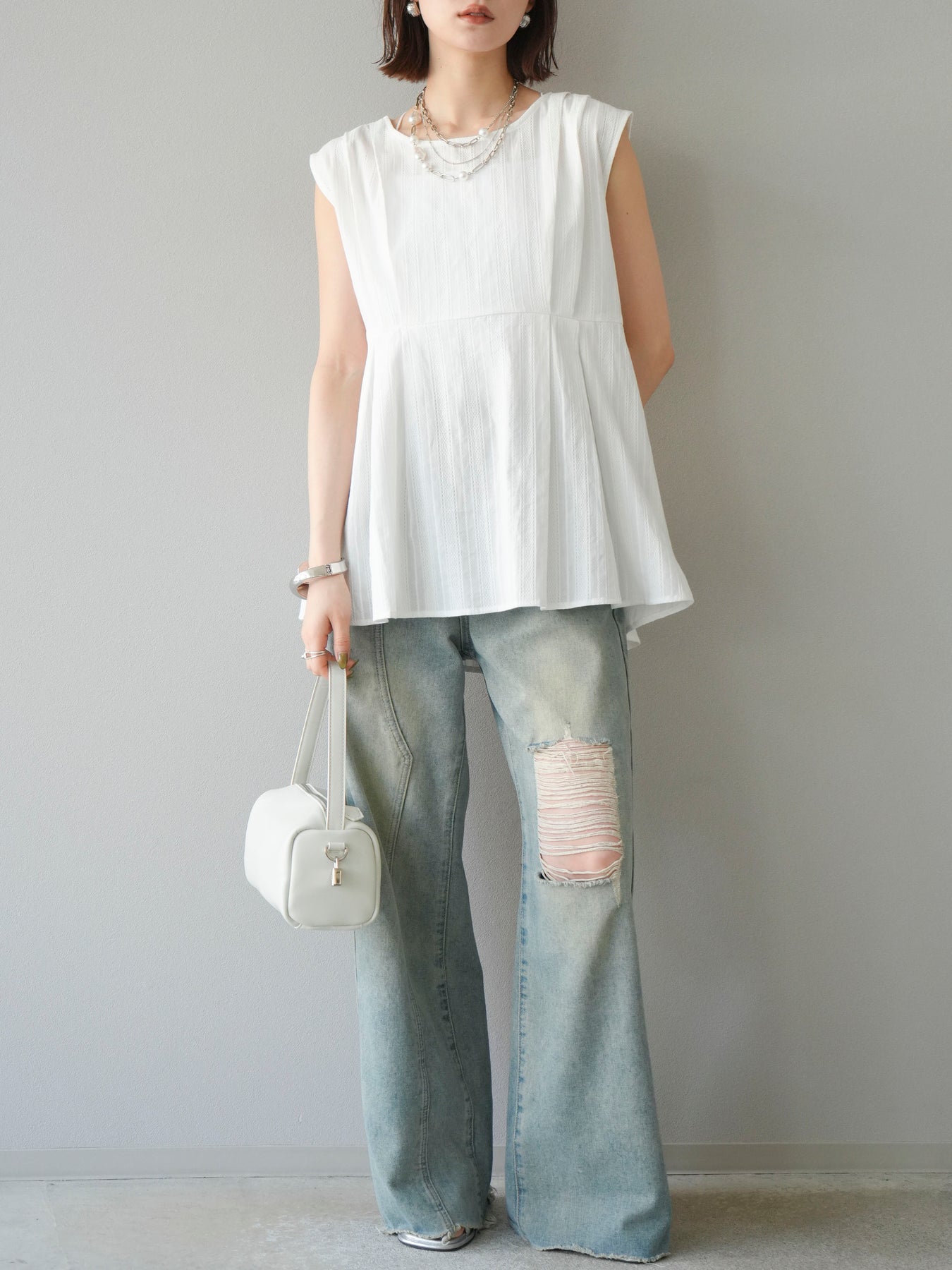 繊細なドビーストライプ生地が上品な印象を与えるタックブラウス。 フロントからサイドにかけての自然なドレープと、バックウエストに施されたギャザーが立体的なシルエットを生み出します。 二の腕を程よくカバーするスリーブデザインで、カジュアルにもきれいめにも対応可能。 デニムやスラックスとの相性も良く、幅広いコーディネートに活躍する1枚です。 ※ボトムス、キャミソール(インナー)以外の商品は一律でインナーは付属していません。