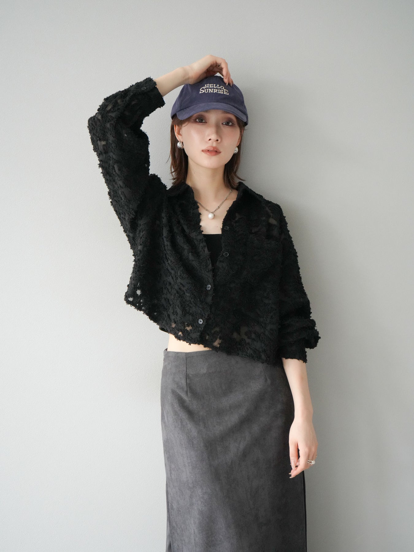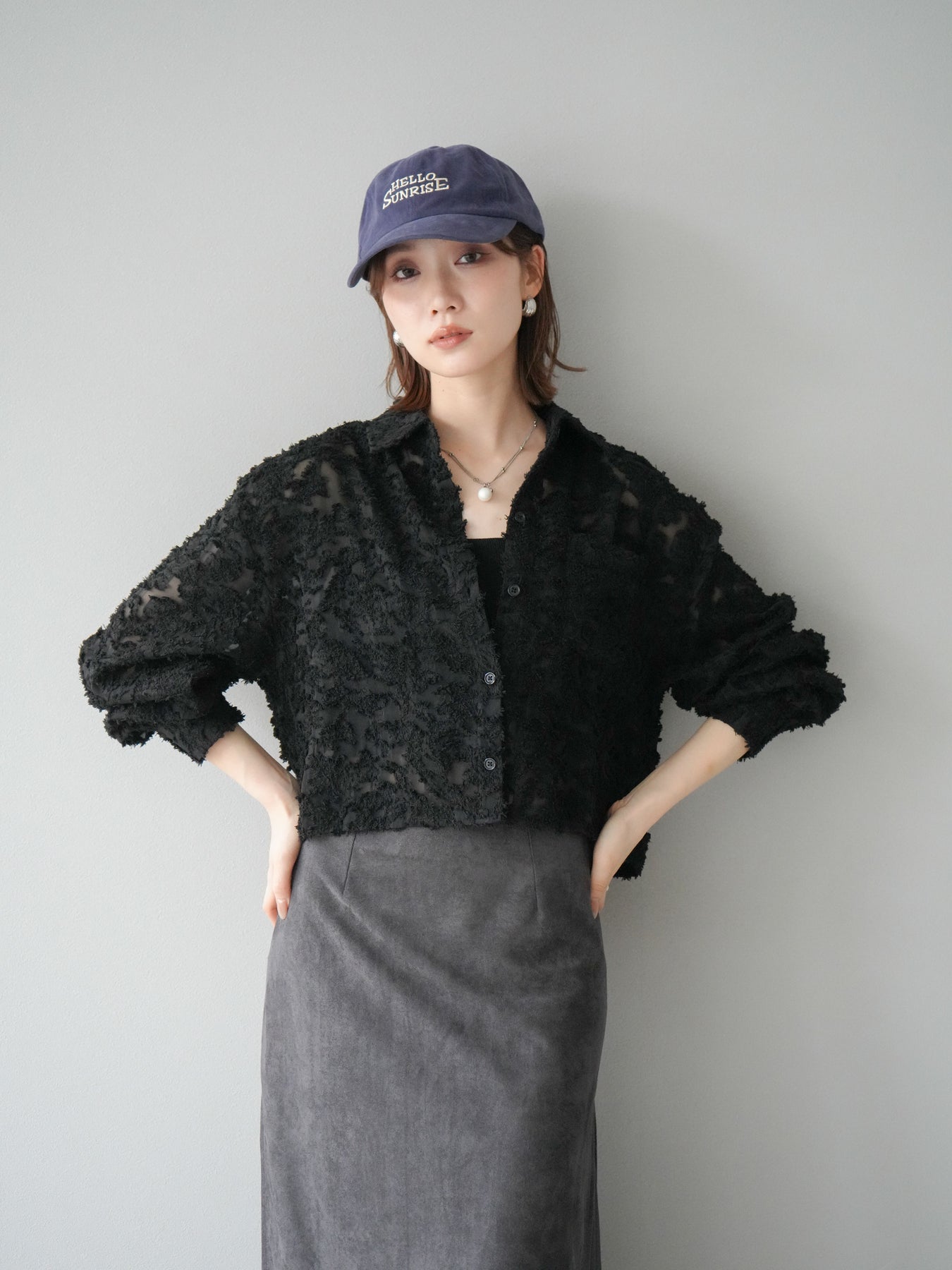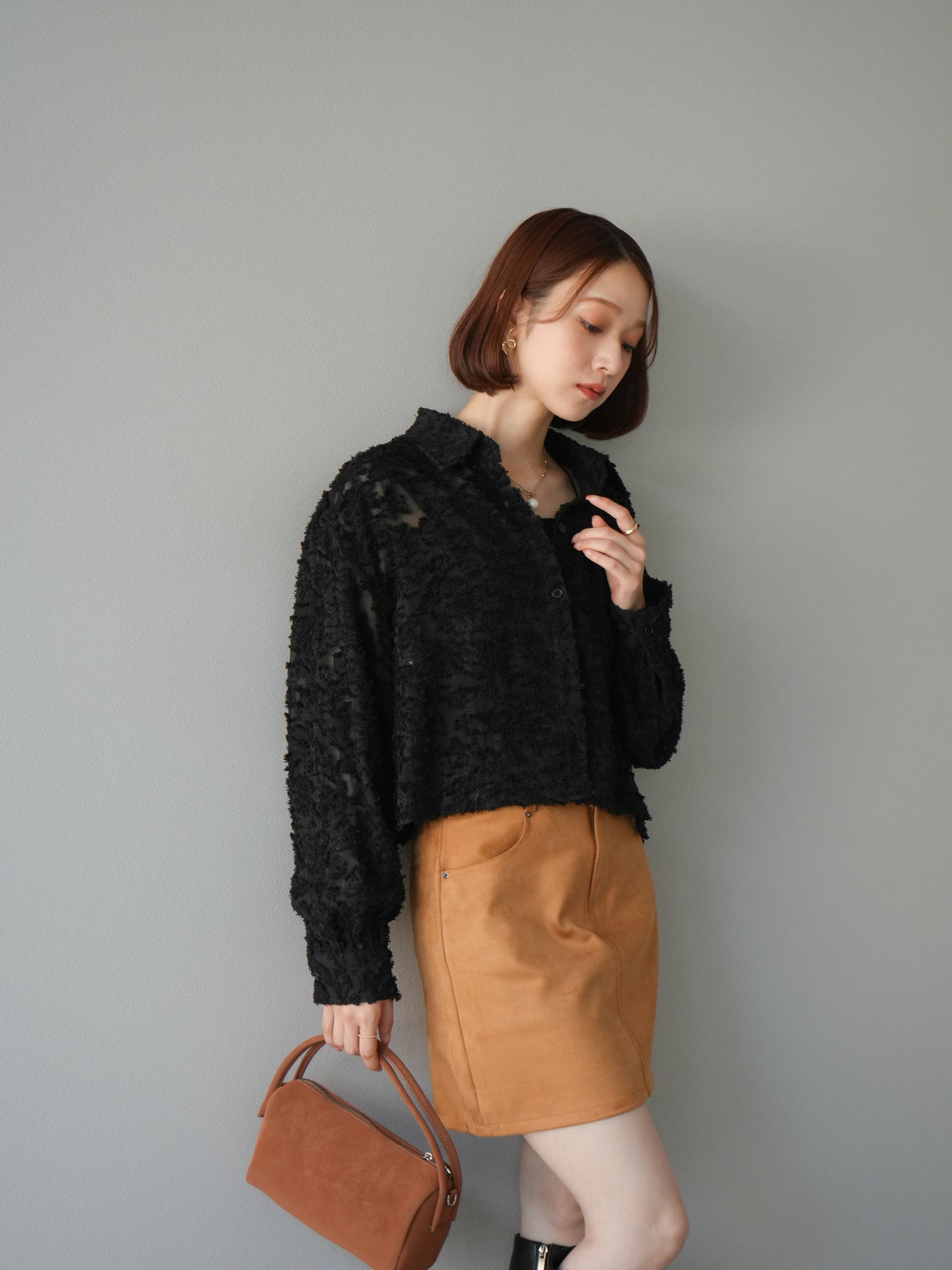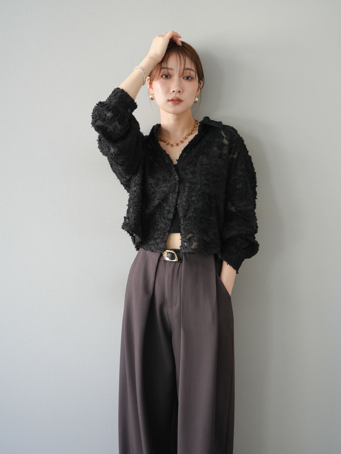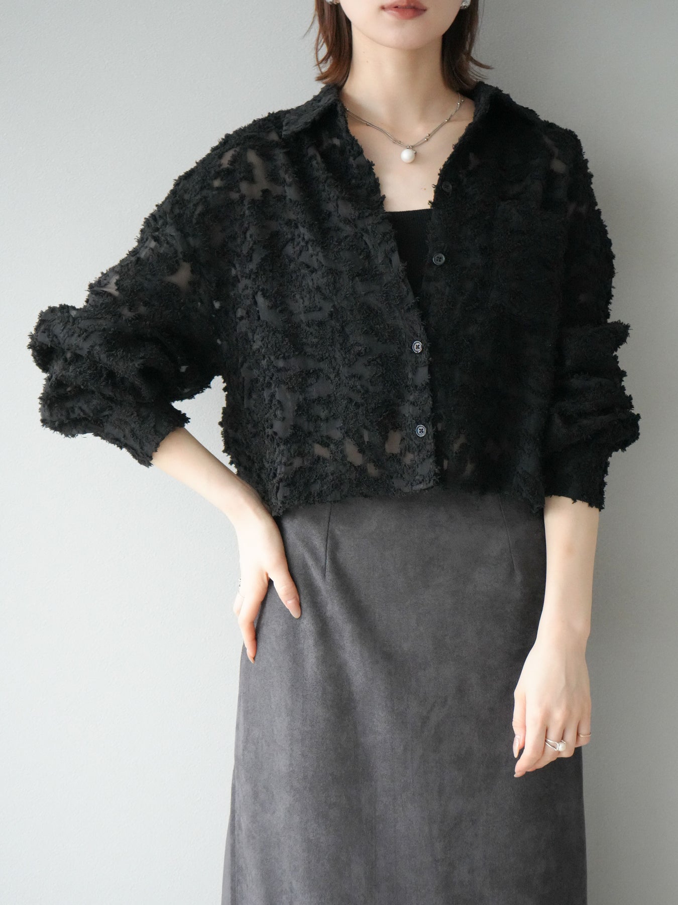 立体感のあるジャガード生地を使用したショートシャツ。織りで表現された繊細な模様が存在感を放ち、シンプルなコーディネートに加えるだけで華やかさを演出します。ショート丈のデザインがスタイルアップを叶え、ハイウエストのボトムスとも相性抜群。程よくゆとりのあるシルエットで、羽織りとしてもトップスとしても着回せます。パンツスタイルに合わせてモードに、スカートと合わせてフェミニンにと幅広い着こなしに対応可能。シーズンレスで取り入れやすく、コーディネートを格上げしてくれる一枚です。 ※ボトムス、キャミソール(インナー)以外の商品は一律でインナーは付属していません。