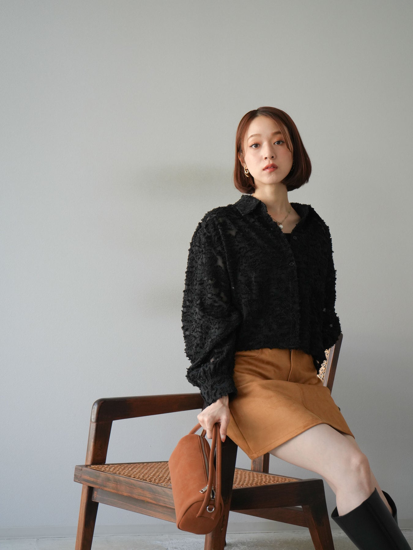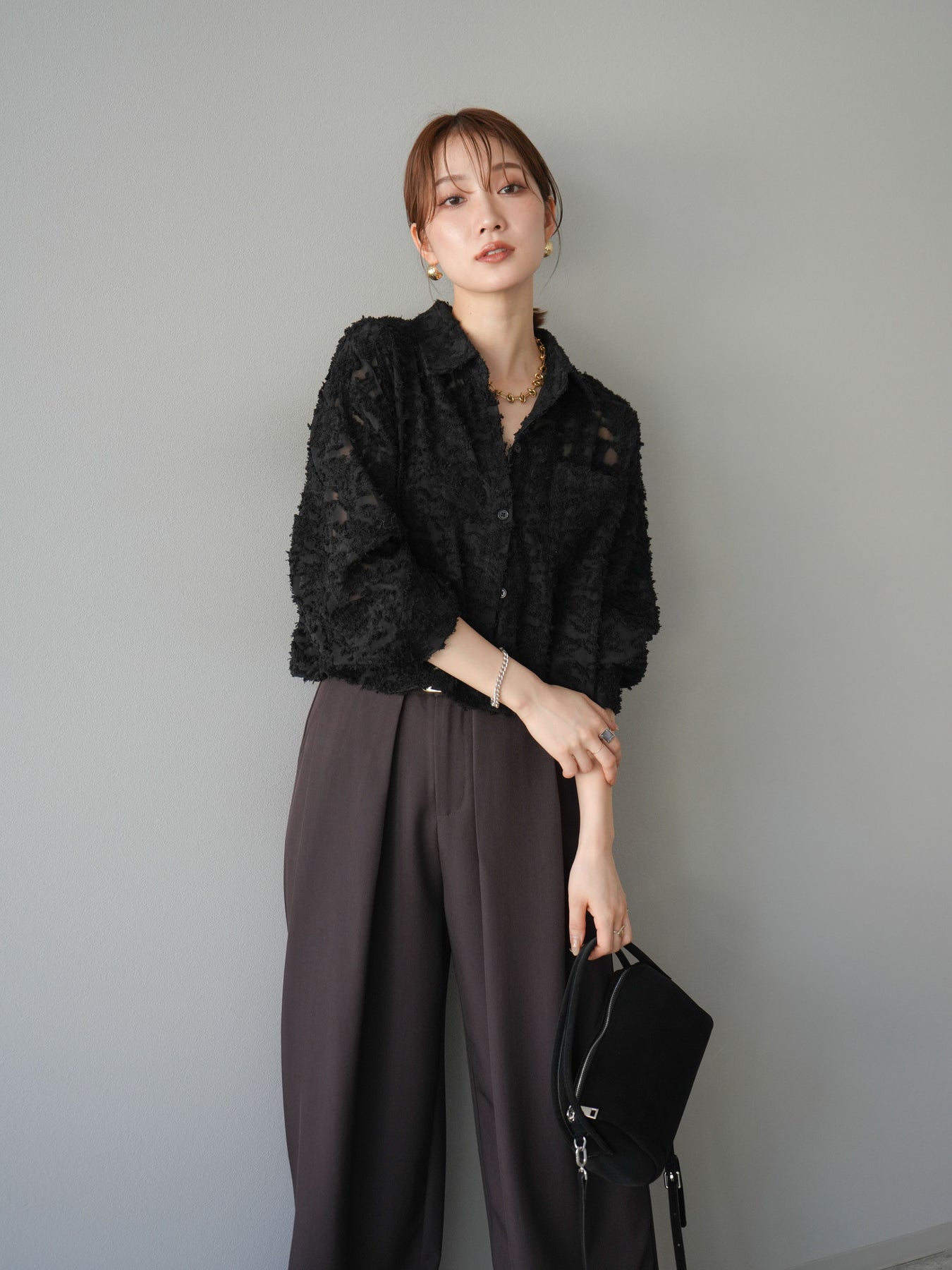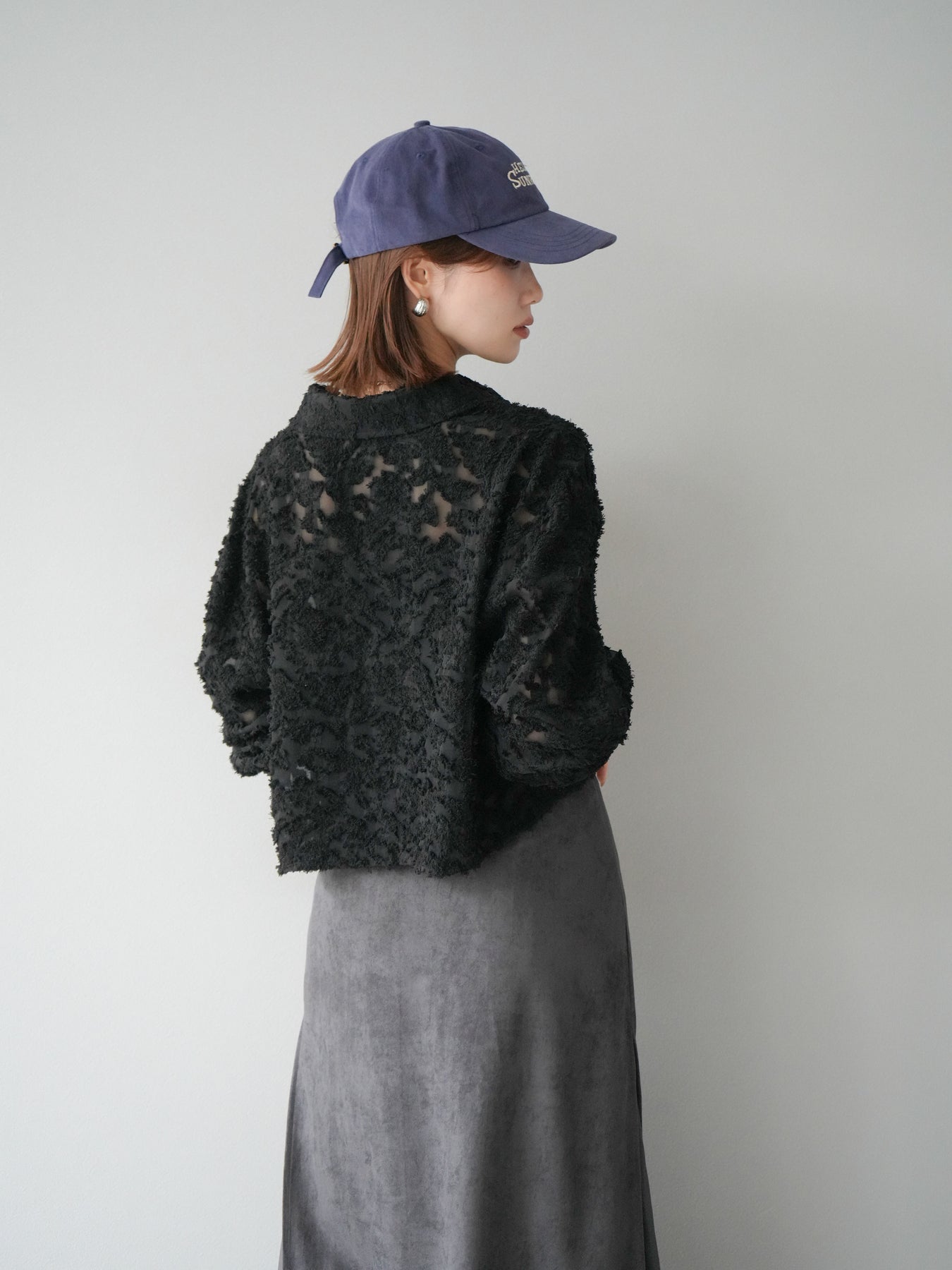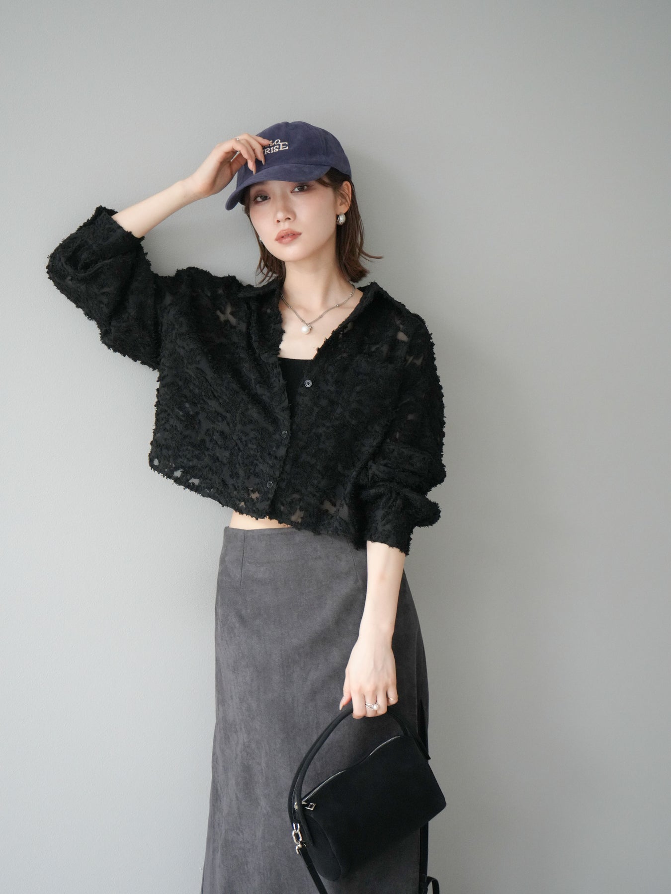 立体感のあるジャガード生地を使用したショートシャツ。織りで表現された繊細な模様が存在感を放ち、シンプルなコーディネートに加えるだけで華やかさを演出します。ショート丈のデザインがスタイルアップを叶え、ハイウエストのボトムスとも相性抜群。程よくゆとりのあるシルエットで、羽織りとしてもトップスとしても着回せます。パンツスタイルに合わせてモードに、スカートと合わせてフェミニンにと幅広い着こなしに対応可能。シーズンレスで取り入れやすく、コーディネートを格上げしてくれる一枚です。 ※ボトムス、キャミソール(インナー)以外の商品は一律でインナーは付属していません。
