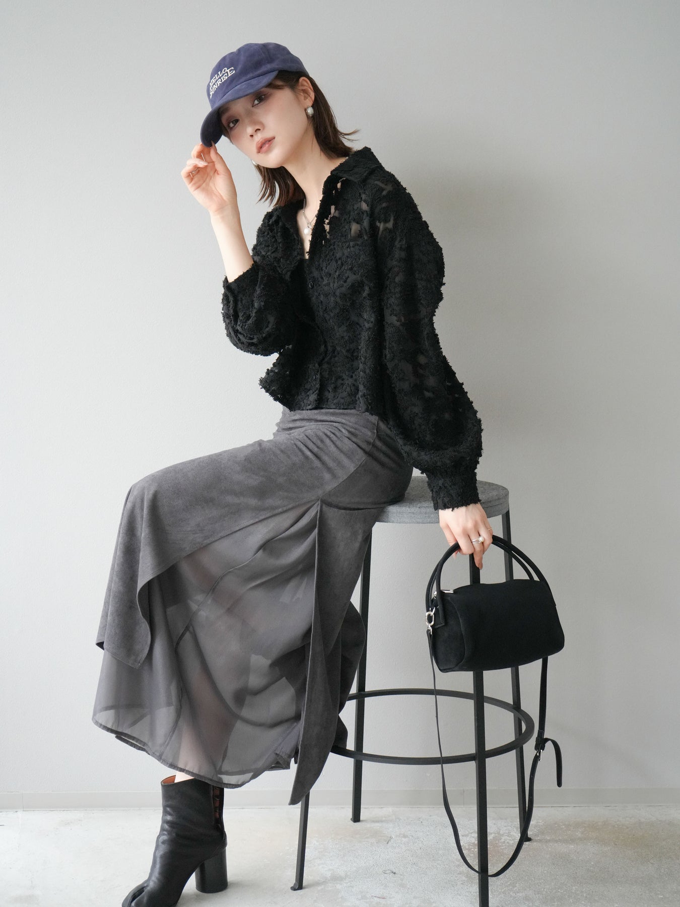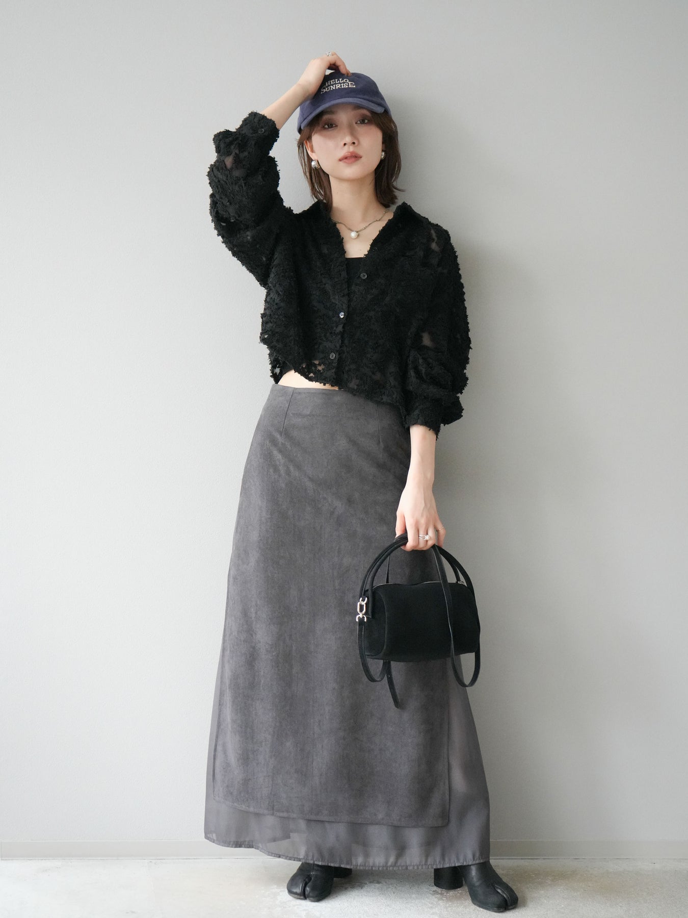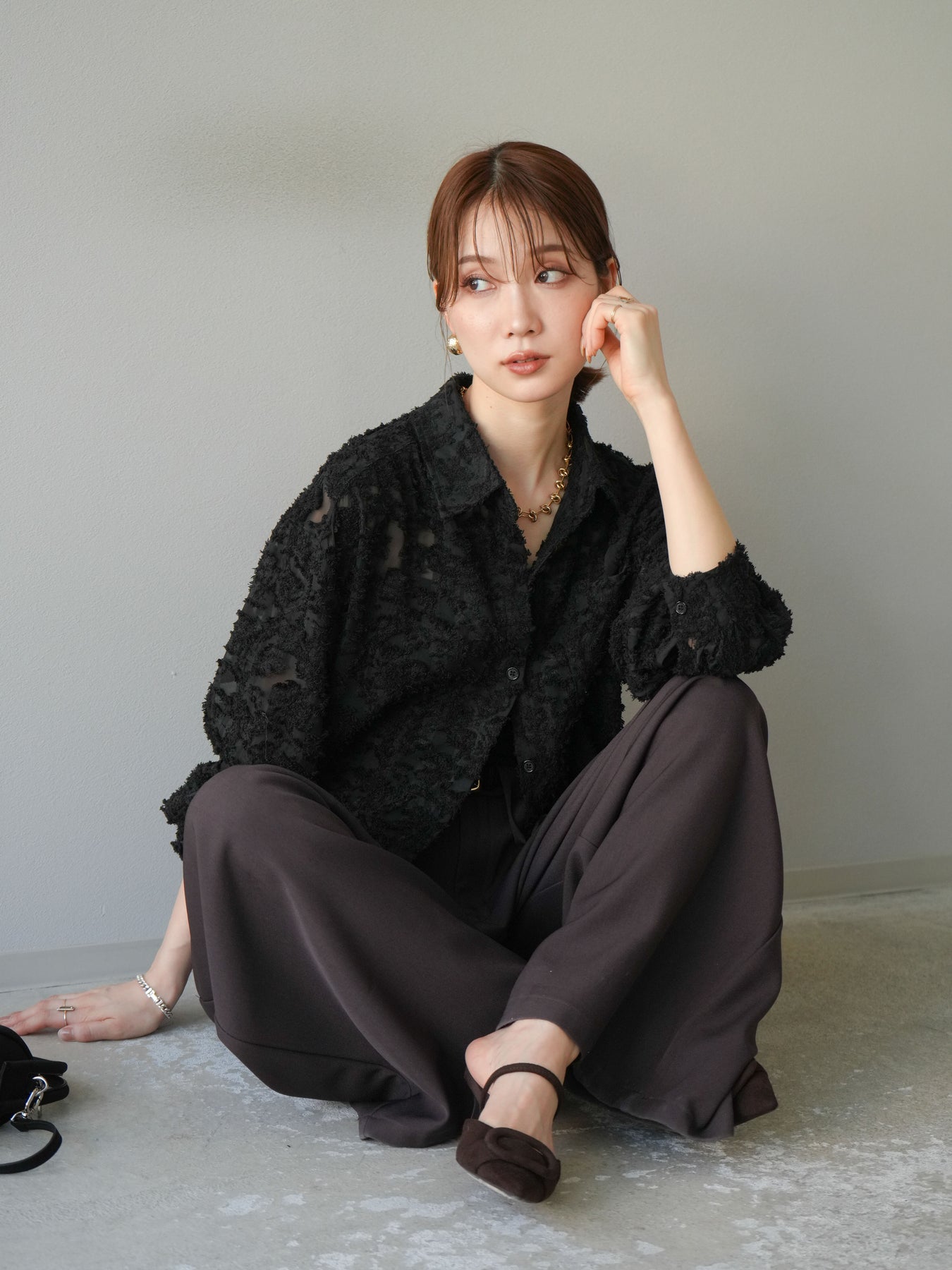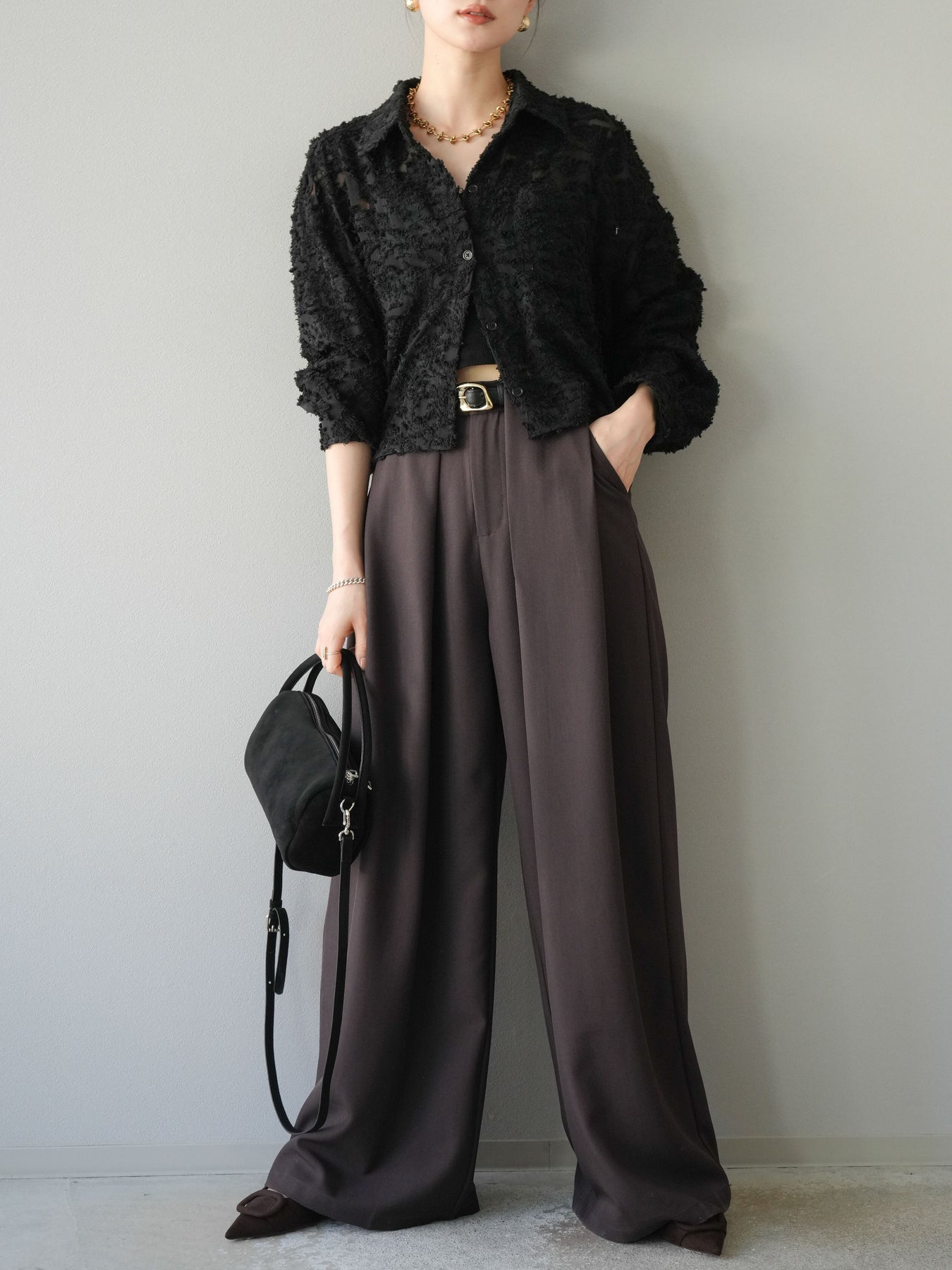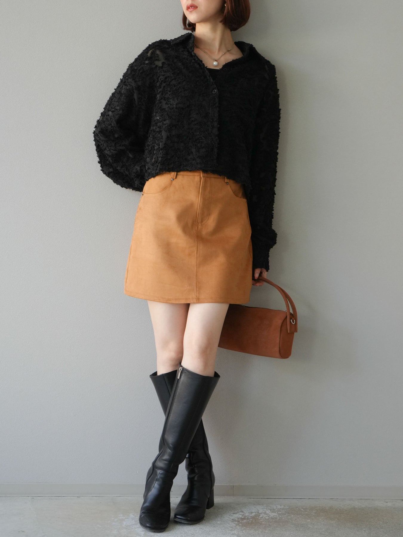 立体感のあるジャガード生地を使用したショートシャツ。織りで表現された繊細な模様が存在感を放ち、シンプルなコーディネートに加えるだけで華やかさを演出します。ショート丈のデザインがスタイルアップを叶え、ハイウエストのボトムスとも相性抜群。程よくゆとりのあるシルエットで、羽織りとしてもトップスとしても着回せます。パンツスタイルに合わせてモードに、スカートと合わせてフェミニンにと幅広い着こなしに対応可能。シーズンレスで取り入れやすく、コーディネートを格上げしてくれる一枚です。 ※ボトムス、キャミソール(インナー)以外の商品は一律でインナーは付属していません。