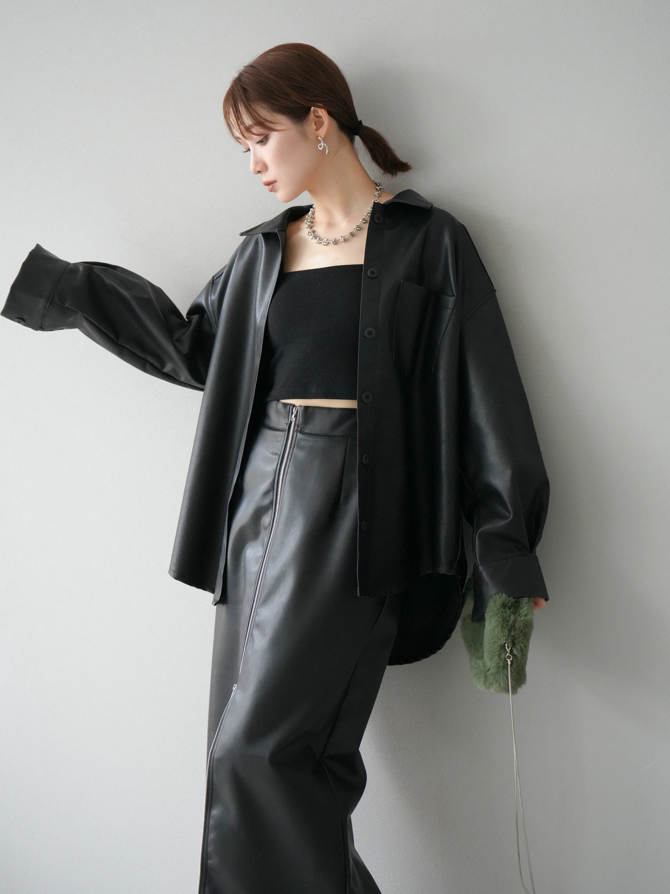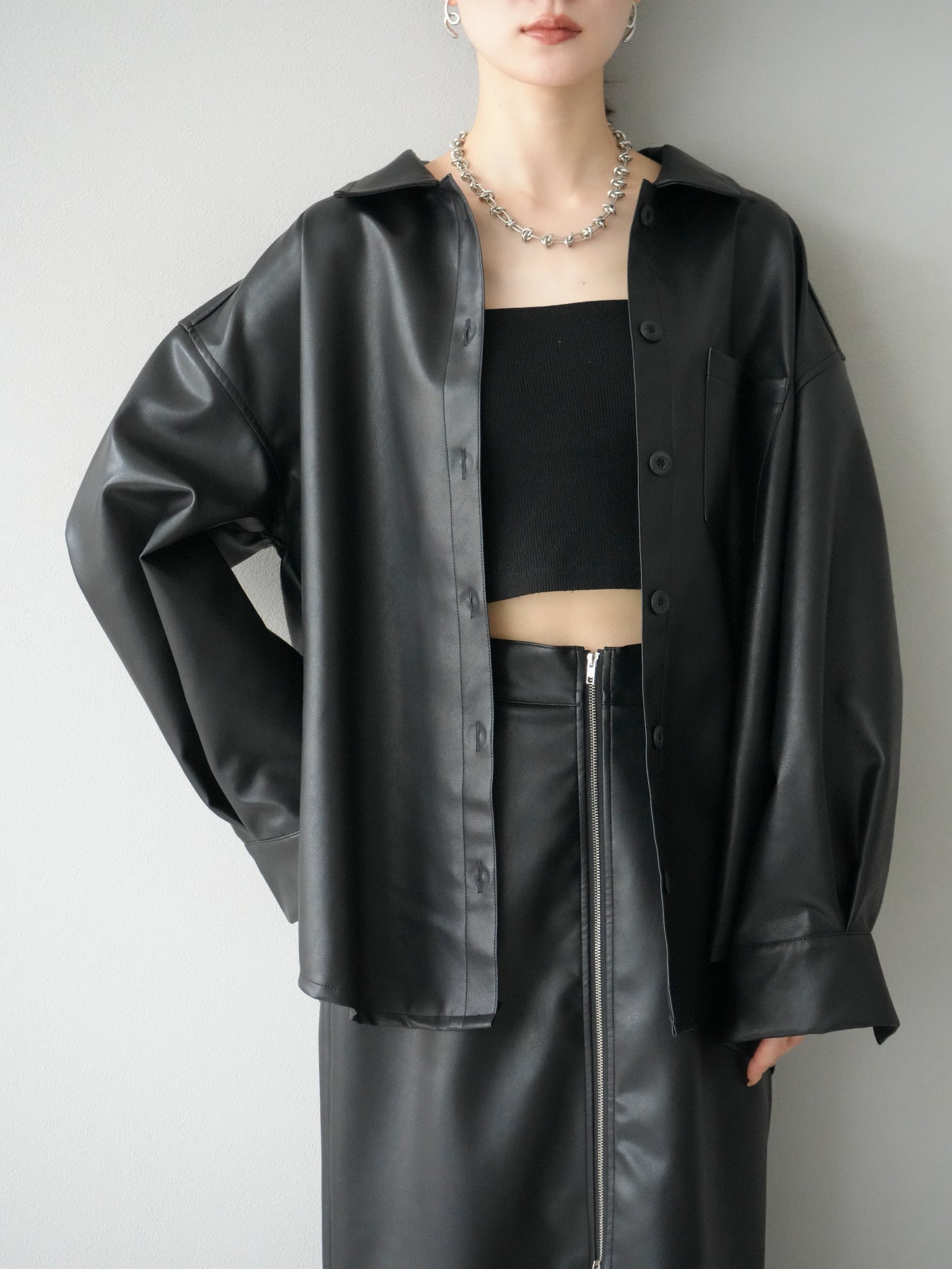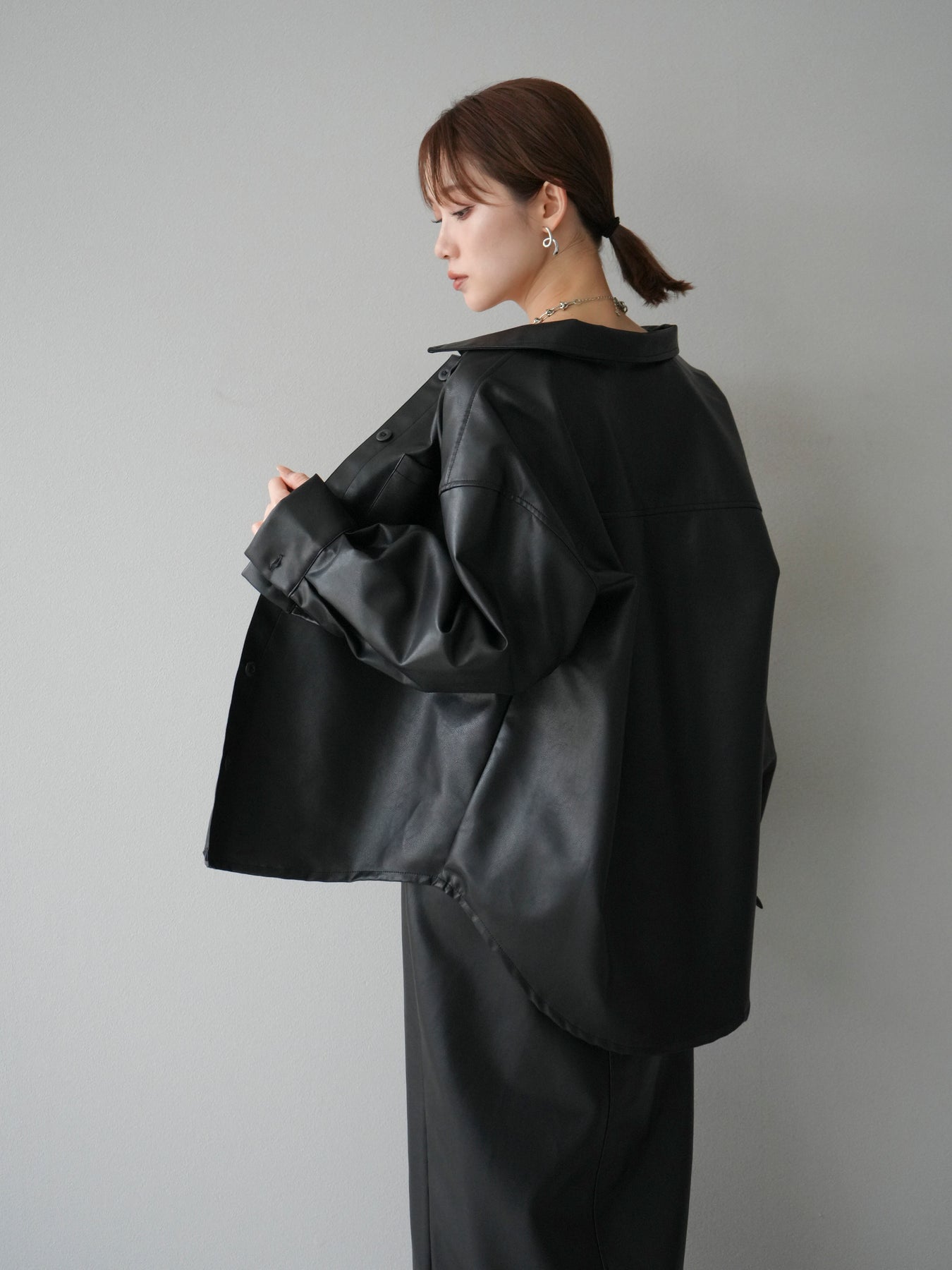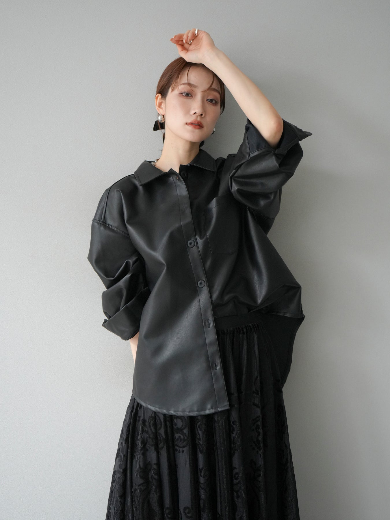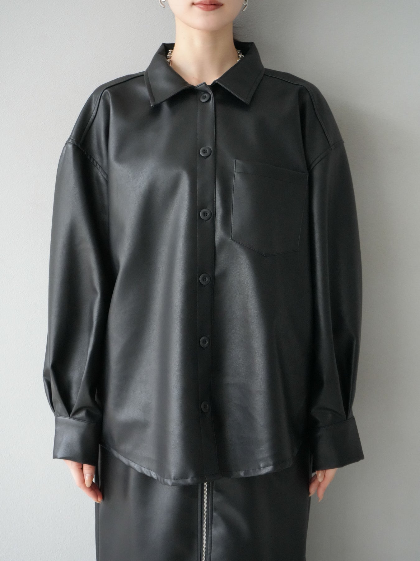 艶やかなフェイクレザー素材を使用したシャツ。シンプルなシルエットながら、素材感が際立ちコーディネートにモードな雰囲気をプラスします。程よいオーバーサイズ感で羽織りとしてもトップスとしても活躍し、スタイリングの幅が広がる一着。パンツに合わせればクールに、スカートと合わせればフェミニンさを引き立てるバランスに仕上がります。シーズンレスで取り入れやすく、存在感のあるスタイルを完成させてくれる万能アイテムです。 ※ボトムス、キャミソール(インナー)以外の商品は一律でインナーは付属していません。