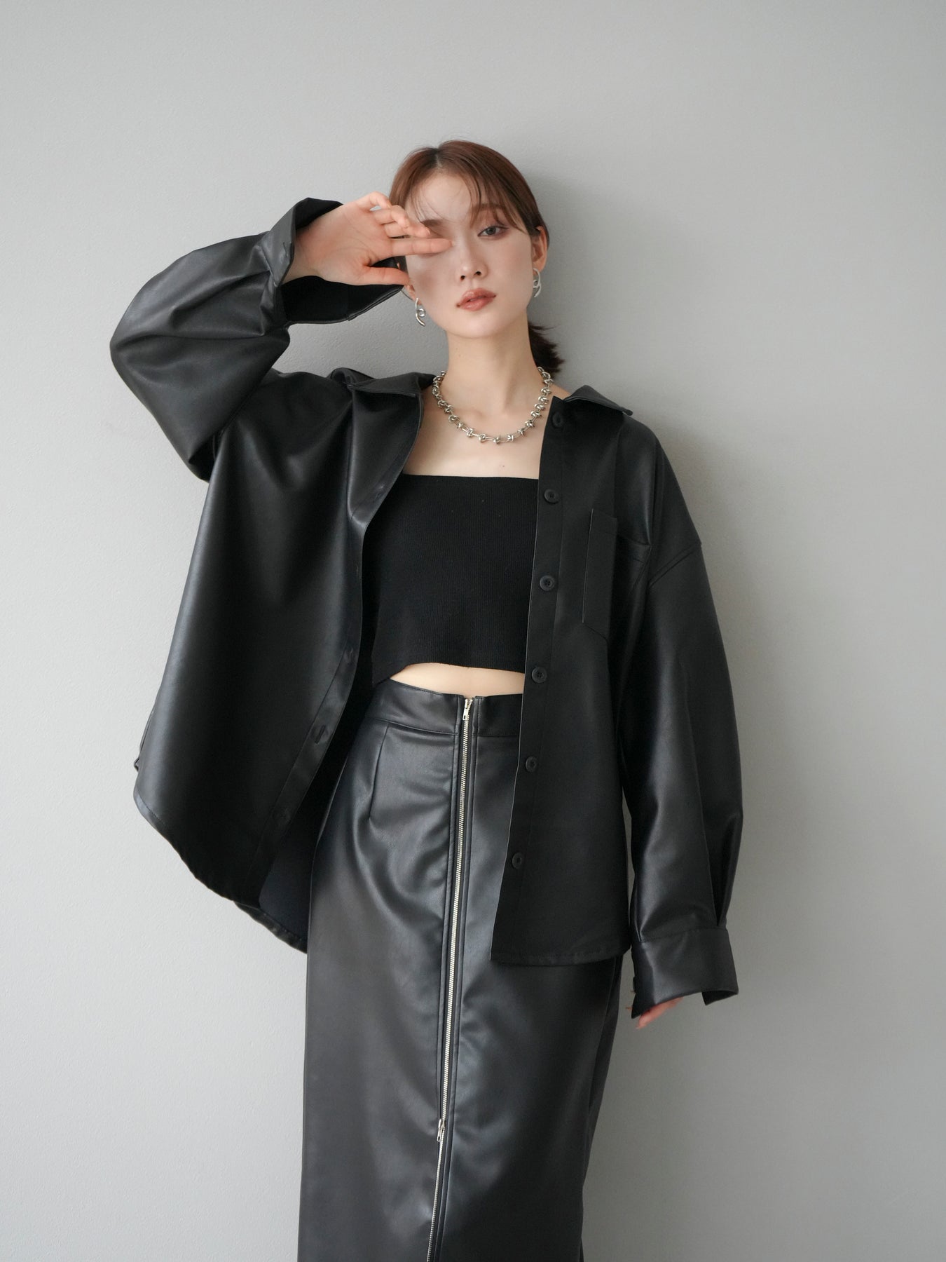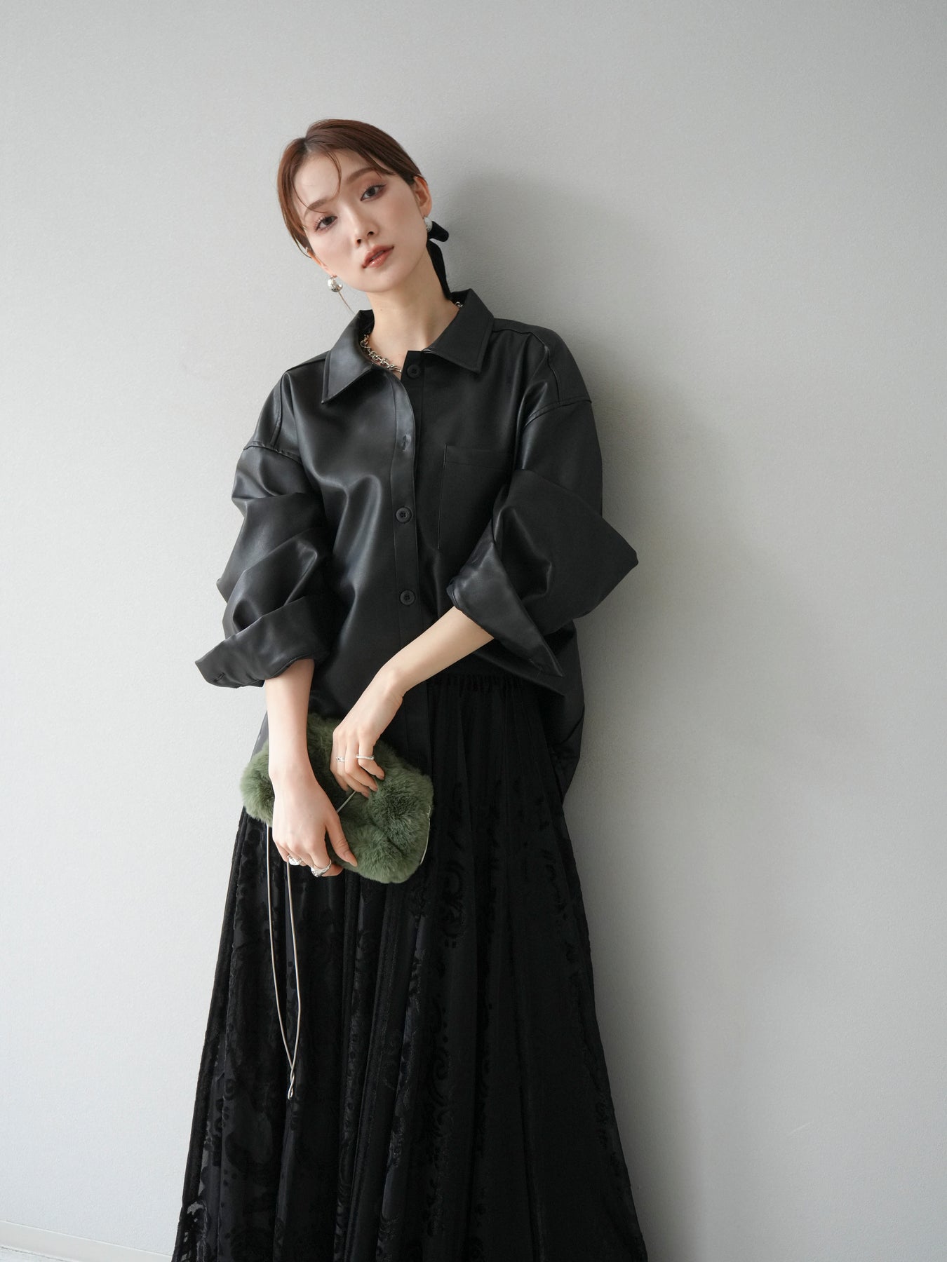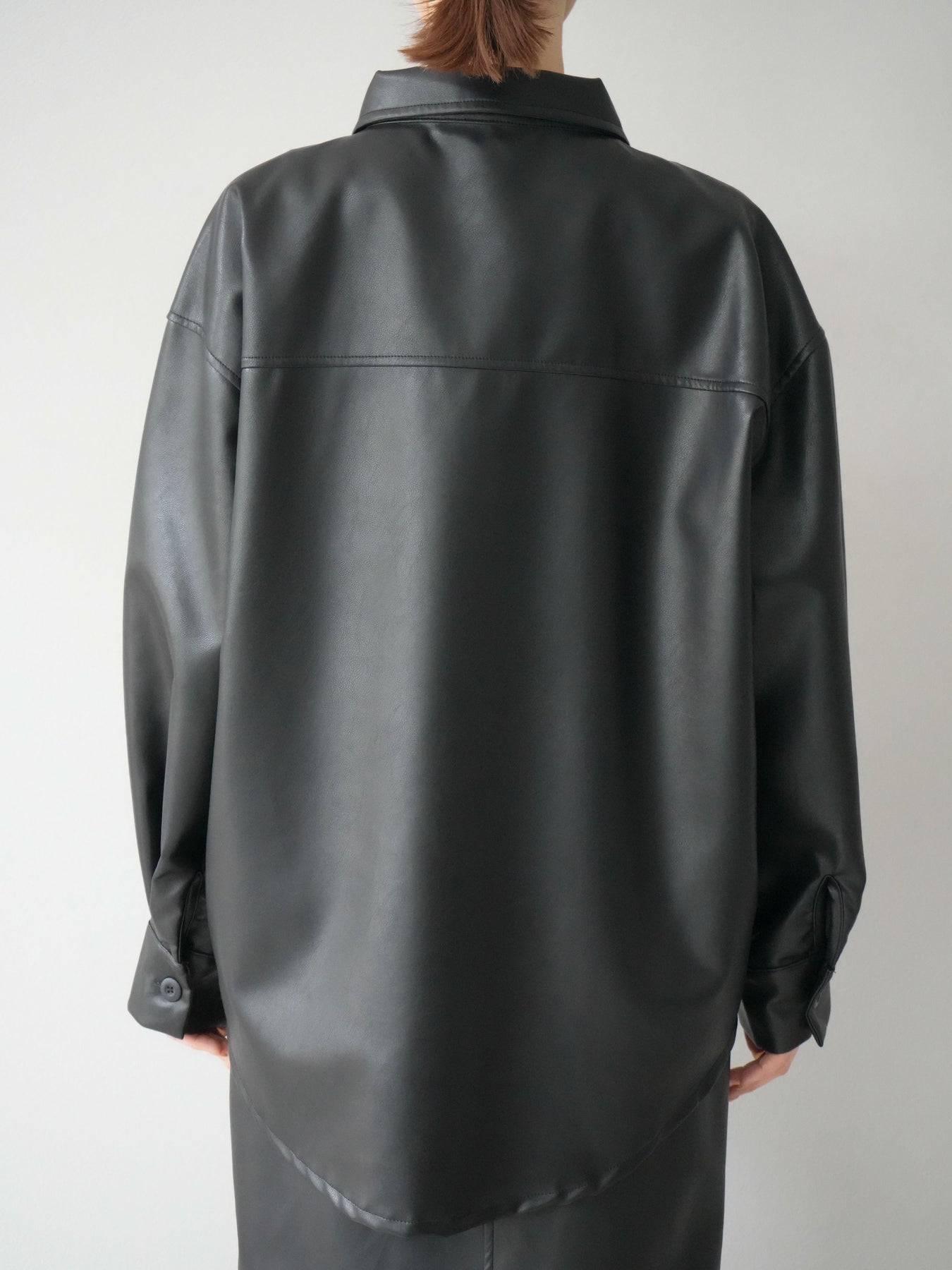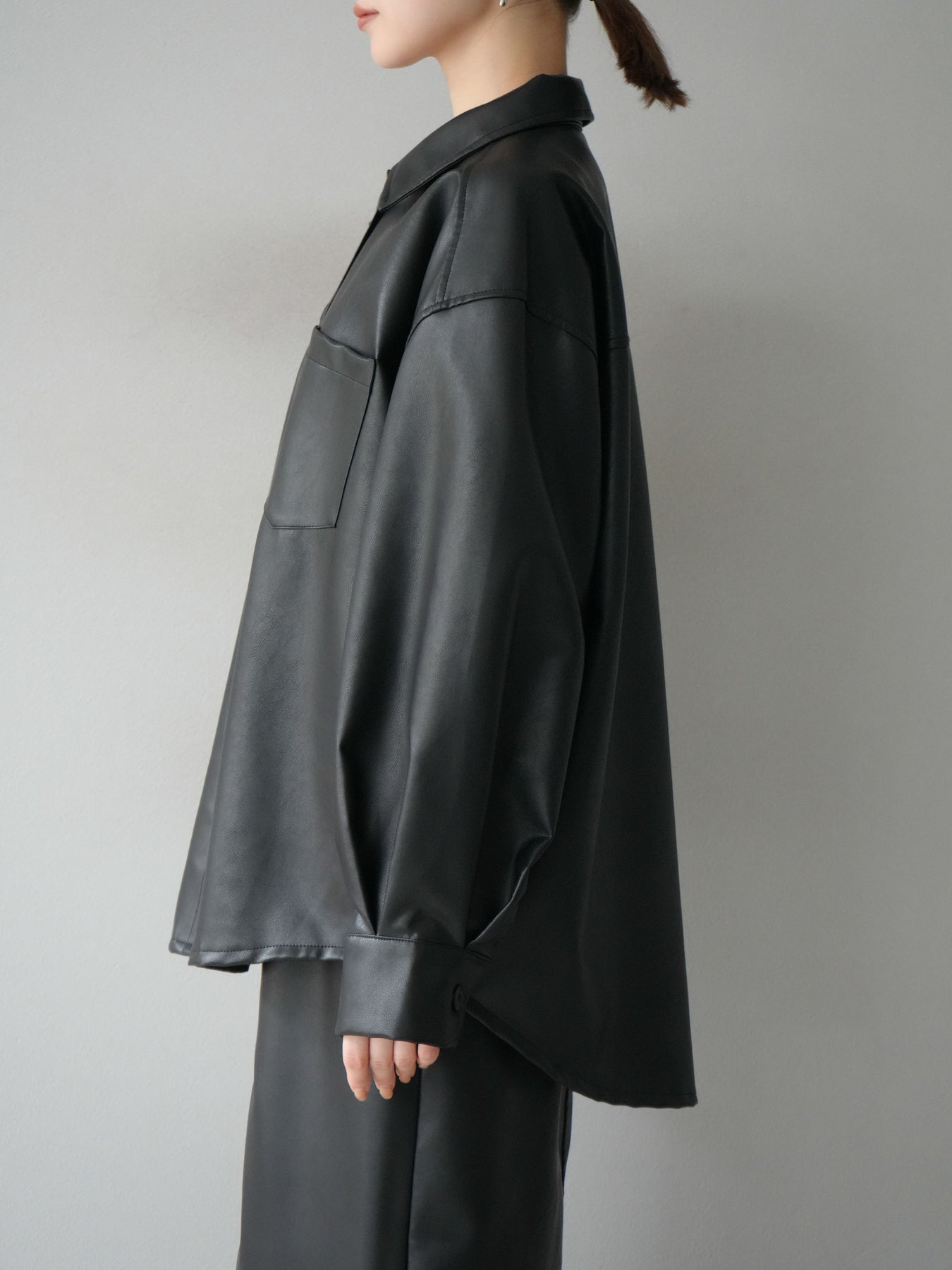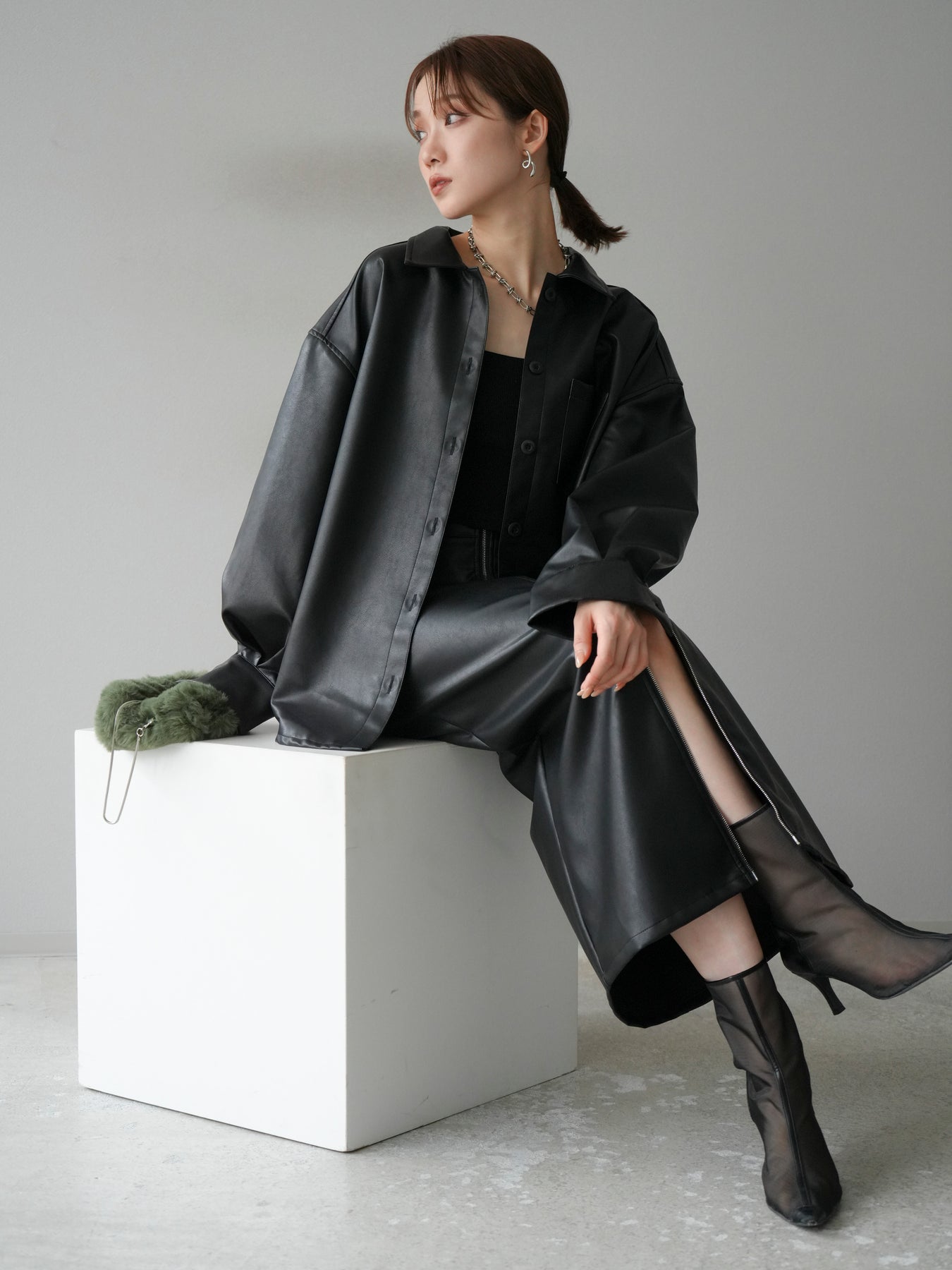 艶やかなフェイクレザー素材を使用したシャツ。シンプルなシルエットながら、素材感が際立ちコーディネートにモードな雰囲気をプラスします。程よいオーバーサイズ感で羽織りとしてもトップスとしても活躍し、スタイリングの幅が広がる一着。パンツに合わせればクールに、スカートと合わせればフェミニンさを引き立てるバランスに仕上がります。シーズンレスで取り入れやすく、存在感のあるスタイルを完成させてくれる万能アイテムです。 ※ボトムス、キャミソール(インナー)以外の商品は一律でインナーは付属していません。