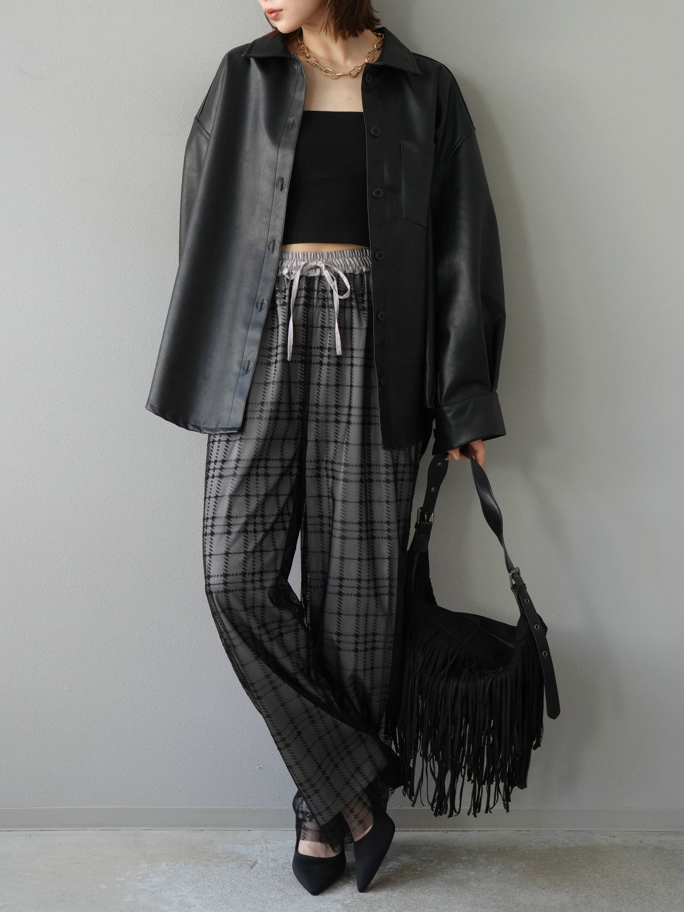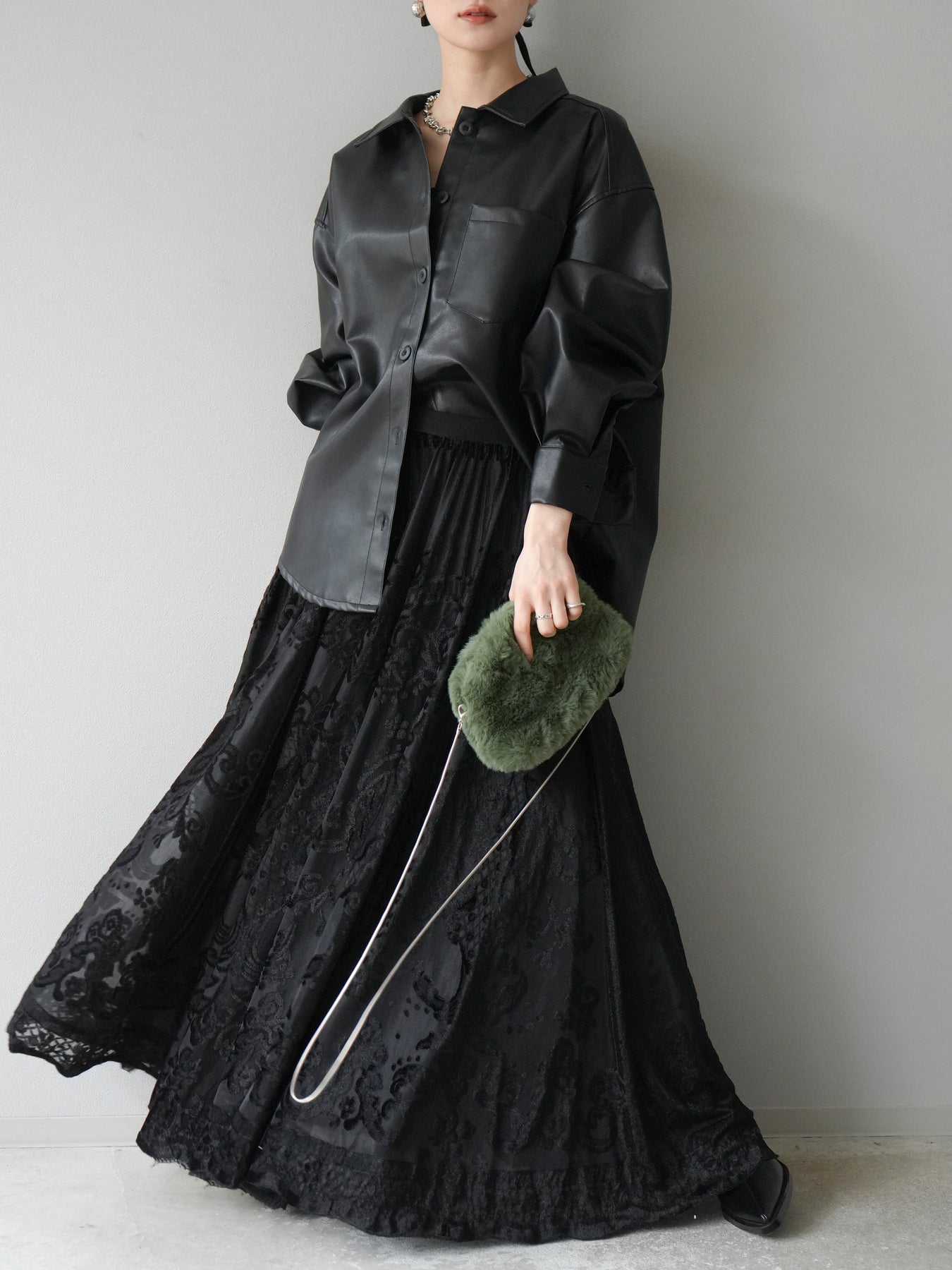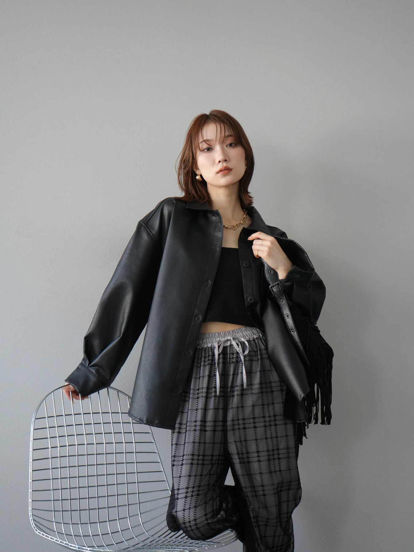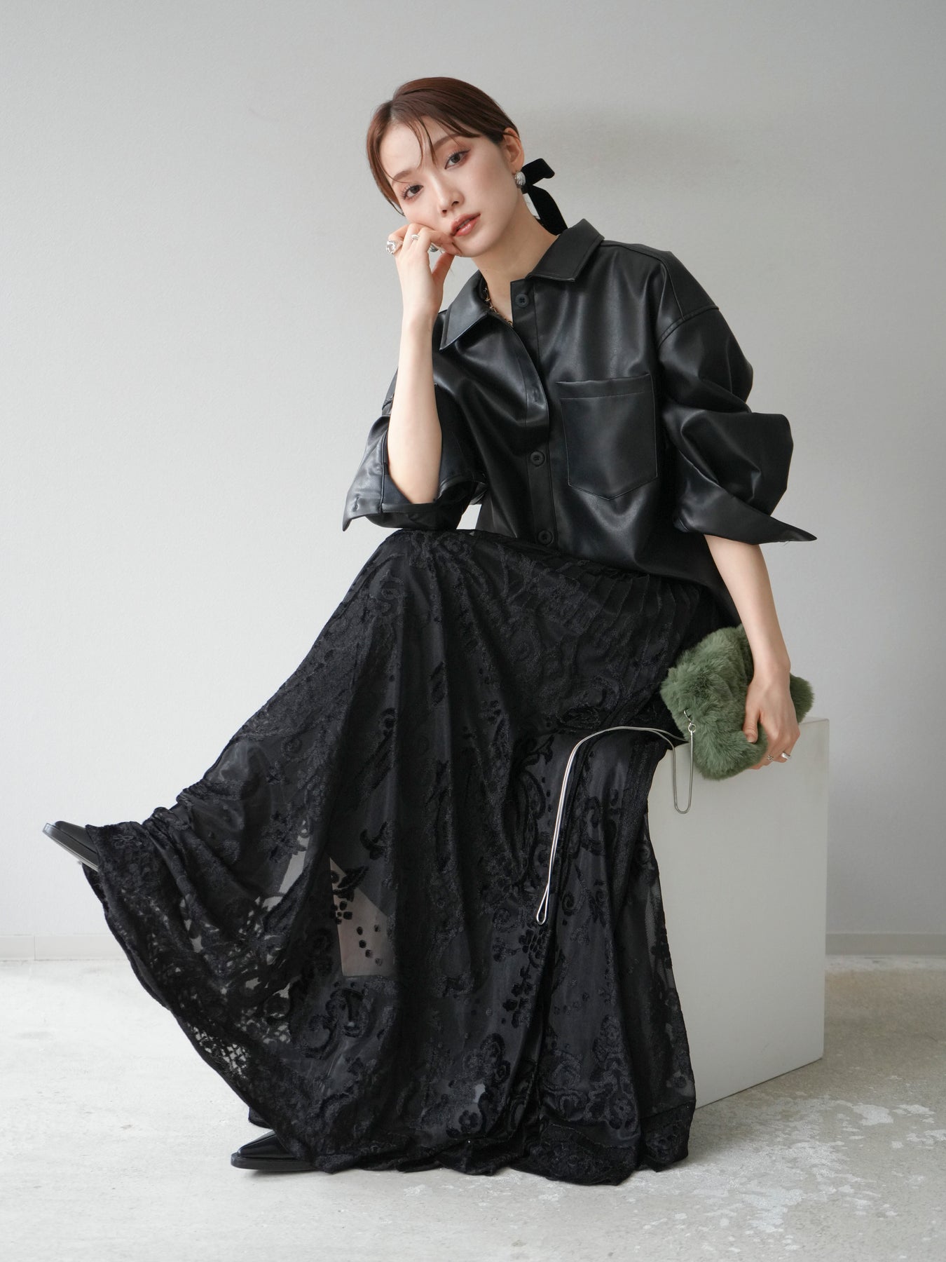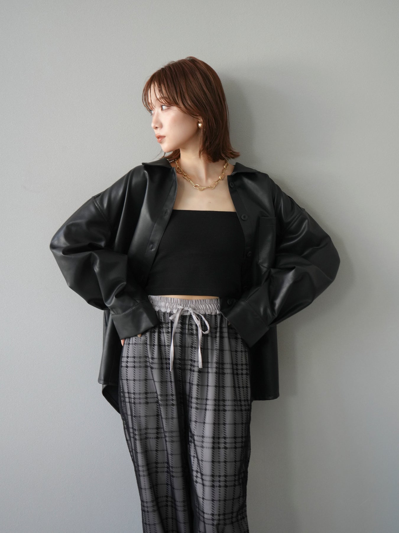 艶やかなフェイクレザー素材を使用したシャツ。シンプルなシルエットながら、素材感が際立ちコーディネートにモードな雰囲気をプラスします。程よいオーバーサイズ感で羽織りとしてもトップスとしても活躍し、スタイリングの幅が広がる一着。パンツに合わせればクールに、スカートと合わせればフェミニンさを引き立てるバランスに仕上がります。シーズンレスで取り入れやすく、存在感のあるスタイルを完成させてくれる万能アイテムです。 ※ボトムス、キャミソール(インナー)以外の商品は一律でインナーは付属していません。