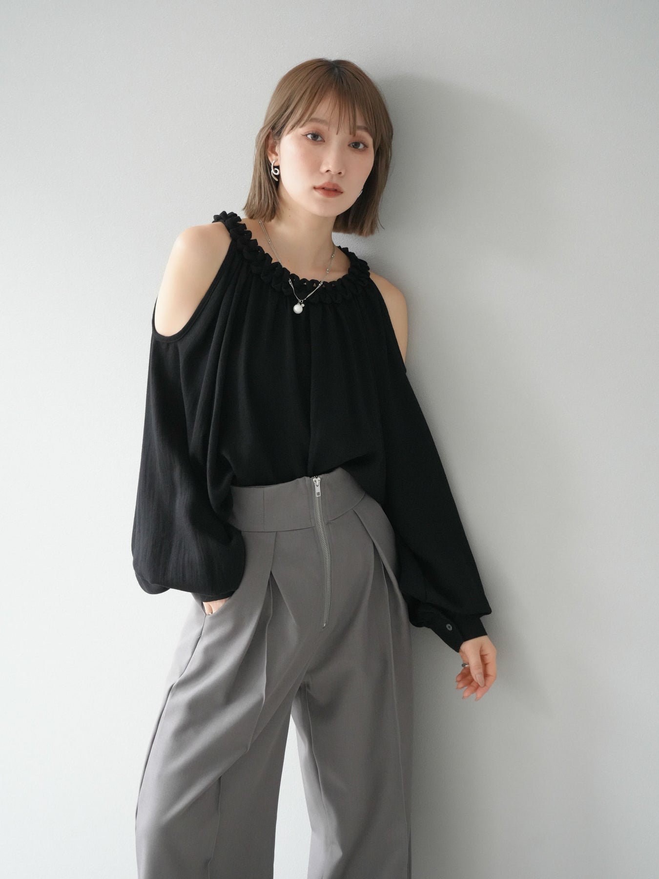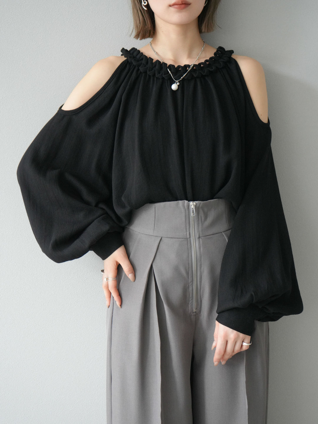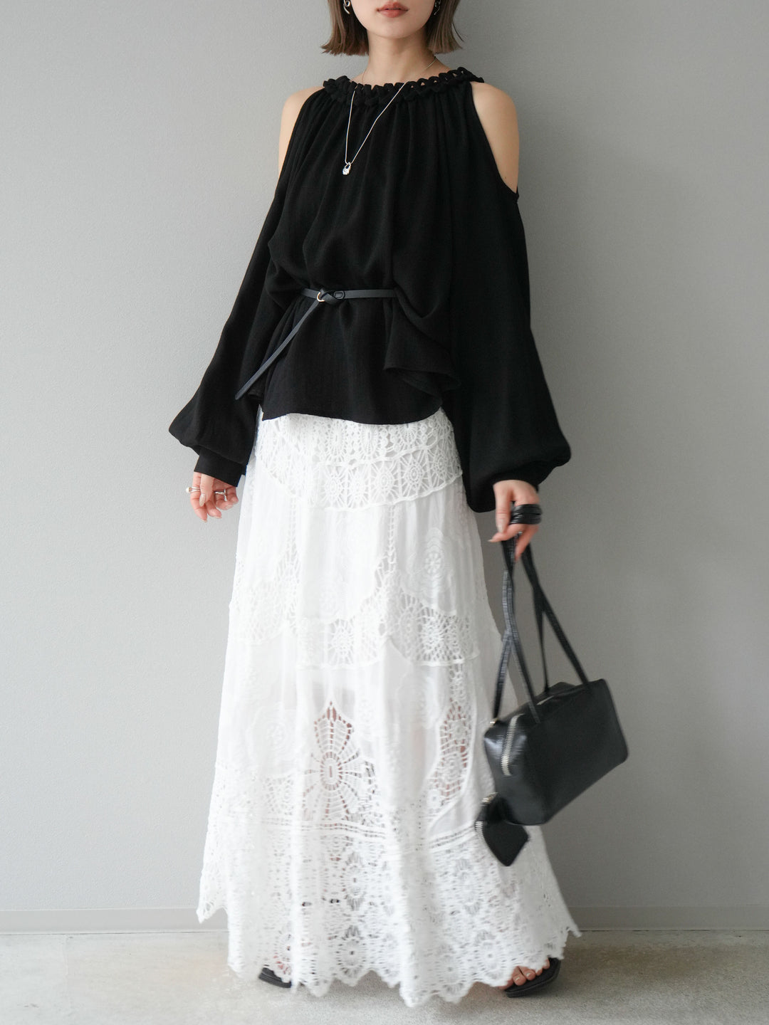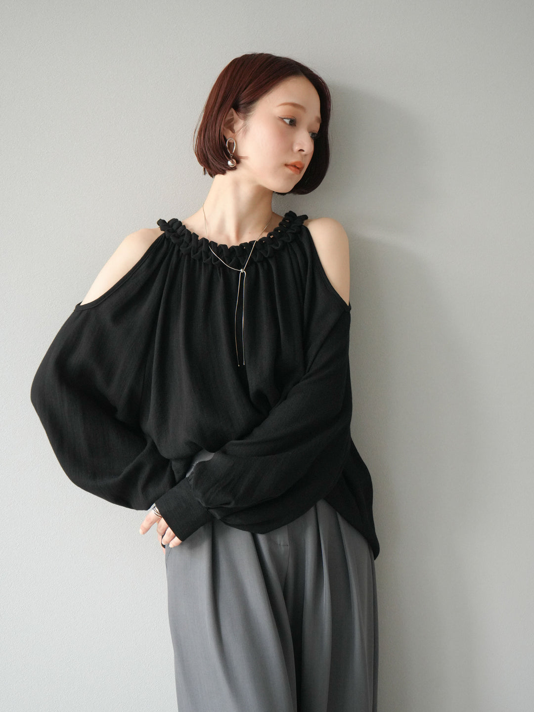 [予約]コードステッチオープンショルダーブラウス/ブラック