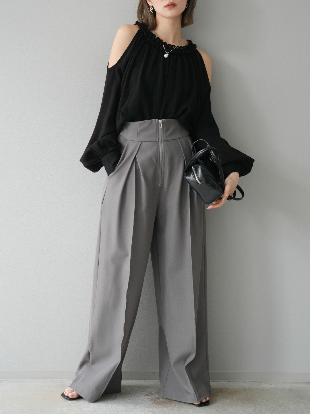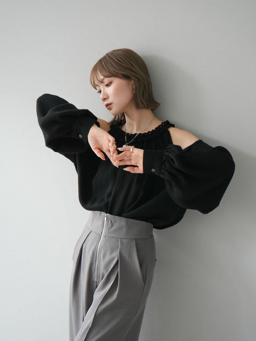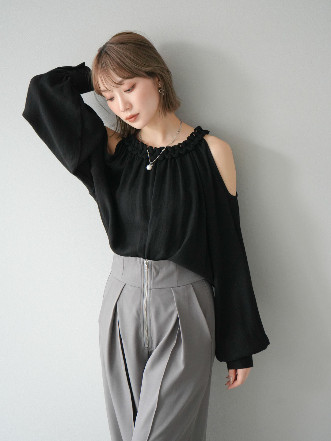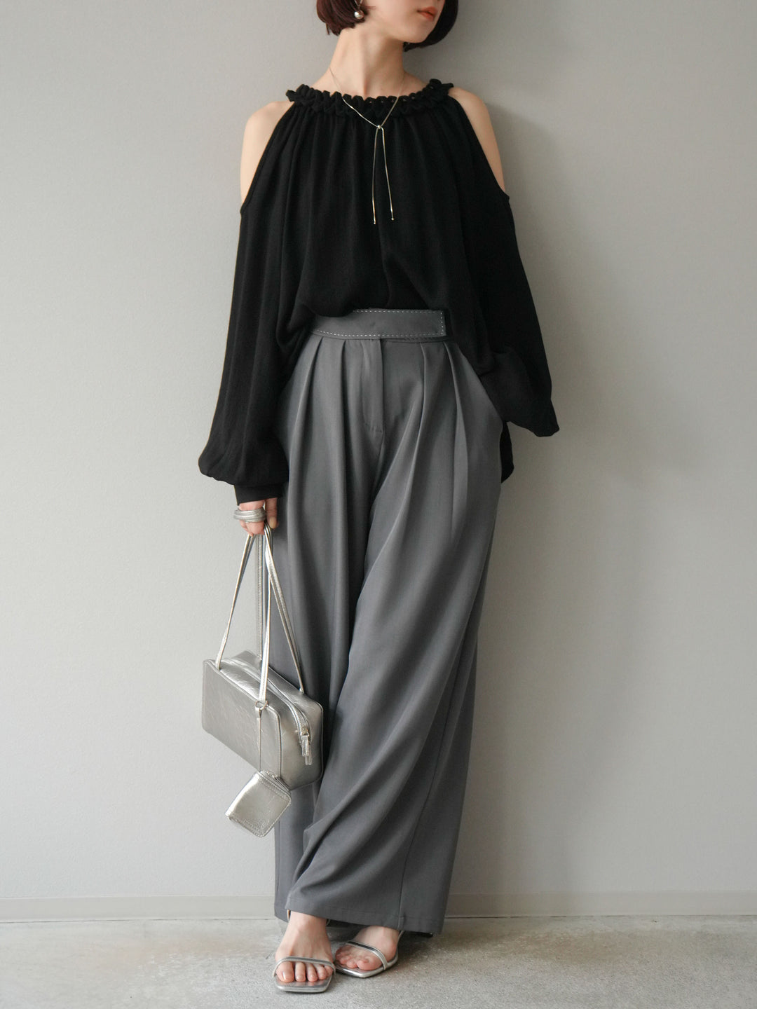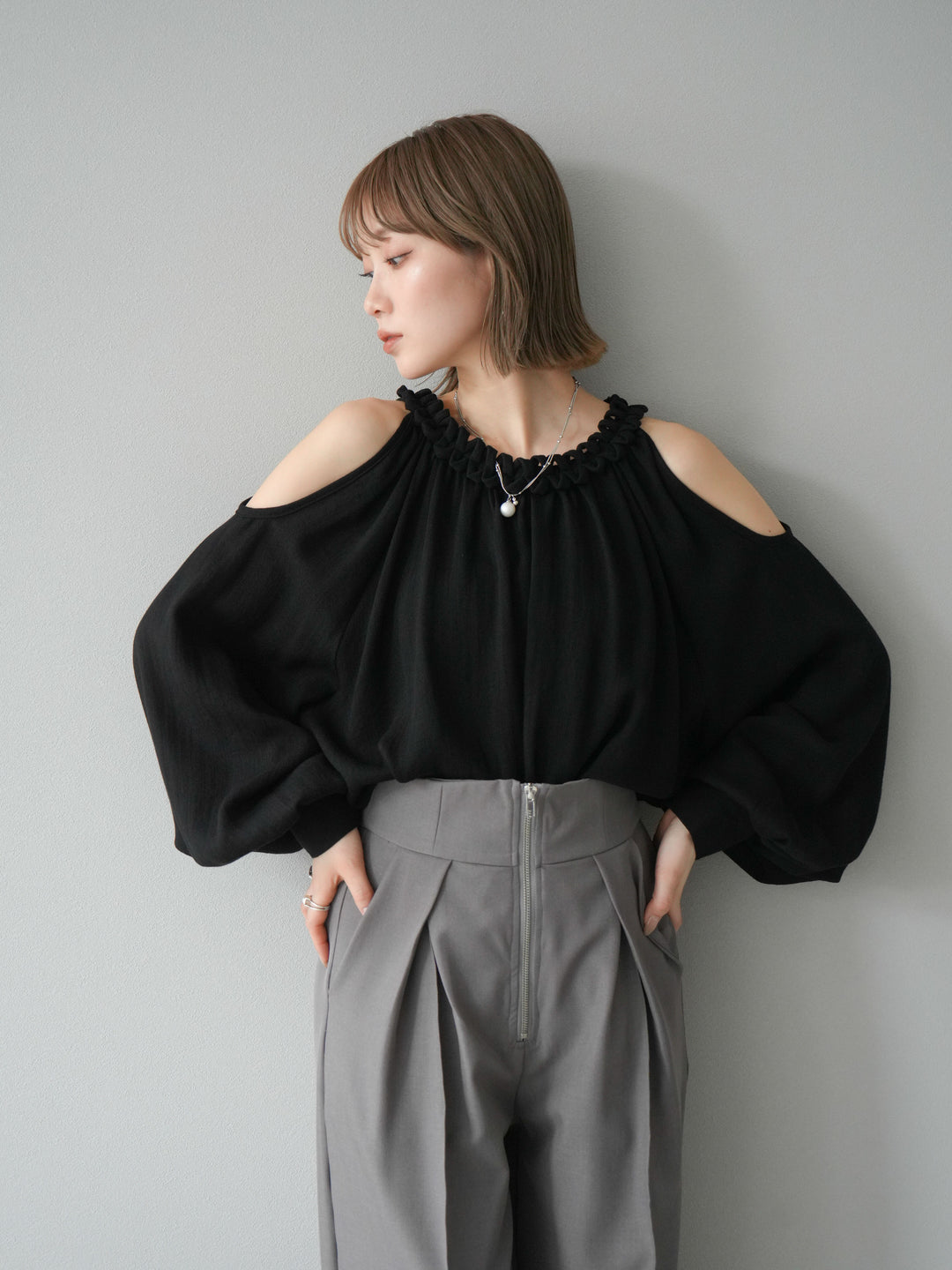 [予約]コードステッチオープンショルダーブラウス/ブラック