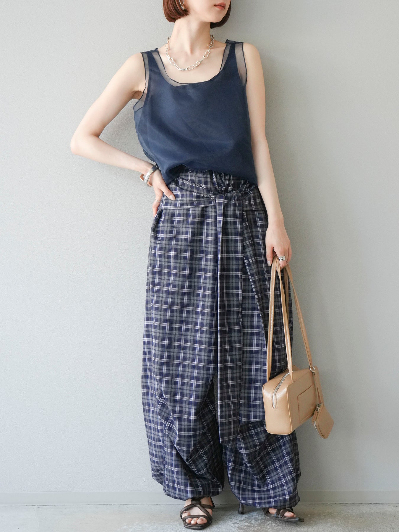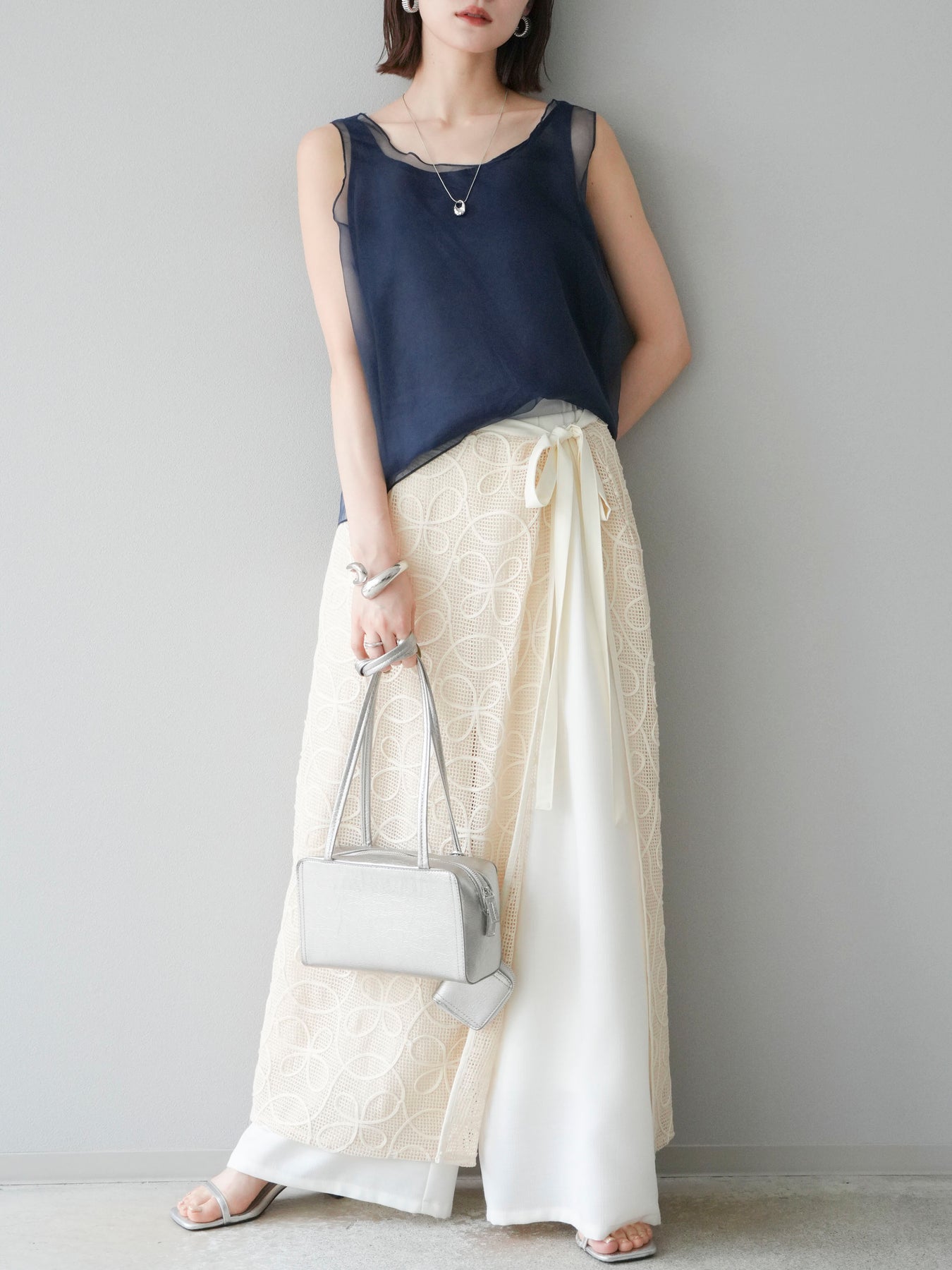シアーなオーガンジーを重ねた、軽やかで上品な印象のレイヤードタンクトップ。内側には透けにくいインナーがセットされており、1枚でさらりと着られる仕様になっています。 程よくゆとりのあるシルエットと繊細な透け感が、夏らしい抜け感を演出。カジュアルにもきれいめにも合わせやすく、ジャケットやカーディガンのインナーとしても重宝します。 シンプルながらもディテールにこだわった、着回し力の高い万能トップスです。 ※ボトムス、キャミソール(インナー)以外の商品は一律でインナーは付属していません。