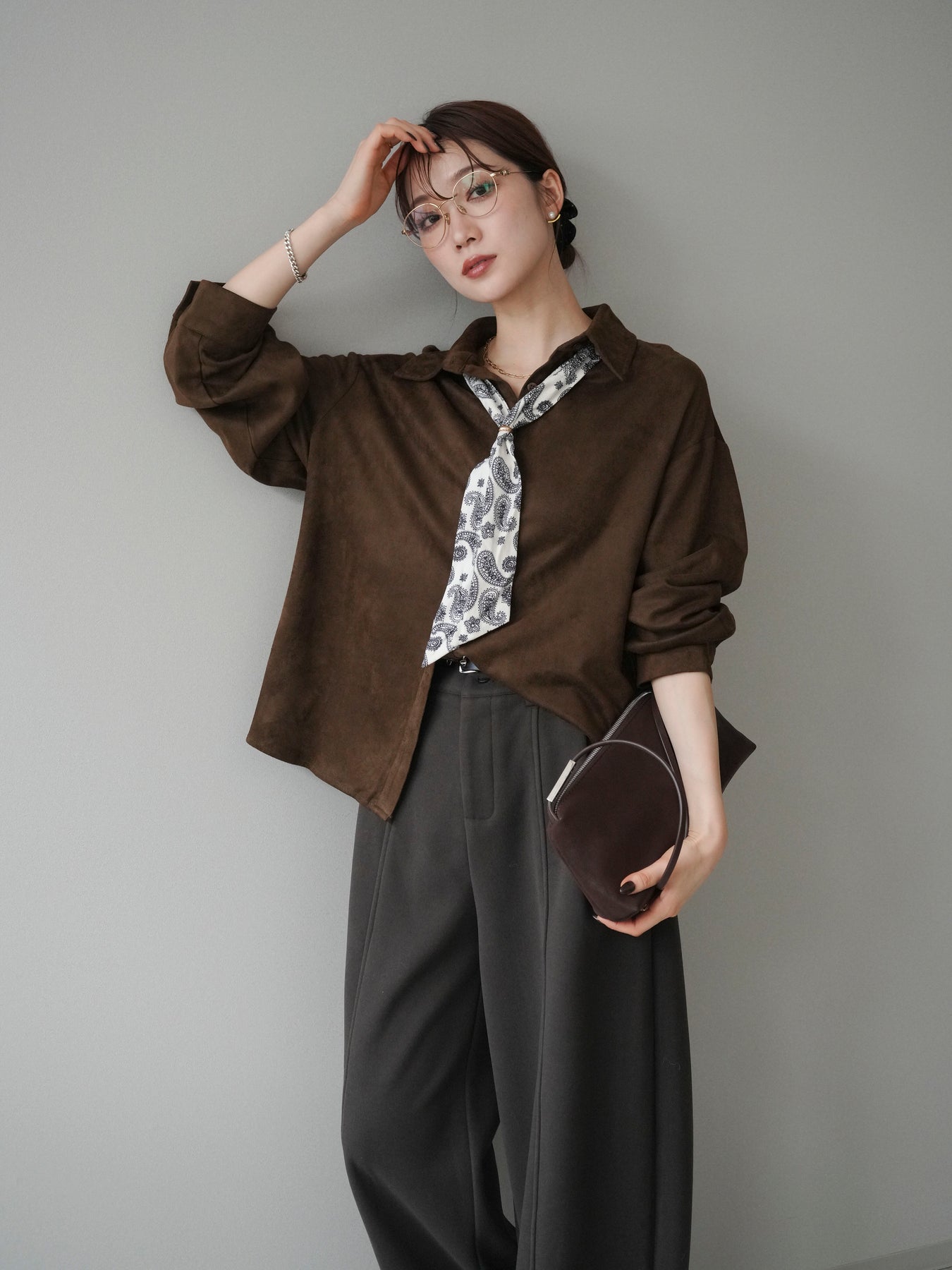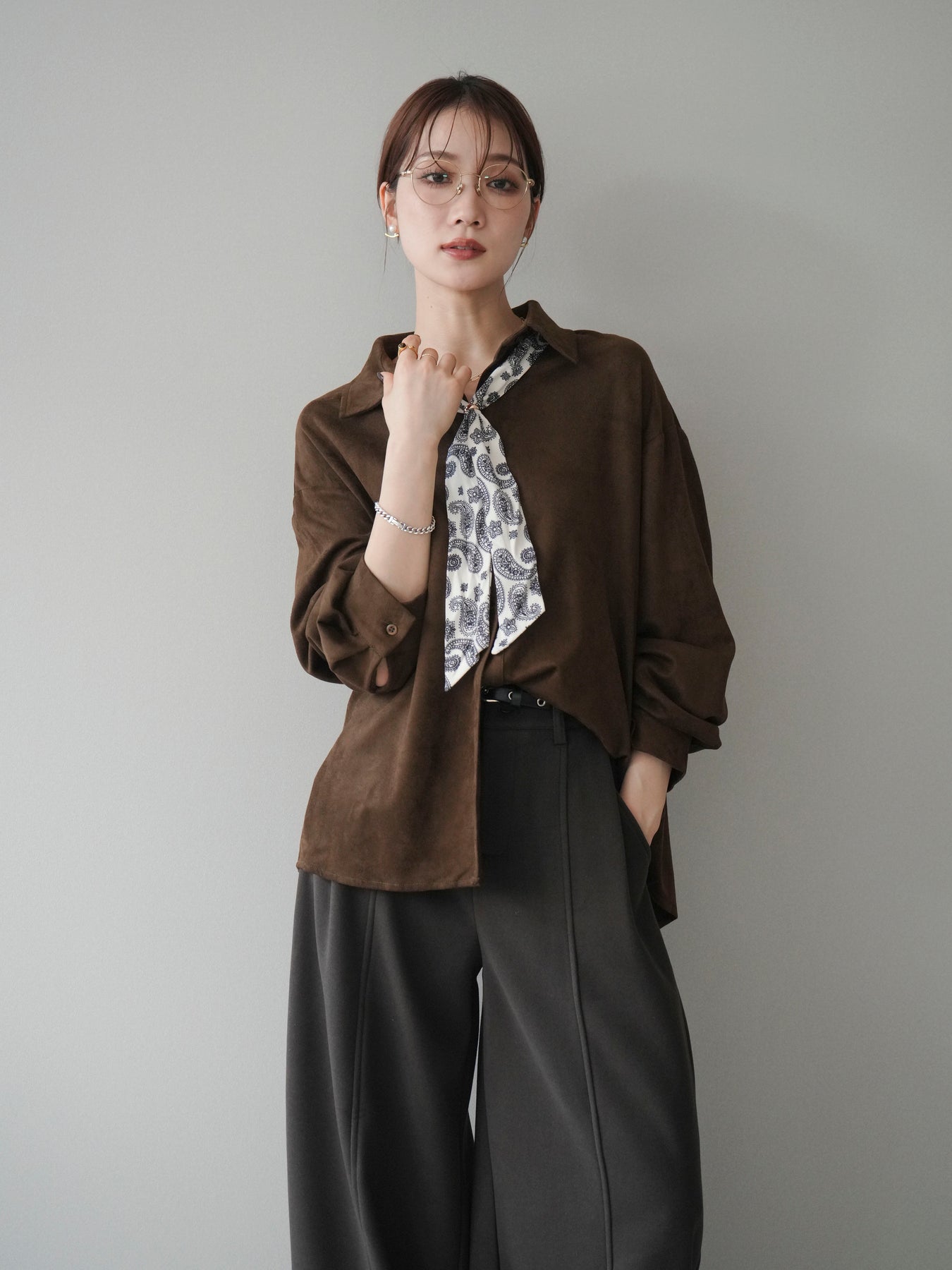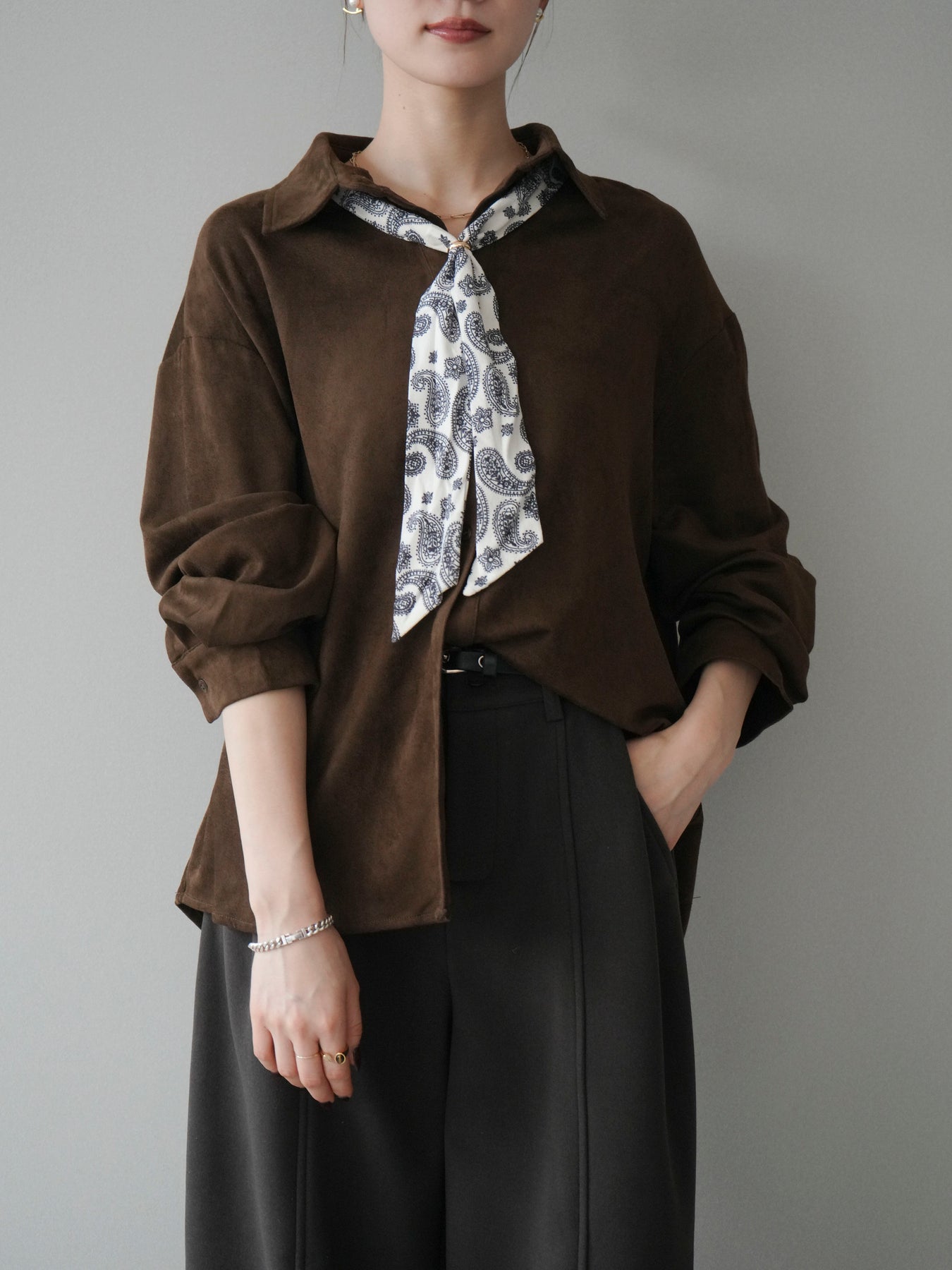 なめらかなスエードタッチ素材で仕立てたシャツに、上品な柄スカーフをセットした着映えアイテム。落ち感のある生地が自然なドレープを生み、シンプルながら大人らしい洗練された印象に導きます。スカーフは取り外し可能で、その日の気分やコーデに合わせてアレンジできるのも嬉しいポイント。ゆとりのあるシルエットがこなれ感をプラスし、デニムからスカートまで幅広いボトムスと相性よく楽しめる万能な一枚です。 ※ボトムス、キャミソール(インナー)以外の商品は一律でインナーは付属していません。