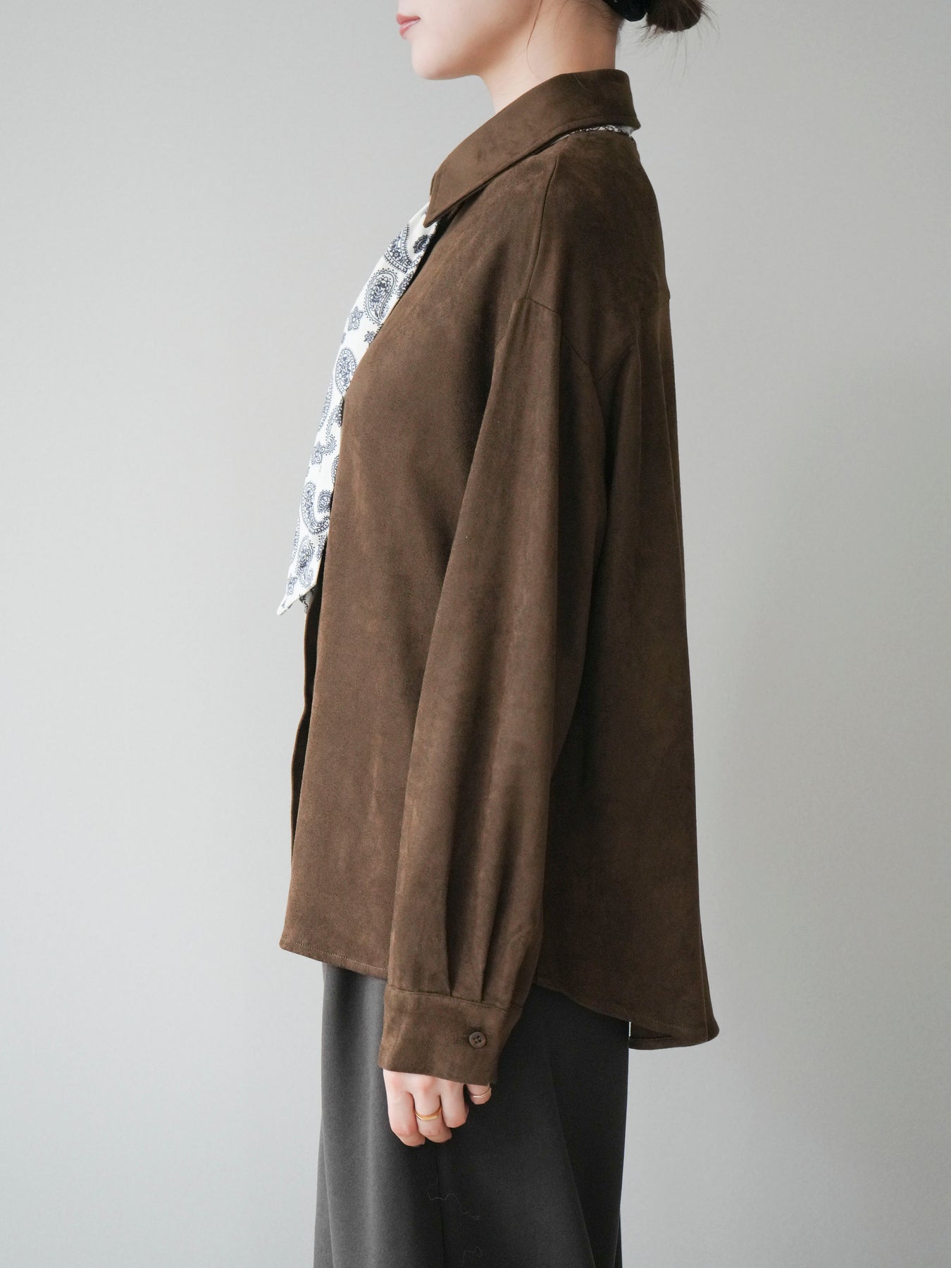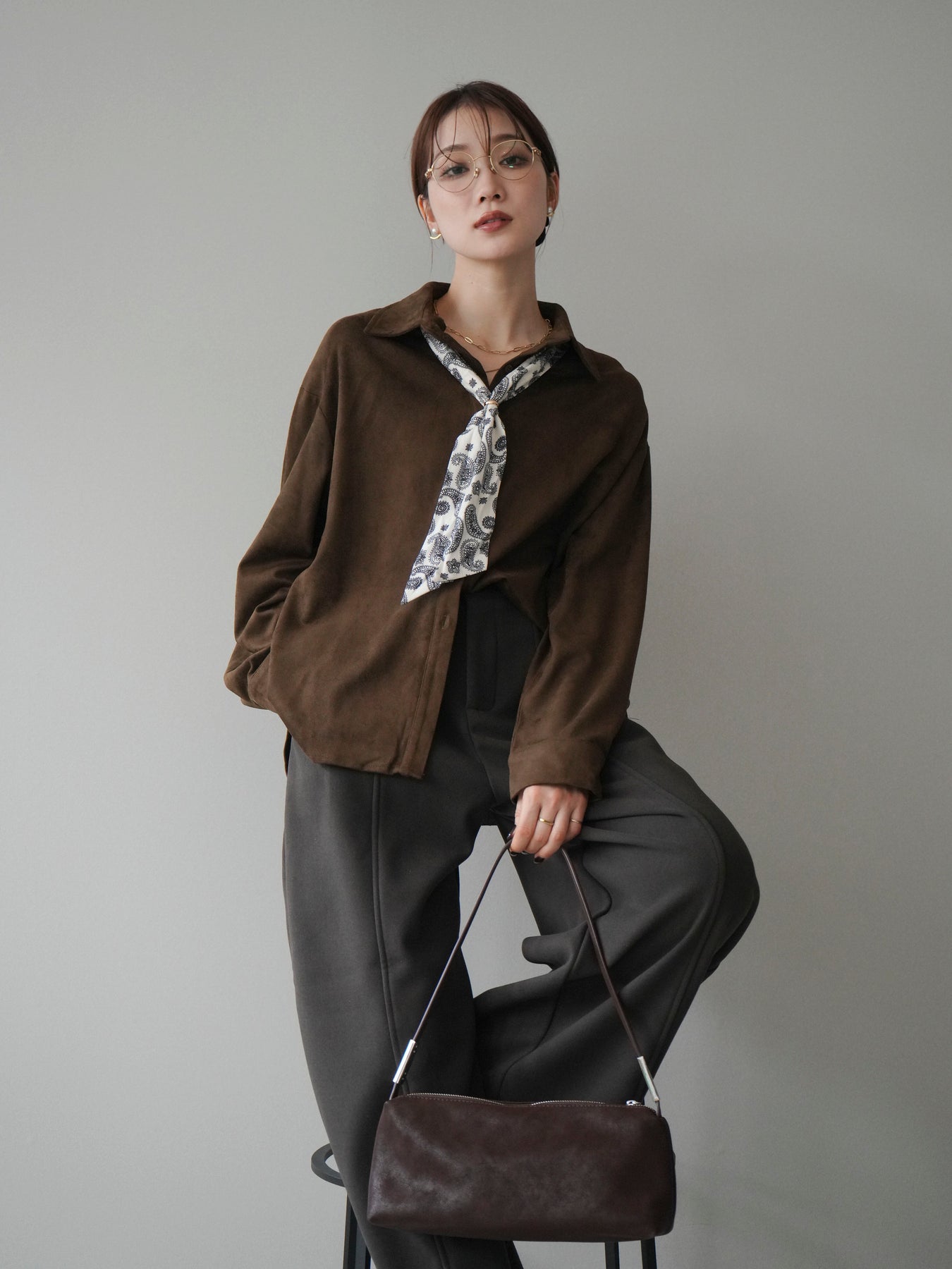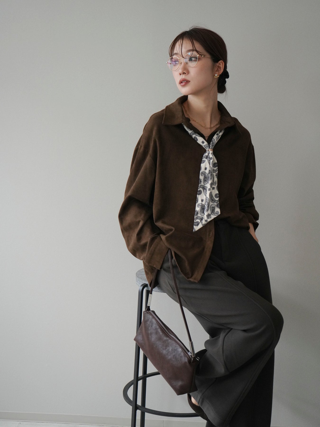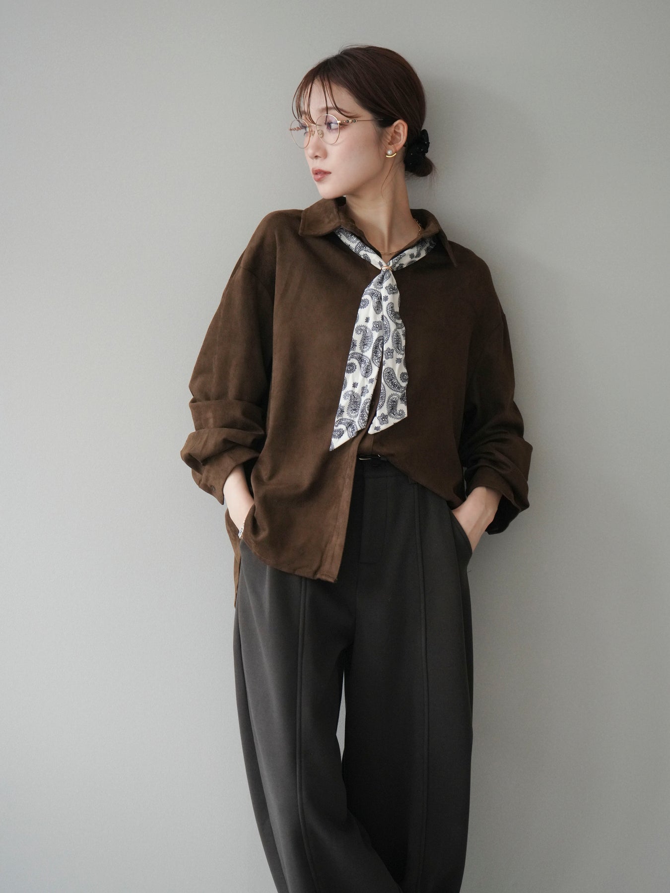 なめらかなスエードタッチ素材で仕立てたシャツに、上品な柄スカーフをセットした着映えアイテム。落ち感のある生地が自然なドレープを生み、シンプルながら大人らしい洗練された印象に導きます。スカーフは取り外し可能で、その日の気分やコーデに合わせてアレンジできるのも嬉しいポイント。ゆとりのあるシルエットがこなれ感をプラスし、デニムからスカートまで幅広いボトムスと相性よく楽しめる万能な一枚です。 ※ボトムス、キャミソール(インナー)以外の商品は一律でインナーは付属していません。