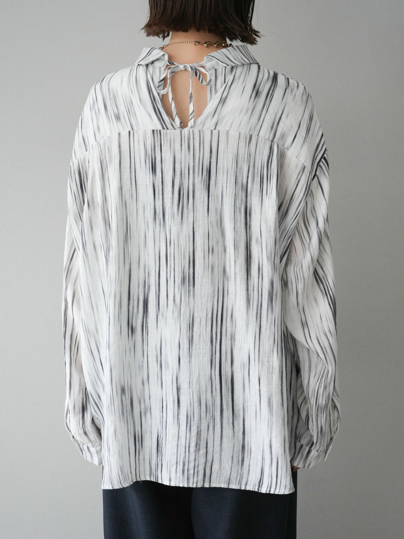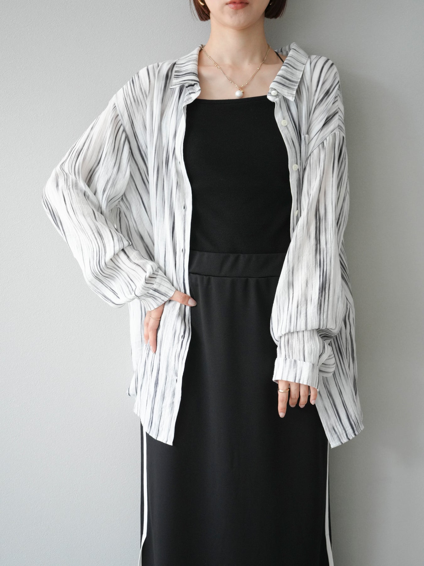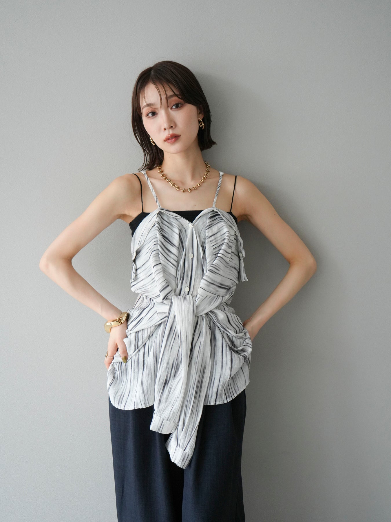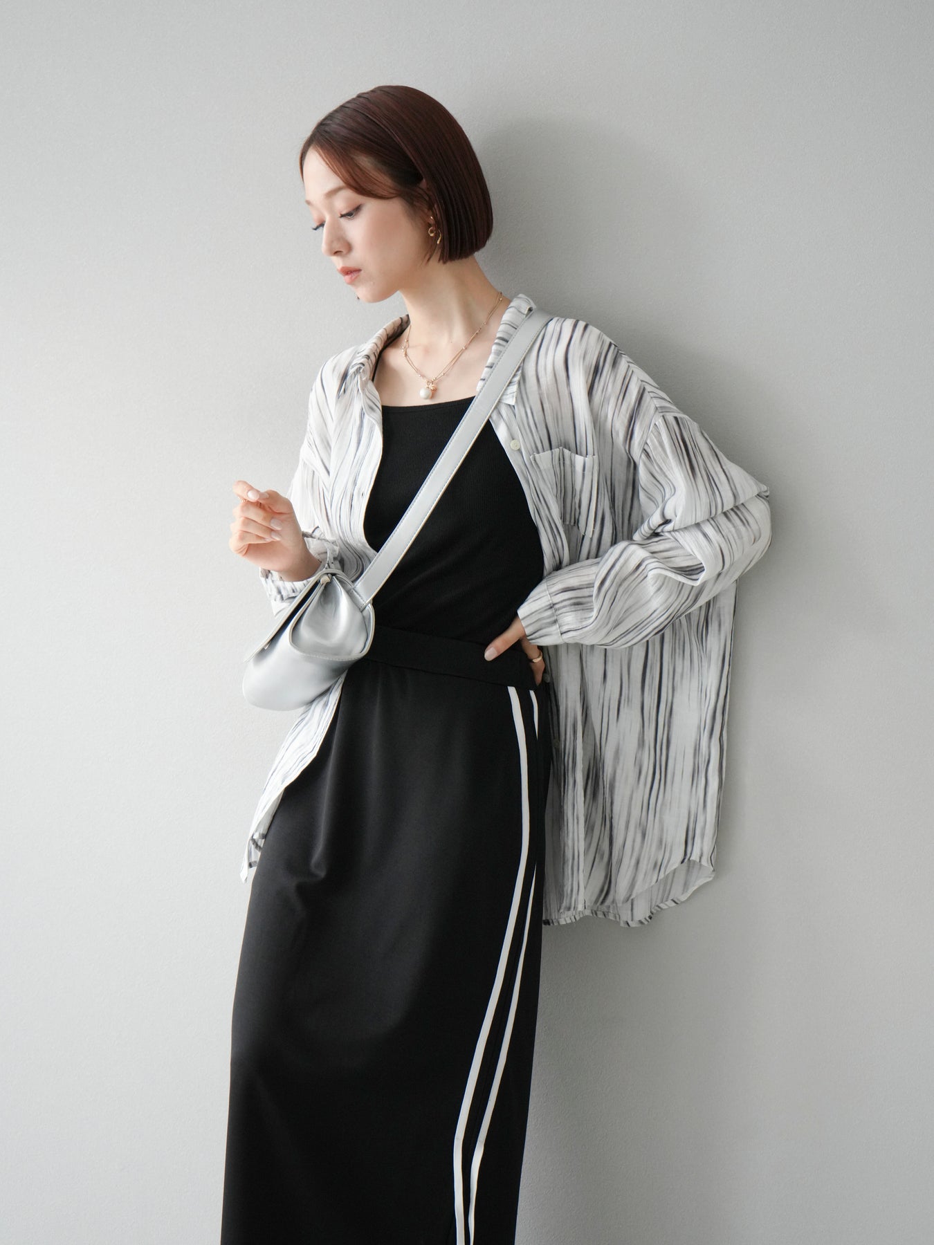 動きのあるタッチで描かれたニュアンス柄が印象的な、大人の抜け感を叶えるマルチWAYオーバーシャツ。 軽やかでさらりとした素材感が涼しげで、これからの季節にぴったりの一枚です。 ボタンを閉じてブラウスとして、前開きで羽織として、ウエストマークでメリハリのあるシルエットに── スタイリングに応じて自在に着こなせる、優秀なマルチWAYデザイン。 細ストラップやキャミソールとのレイヤードで華奢見え効果もアップ。 同柄のパンツや無地ボトムスと合わせることで、モードにもナチュラルにも対応可能です。