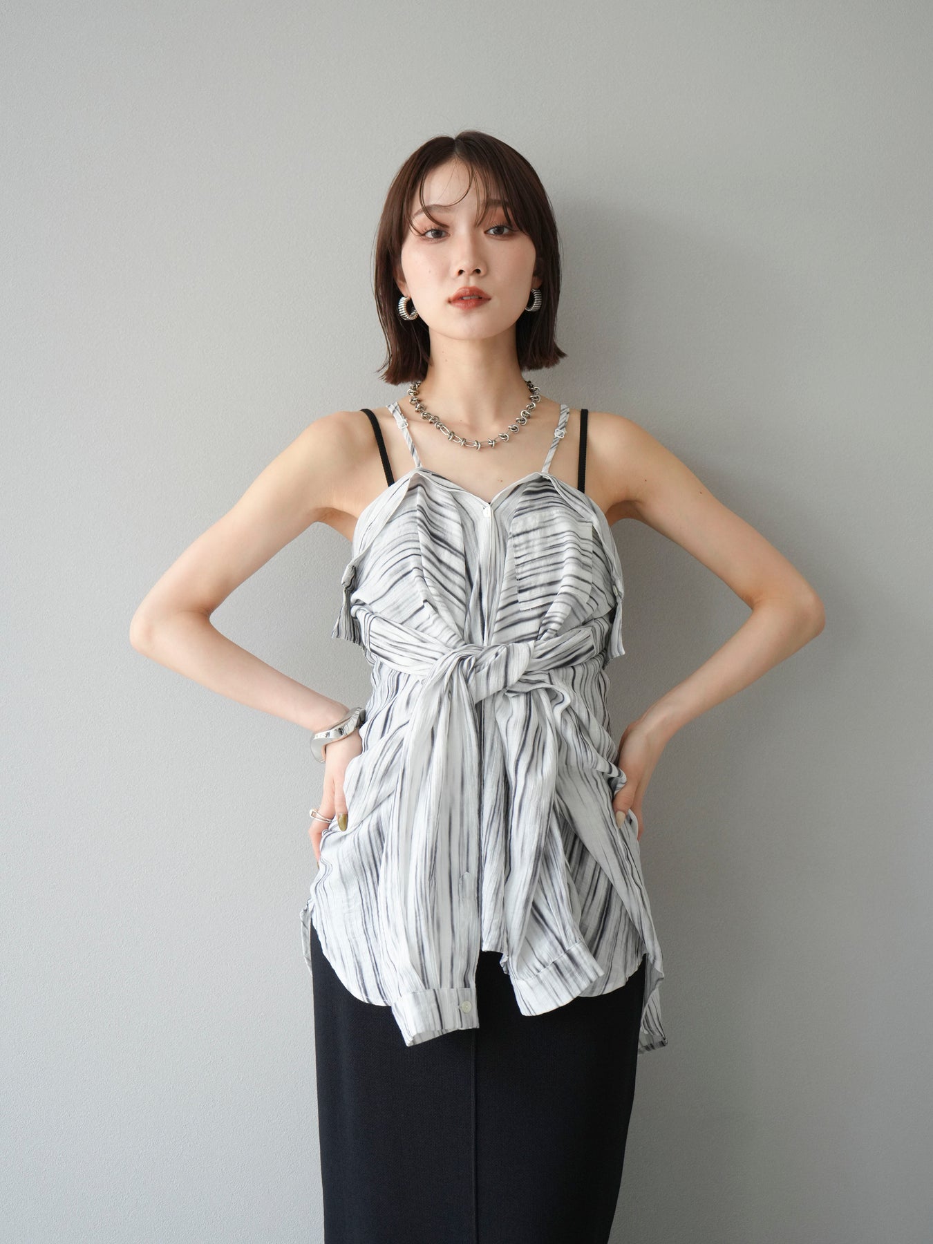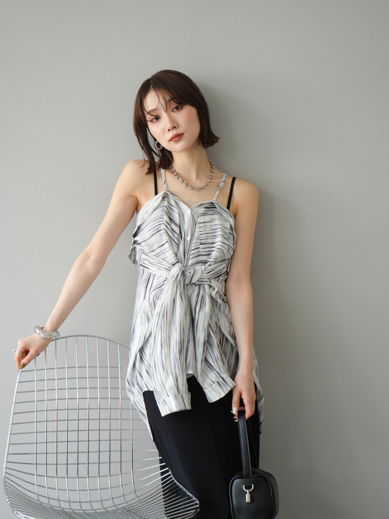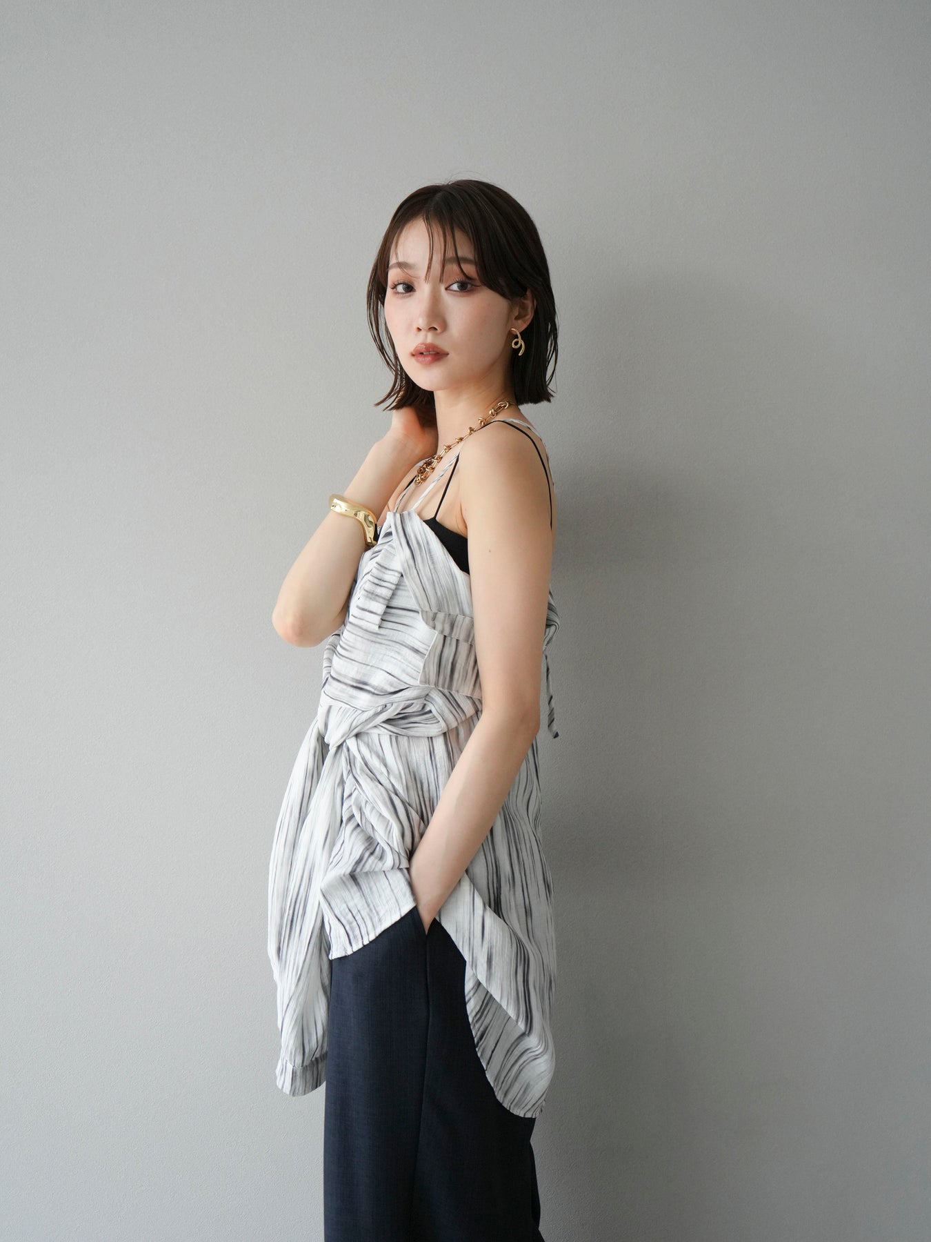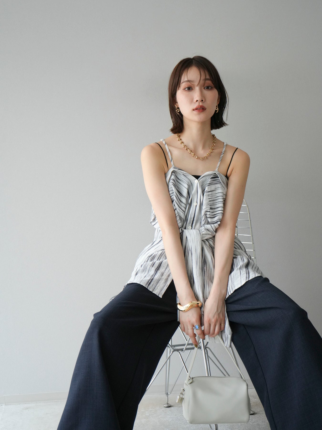 動きのあるタッチで描かれたニュアンス柄が印象的な、大人の抜け感を叶えるマルチWAYオーバーシャツ。 軽やかでさらりとした素材感が涼しげで、これからの季節にぴったりの一枚です。 ボタンを閉じてブラウスとして、前開きで羽織として、ウエストマークでメリハリのあるシルエットに── スタイリングに応じて自在に着こなせる、優秀なマルチWAYデザイン。 細ストラップやキャミソールとのレイヤードで華奢見え効果もアップ。 同柄のパンツや無地ボトムスと合わせることで、モードにもナチュラルにも対応可能です。