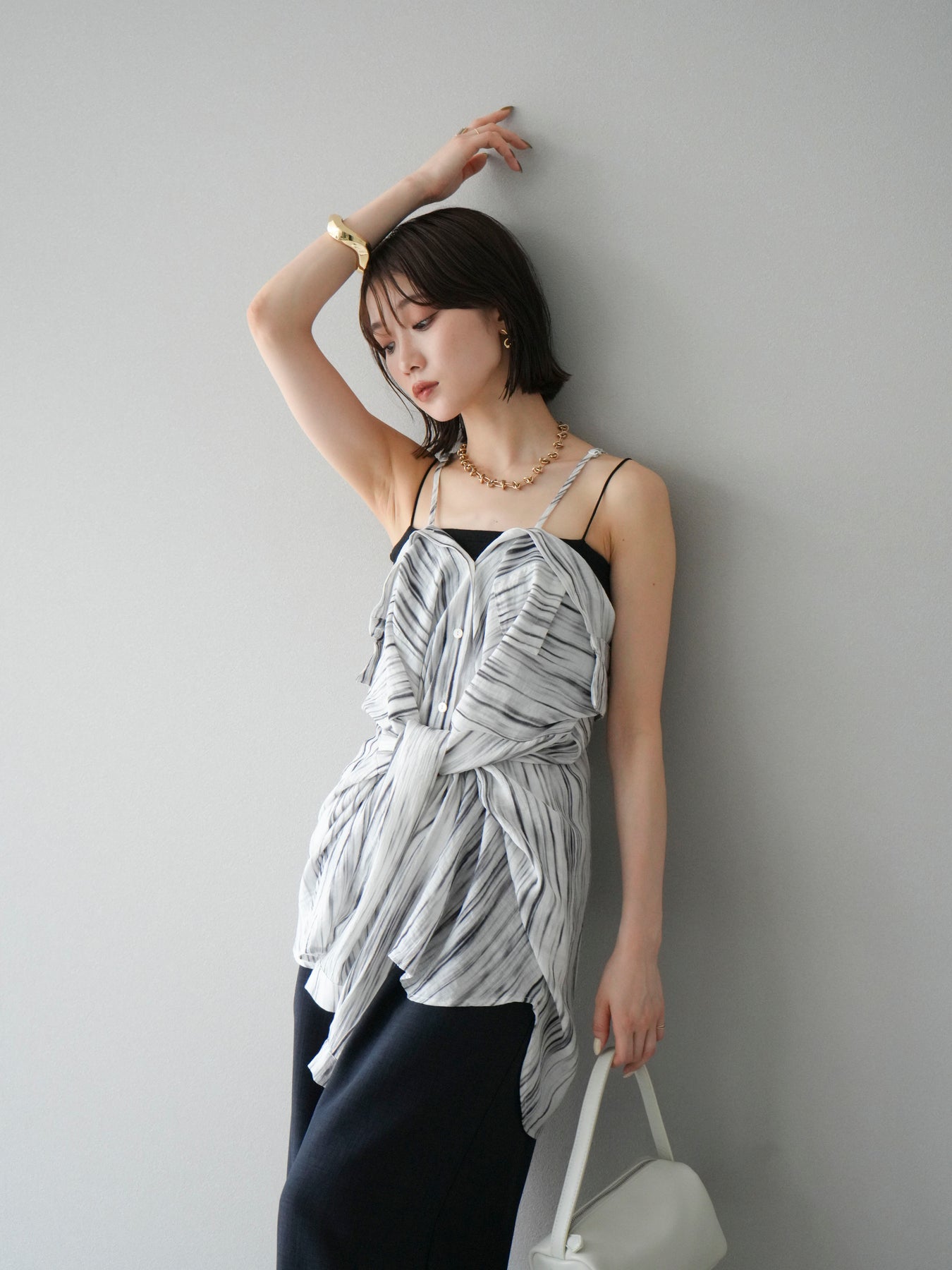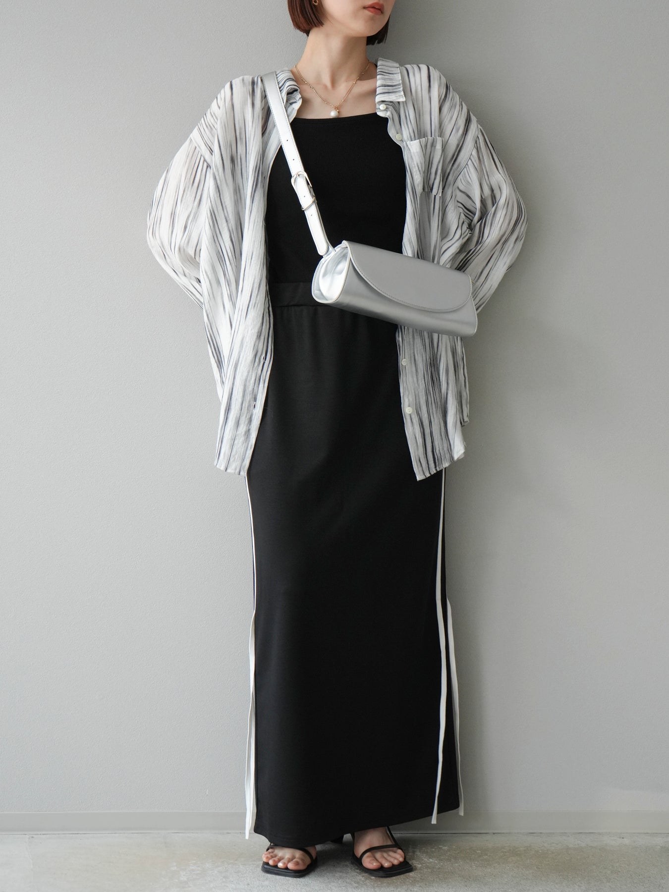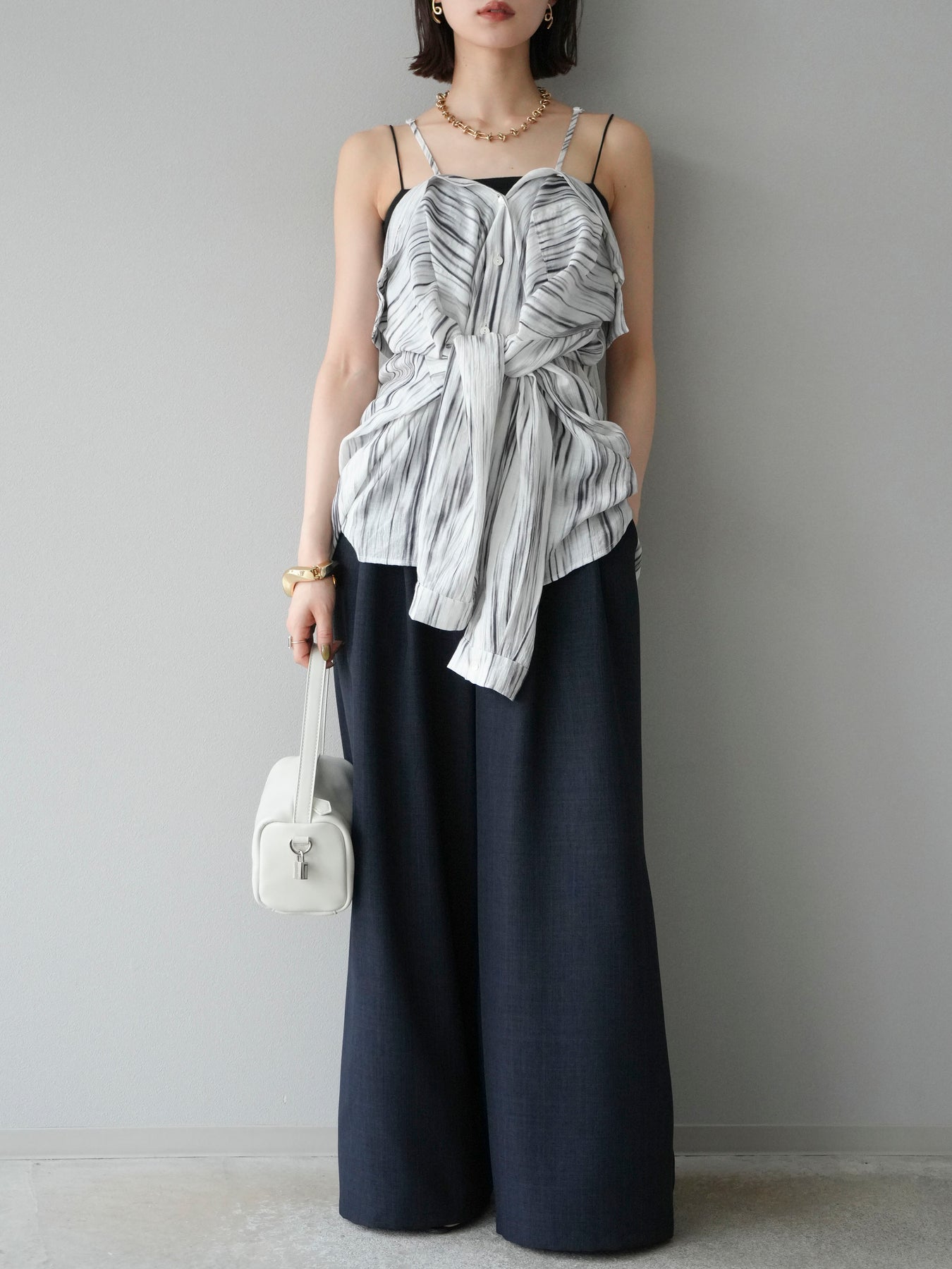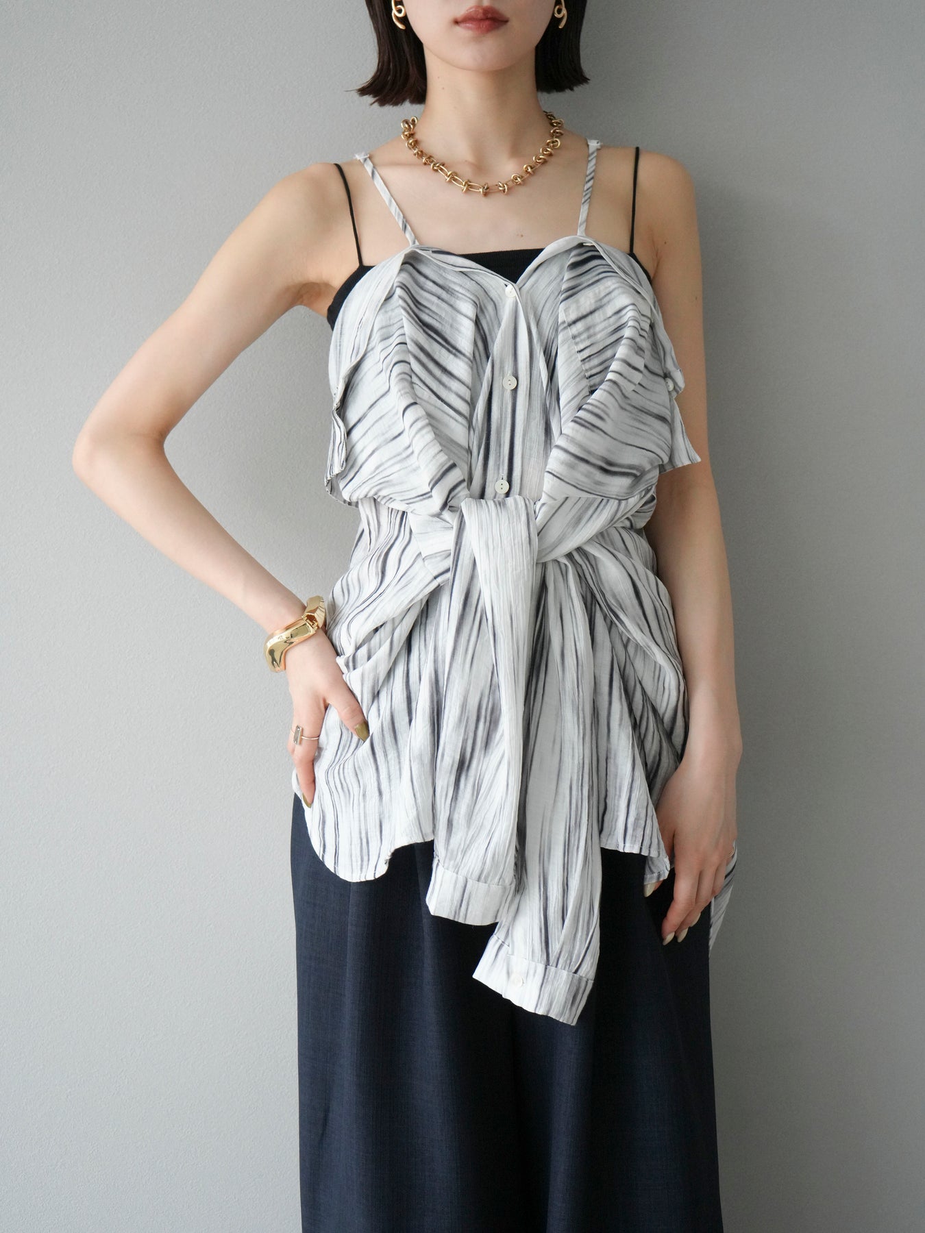 動きのあるタッチで描かれたニュアンス柄が印象的な、大人の抜け感を叶えるマルチWAYオーバーシャツ。 軽やかでさらりとした素材感が涼しげで、これからの季節にぴったりの一枚です。 ボタンを閉じてブラウスとして、前開きで羽織として、ウエストマークでメリハリのあるシルエットに── スタイリングに応じて自在に着こなせる、優秀なマルチWAYデザイン。 細ストラップやキャミソールとのレイヤードで華奢見え効果もアップ。 同柄のパンツや無地ボトムスと合わせることで、モードにもナチュラルにも対応可能です。