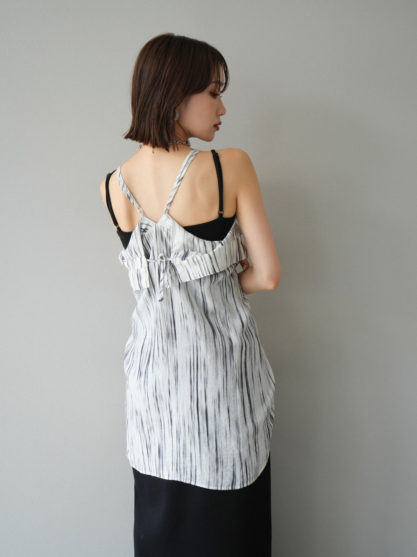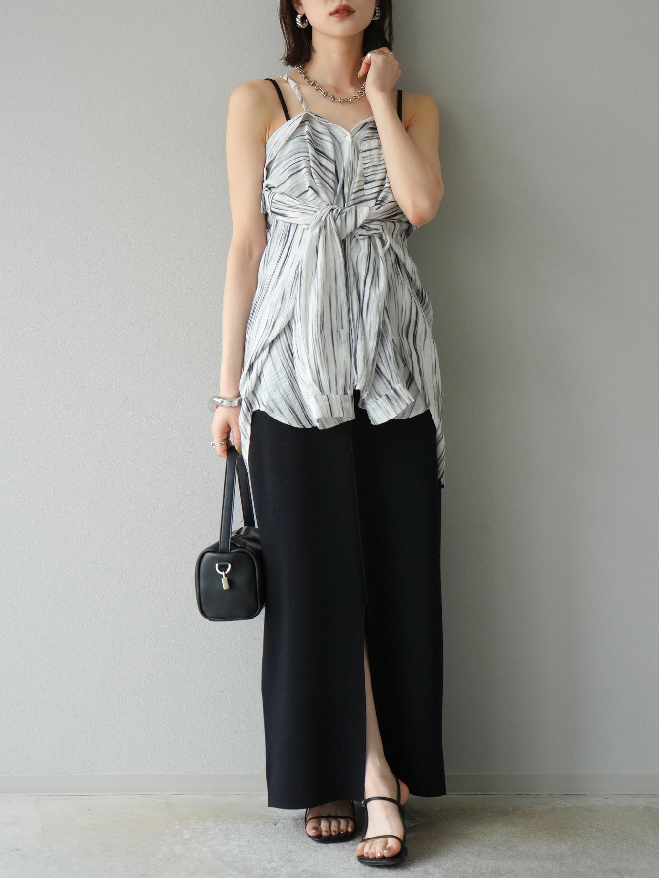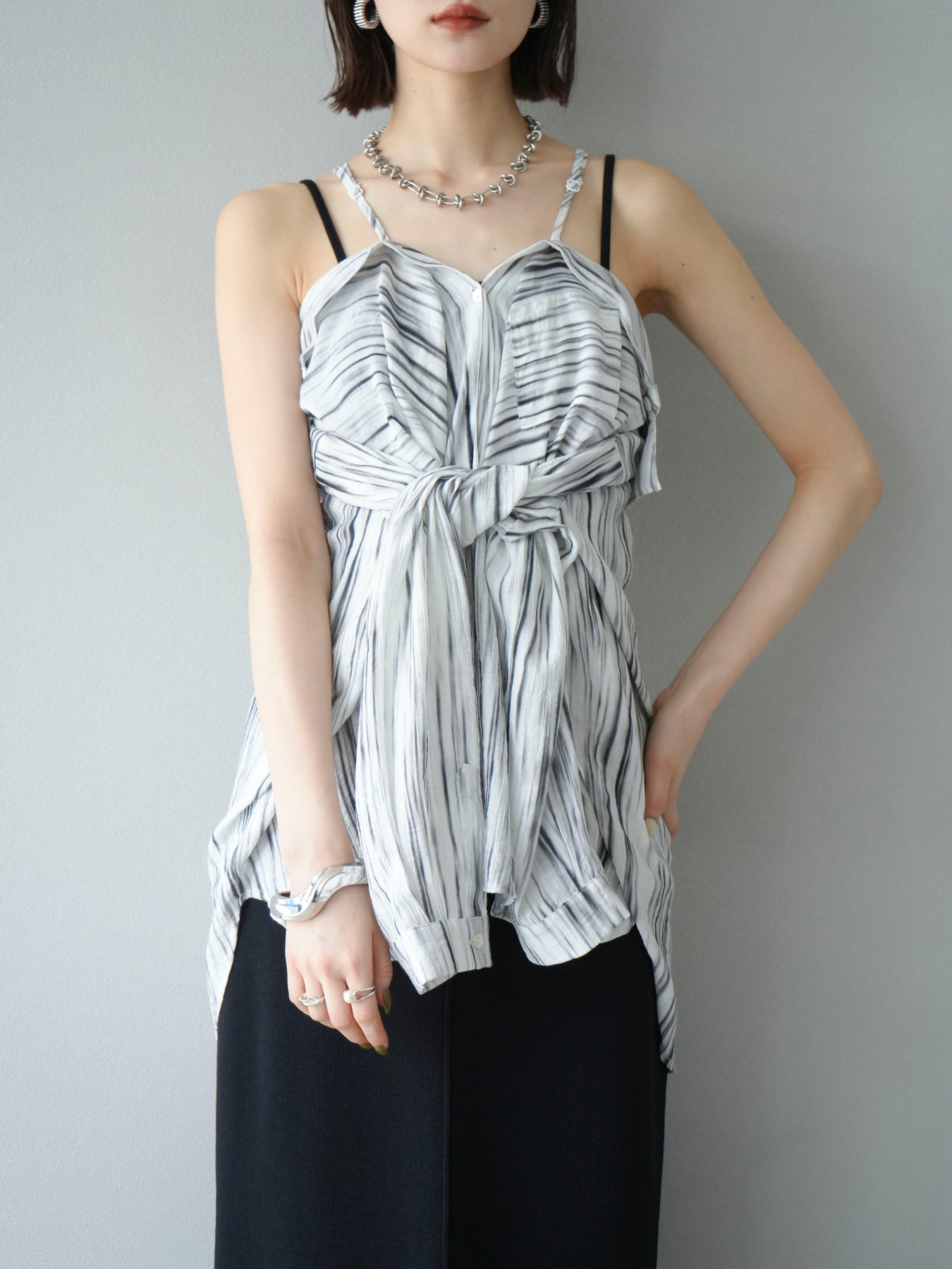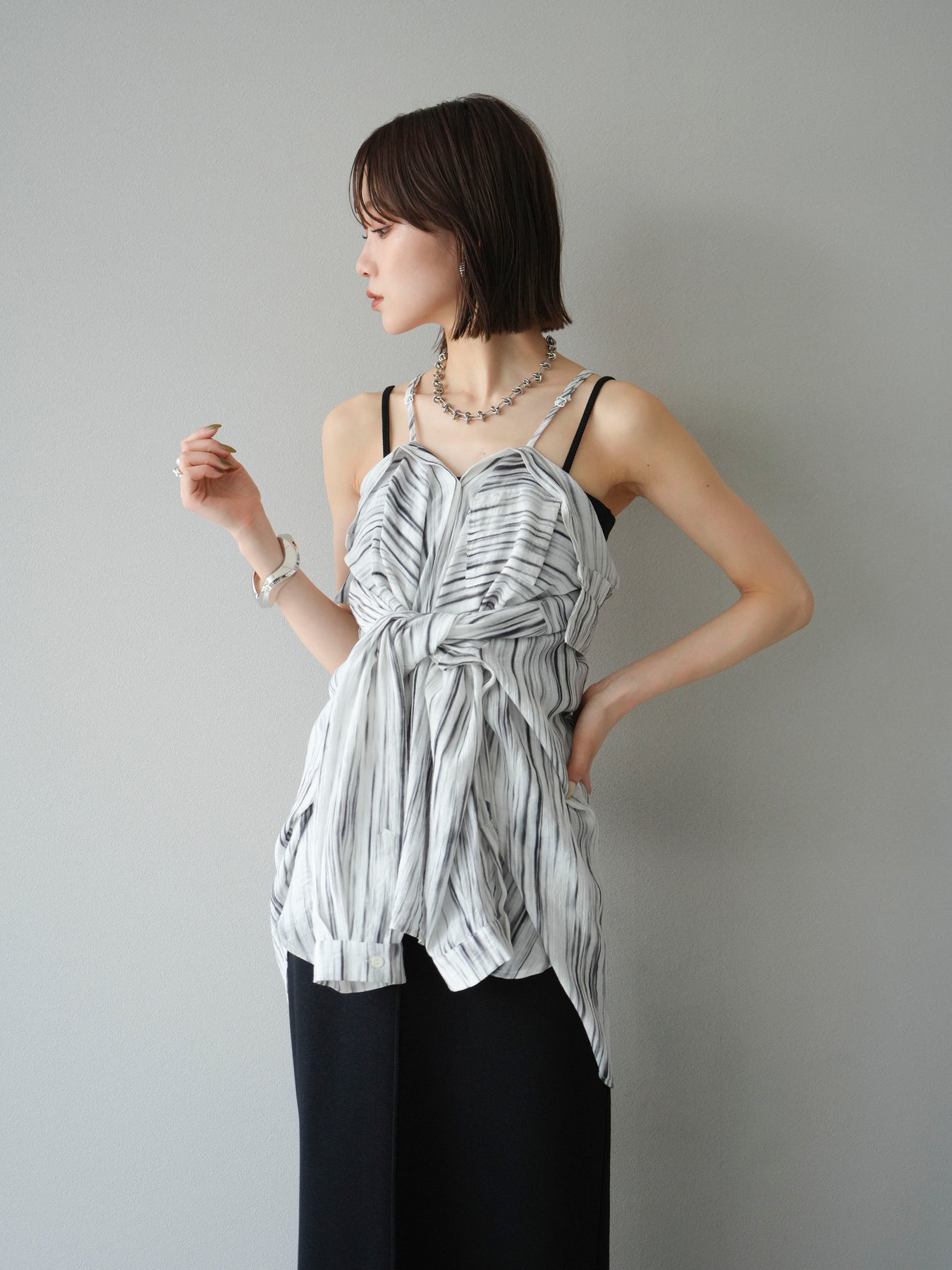 動きのあるタッチで描かれたニュアンス柄が印象的な、大人の抜け感を叶えるマルチWAYオーバーシャツ。 軽やかでさらりとした素材感が涼しげで、これからの季節にぴったりの一枚です。 ボタンを閉じてブラウスとして、前開きで羽織として、ウエストマークでメリハリのあるシルエットに── スタイリングに応じて自在に着こなせる、優秀なマルチWAYデザイン。 細ストラップやキャミソールとのレイヤードで華奢見え効果もアップ。 同柄のパンツや無地ボトムスと合わせることで、モードにもナチュラルにも対応可能です。