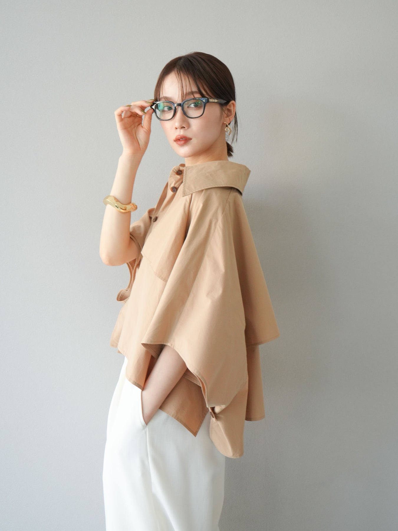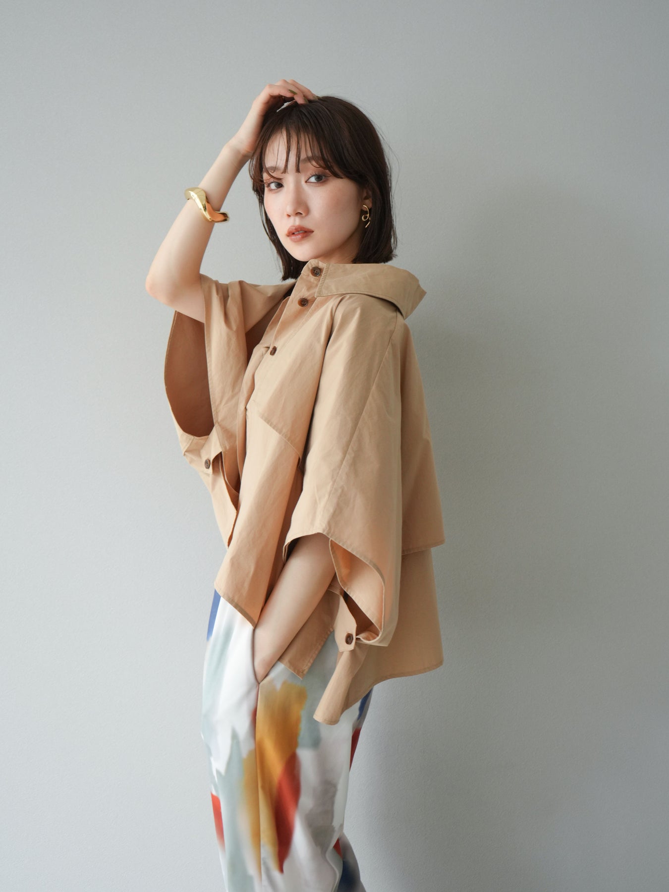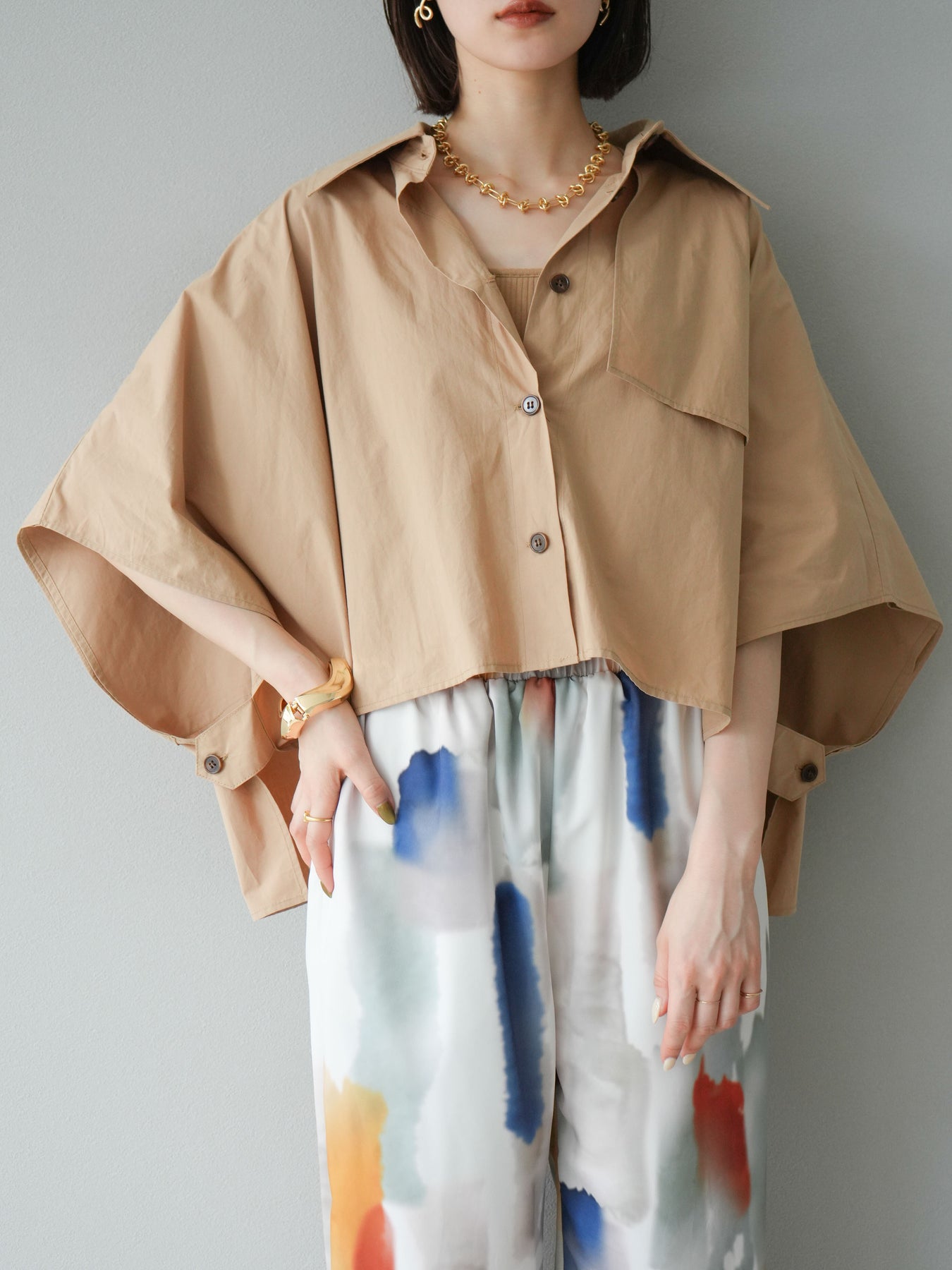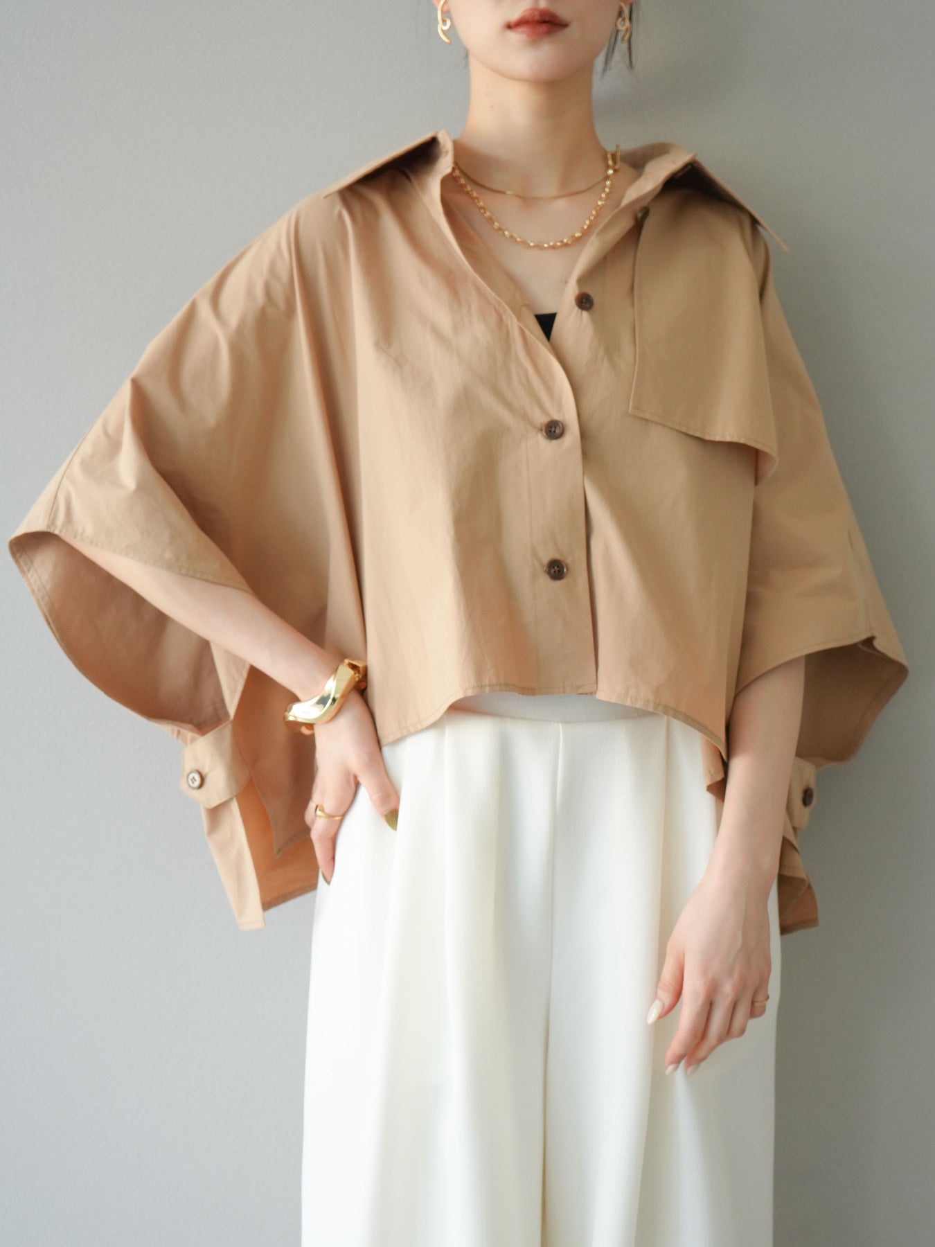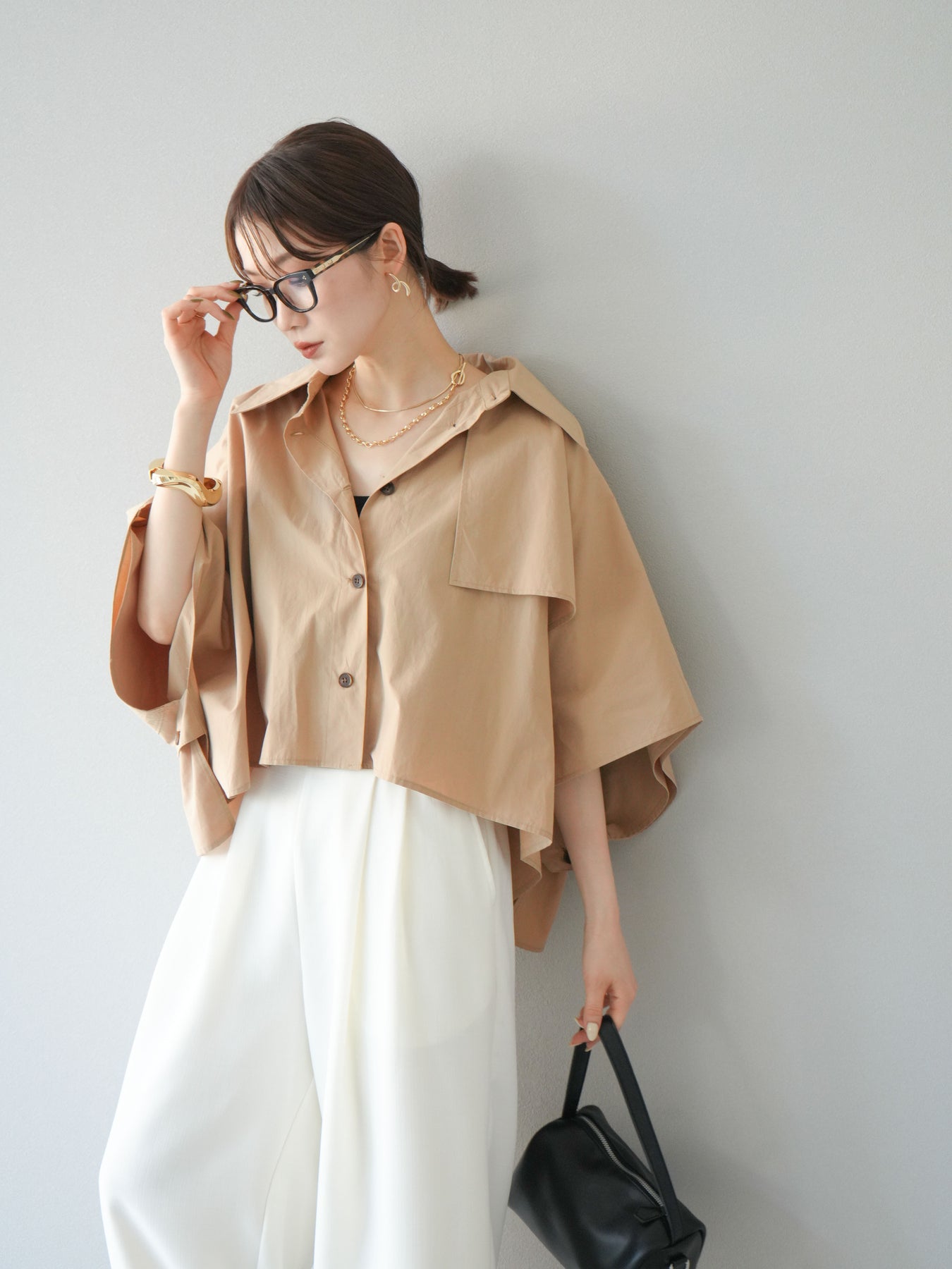洗練されたシルエットが魅力の、ポンチョライクなショート丈シャツ。 身幅にゆとりを持たせたワイドシルエットと、構築的なデザインがスタイリングにモードな印象を与えてくれます。 風を通す軽やかな素材感と、抜け感のあるドロップショルダーがこなれた雰囲気を演出。 ショート丈ながら前後差のあるヘムラインで、ハイウエストボトムやワンピースとの相性も抜群です。 一枚で主役としても、タンクやキャミとのレイヤードで羽織りとしても活躍。 モードにもカジュアルにも着まわせる、夏の新定番シャツです