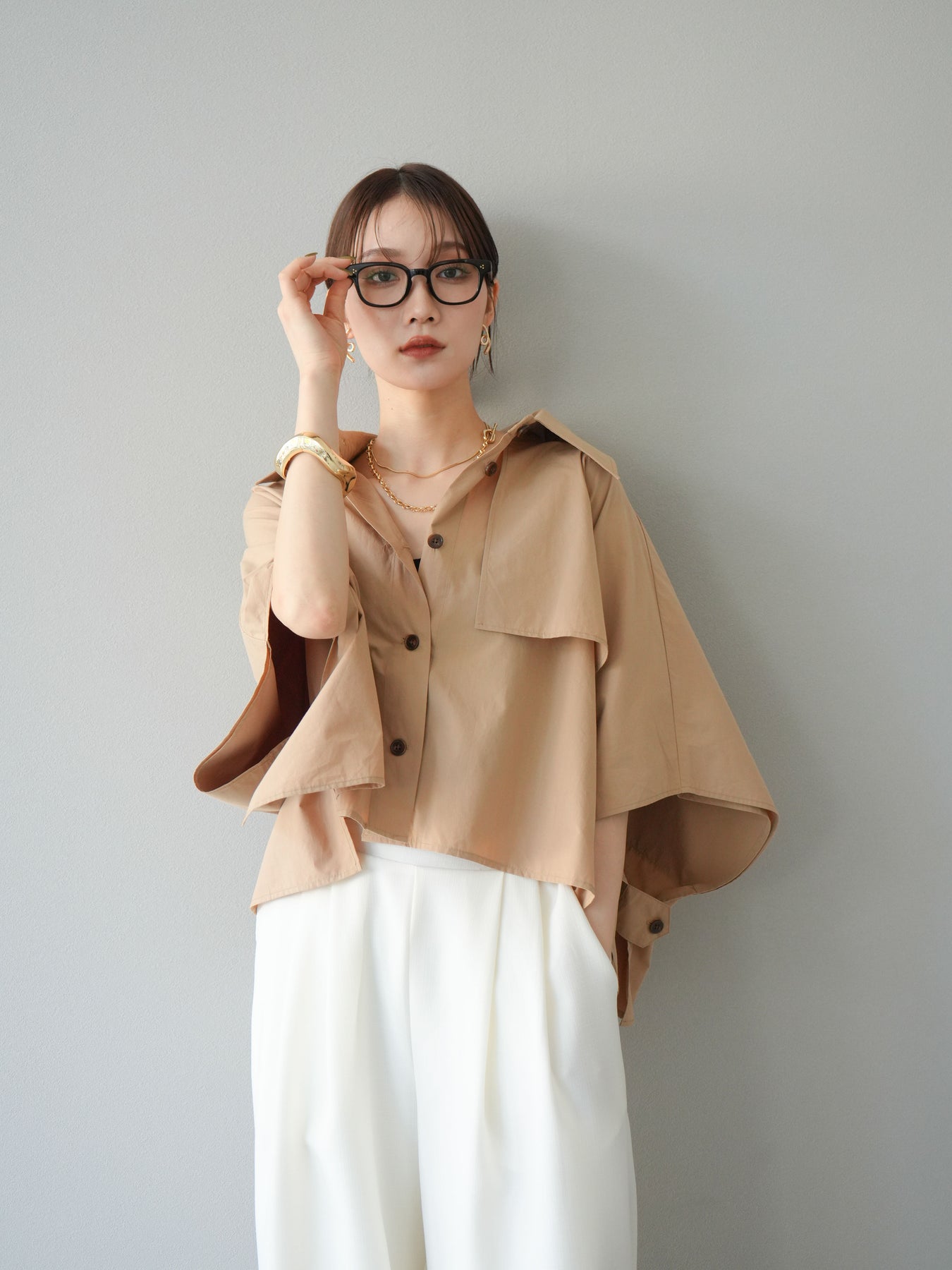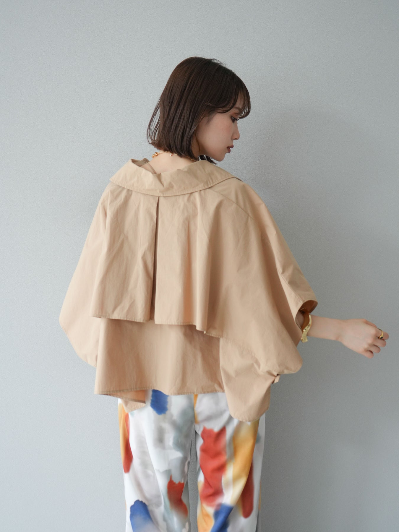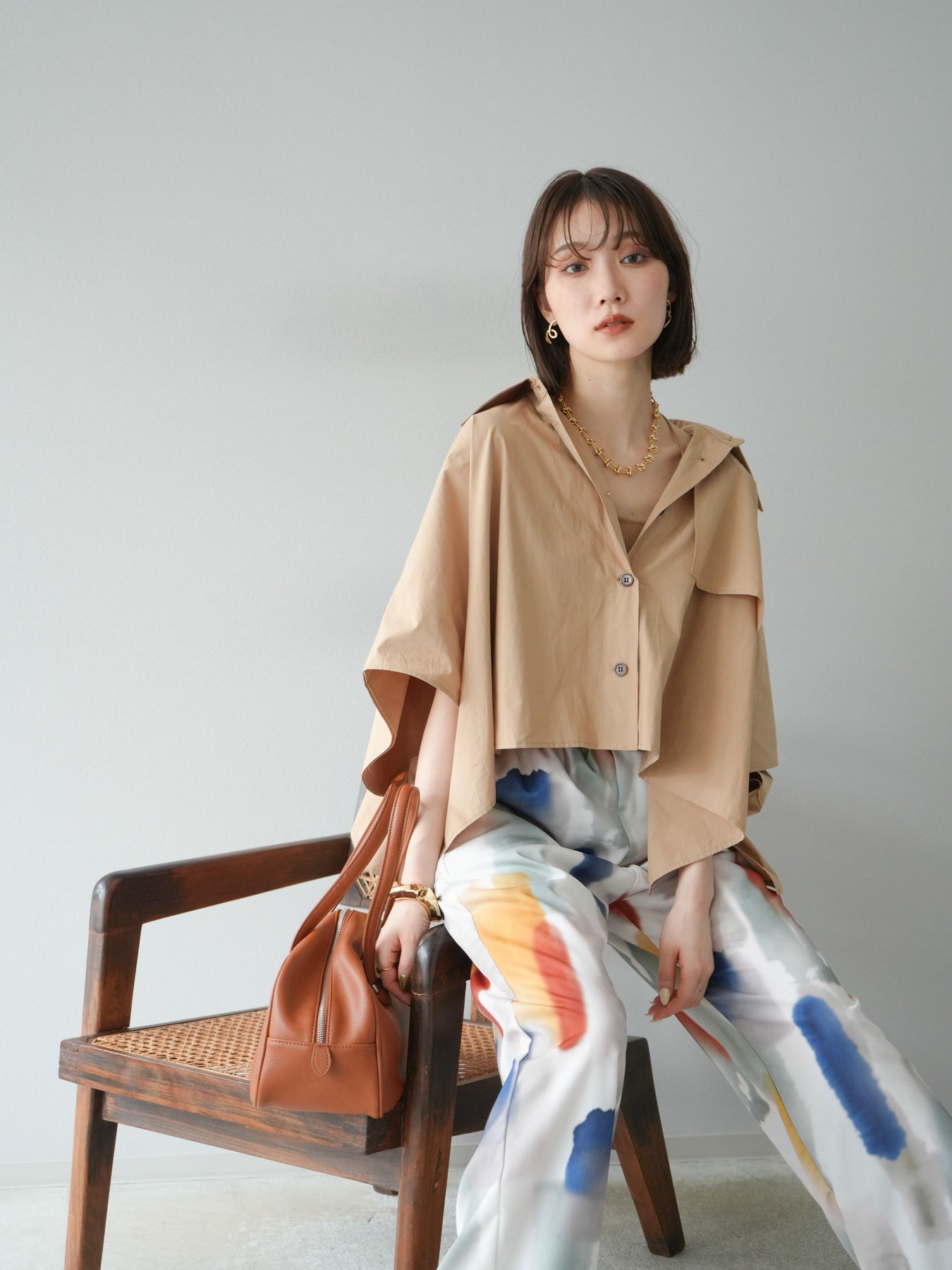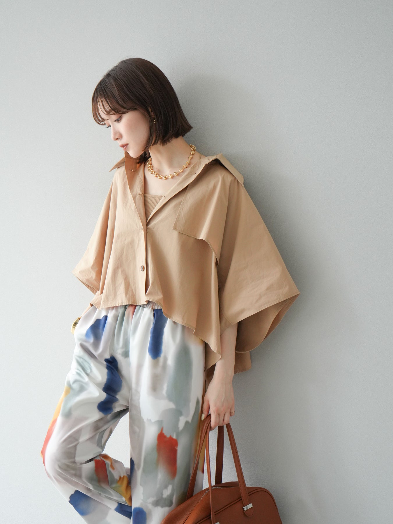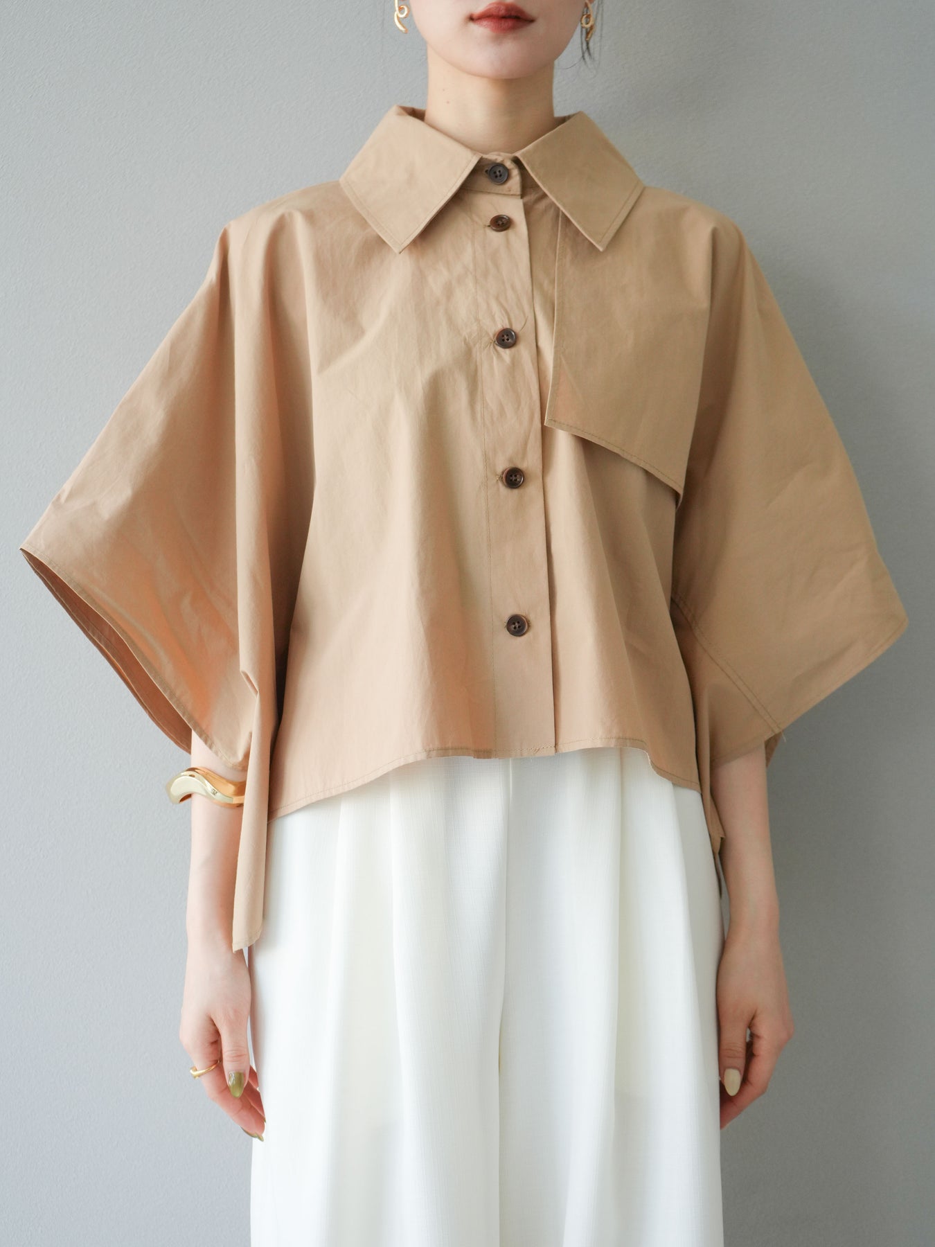 洗練されたシルエットが魅力の、ポンチョライクなショート丈シャツ。 身幅にゆとりを持たせたワイドシルエットと、構築的なデザインがスタイリングにモードな印象を与えてくれます。 風を通す軽やかな素材感と、抜け感のあるドロップショルダーがこなれた雰囲気を演出。 ショート丈ながら前後差のあるヘムラインで、ハイウエストボトムやワンピースとの相性も抜群です。 一枚で主役としても、タンクやキャミとのレイヤードで羽織りとしても活躍。 モードにもカジュアルにも着まわせる、夏の新定番シャツです