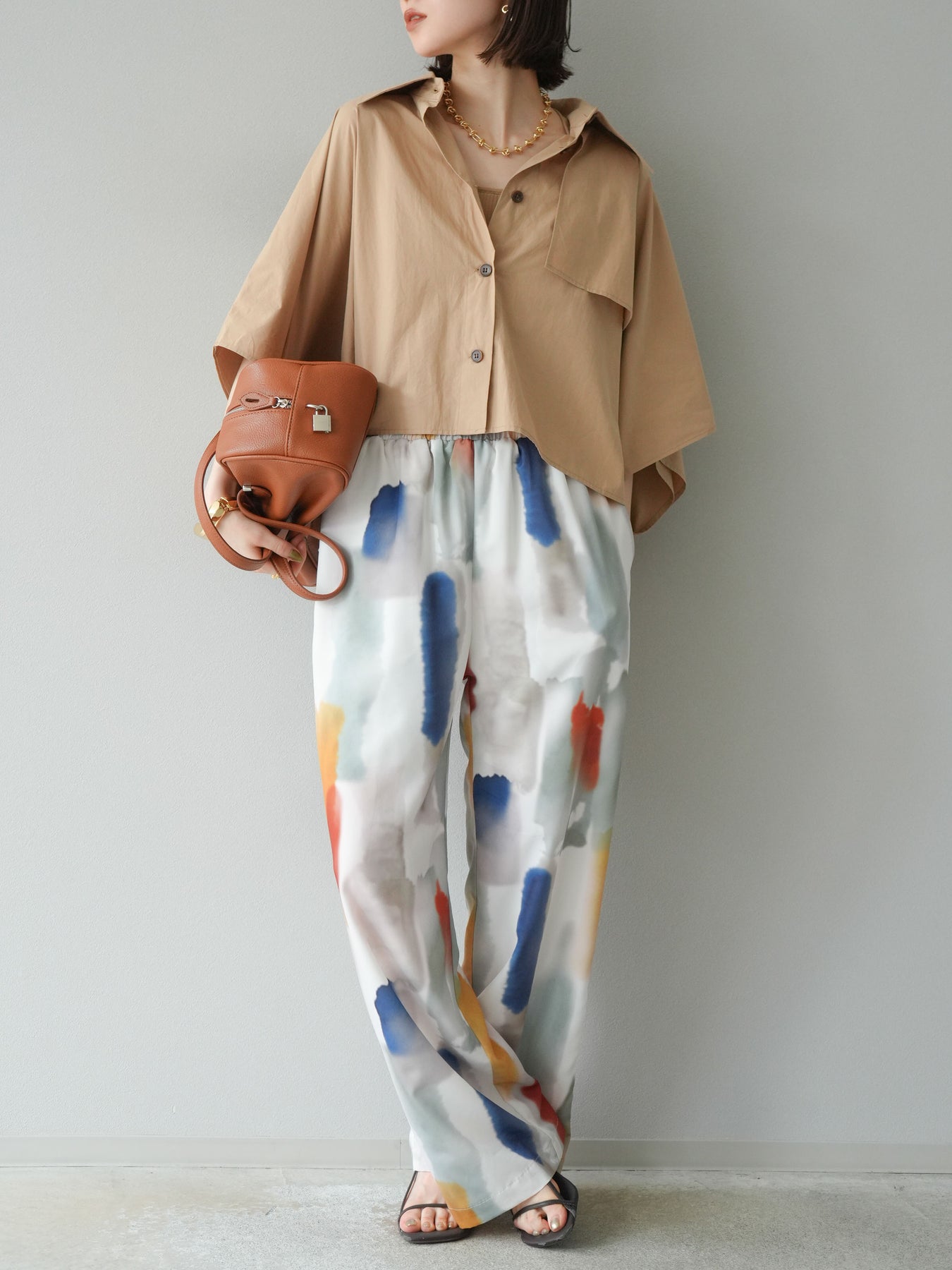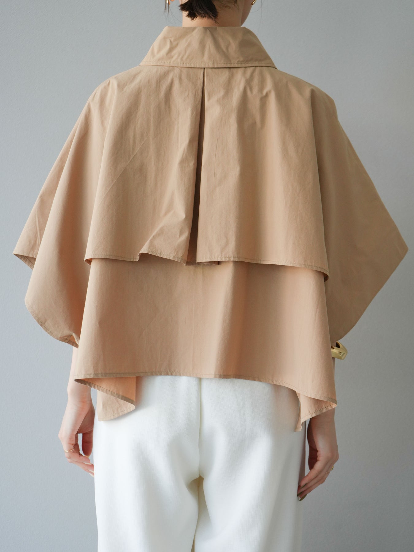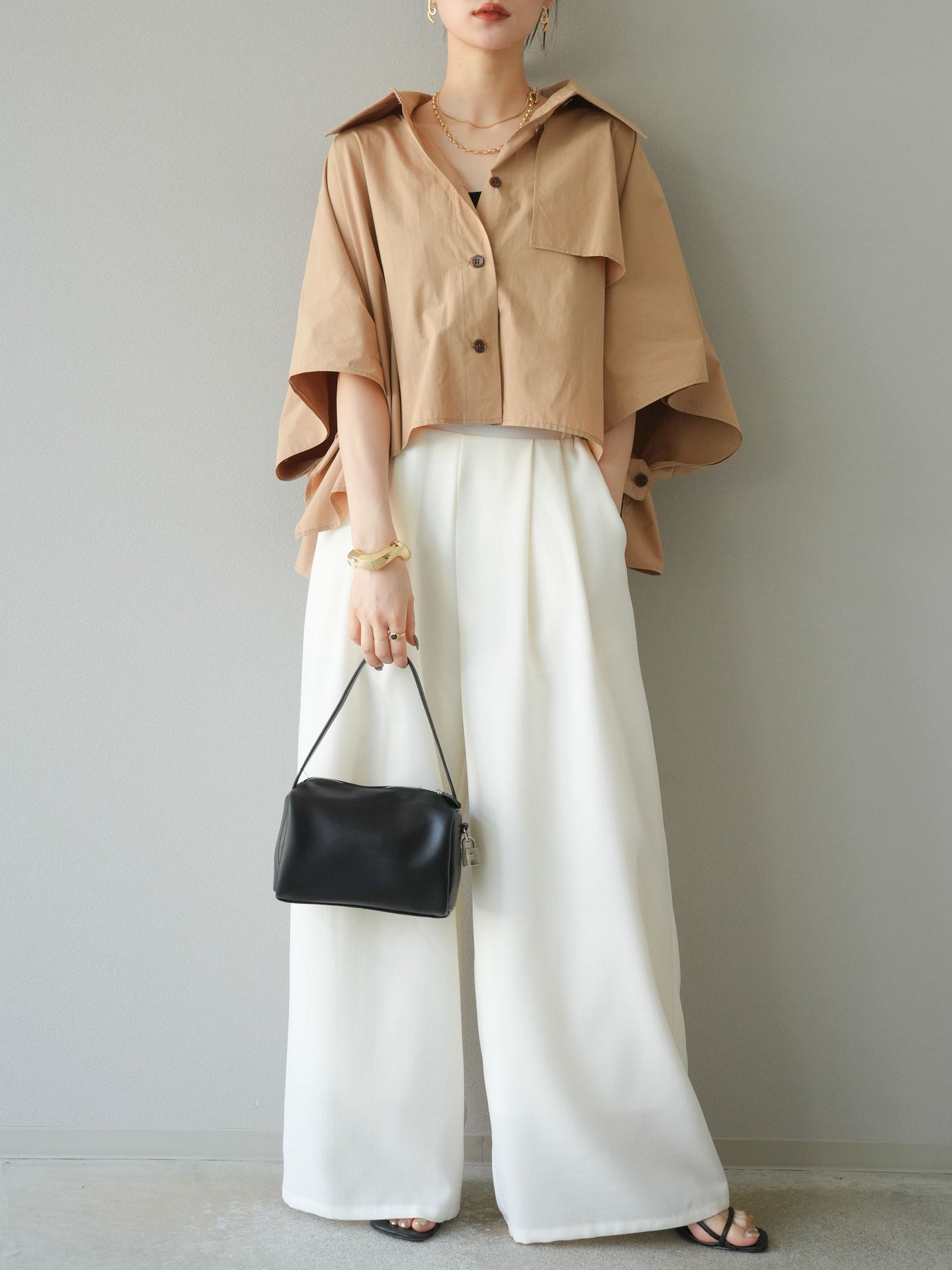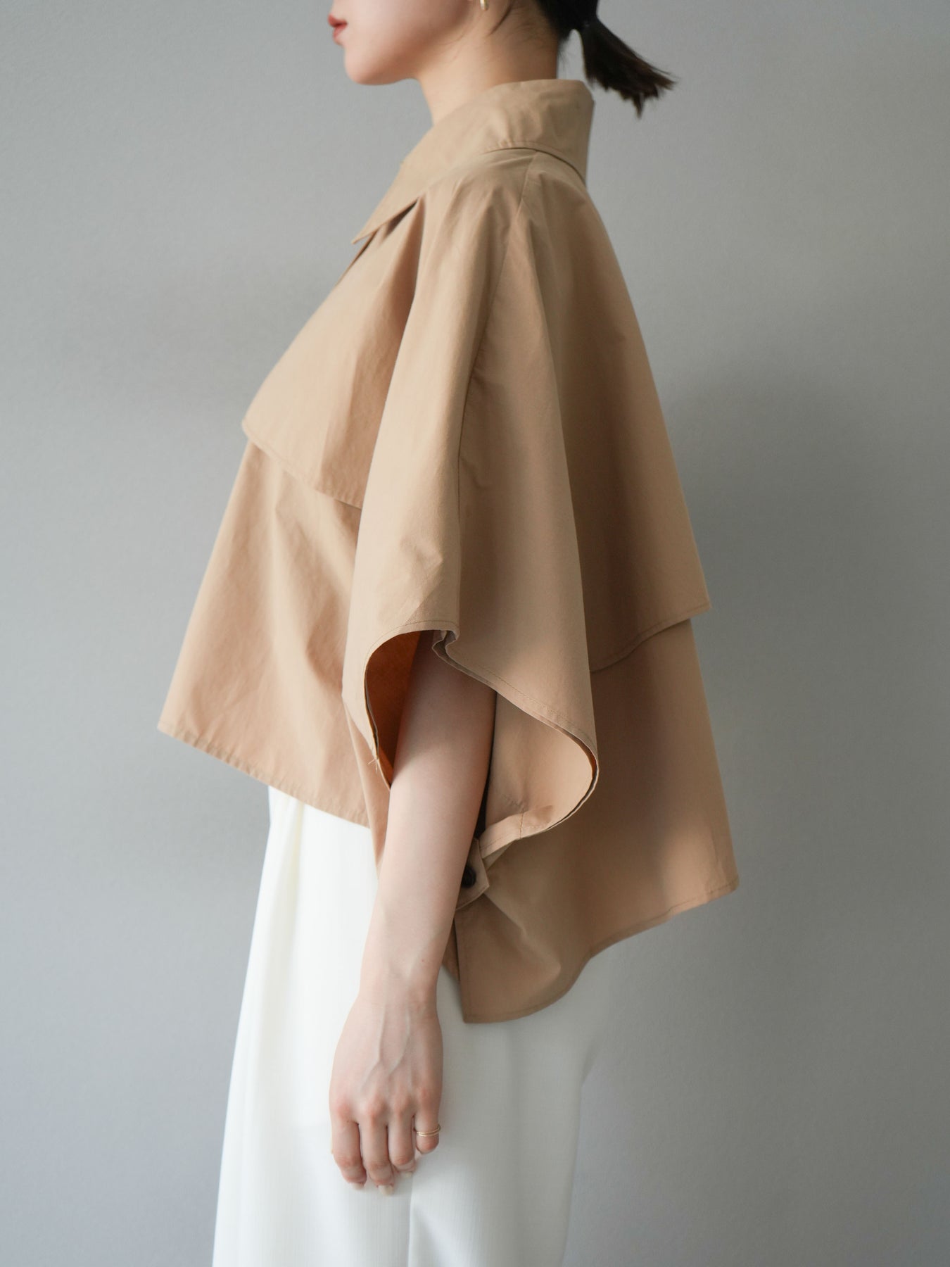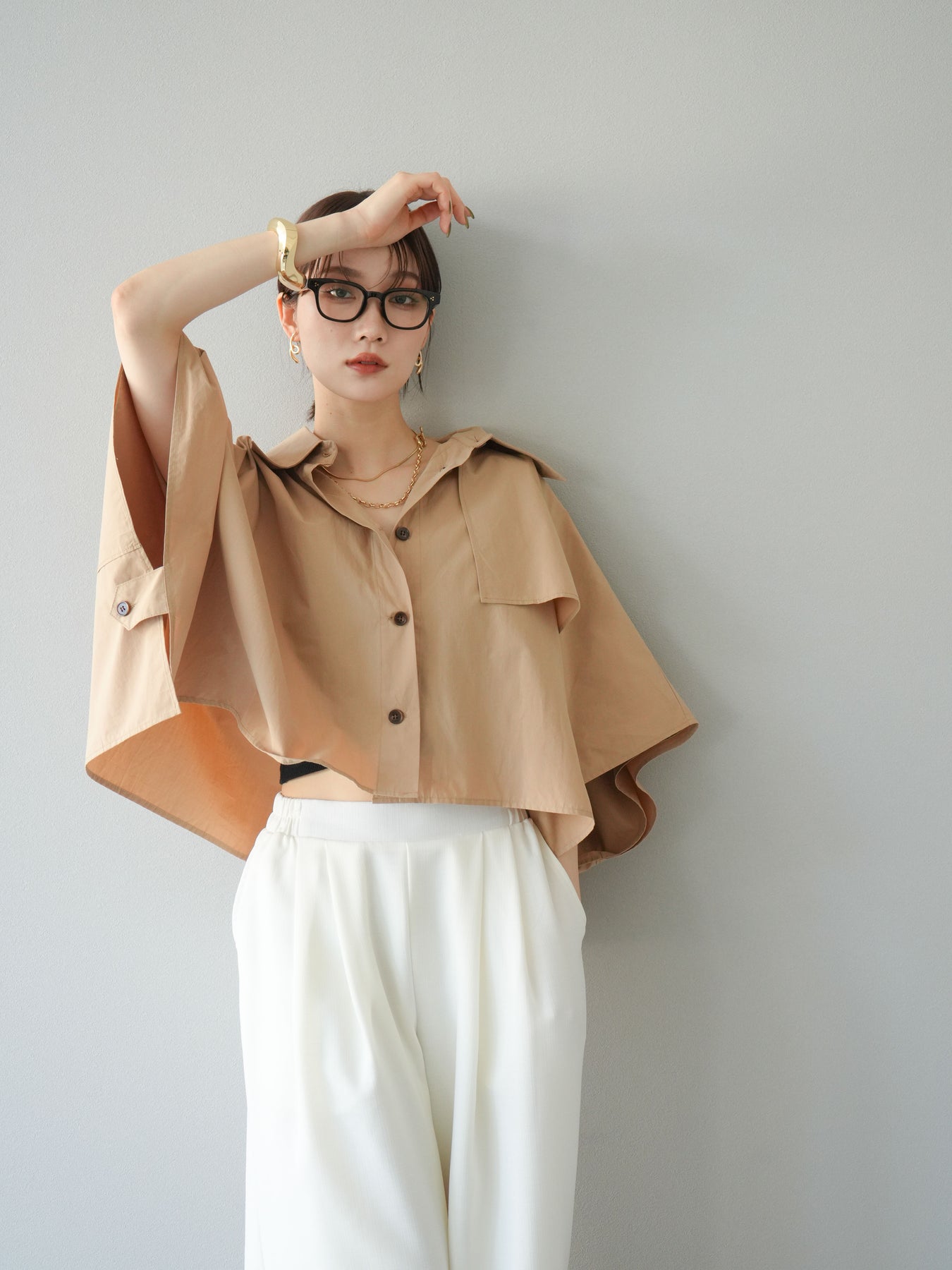 洗練されたシルエットが魅力の、ポンチョライクなショート丈シャツ。 身幅にゆとりを持たせたワイドシルエットと、構築的なデザインがスタイリングにモードな印象を与えてくれます。 風を通す軽やかな素材感と、抜け感のあるドロップショルダーがこなれた雰囲気を演出。 ショート丈ながら前後差のあるヘムラインで、ハイウエストボトムやワンピースとの相性も抜群です。 一枚で主役としても、タンクやキャミとのレイヤードで羽織りとしても活躍。 モードにもカジュアルにも着まわせる、夏の新定番シャツです