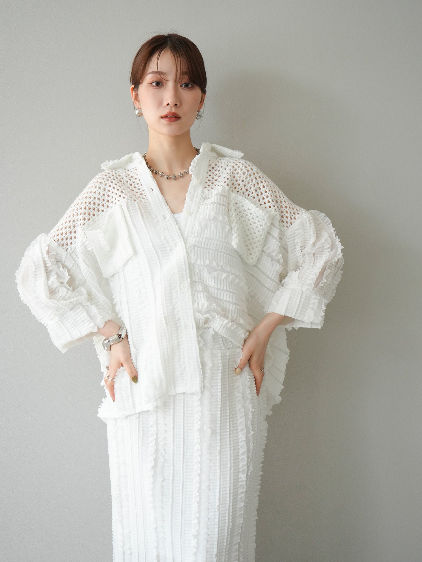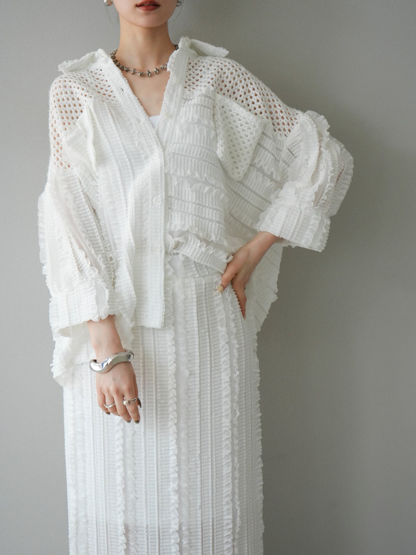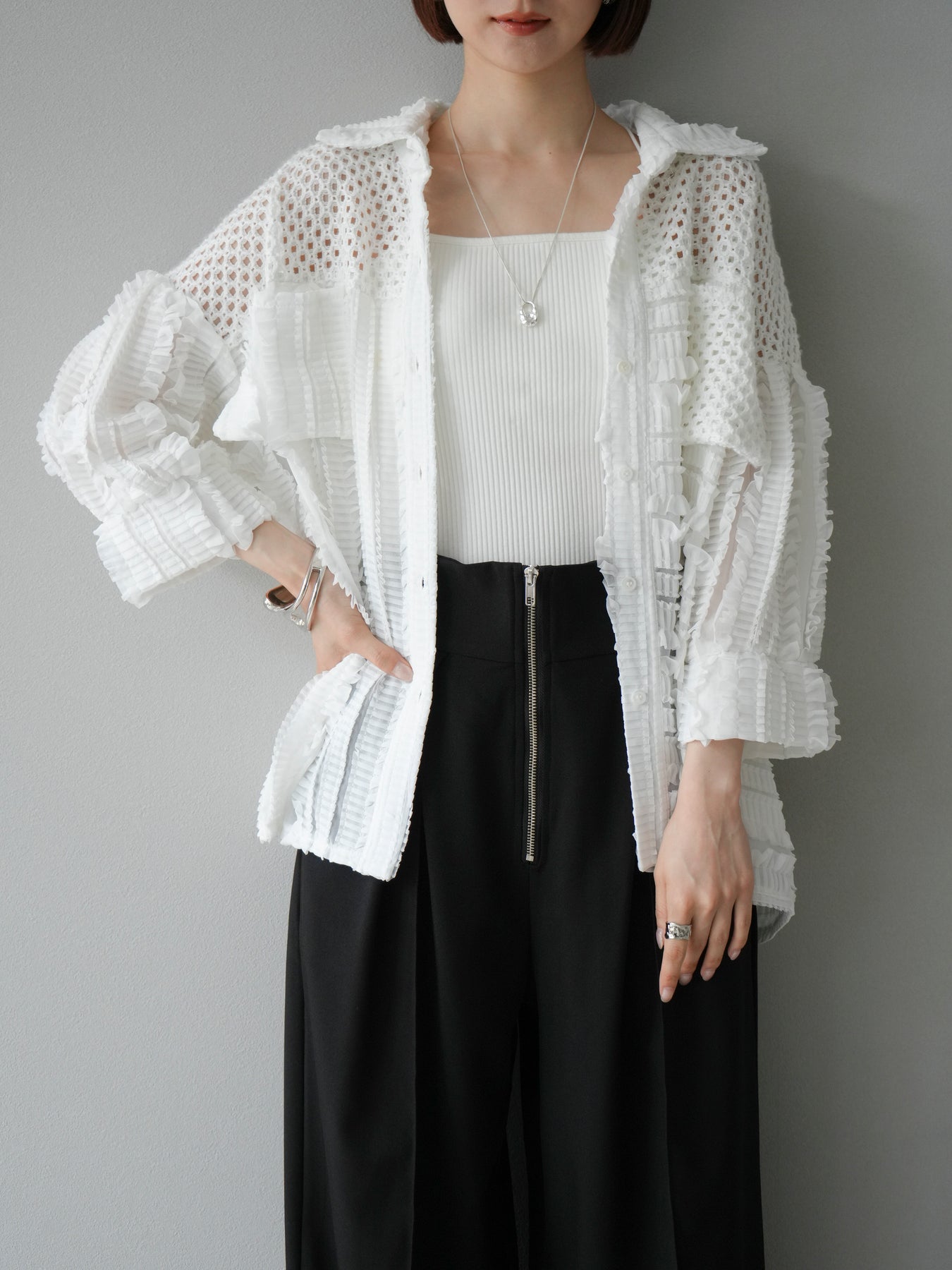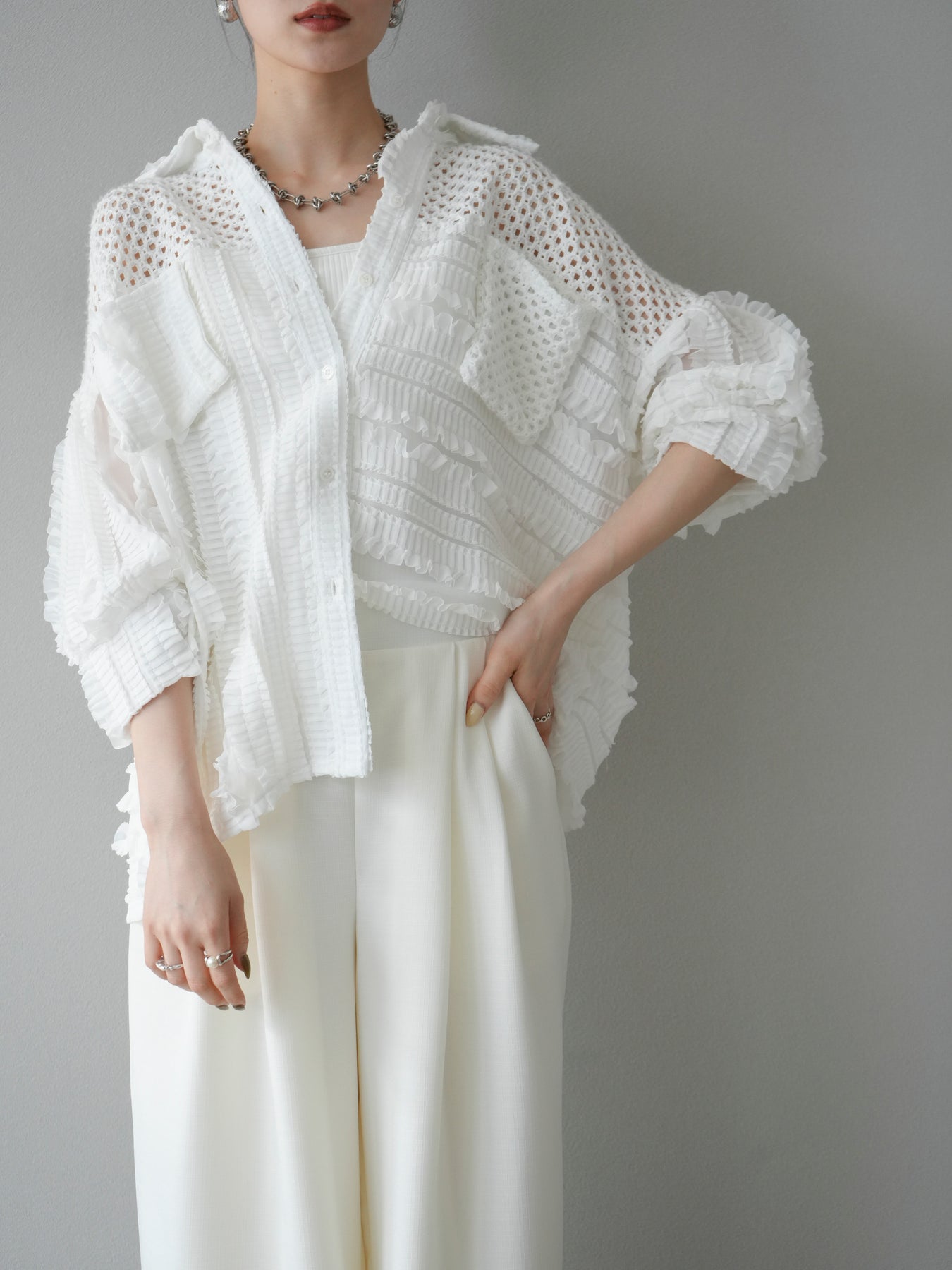 異素材を巧みに組み合わせたパッチワークデザインと、立体感のあるフリル使いが目を引くシアーシャツ。繊細な透け感と柔らかな素材が、軽やかで女性らしい印象を与えてくれます。 ゆったりとしたシルエットに、ドロップショルダーと長めの丈感が抜け感を演出。ボタンを閉じてブラウス風に、開けて羽織りとしても使える万能アイテムです。 シンプルなボトムに合わせるだけで主役になる、シーズンムードたっぷりの1枚です。 ※ボトムス、キャミソール(インナー)以外の商品は一律でインナーは付属していません。