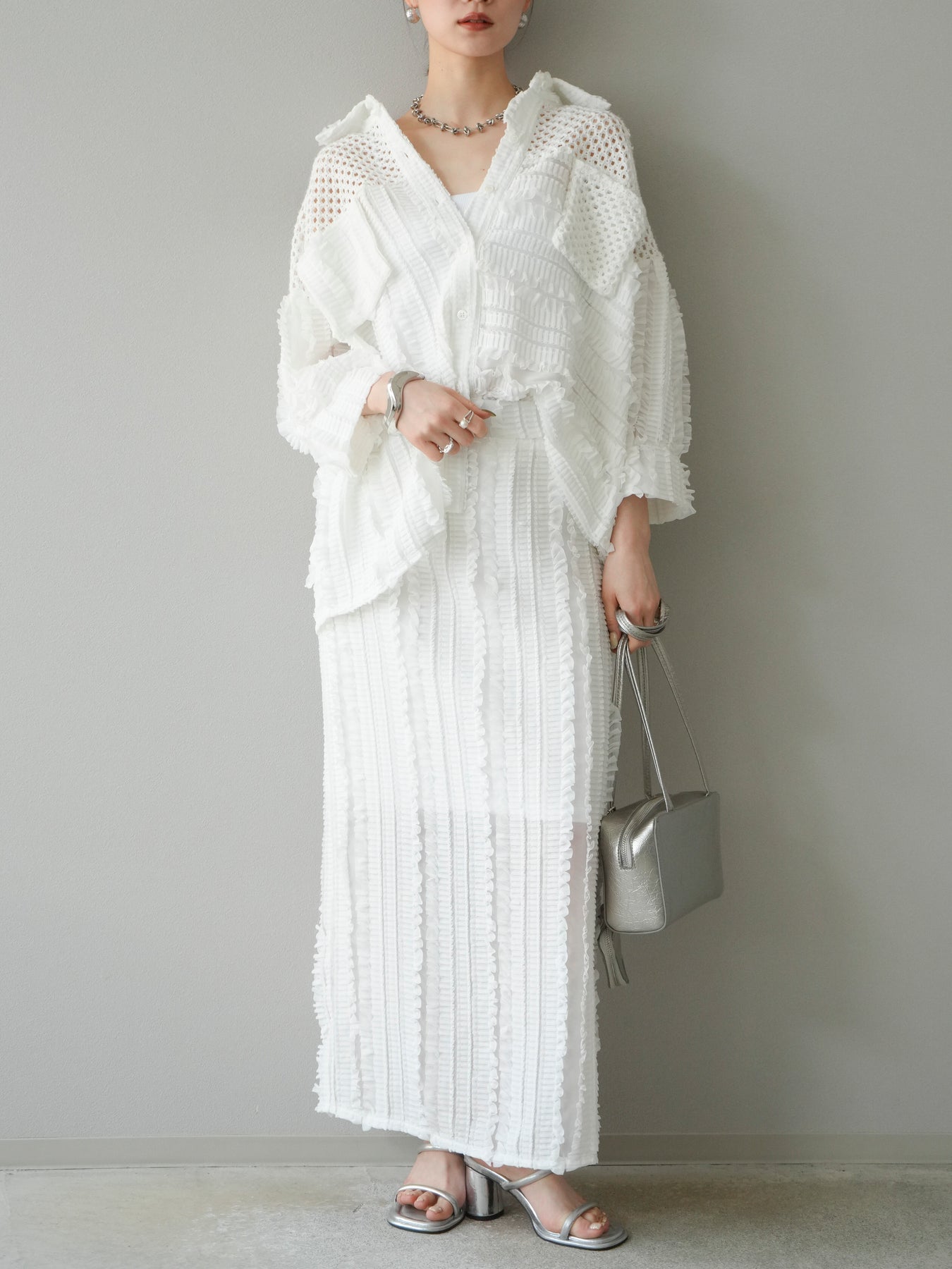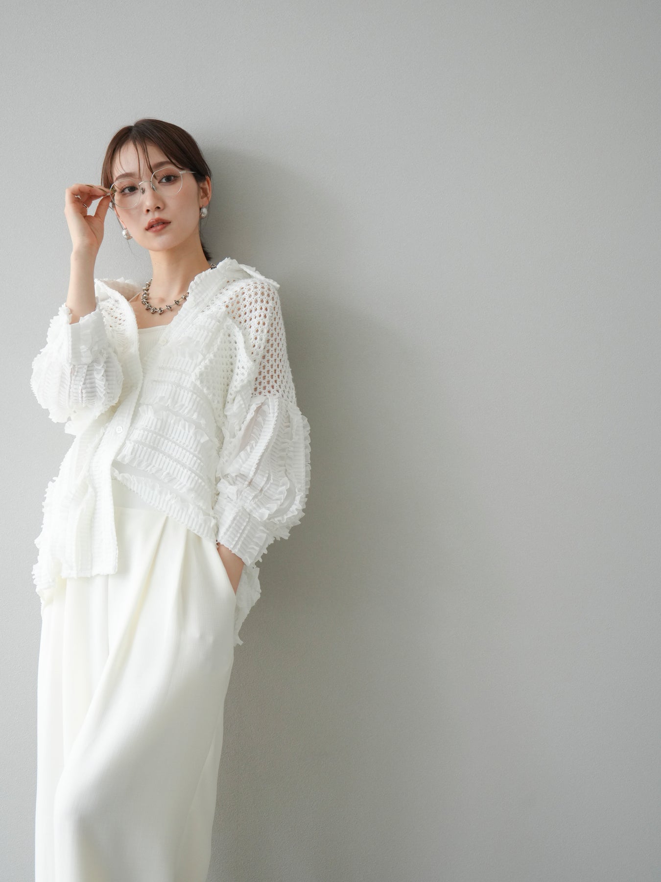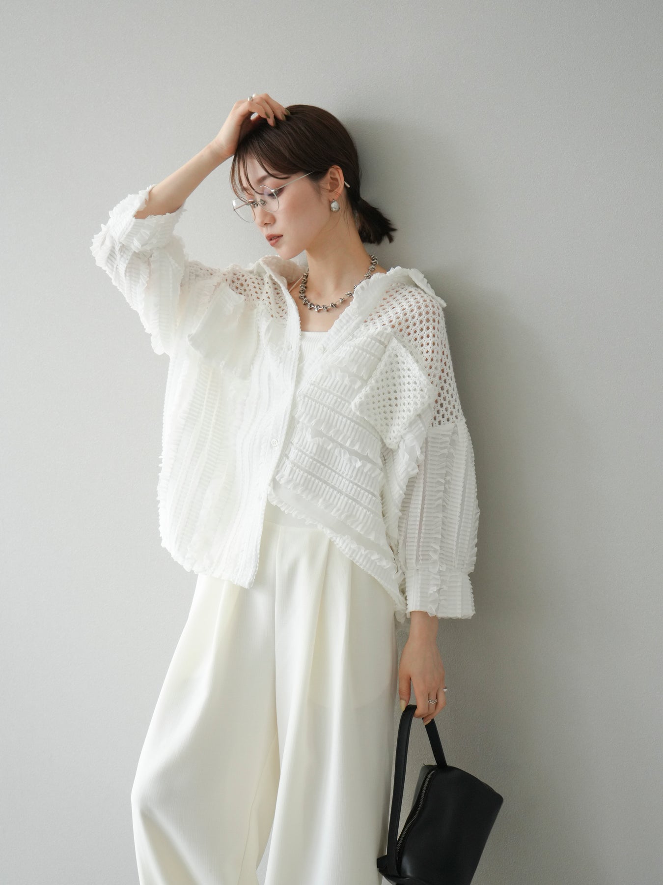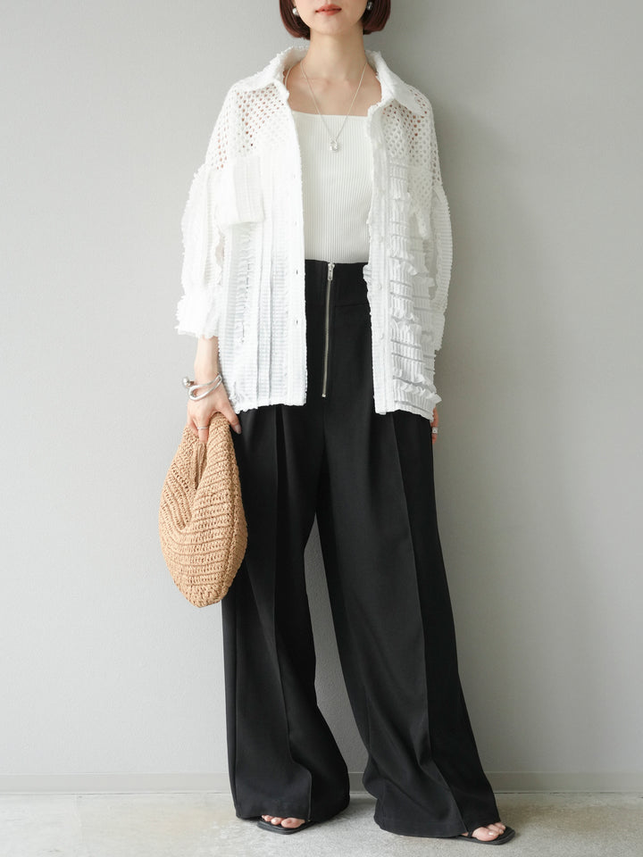 異素材を巧みに組み合わせたパッチワークデザインと、立体感のあるフリル使いが目を引くシアーシャツ。繊細な透け感と柔らかな素材が、軽やかで女性らしい印象を与えてくれます。 ゆったりとしたシルエットに、ドロップショルダーと長めの丈感が抜け感を演出。ボタンを閉じてブラウス風に、開けて羽織りとしても使える万能アイテムです。 シンプルなボトムに合わせるだけで主役になる、シーズンムードたっぷりの1枚です。 ※ボトムス、キャミソール(インナー)以外の商品は一律でインナーは付属していません。