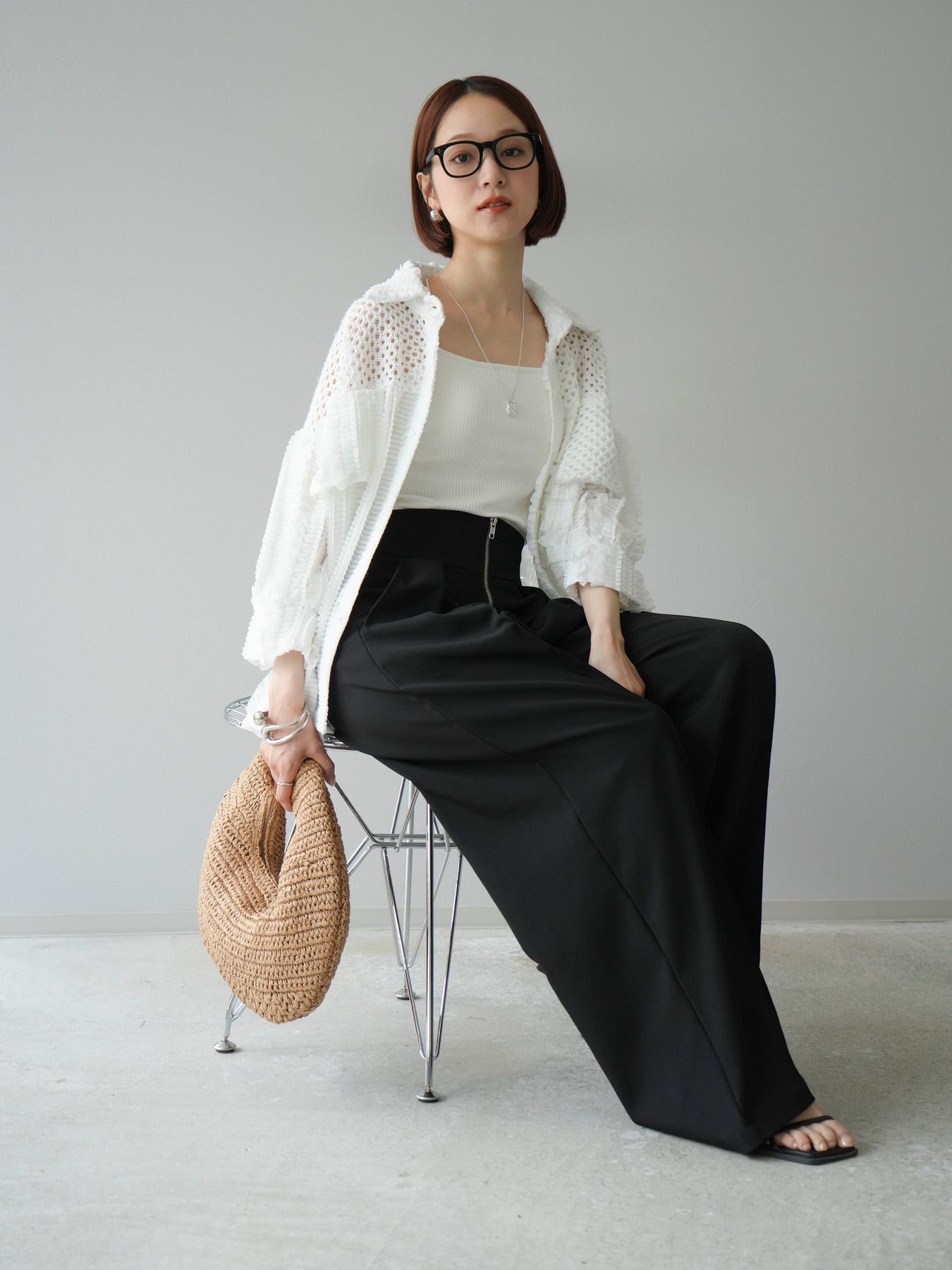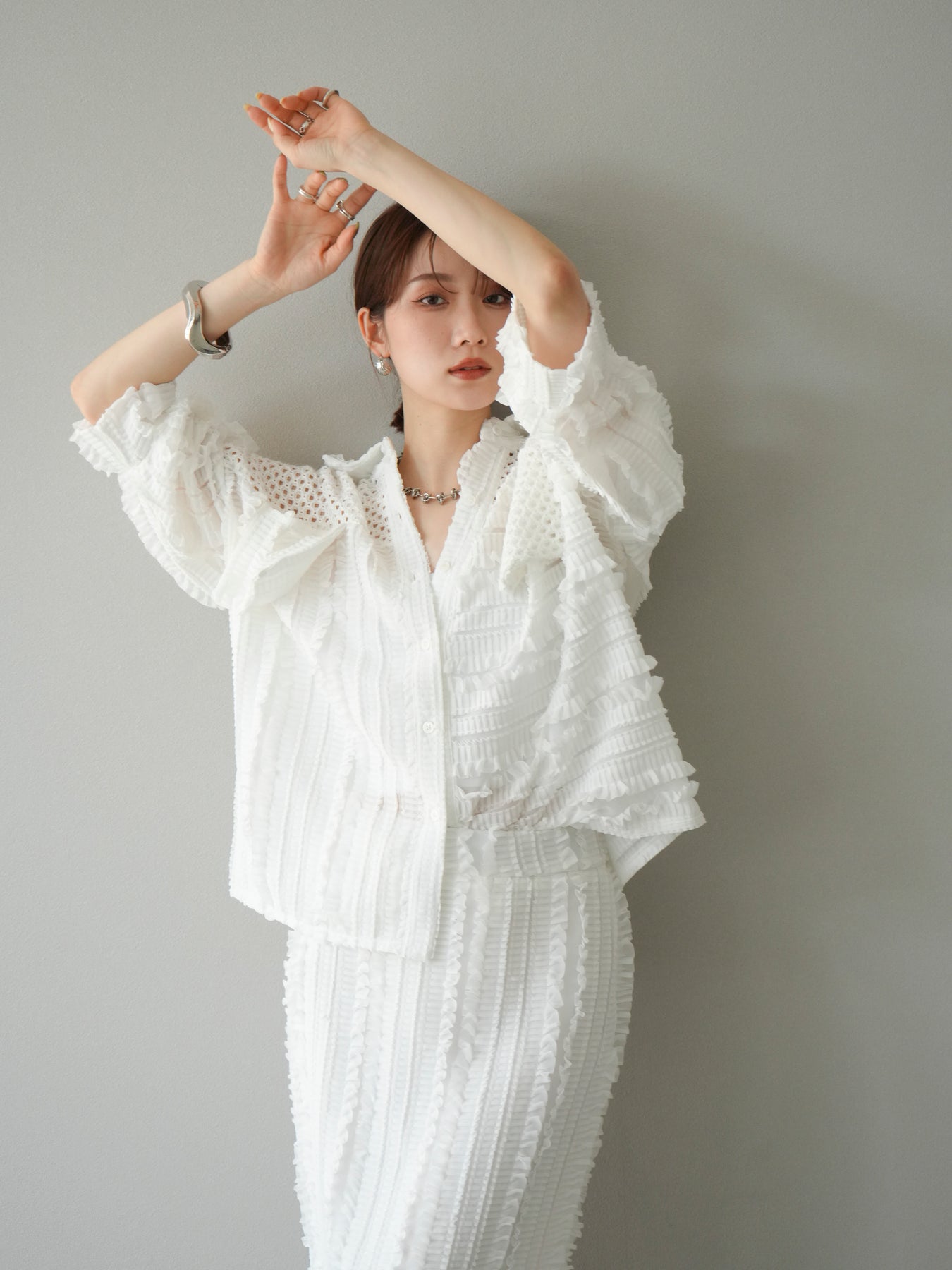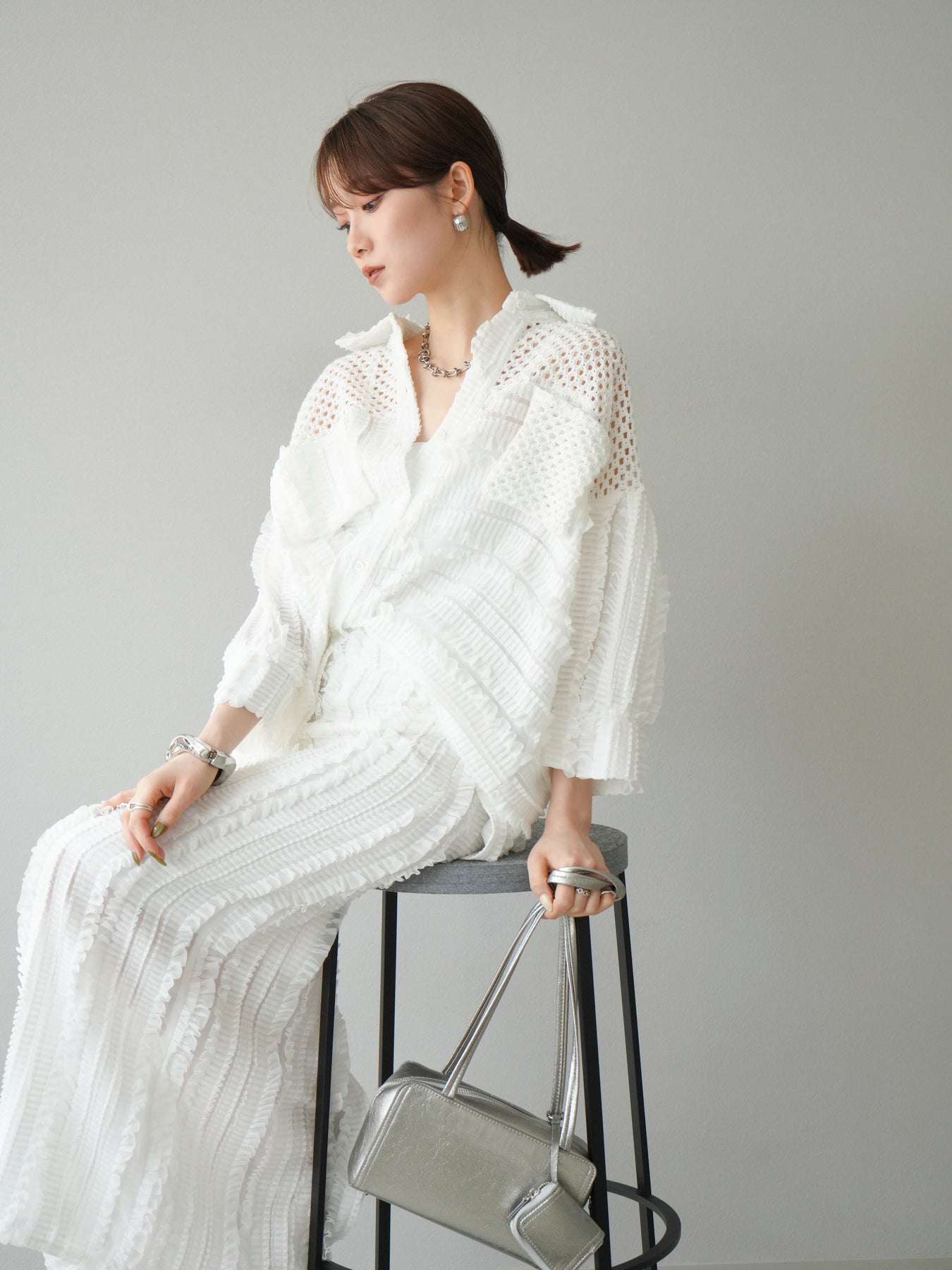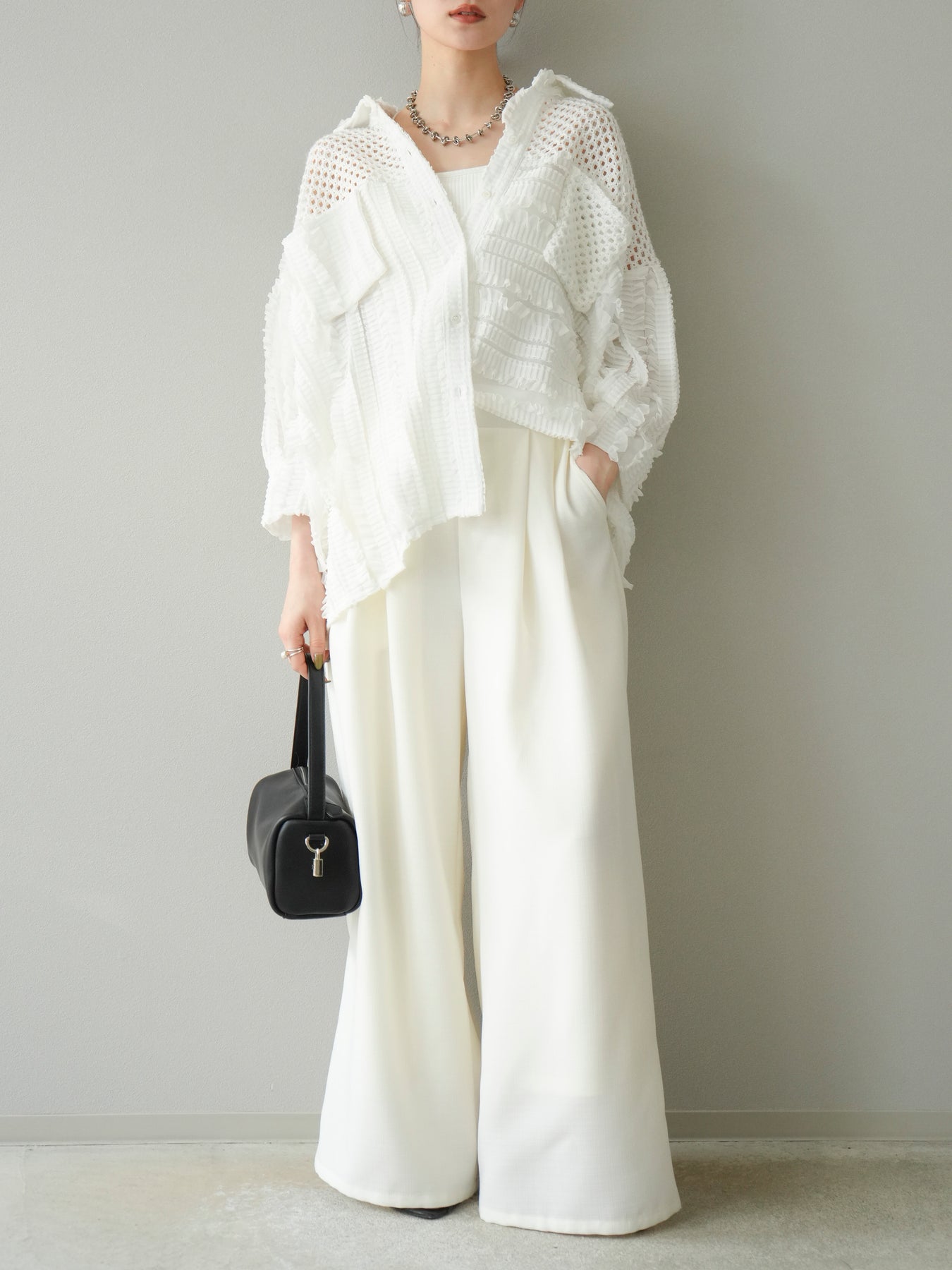異素材を巧みに組み合わせたパッチワークデザインと、立体感のあるフリル使いが目を引くシアーシャツ。繊細な透け感と柔らかな素材が、軽やかで女性らしい印象を与えてくれます。 ゆったりとしたシルエットに、ドロップショルダーと長めの丈感が抜け感を演出。ボタンを閉じてブラウス風に、開けて羽織りとしても使える万能アイテムです。 シンプルなボトムに合わせるだけで主役になる、シーズンムードたっぷりの1枚です。 ※ボトムス、キャミソール(インナー)以外の商品は一律でインナーは付属していません。