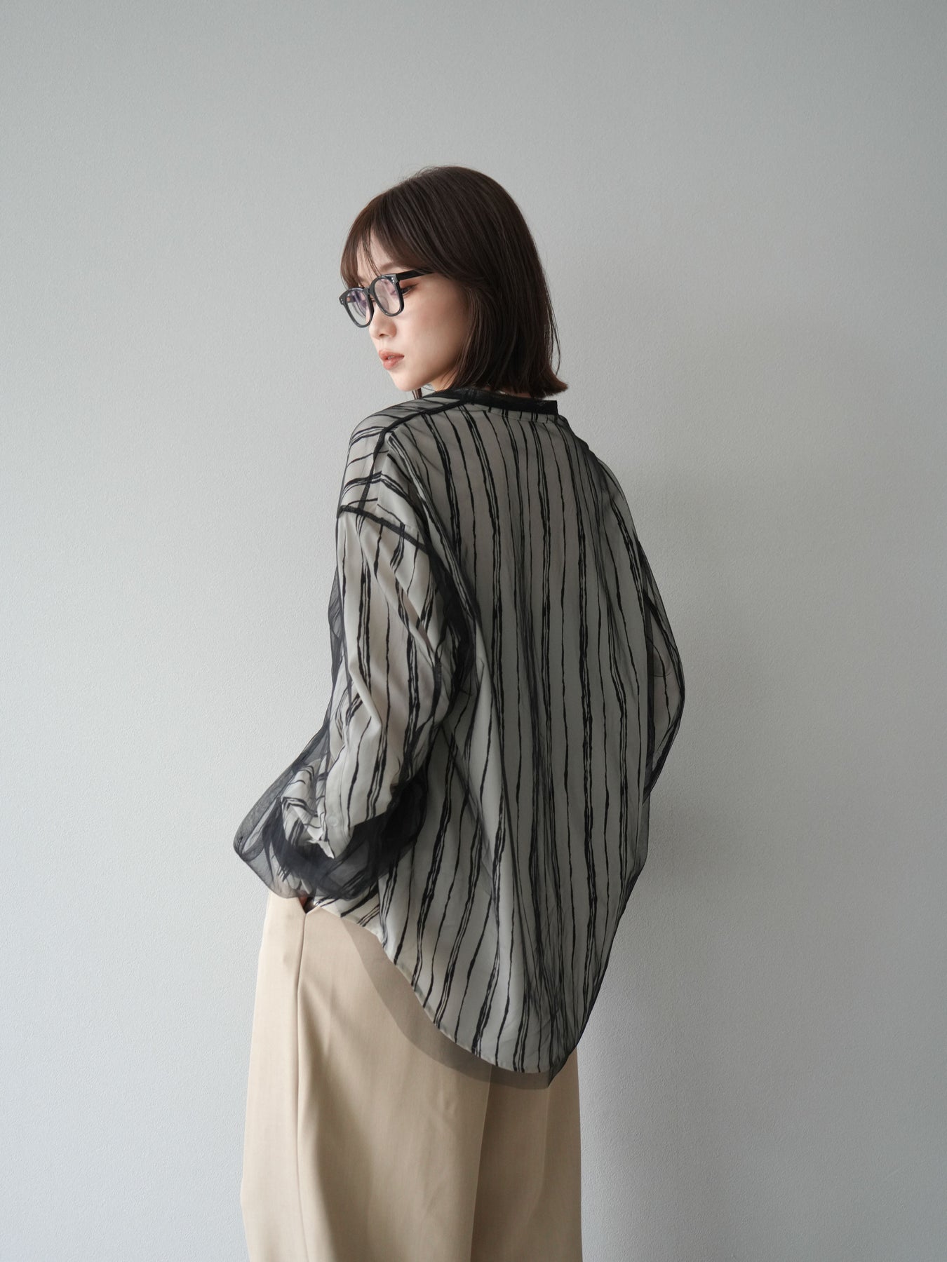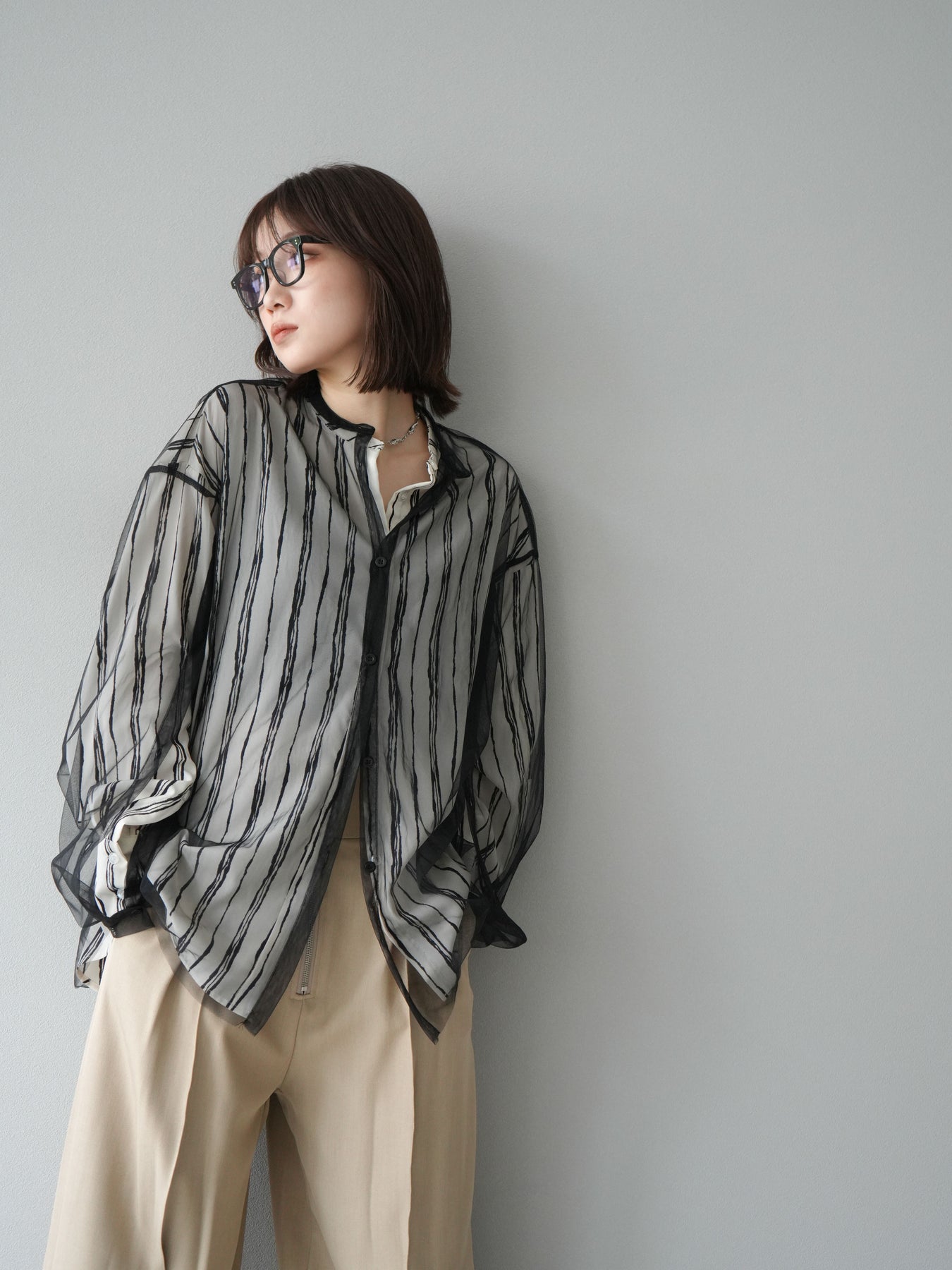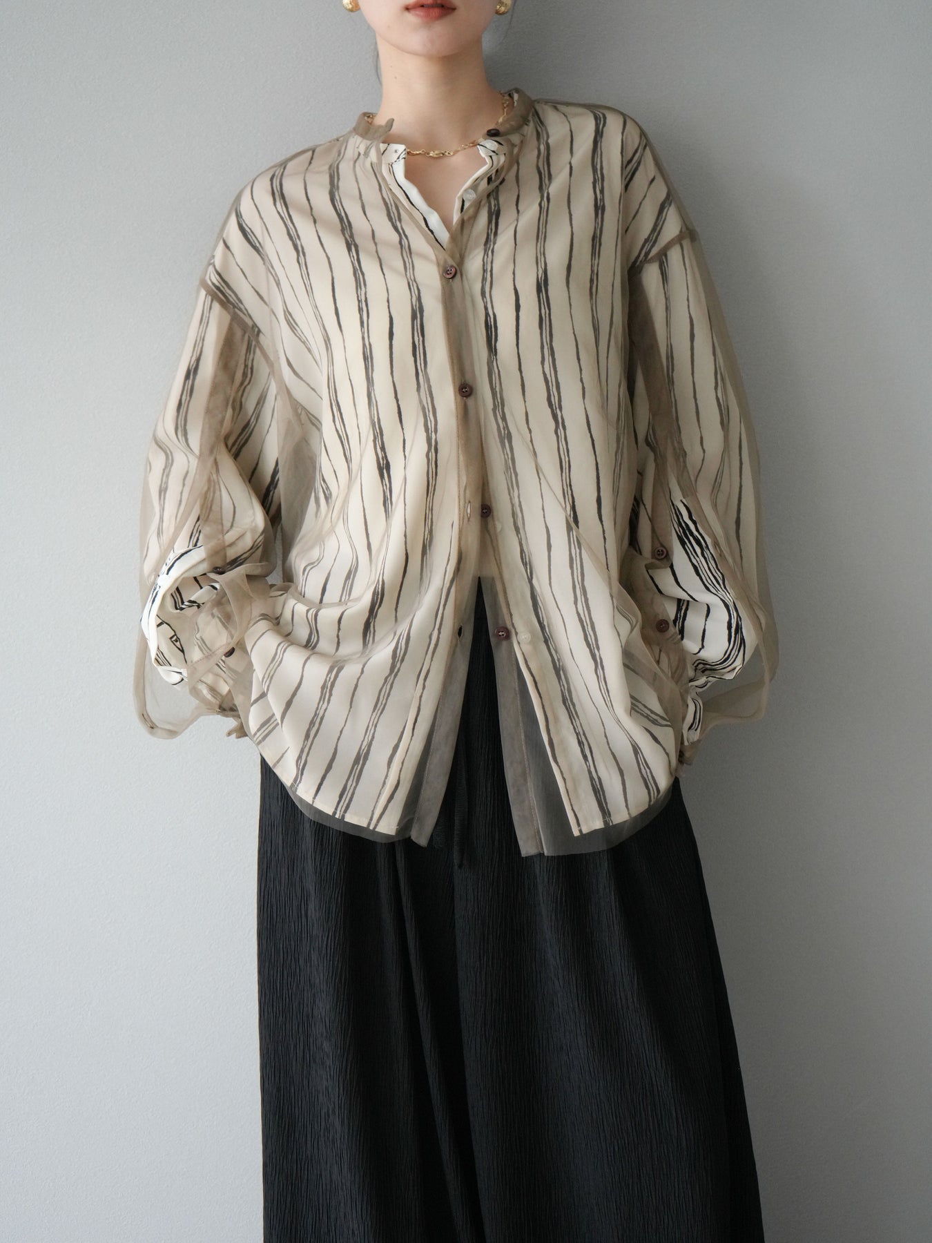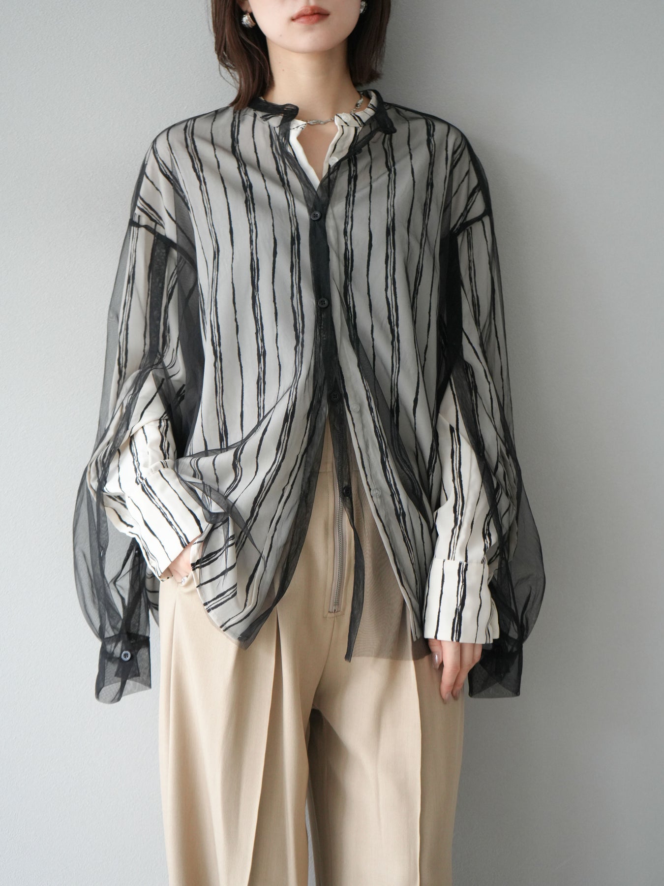 "繊細なペンタッチ風ストライプ柄が印象的な、シアー素材のバンドカラーシャツ。 袖にはボタン付きのタブをあしらい、ロールアップして2WAYで楽しめる仕様に。軽やかな透け感が、レイヤードスタイルにも映えるアイテムです。ゆったりとしたオーバーサイズが、こなれ感のあるシルエットを演出します。 前を開けて羽織としても、1枚でトップスとしても活躍し、ロングシーズン使える万能アイテム。シンプルなボトムと合わせるだけで、洗練された大人のカジュアルスタイルが完成します。"