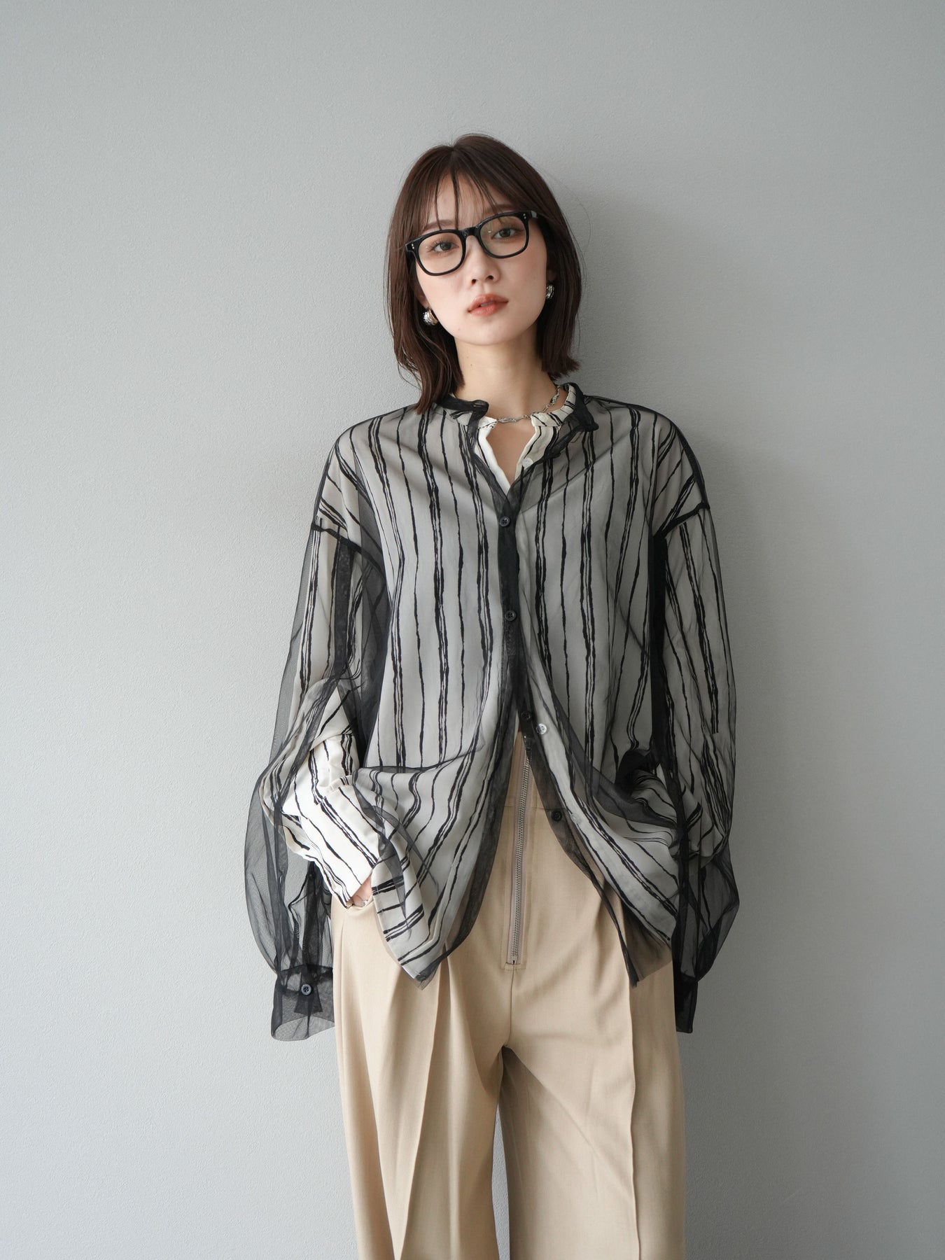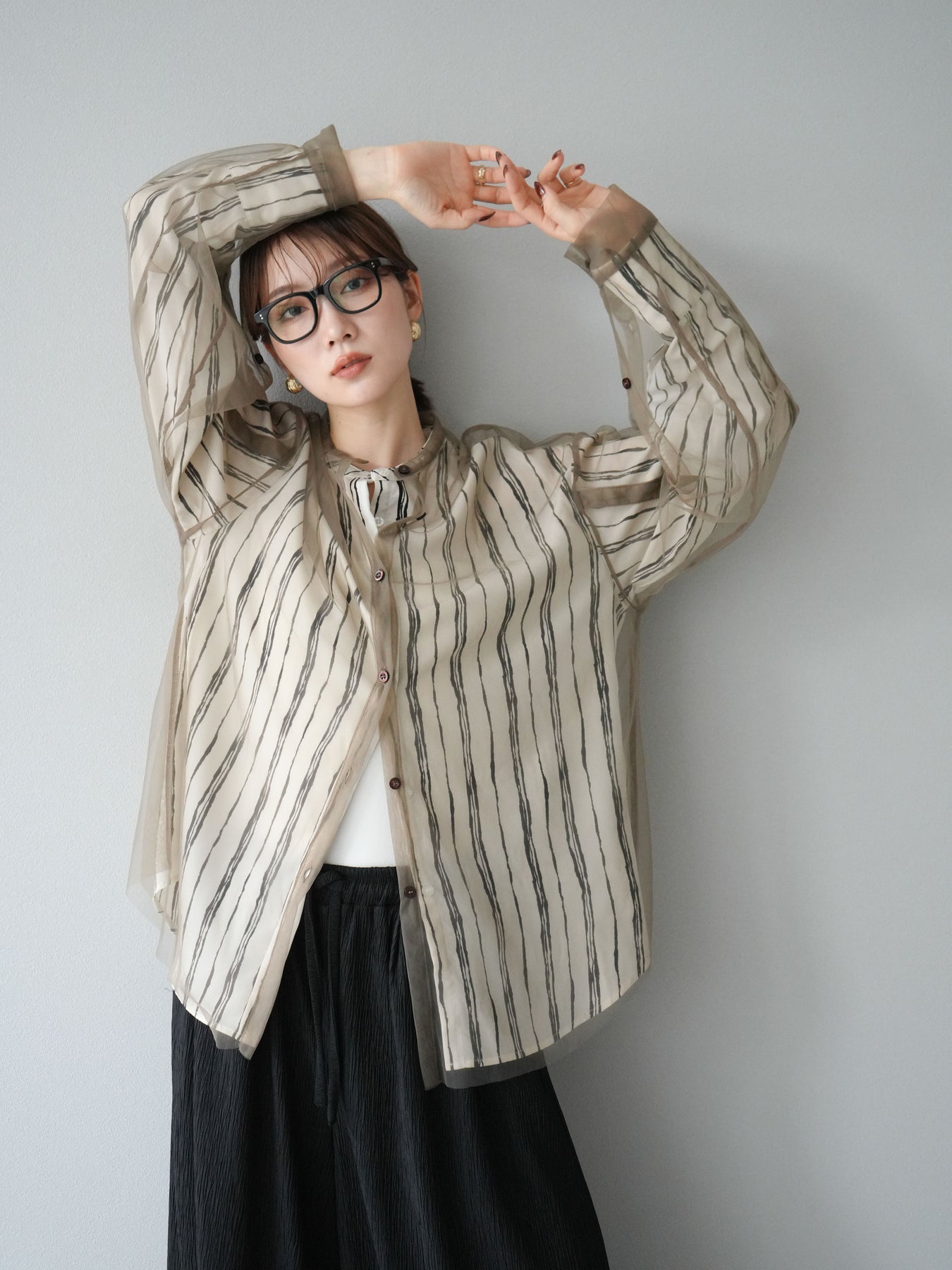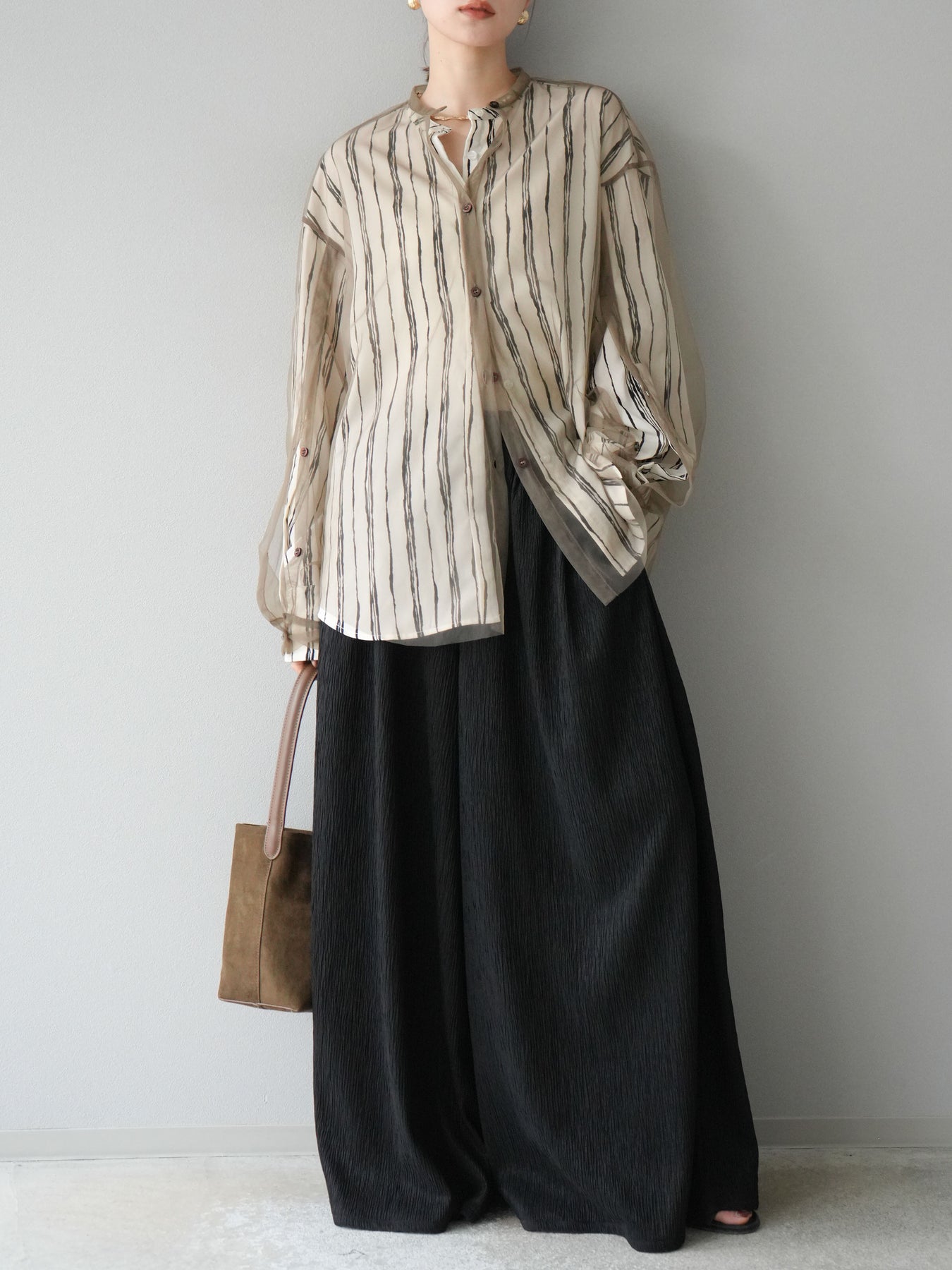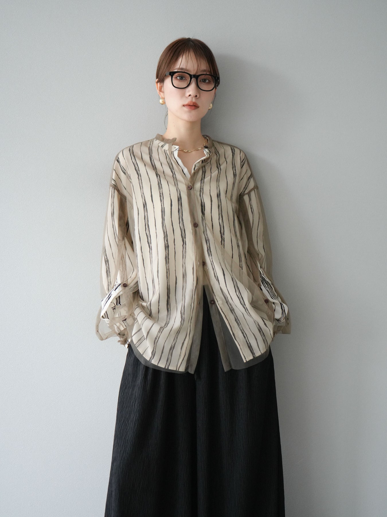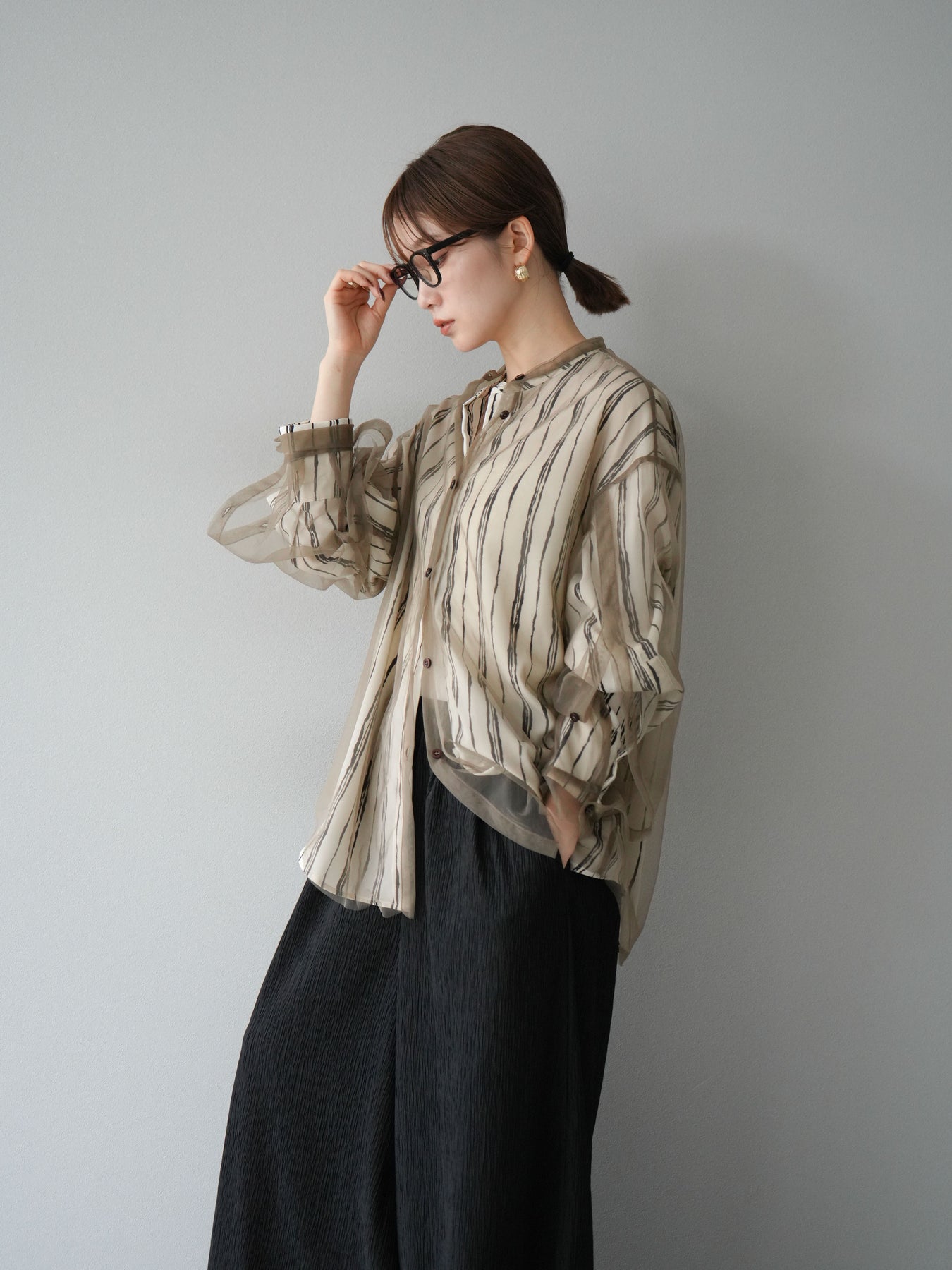 "繊細なペンタッチ風ストライプ柄が印象的な、シアー素材のバンドカラーシャツ。 袖にはボタン付きのタブをあしらい、ロールアップして2WAYで楽しめる仕様に。軽やかな透け感が、レイヤードスタイルにも映えるアイテムです。ゆったりとしたオーバーサイズが、こなれ感のあるシルエットを演出します。 前を開けて羽織としても、1枚でトップスとしても活躍し、ロングシーズン使える万能アイテム。シンプルなボトムと合わせるだけで、洗練された大人のカジュアルスタイルが完成します。"