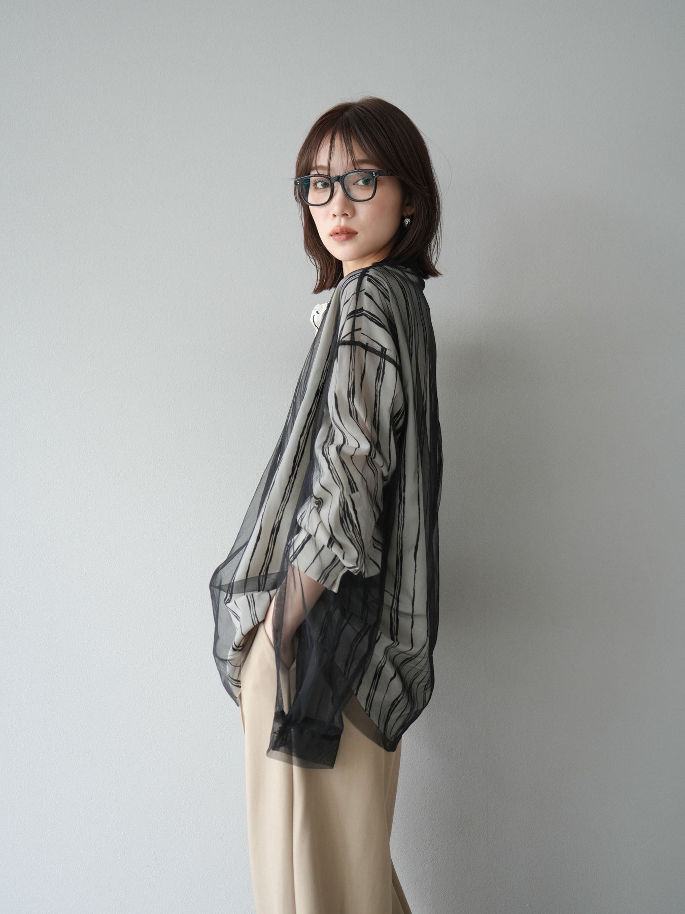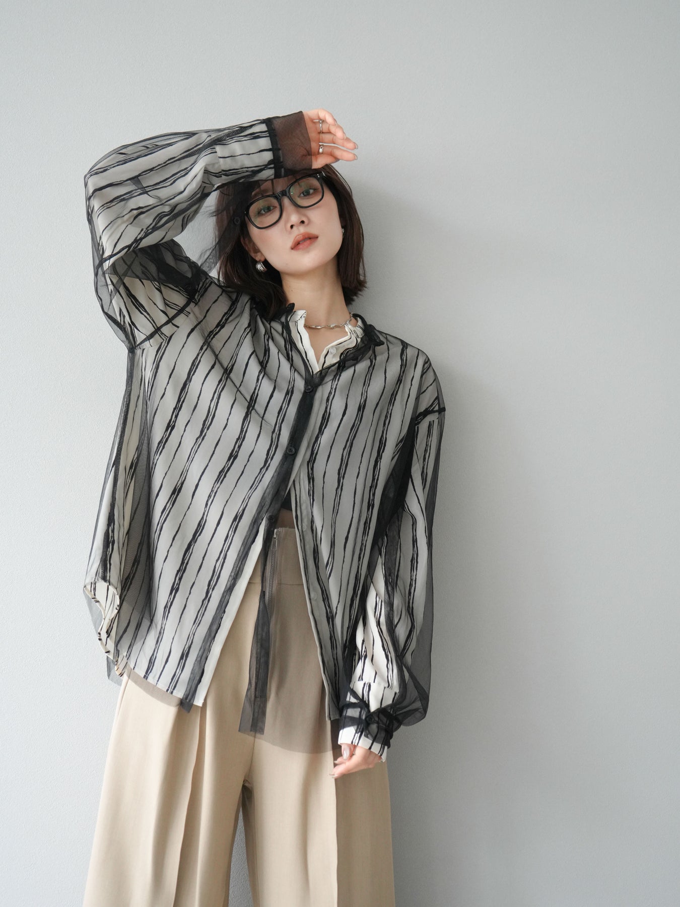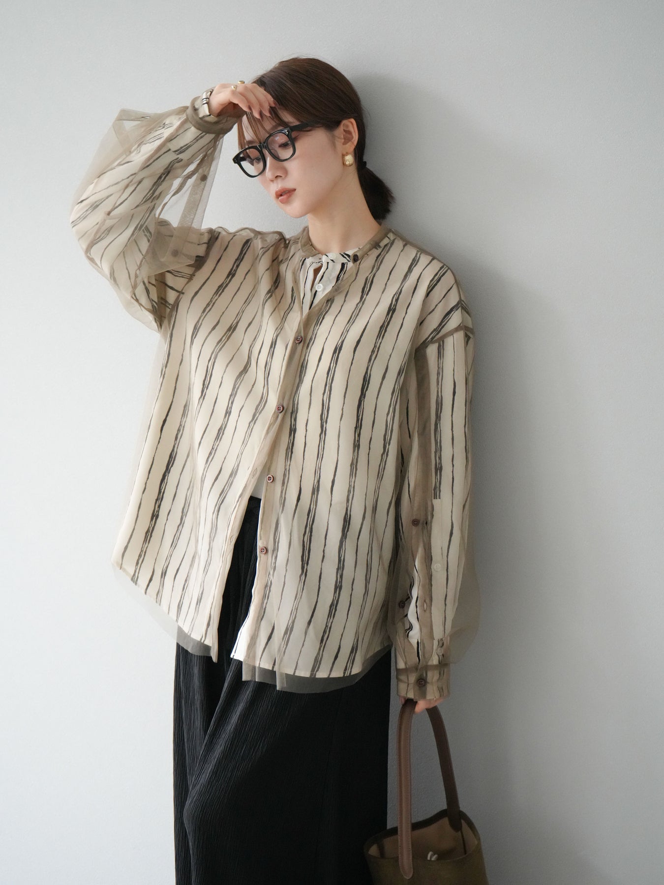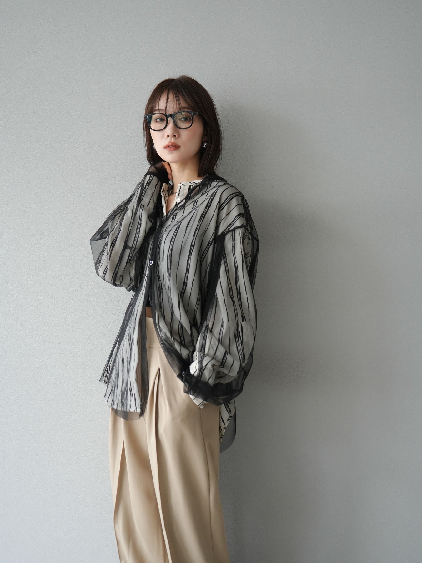 "繊細なペンタッチ風ストライプ柄が印象的な、シアー素材のバンドカラーシャツ。 袖にはボタン付きのタブをあしらい、ロールアップして2WAYで楽しめる仕様に。軽やかな透け感が、レイヤードスタイルにも映えるアイテムです。ゆったりとしたオーバーサイズが、こなれ感のあるシルエットを演出します。 前を開けて羽織としても、1枚でトップスとしても活躍し、ロングシーズン使える万能アイテム。シンプルなボトムと合わせるだけで、洗練された大人のカジュアルスタイルが完成します。"