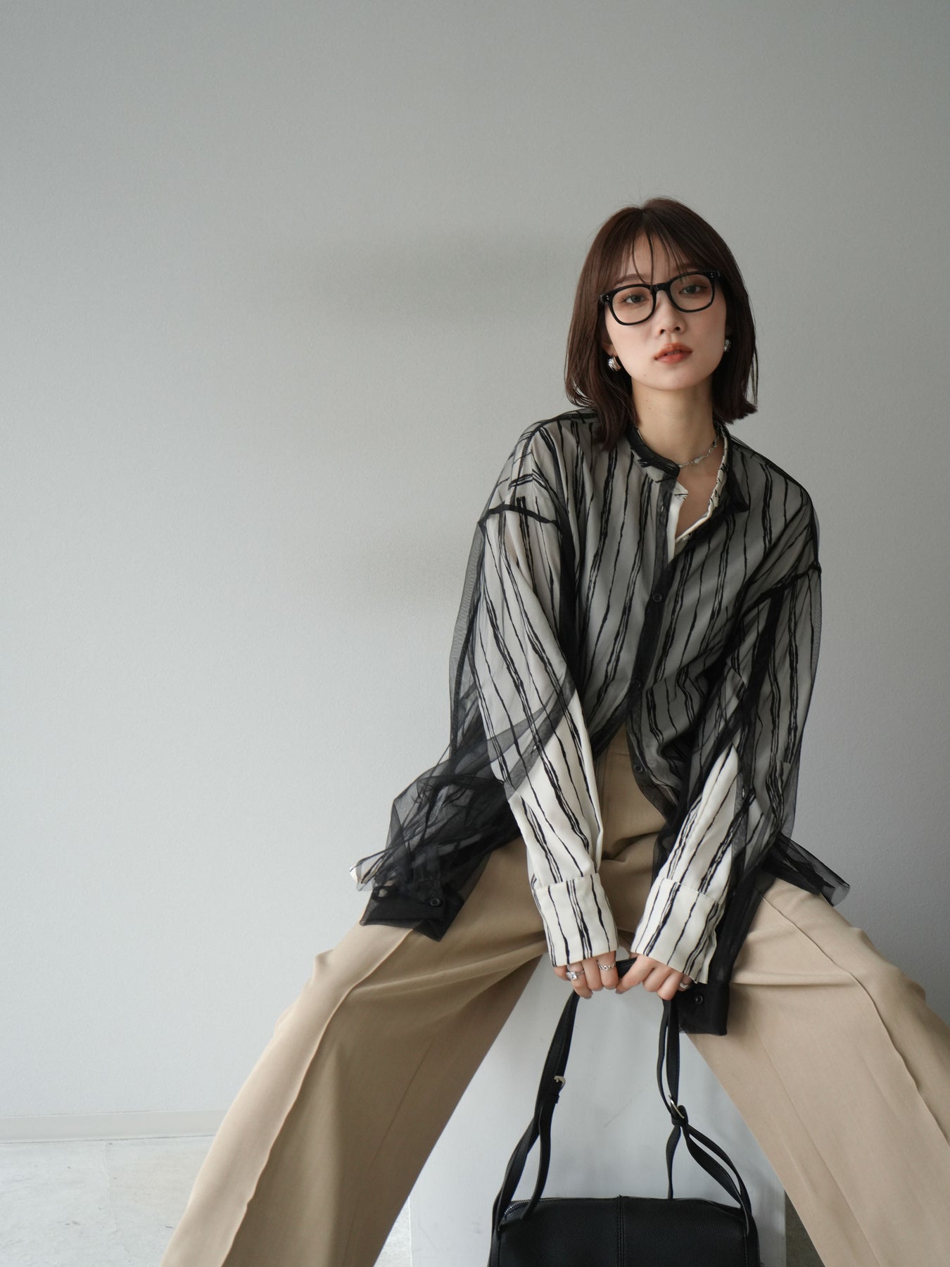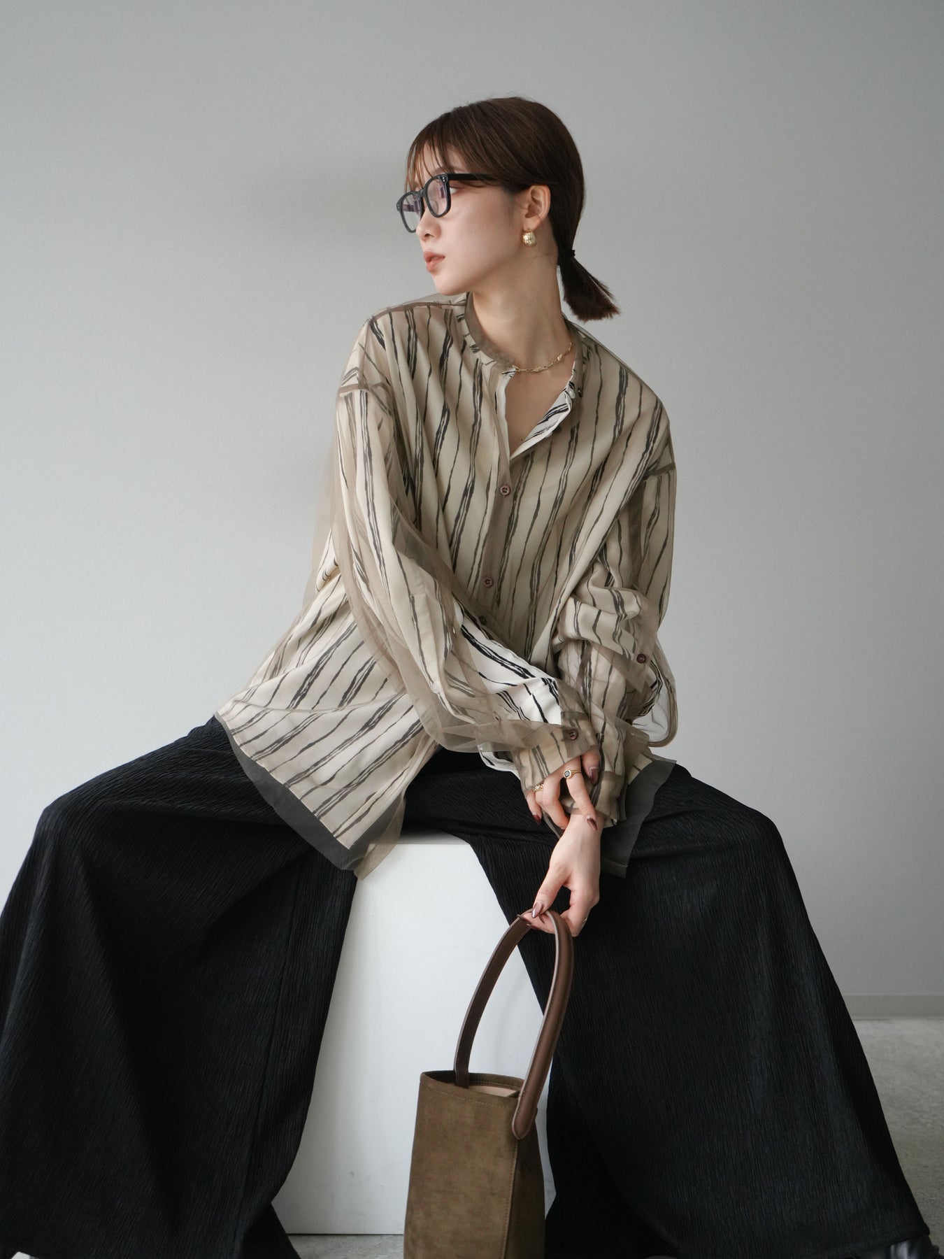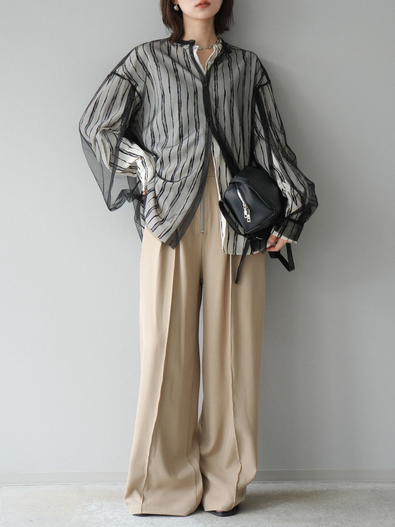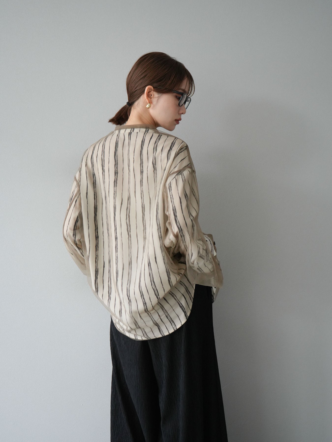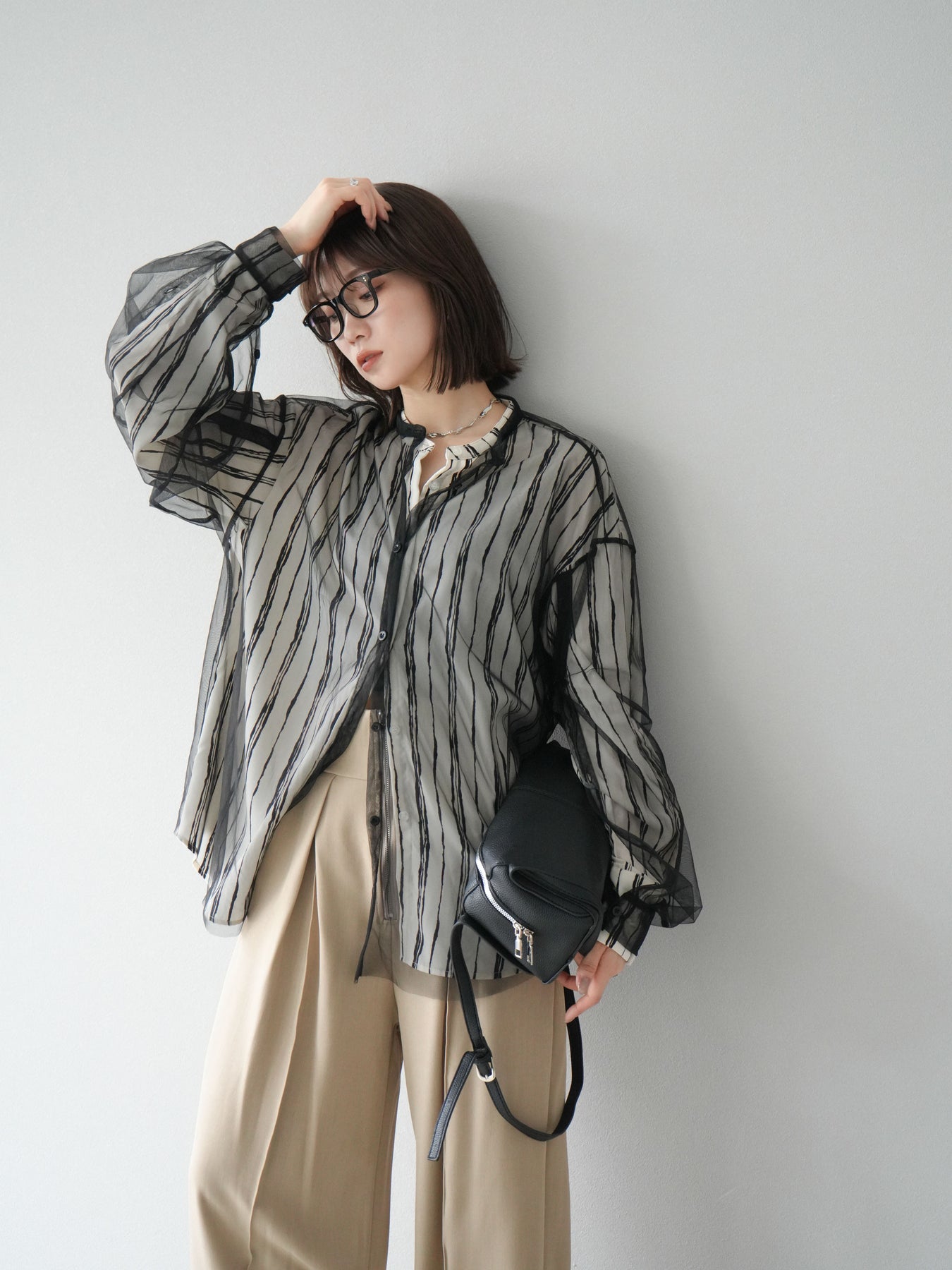 "繊細なペンタッチ風ストライプ柄が印象的な、シアー素材のバンドカラーシャツ。 袖にはボタン付きのタブをあしらい、ロールアップして2WAYで楽しめる仕様に。軽やかな透け感が、レイヤードスタイルにも映えるアイテムです。ゆったりとしたオーバーサイズが、こなれ感のあるシルエットを演出します。 前を開けて羽織としても、1枚でトップスとしても活躍し、ロングシーズン使える万能アイテム。シンプルなボトムと合わせるだけで、洗練された大人のカジュアルスタイルが完成します。"