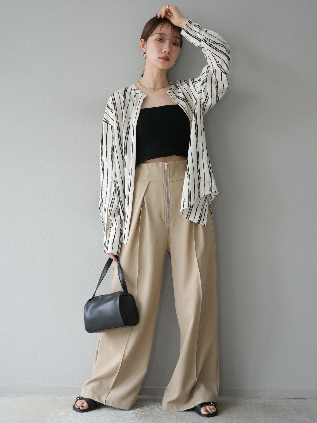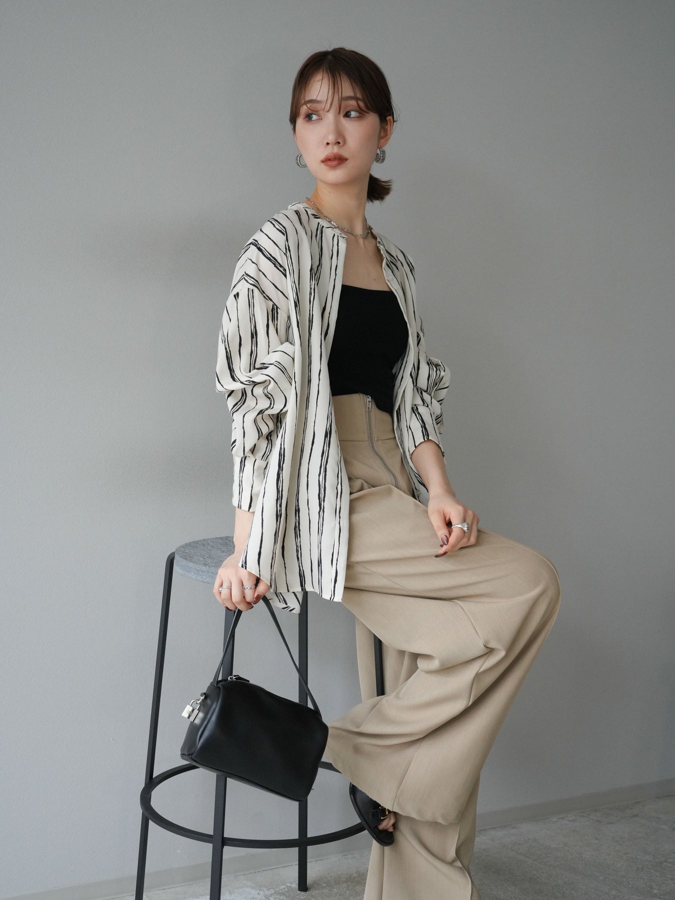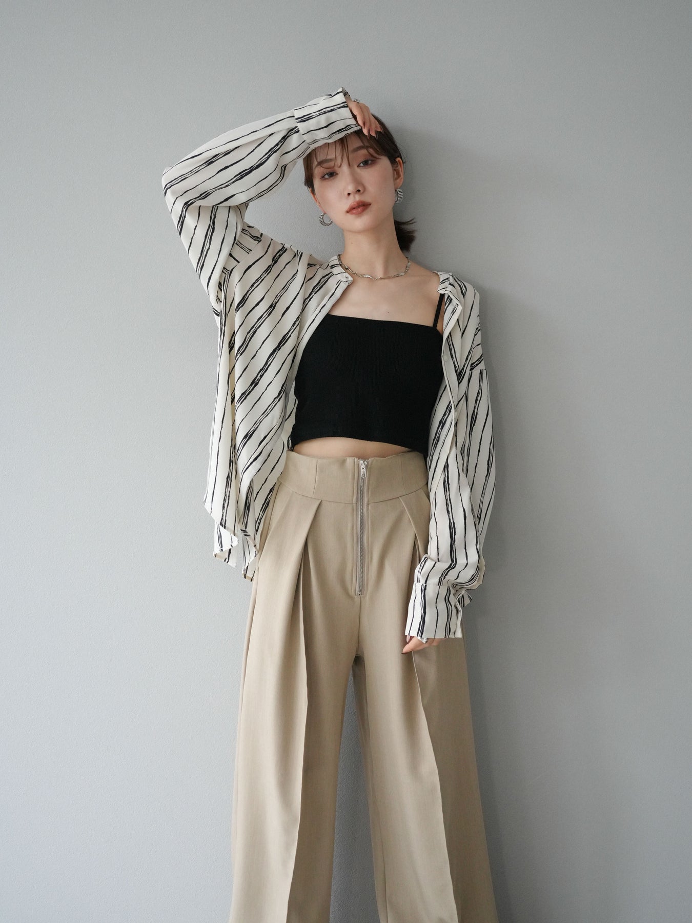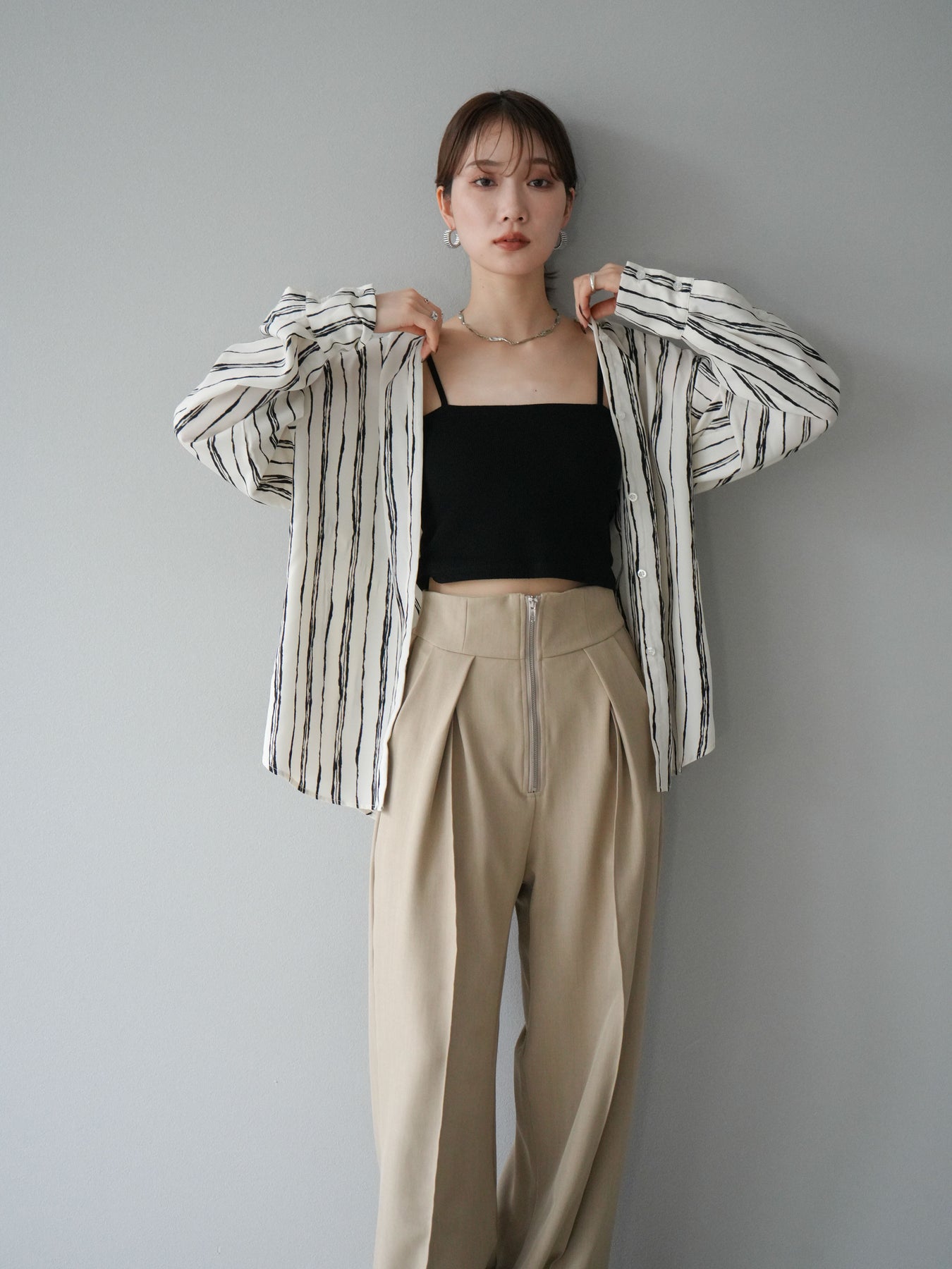 "繊細なペンタッチ風ストライプ柄が印象的な、シアー素材のバンドカラーシャツ。 袖にはボタン付きのタブをあしらい、ロールアップして2WAYで楽しめる仕様に。軽やかな透け感が、レイヤードスタイルにも映えるアイテムです。ゆったりとしたオーバーサイズが、こなれ感のあるシルエットを演出します。 前を開けて羽織としても、1枚でトップスとしても活躍し、ロングシーズン使える万能アイテム。シンプルなボトムと合わせるだけで、洗練された大人のカジュアルスタイルが完成します。"