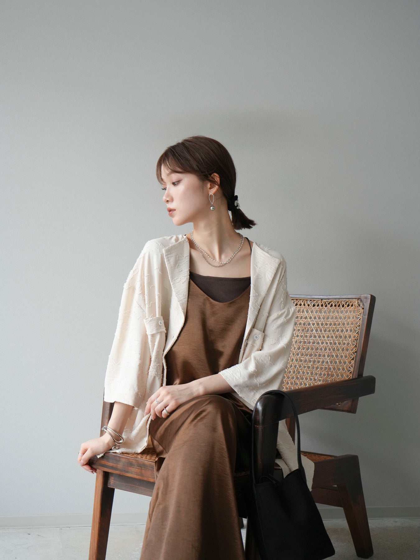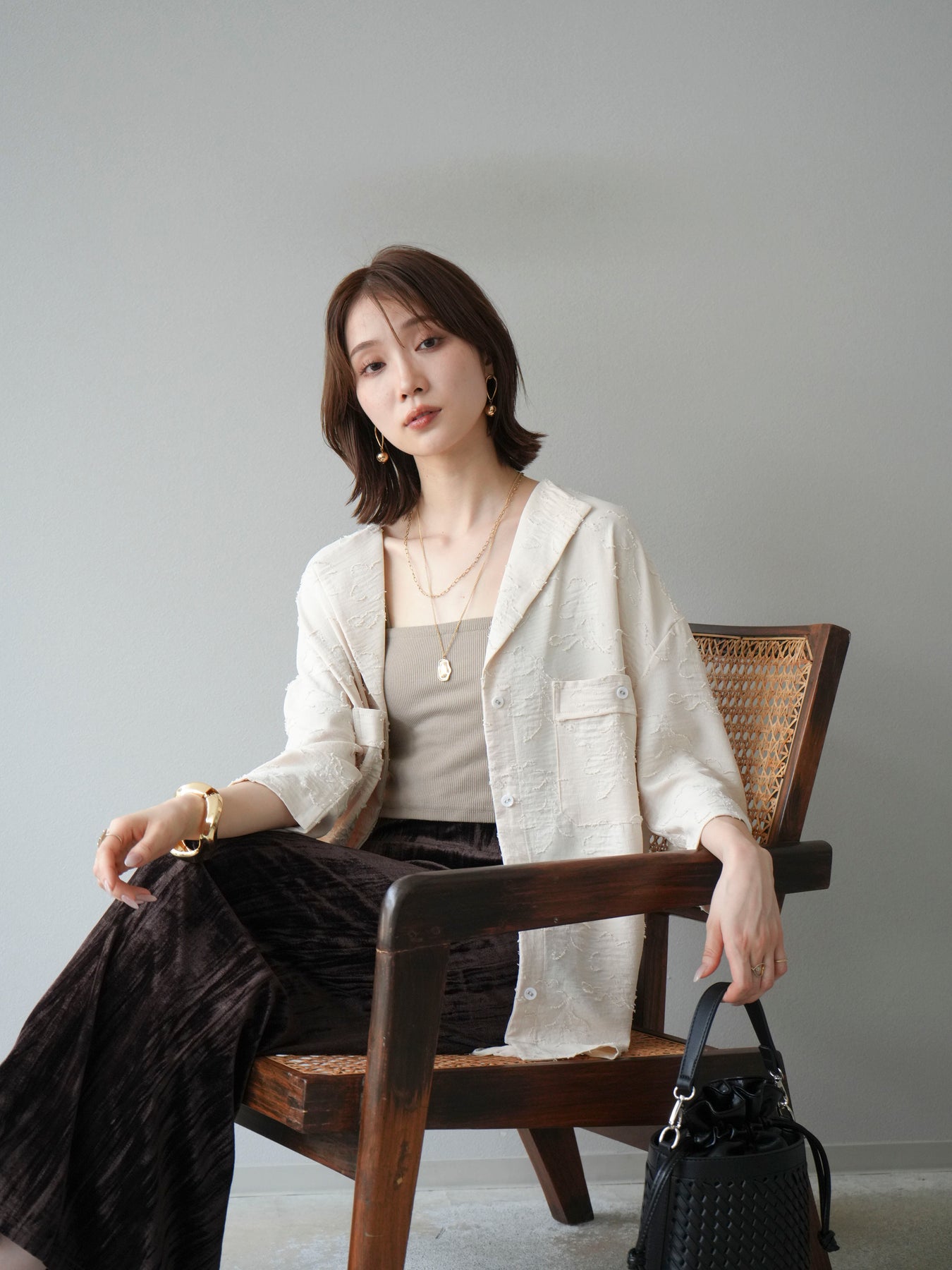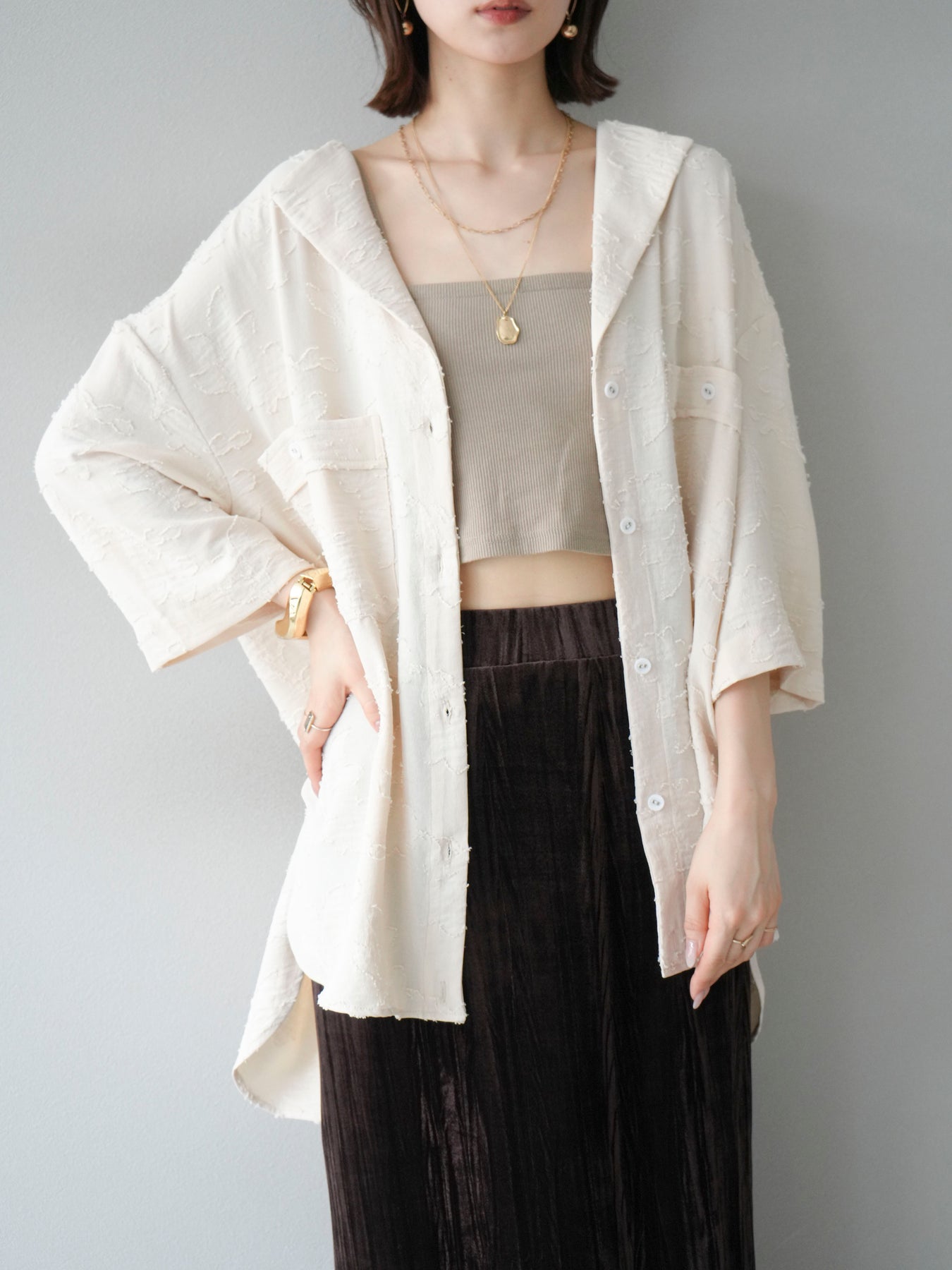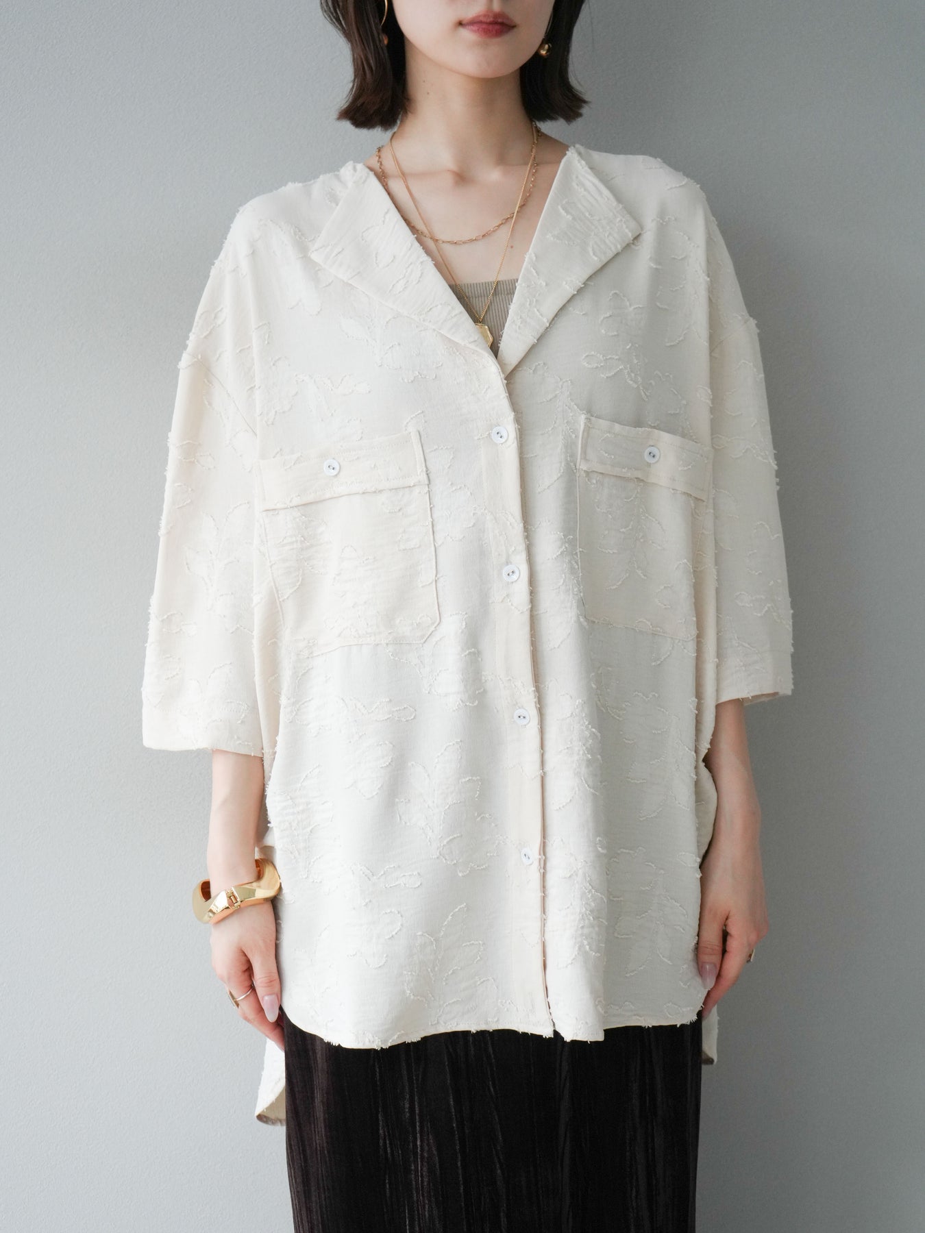 表情豊かなジャガード生地を使用したハーフスリーブシャツ。織りで浮き上がる柄が立体感を生み、シンプルながらも高級感のある雰囲気に仕上げています。ゆったりとしたシルエットとドロップショルダーが抜け感を演出し、さらりと羽織るだけでスタイリングが完成。軽やかな素材感で着心地も良く、デイリーにはもちろん、ジャケット感覚でライトアウターとしても活躍します。パンツにもスカートにも合わせやすく、季節の変わり目に取り入れたい一枚です。 ※ボトムス、キャミソール(インナー)以外の商品は一律でインナーは付属していません。