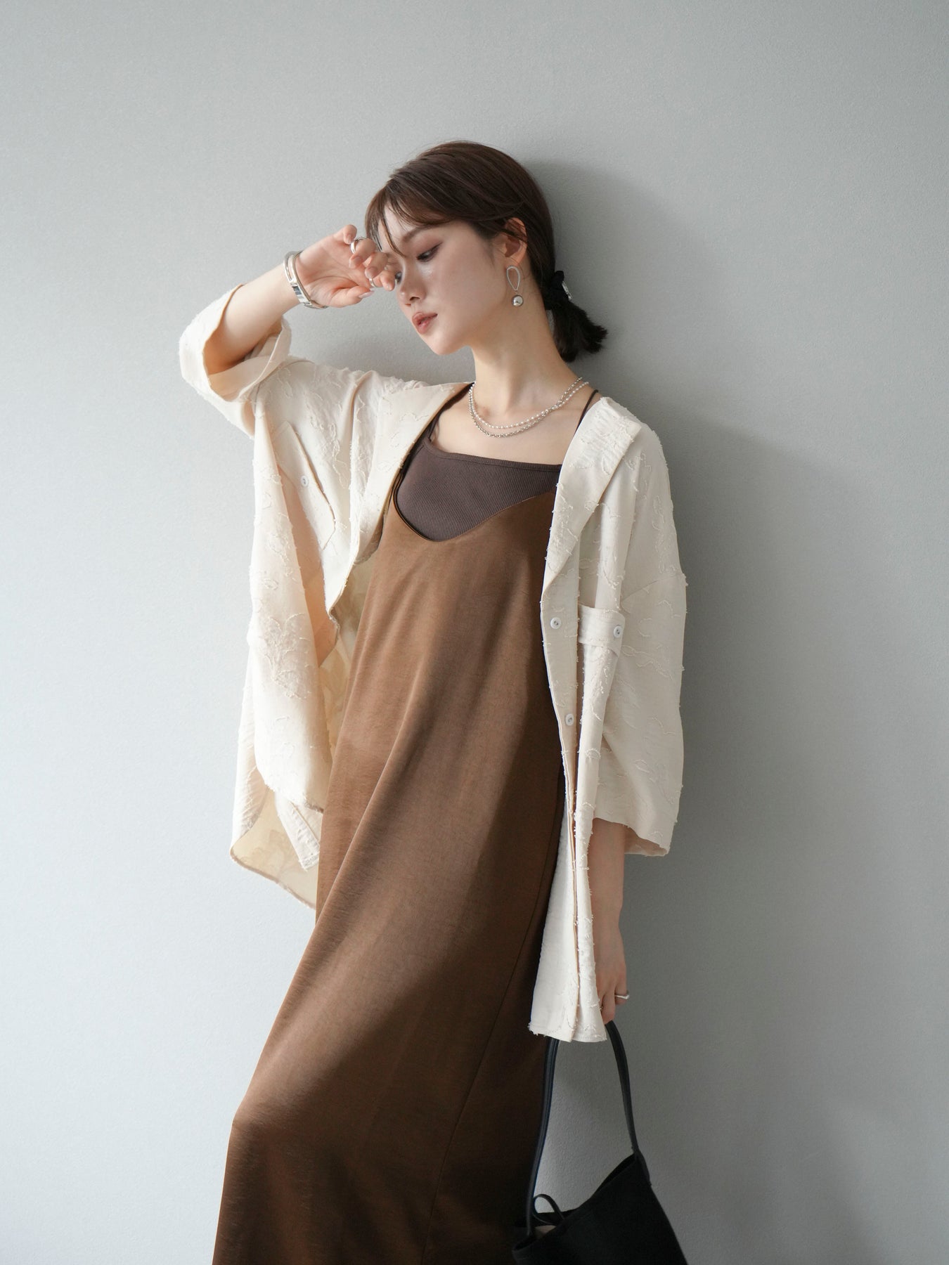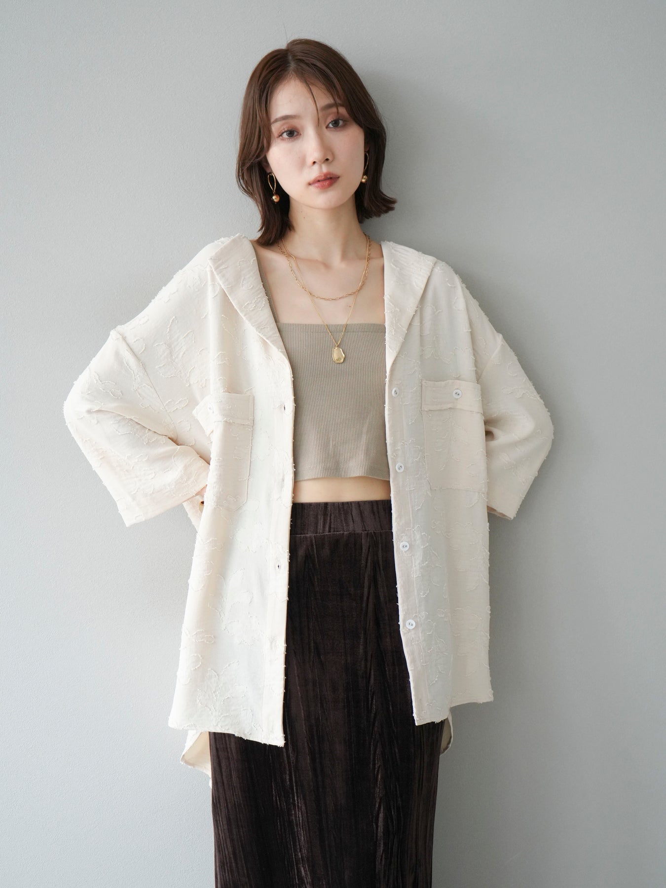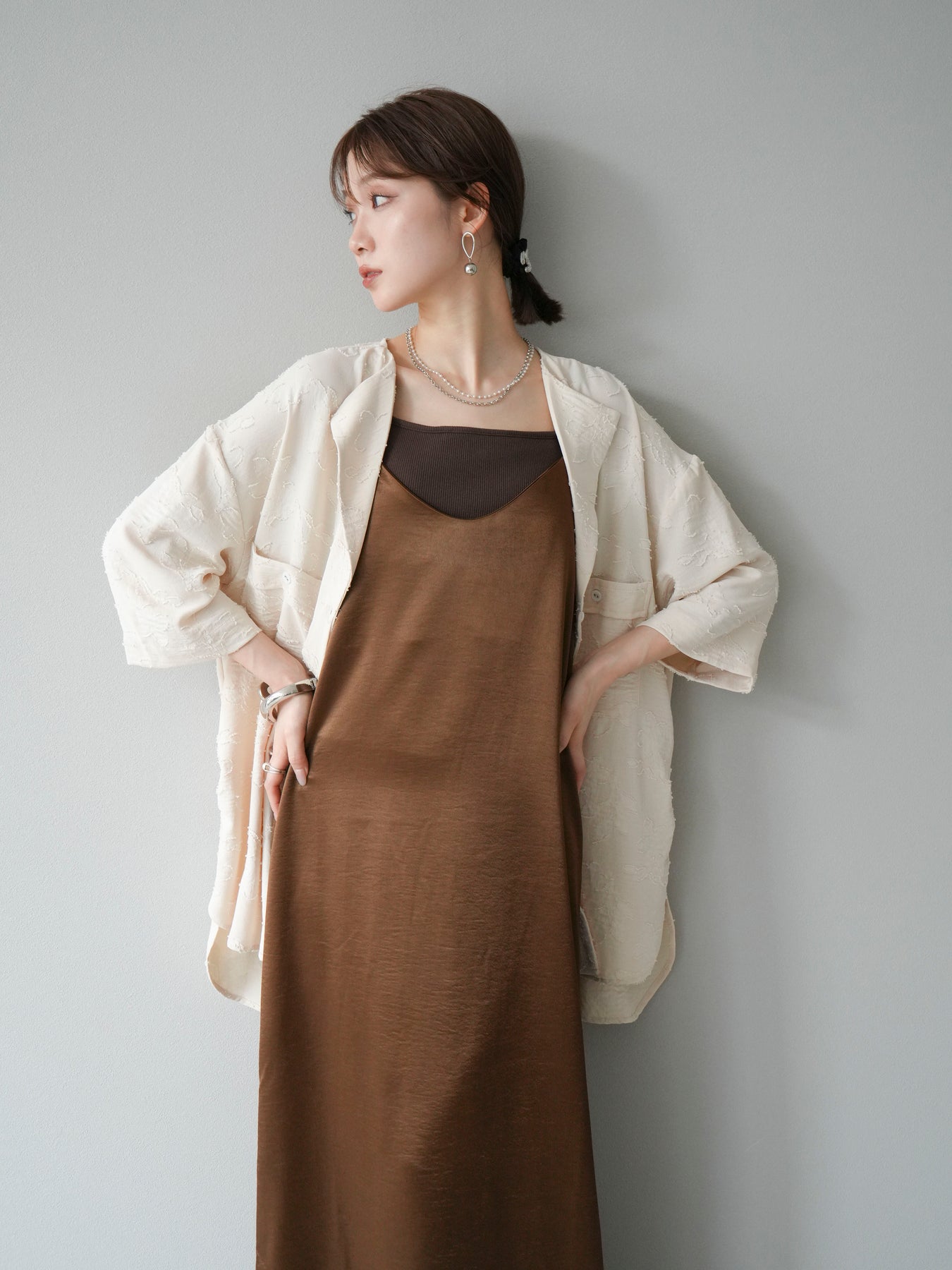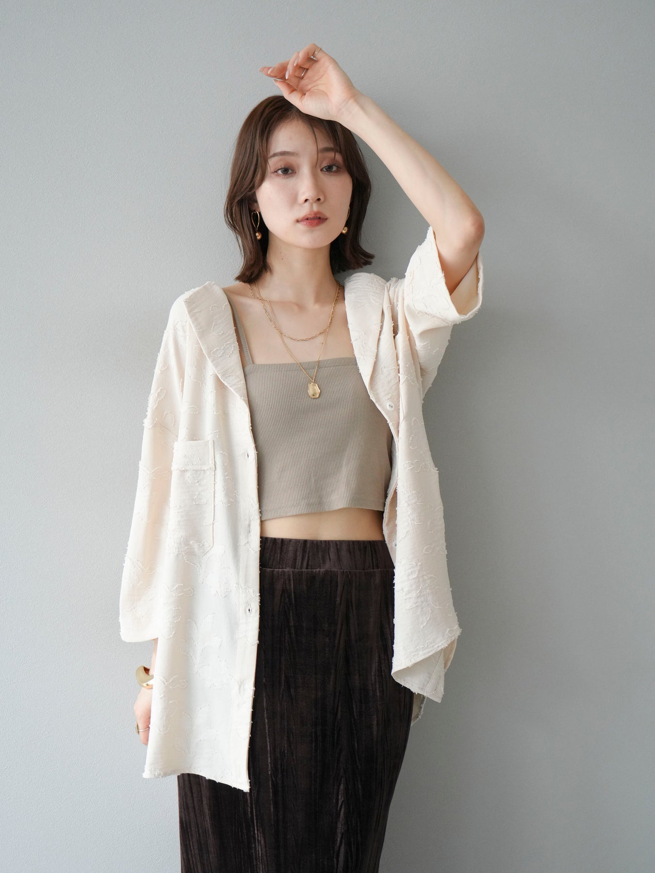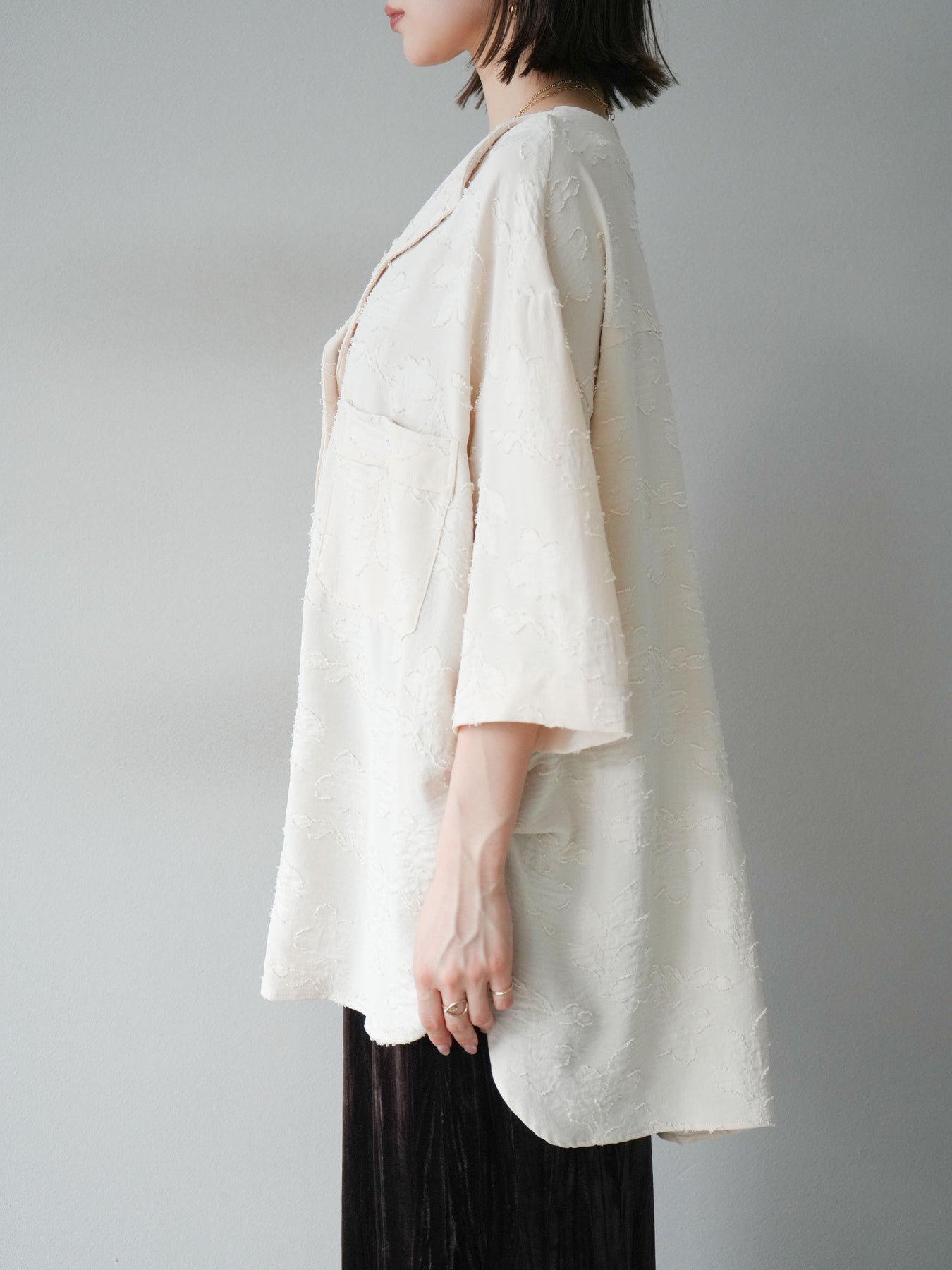 表情豊かなジャガード生地を使用したハーフスリーブシャツ。織りで浮き上がる柄が立体感を生み、シンプルながらも高級感のある雰囲気に仕上げています。ゆったりとしたシルエットとドロップショルダーが抜け感を演出し、さらりと羽織るだけでスタイリングが完成。軽やかな素材感で着心地も良く、デイリーにはもちろん、ジャケット感覚でライトアウターとしても活躍します。パンツにもスカートにも合わせやすく、季節の変わり目に取り入れたい一枚です。 ※ボトムス、キャミソール(インナー)以外の商品は一律でインナーは付属していません。